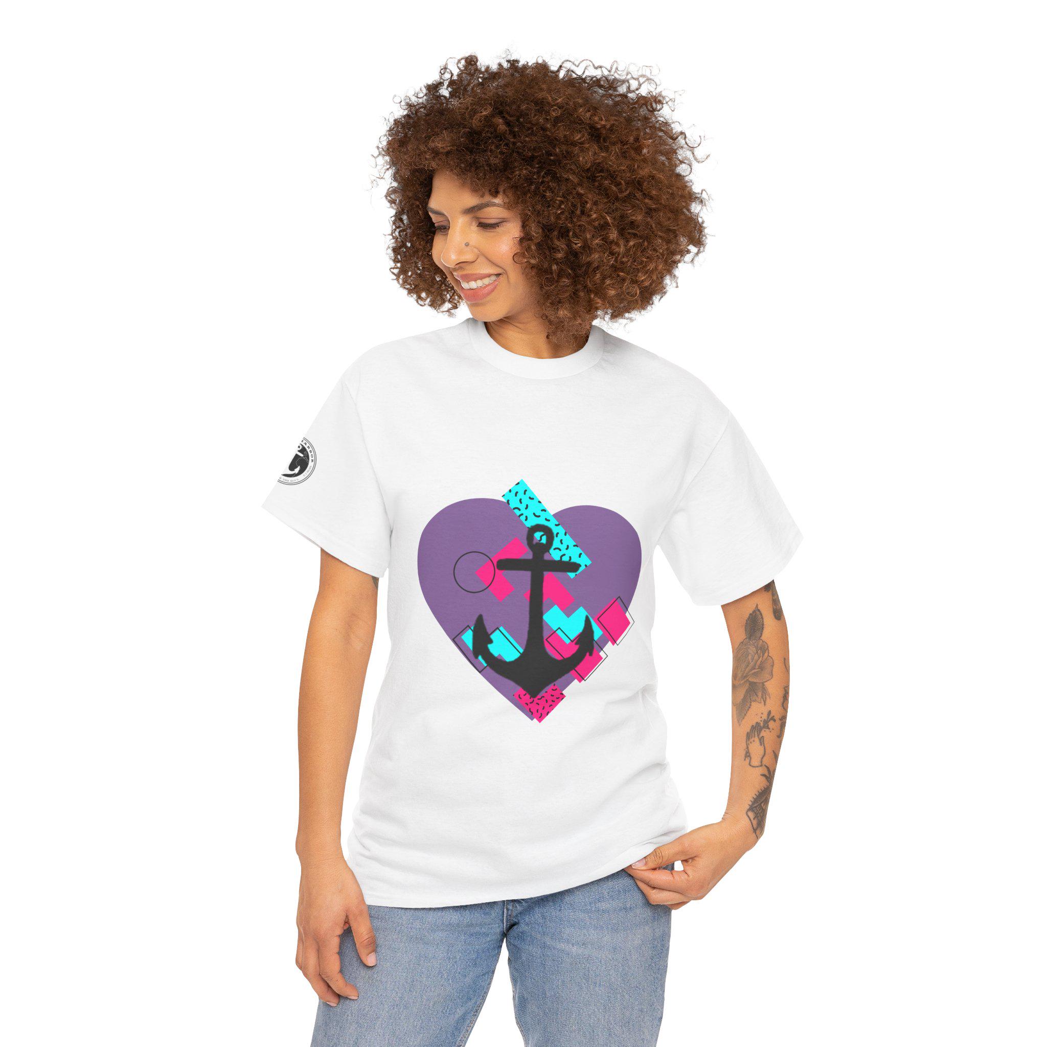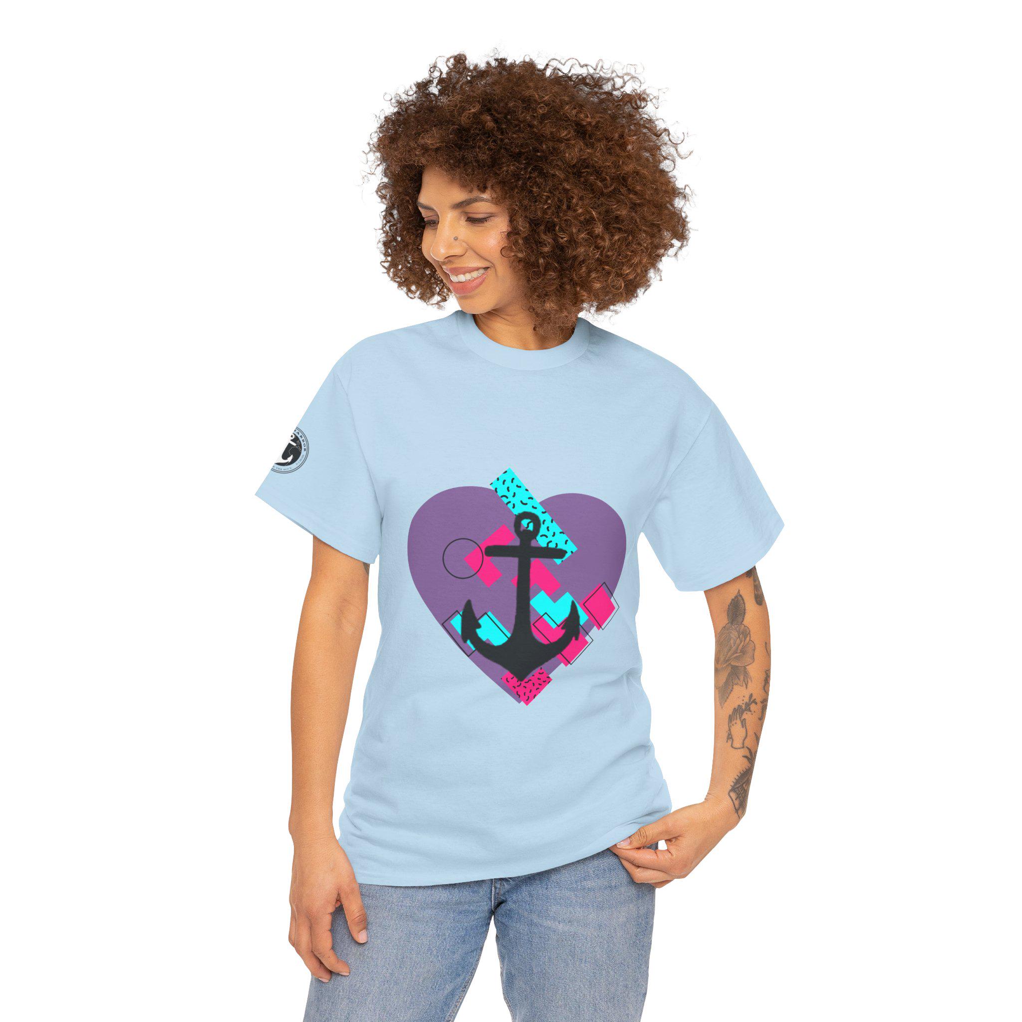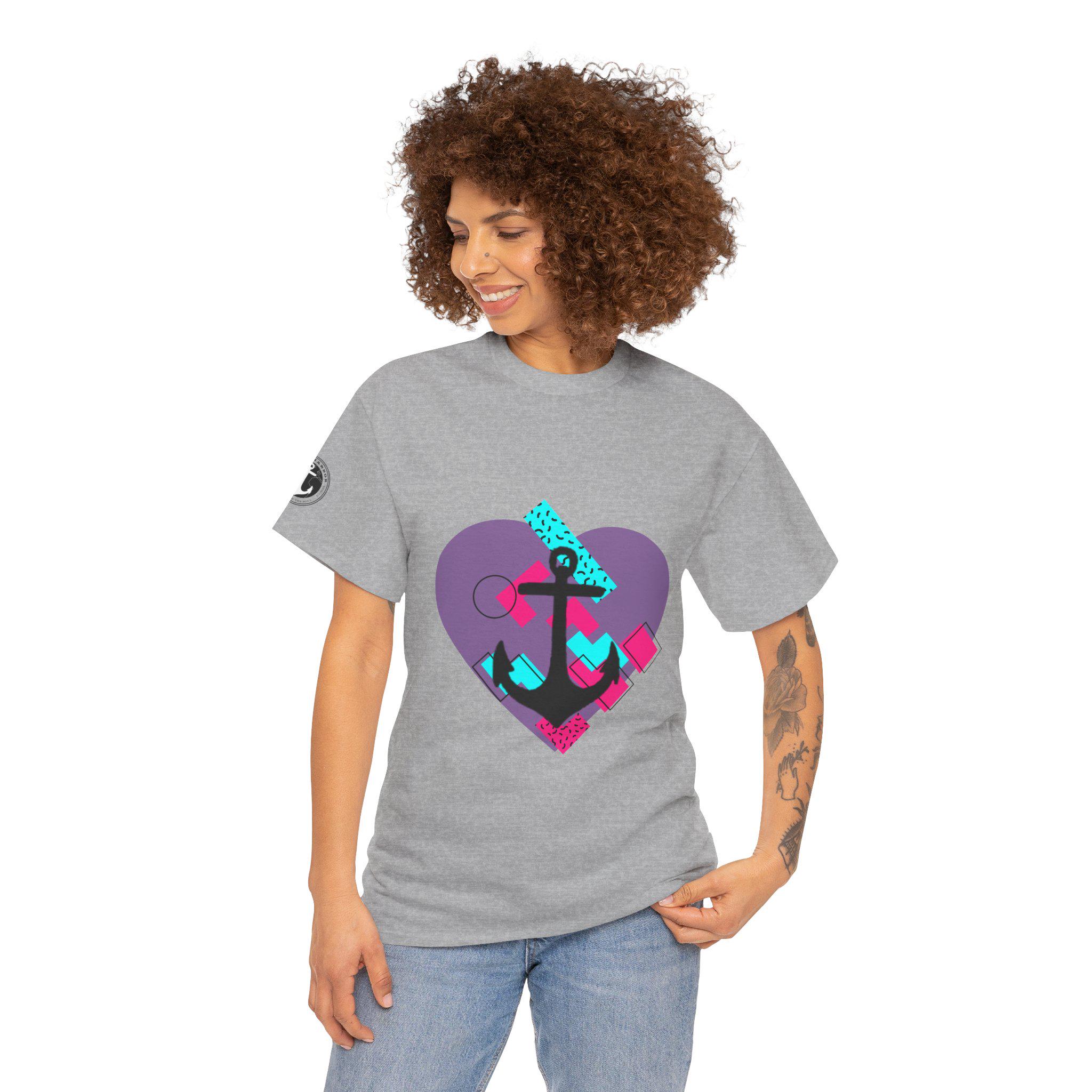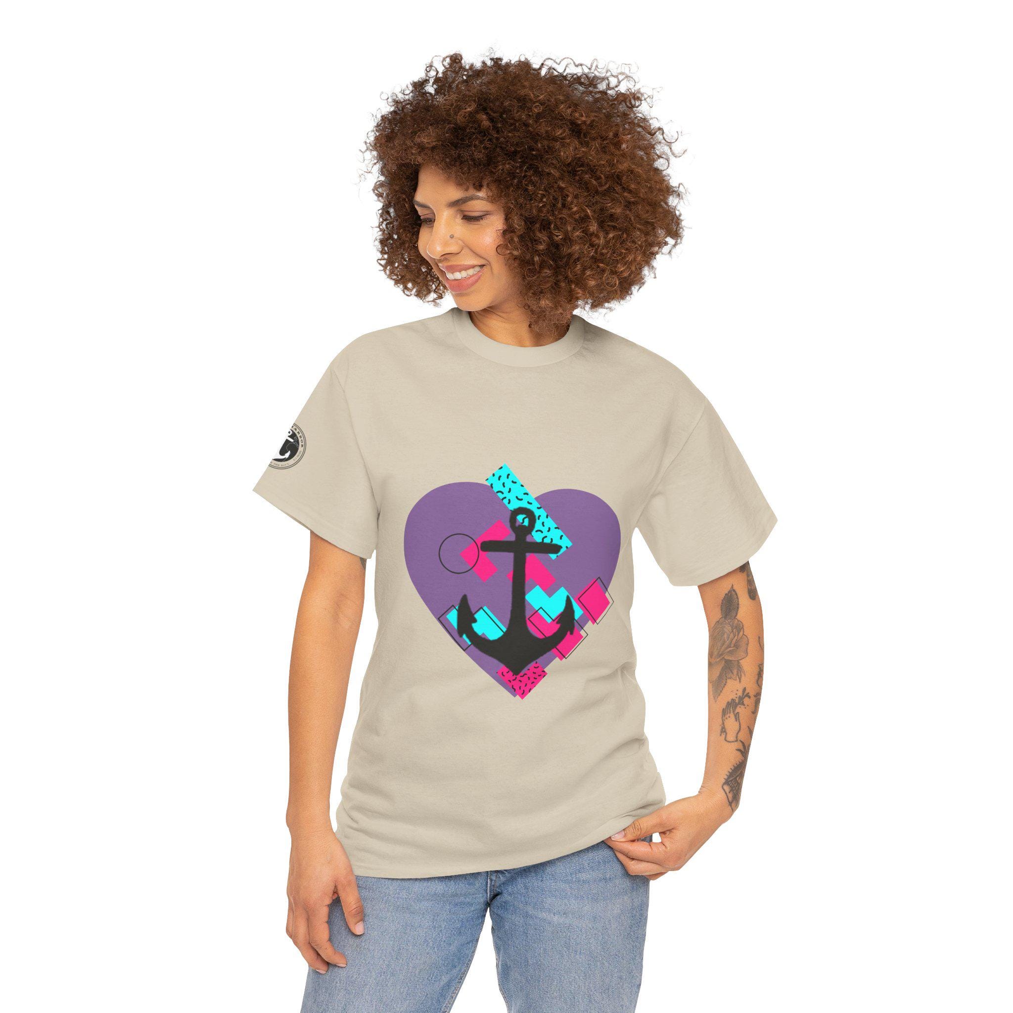 This Tee features a fun 80's pop style with a heart and anchor design that brings a message of hope and love. It offers a comfy, relaxed fit with a crew neckline, making it suitable for any occasion, casual or semi-formal. Made from specially spun fibers, this Tee is perfect for printing and is ethical and sustainable, certified by Oeko-Tex. Ideal for adults looking to add a touch of retro style to their wardrobe.