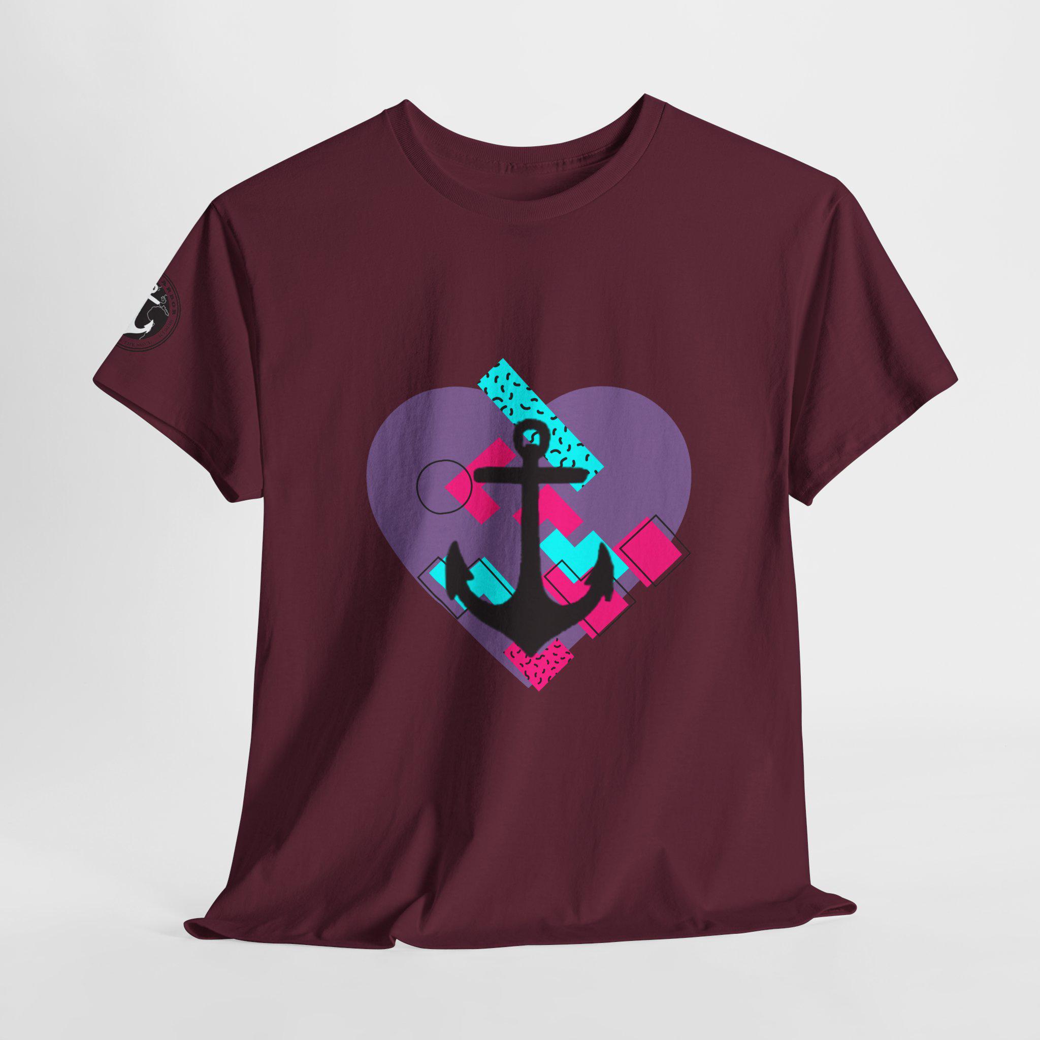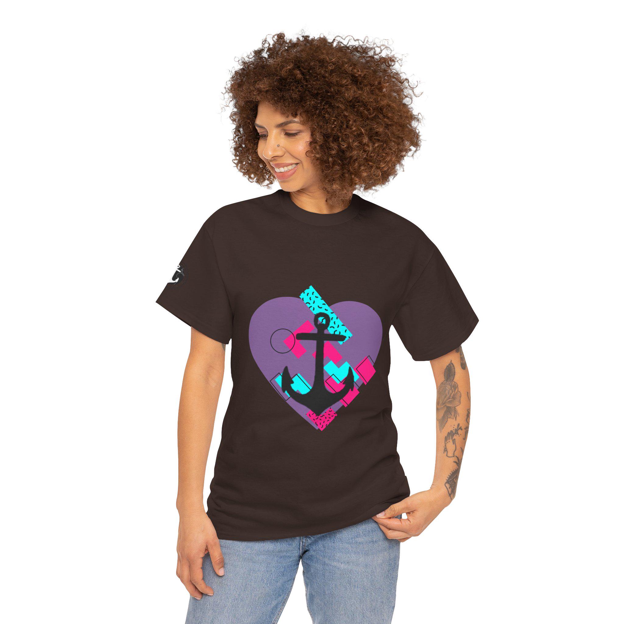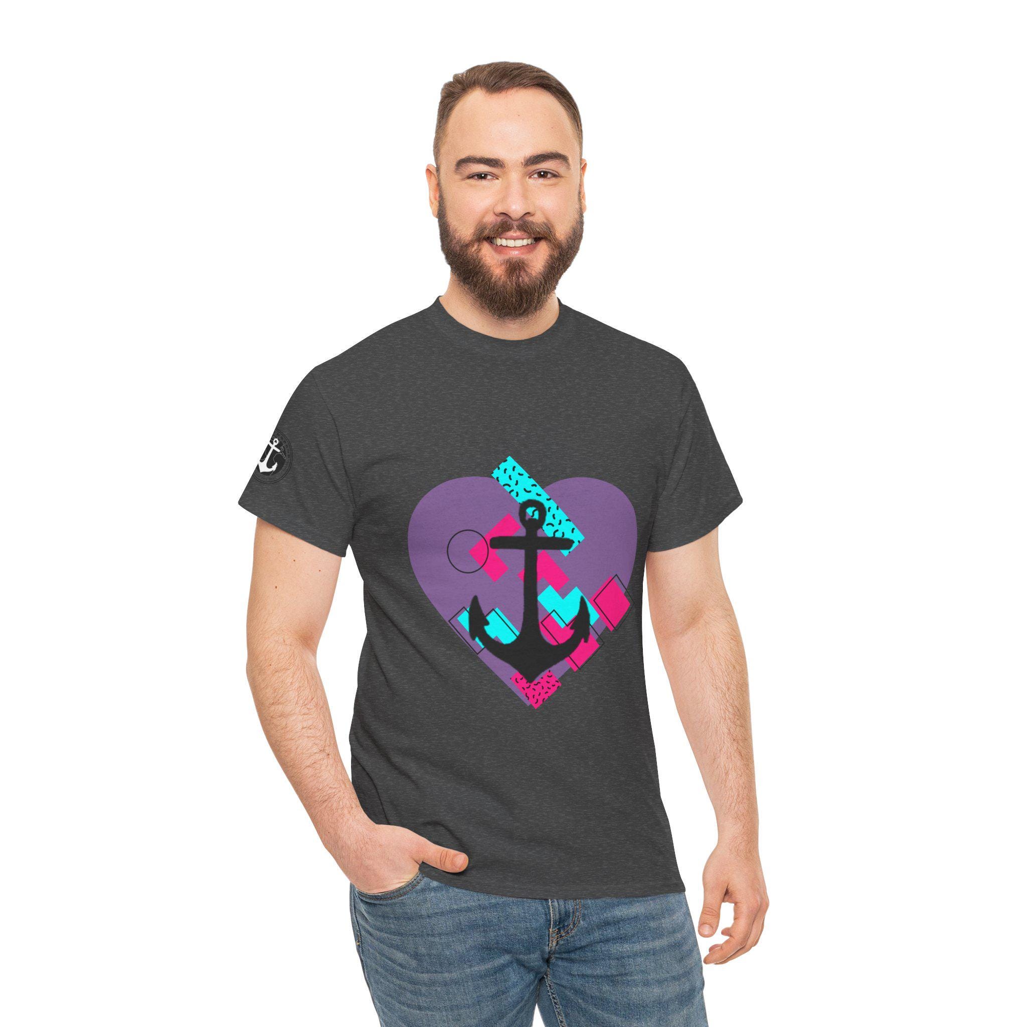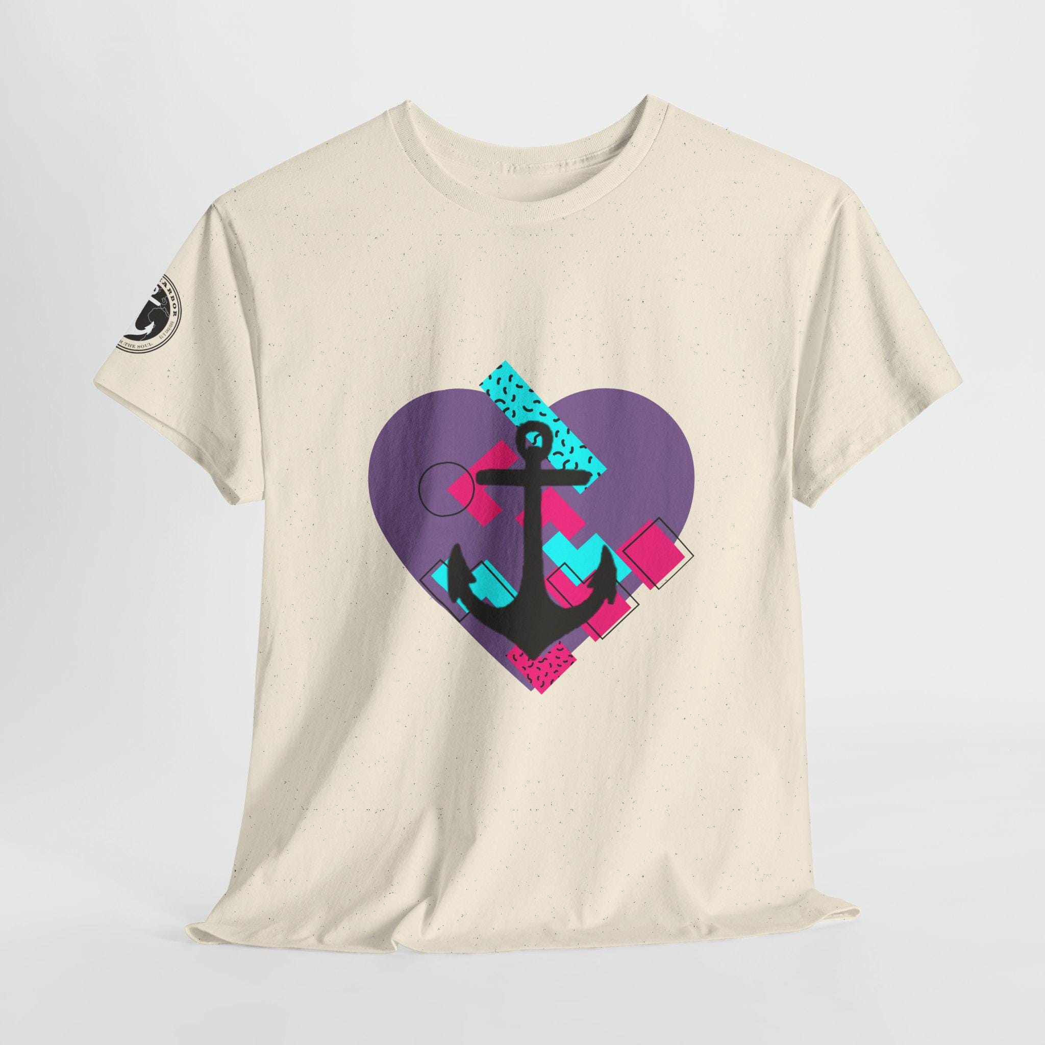 This Tee features a fun 80's pop style with a heart and anchor design that brings a message of hope and love. It offers a comfy, relaxed fit with a crew neckline, making it suitable for any occasion, casual or semi-formal. Made from specially spun fibers, this Tee is perfect for printing and is ethical and sustainable, certified by Oeko-Tex. Ideal for adults looking to add a touch of retro style to their wardrobe.