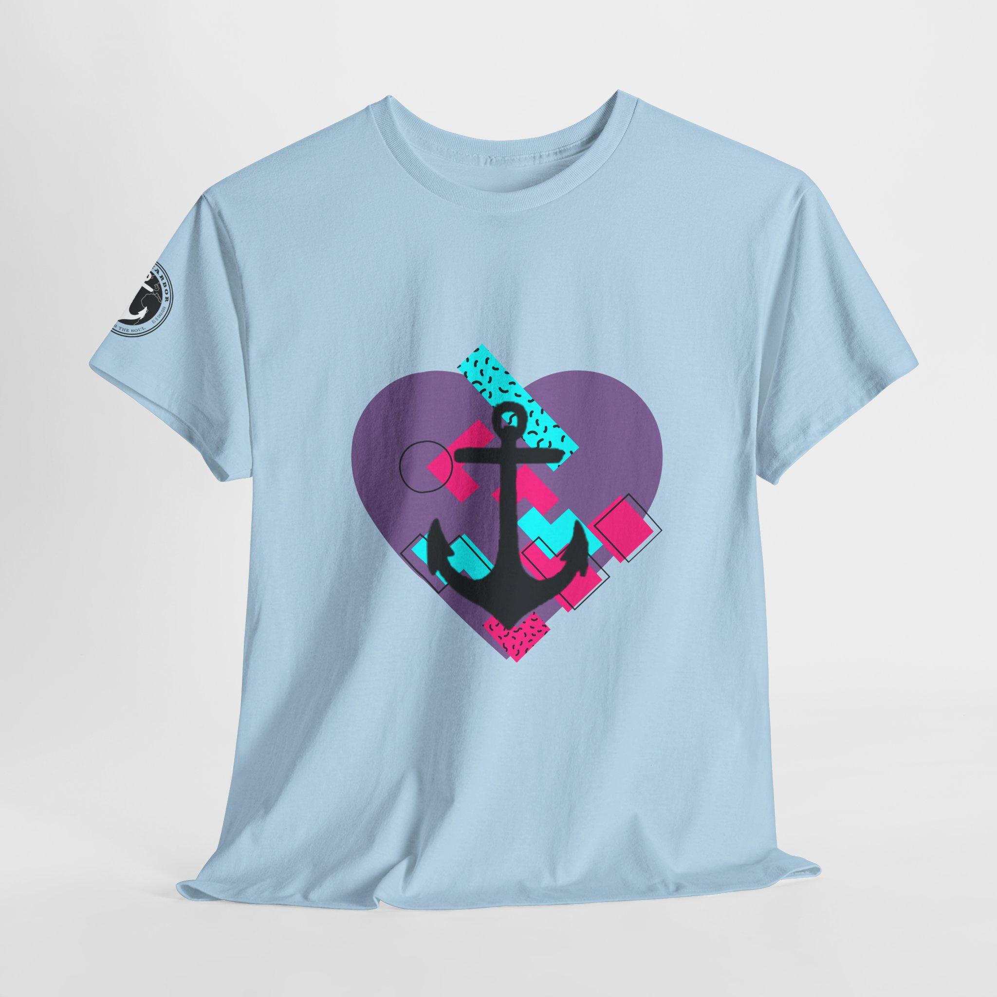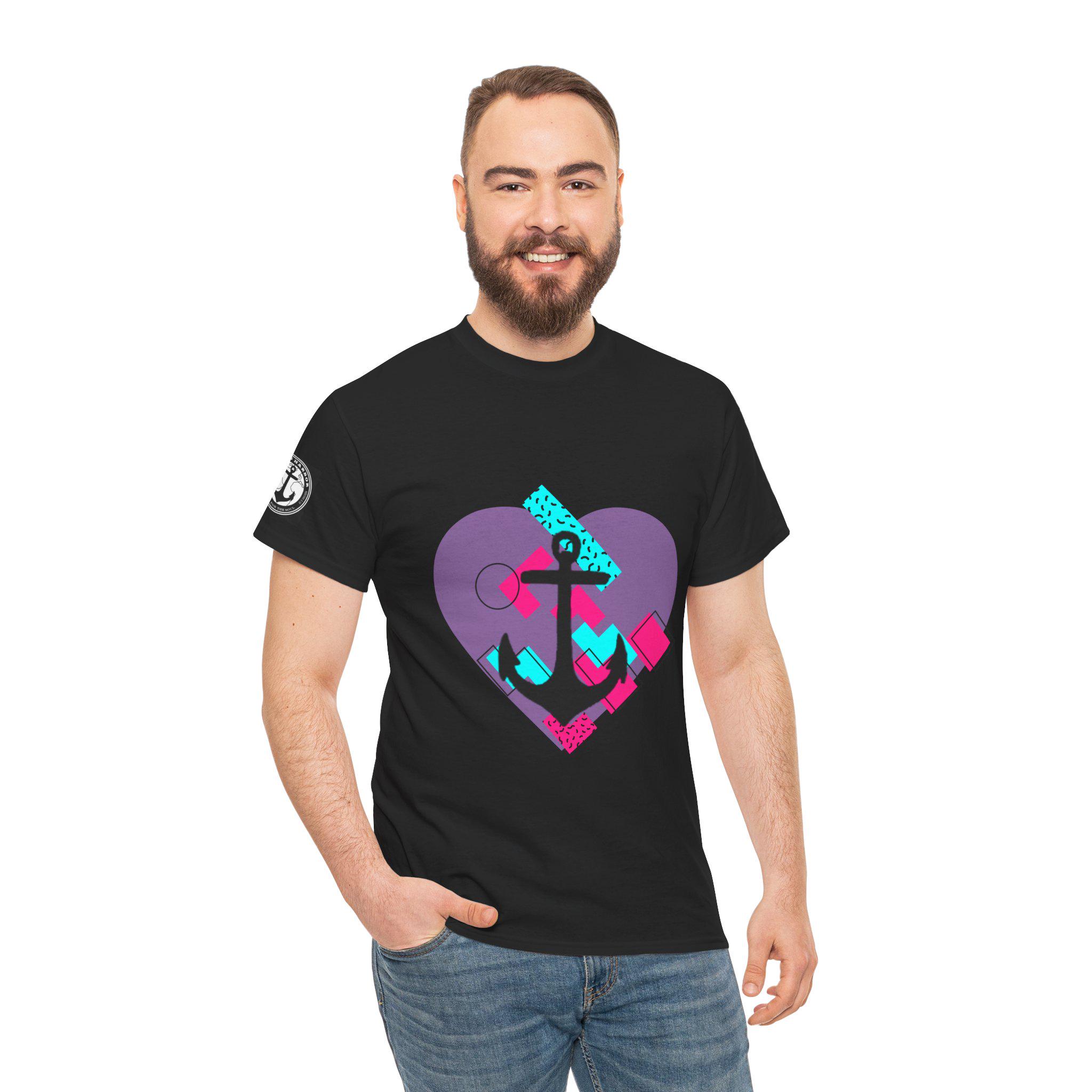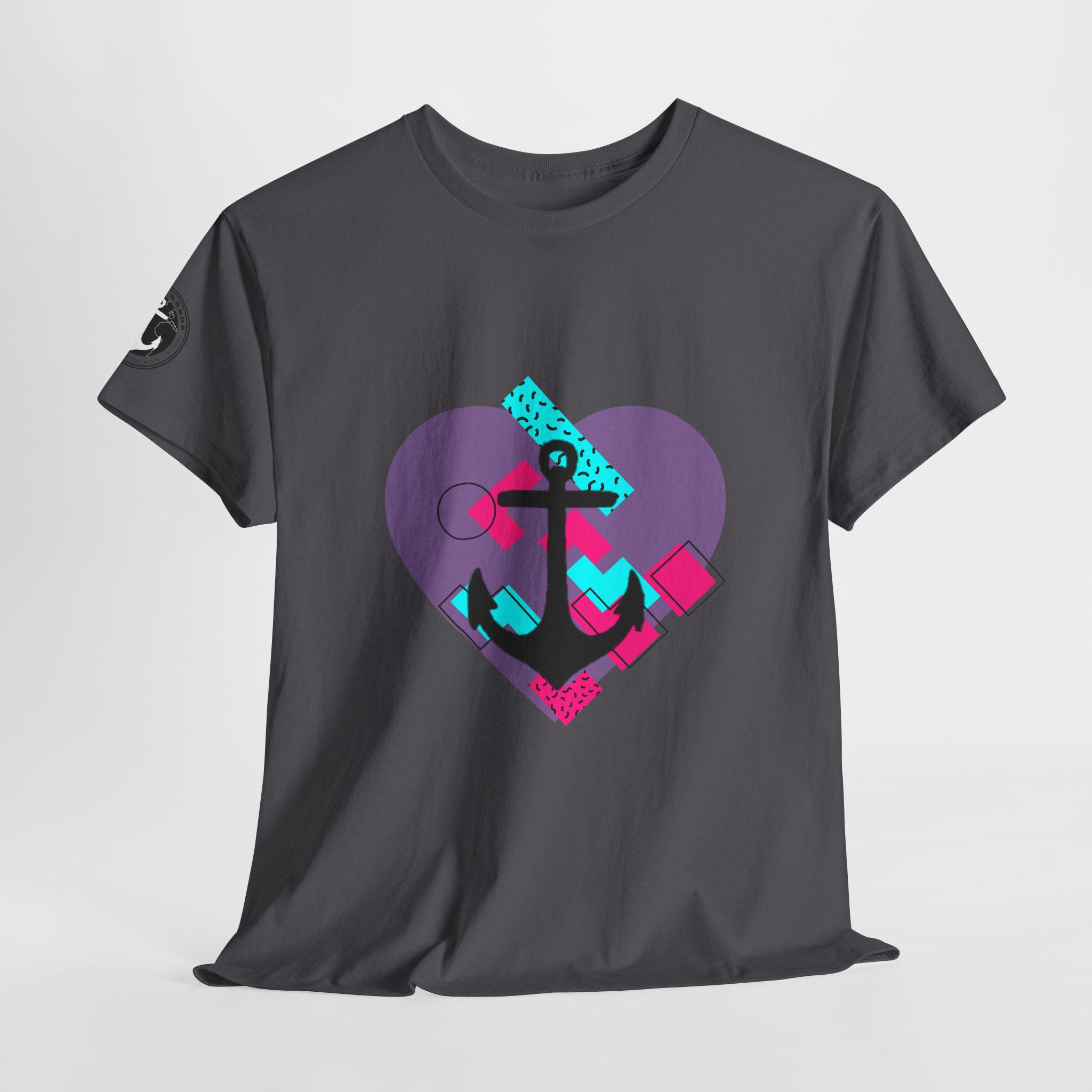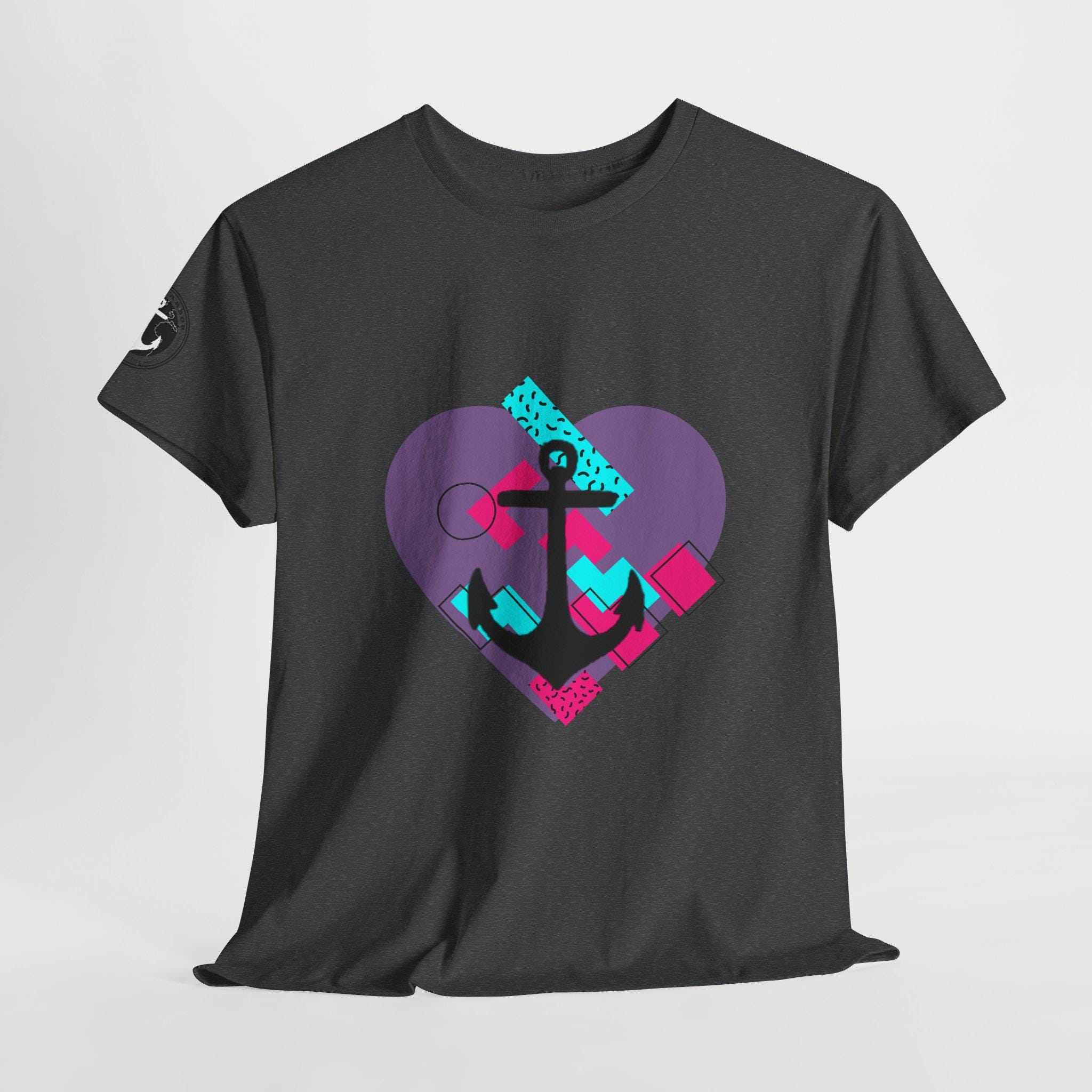 This Tee features a fun 80's pop style with a heart and anchor design that brings a message of hope and love. It offers a comfy, relaxed fit with a crew neckline, making it suitable for any occasion, casual or semi-formal. Made from specially spun fibers, this Tee is perfect for printing and is ethical and sustainable, certified by Oeko-Tex. Ideal for adults looking to add a touch of retro style to their wardrobe.