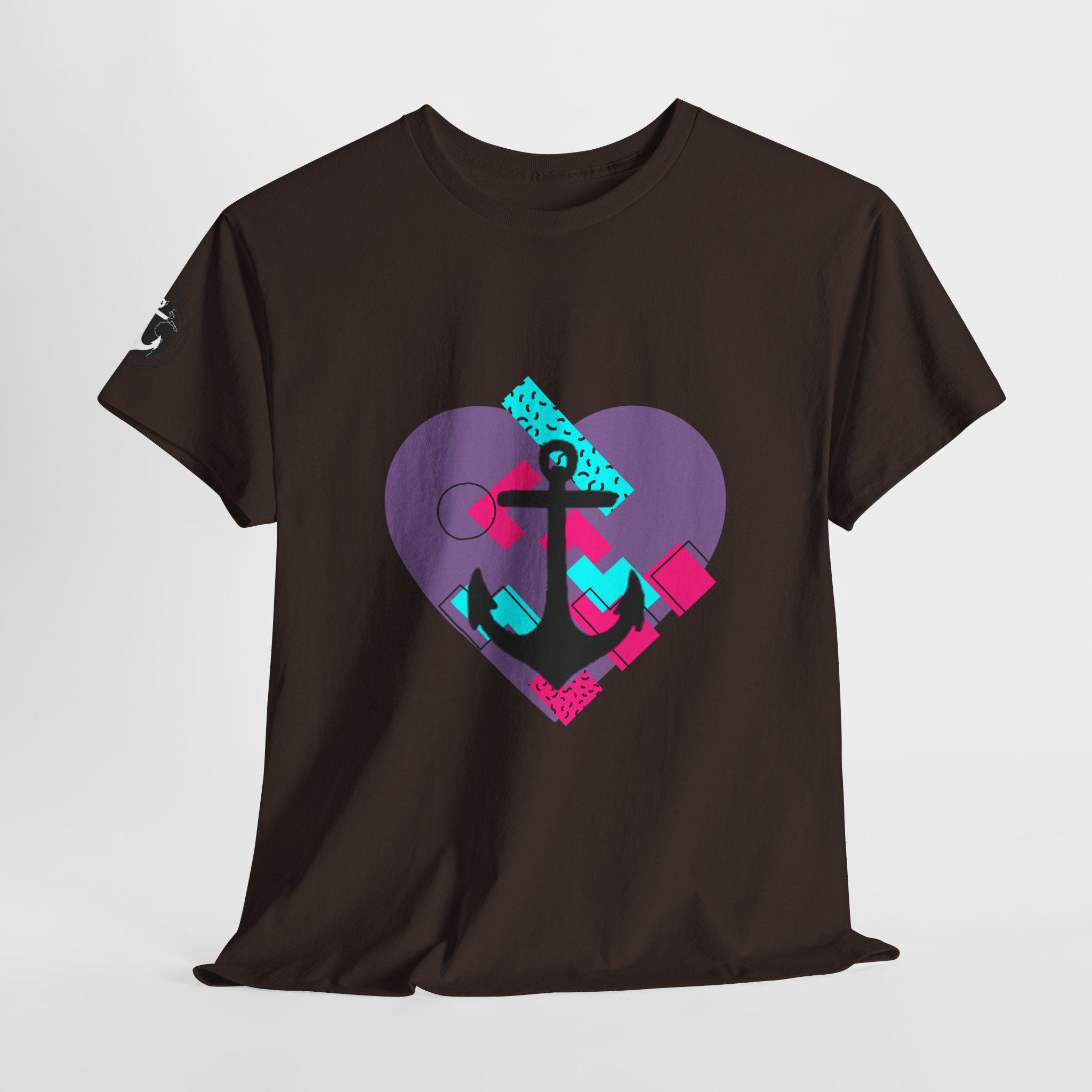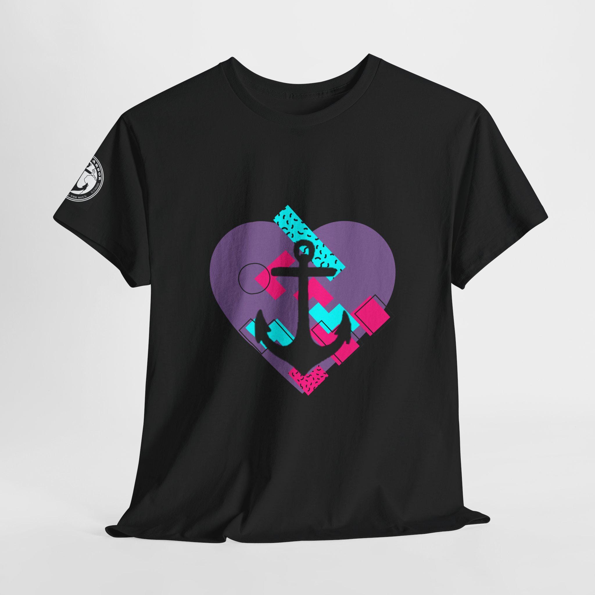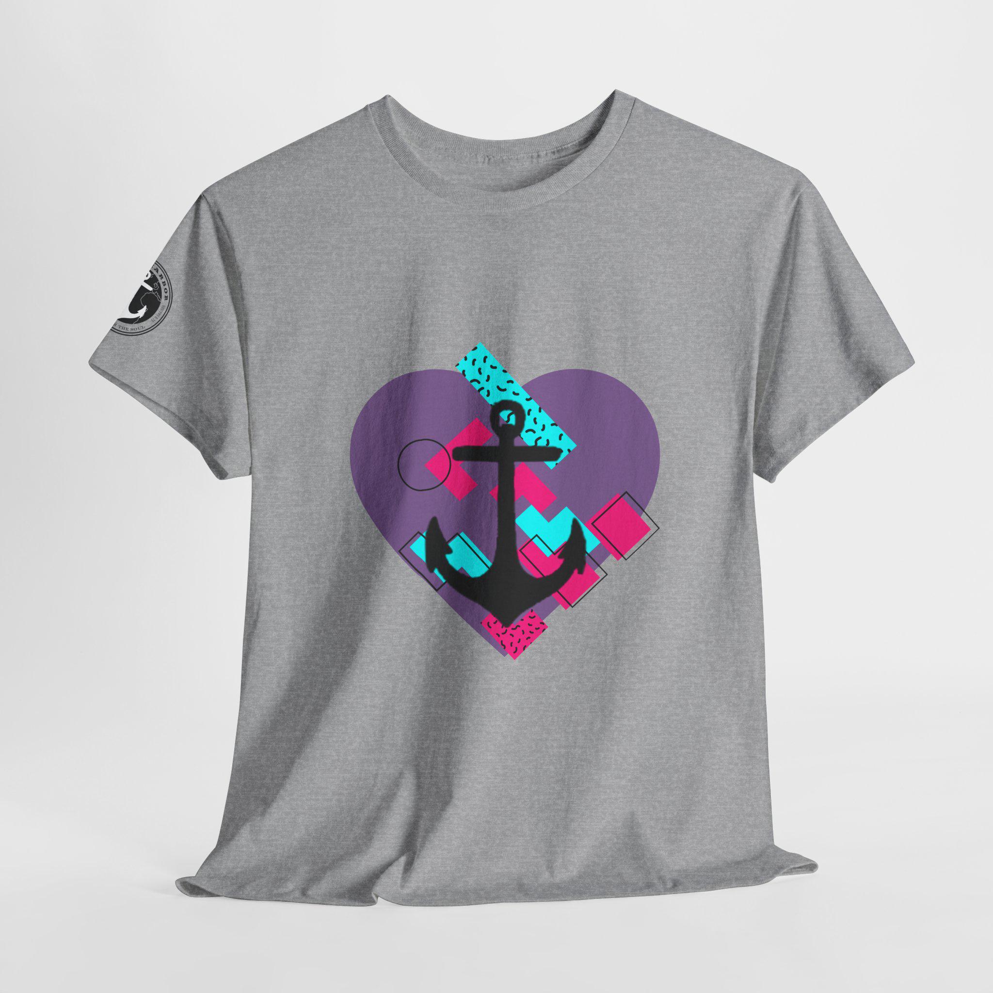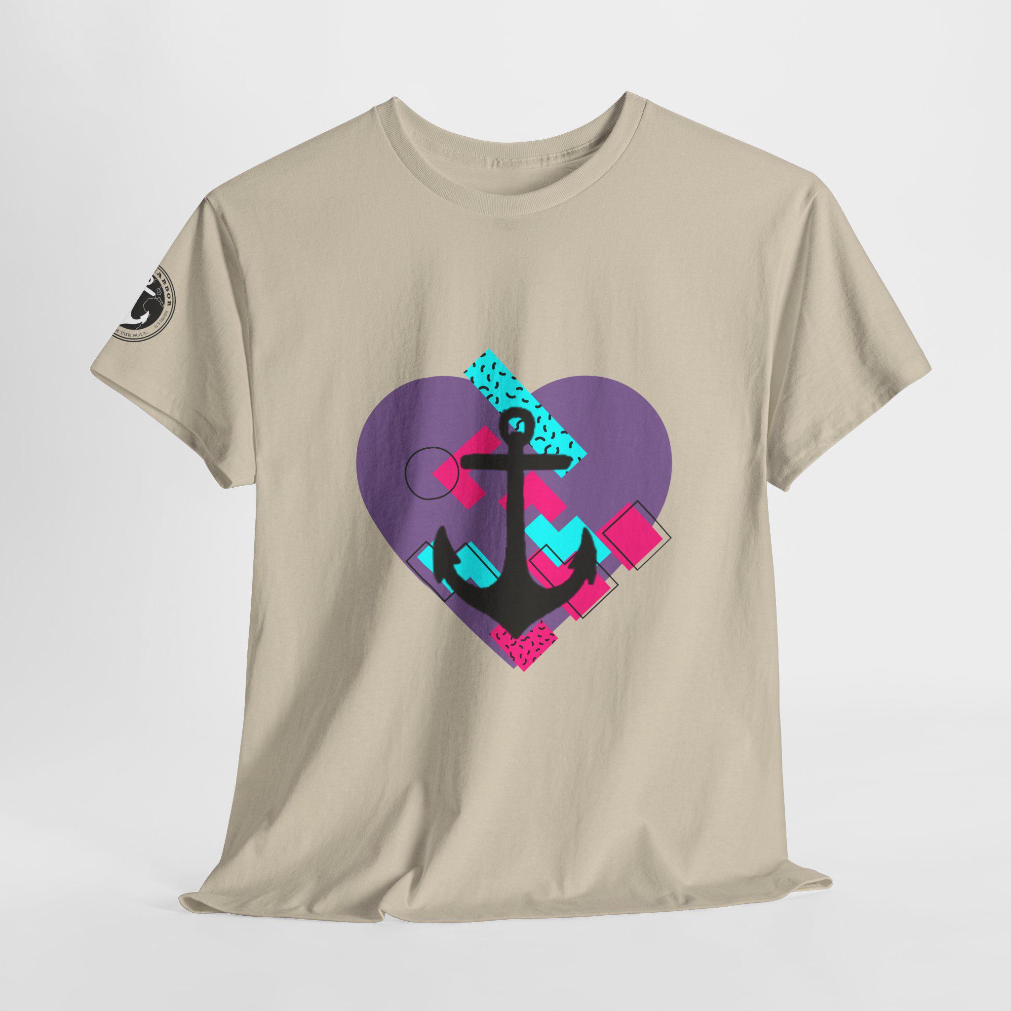 This Tee features a fun 80's pop style with a heart and anchor design that brings a message of hope and love. It offers a comfy, relaxed fit with a crew neckline, making it suitable for any occasion, casual or semi-formal. Made from specially spun fibers, this Tee is perfect for printing and is ethical and sustainable, certified by Oeko-Tex. Ideal for adults looking to add a touch of retro style to their wardrobe.