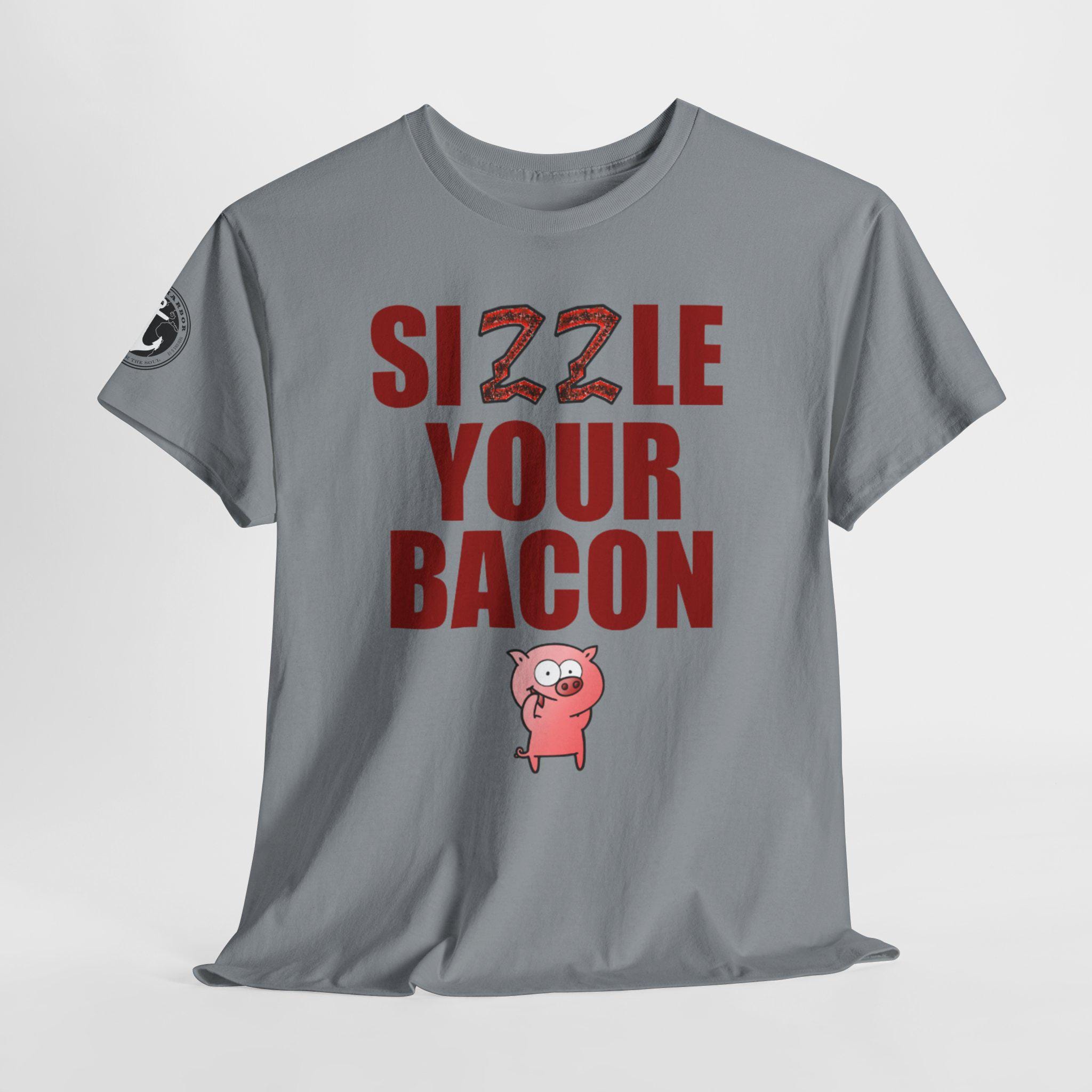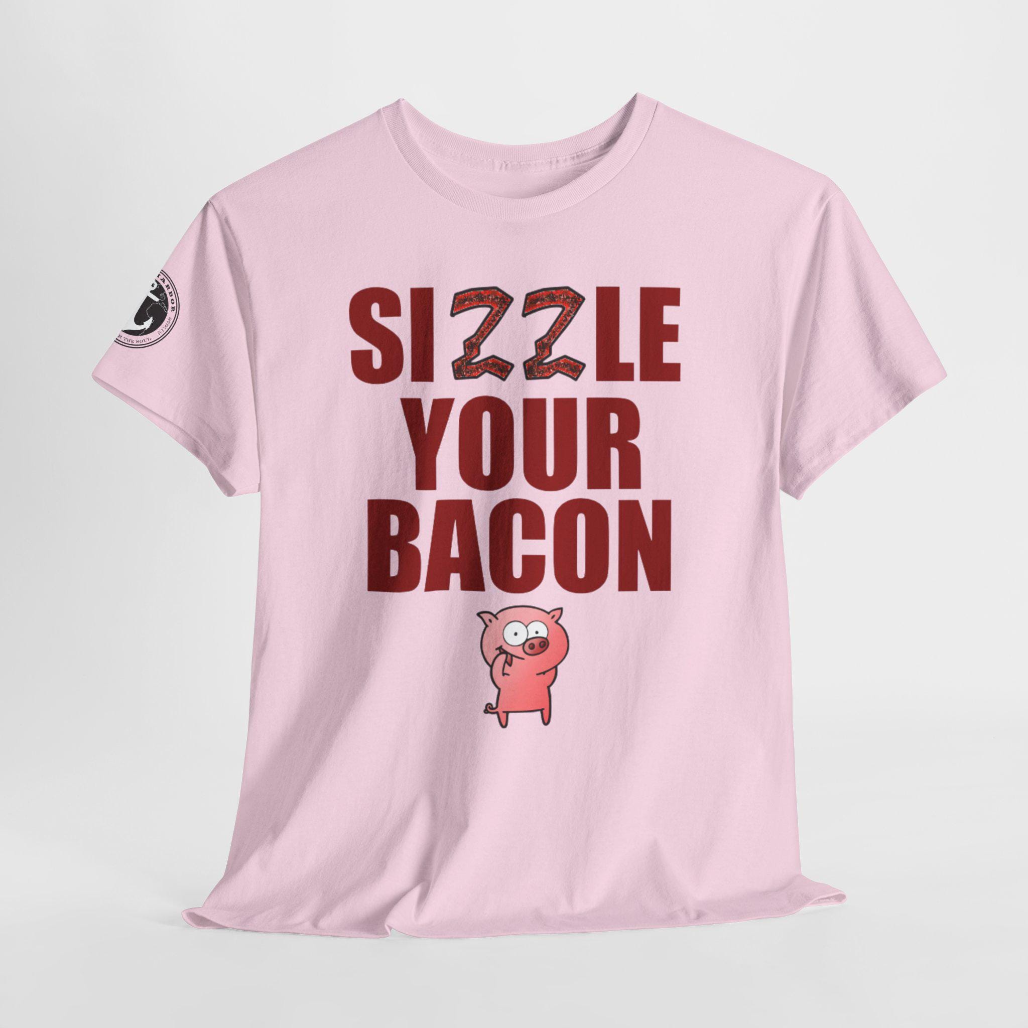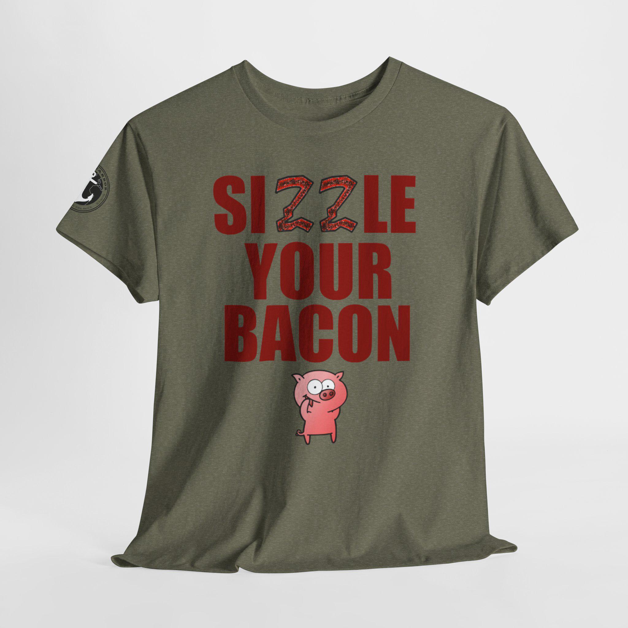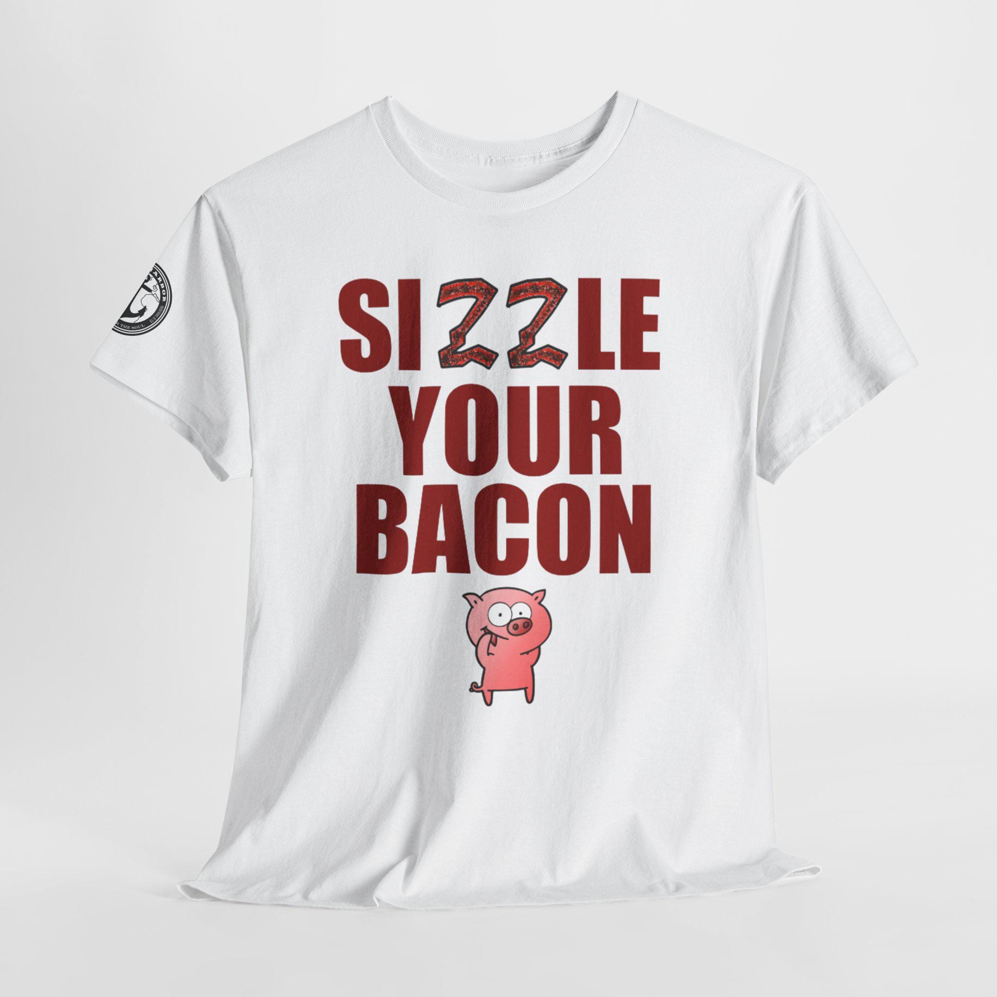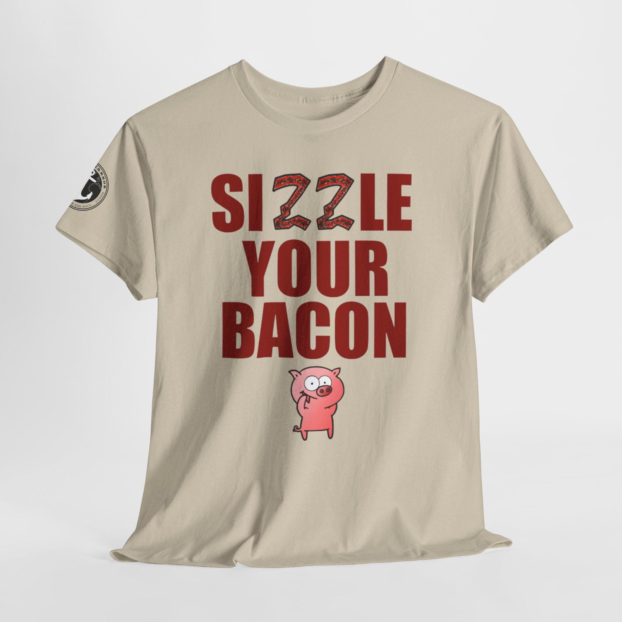 A fun and playful T-Shirt with the phrase "Sizzle Your Bacon" that will bring a sense of humor to any meat eater's wardrobe. Perfect for wearing to a game, BBQ event, or any fun activity. Suitable for adults and made with high-quality materials for lasting durability.