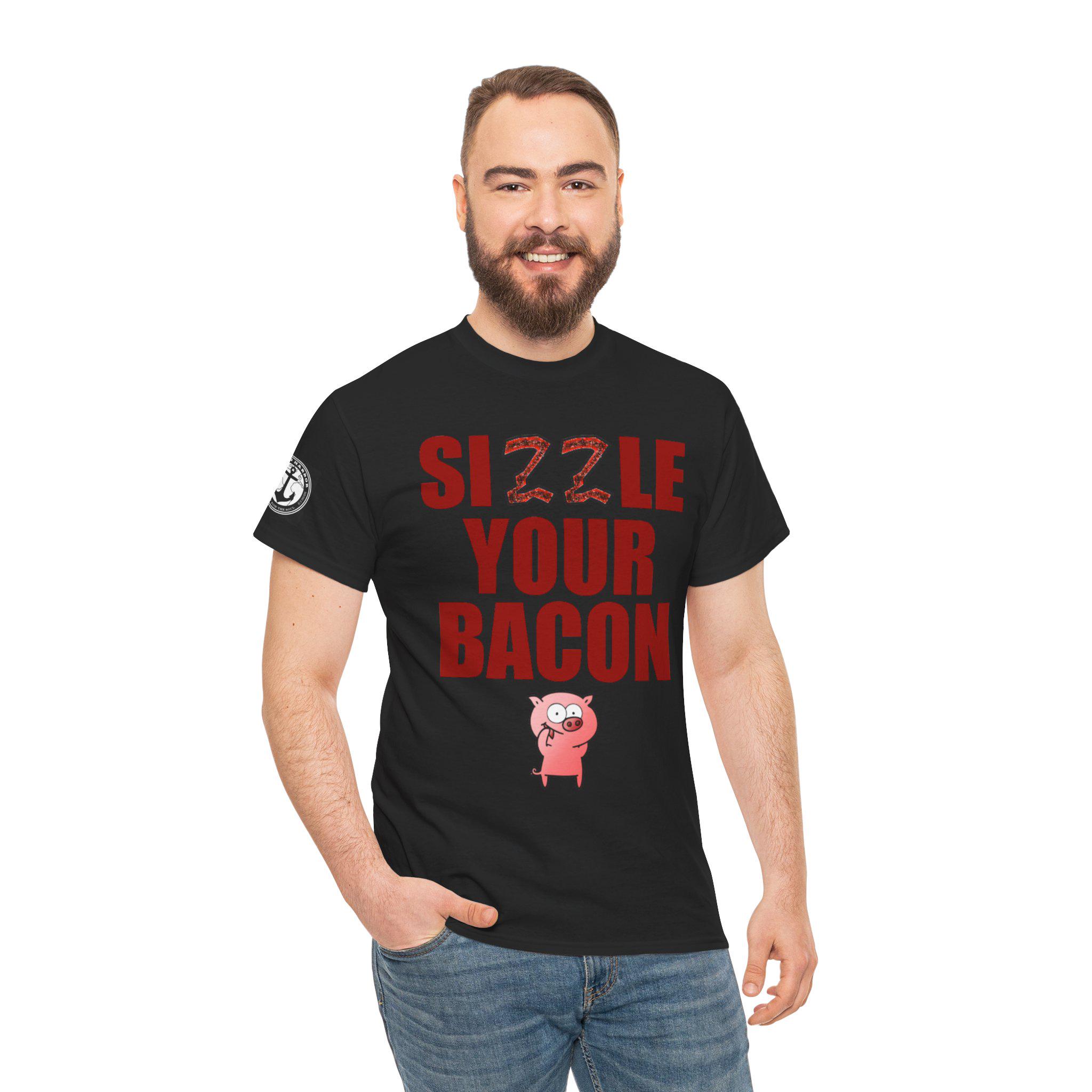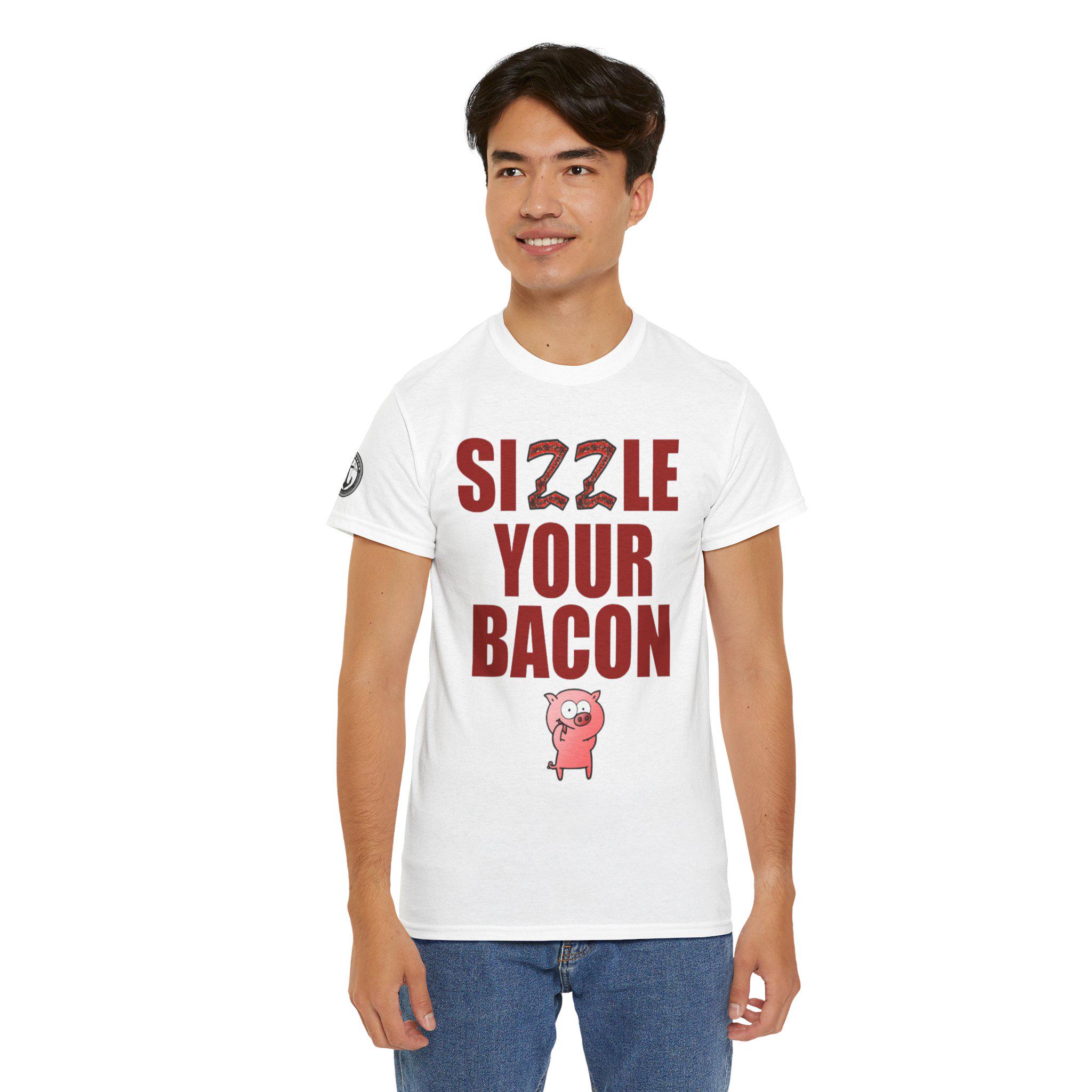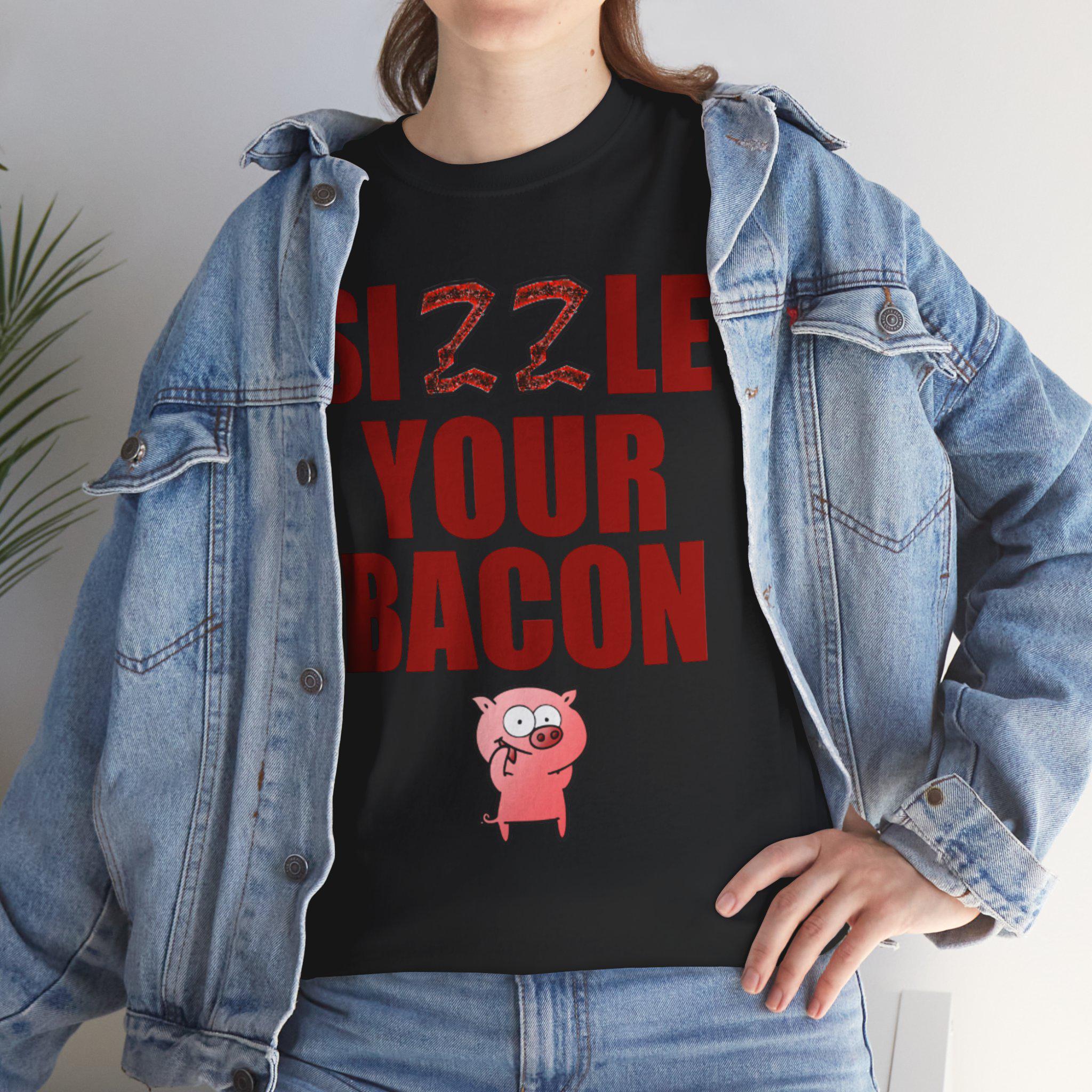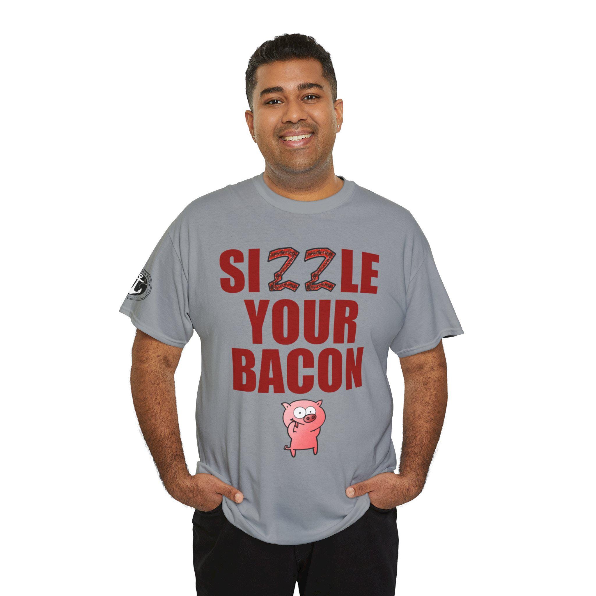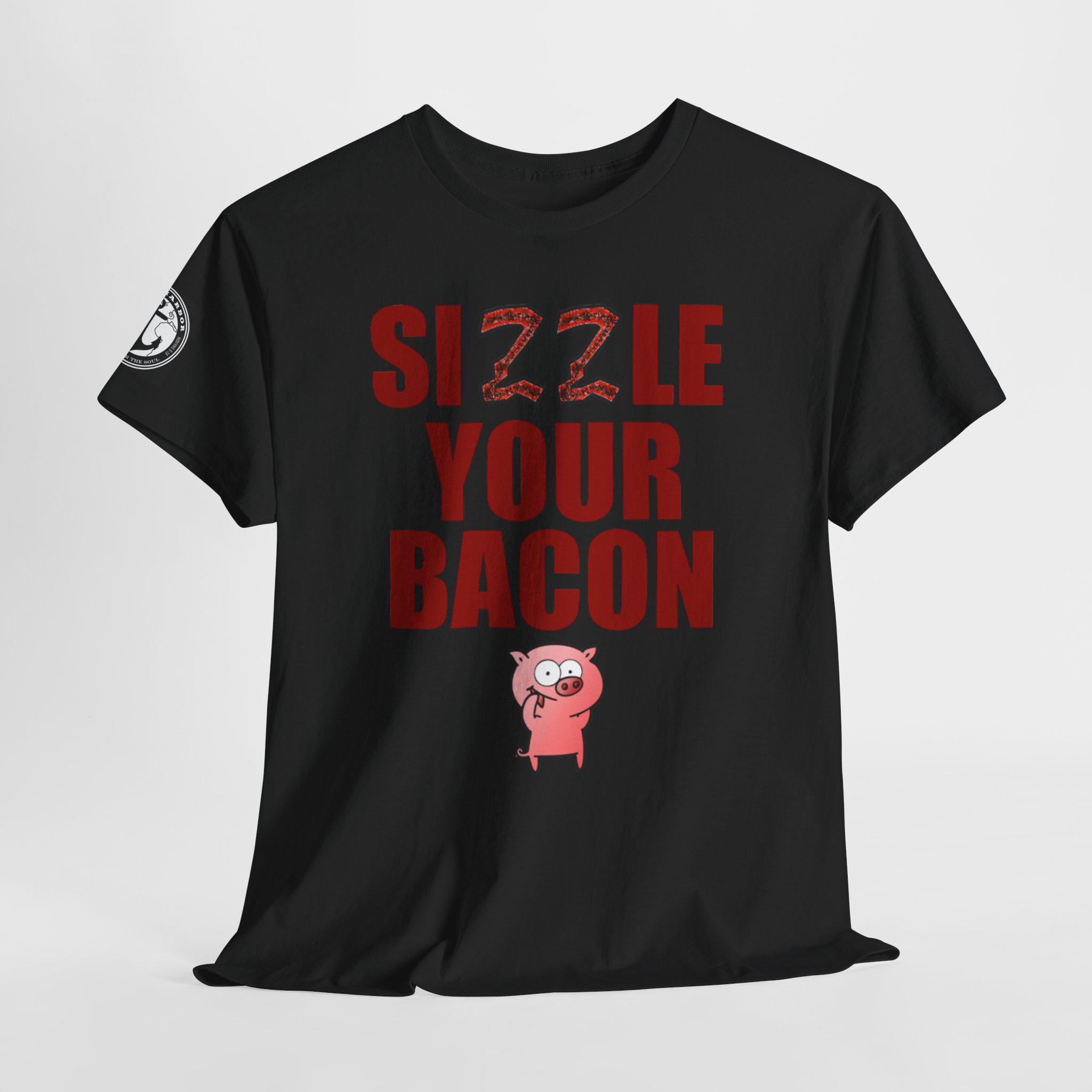 A fun and playful T-Shirt with the phrase "Sizzle Your Bacon" that will bring a sense of humor to any meat eater's wardrobe. Perfect for wearing to a game, BBQ event, or any fun activity. Suitable for adults and made with high-quality materials for lasting durability.