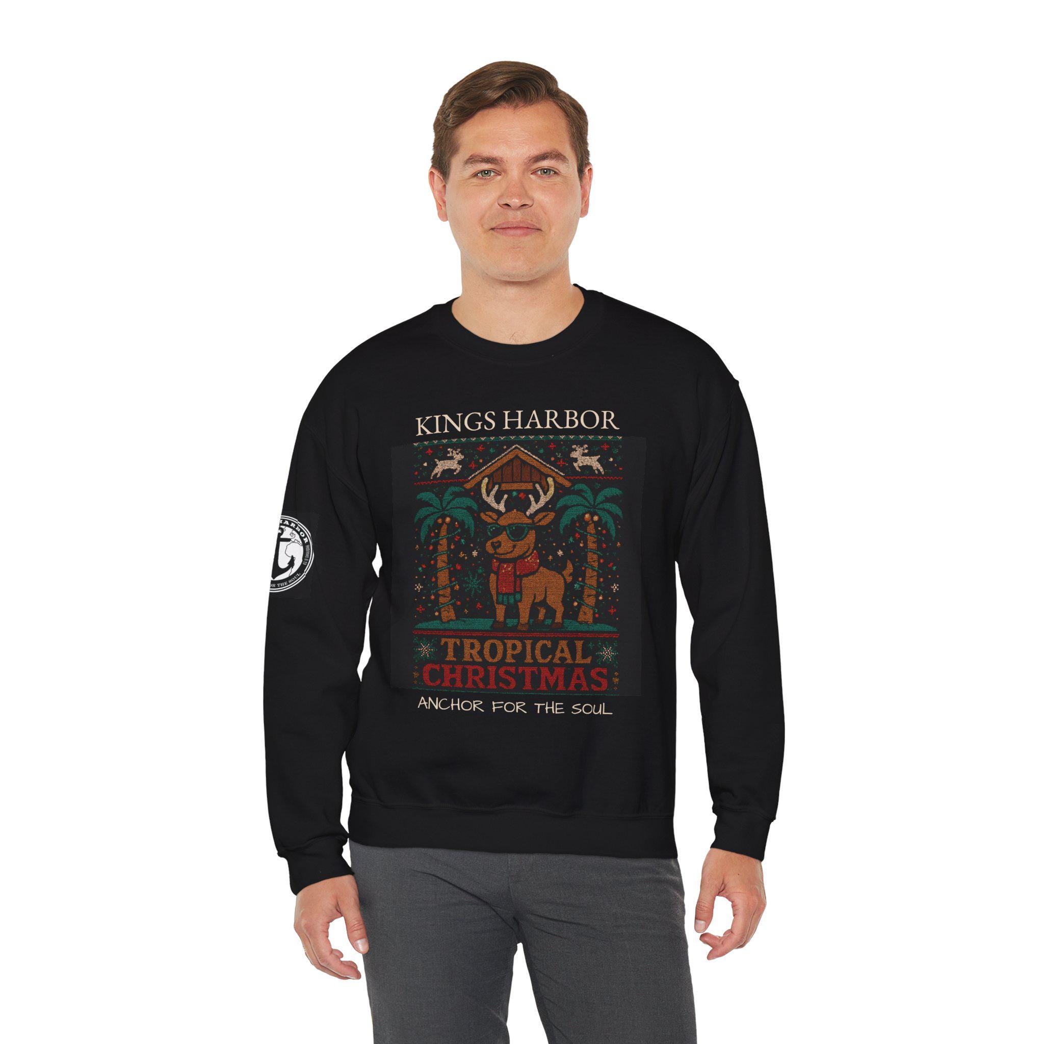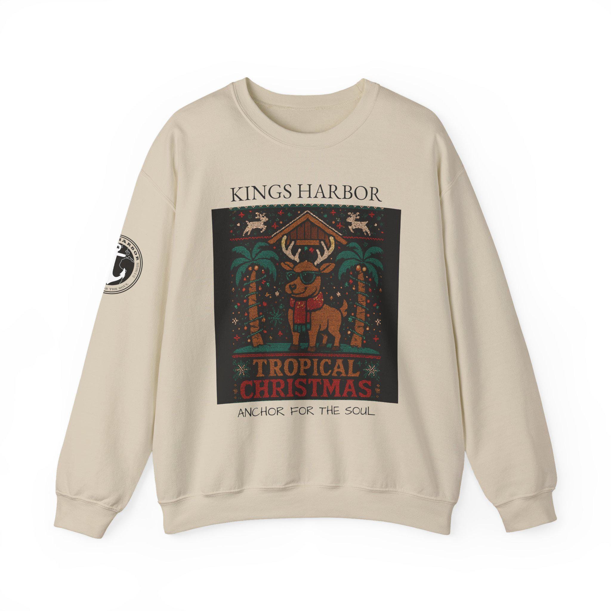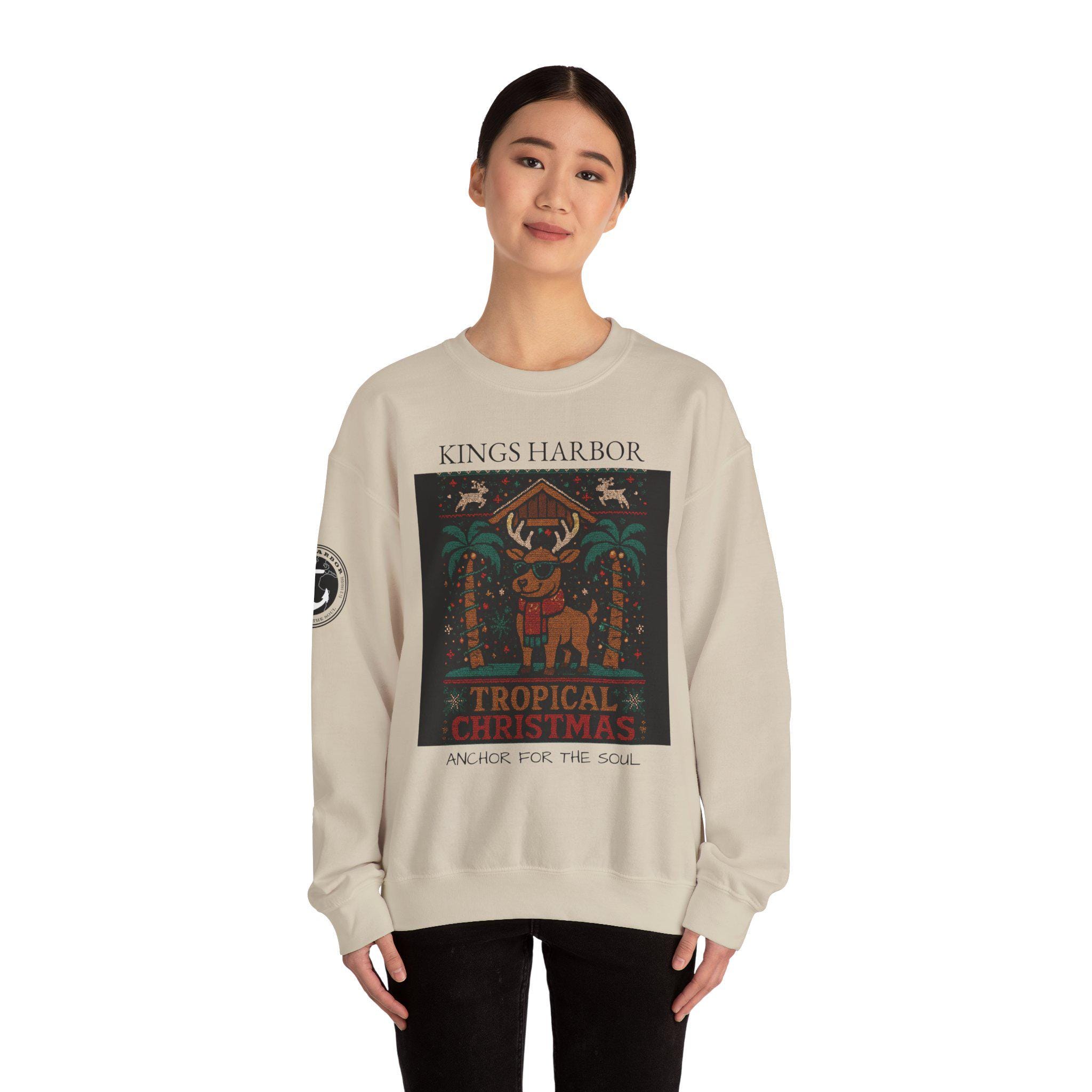 Get ready for the holiday season with this fun 'Ugly Sweater' inspired Sweatshirt featuring a reindeer and palm tree for a Tropical Christmas. Perfect for Christmas gatherings and festive celebrations, this unisex sweatshirt offers comfort, durability, and a unique holiday vibe.