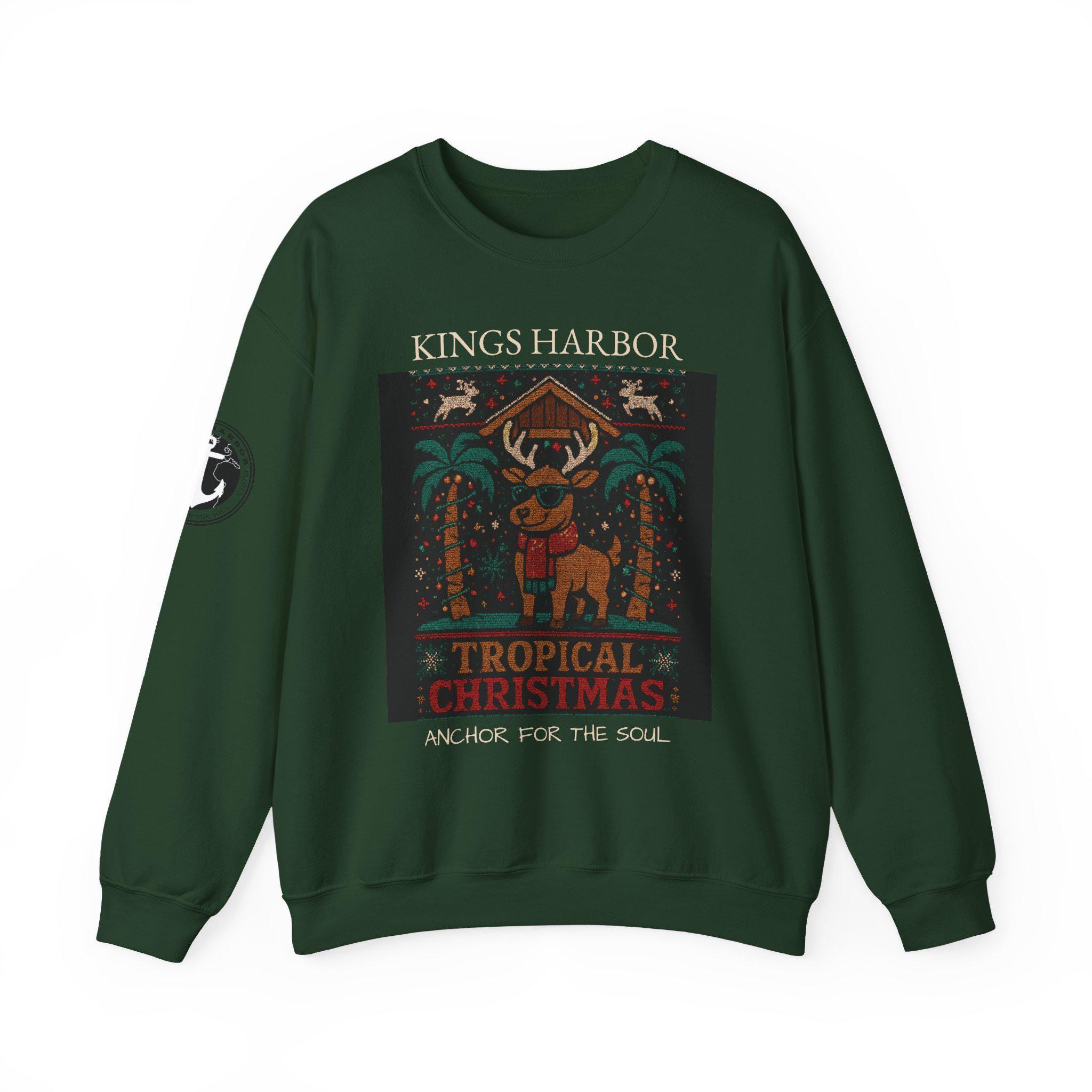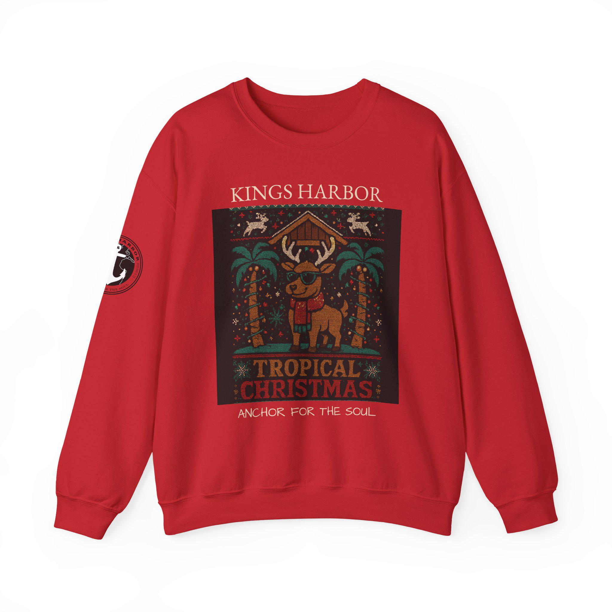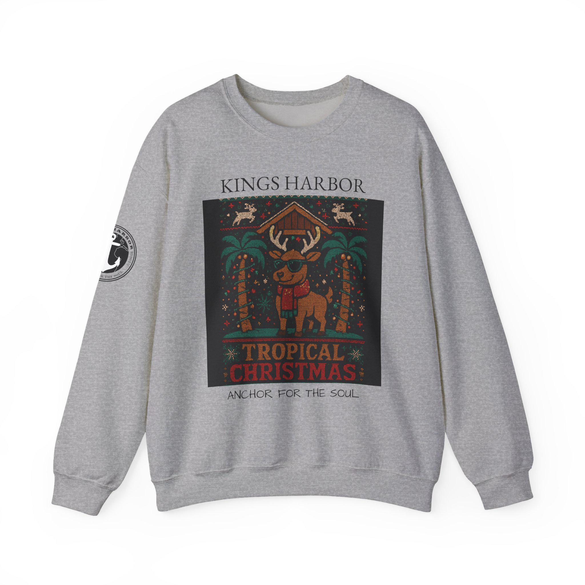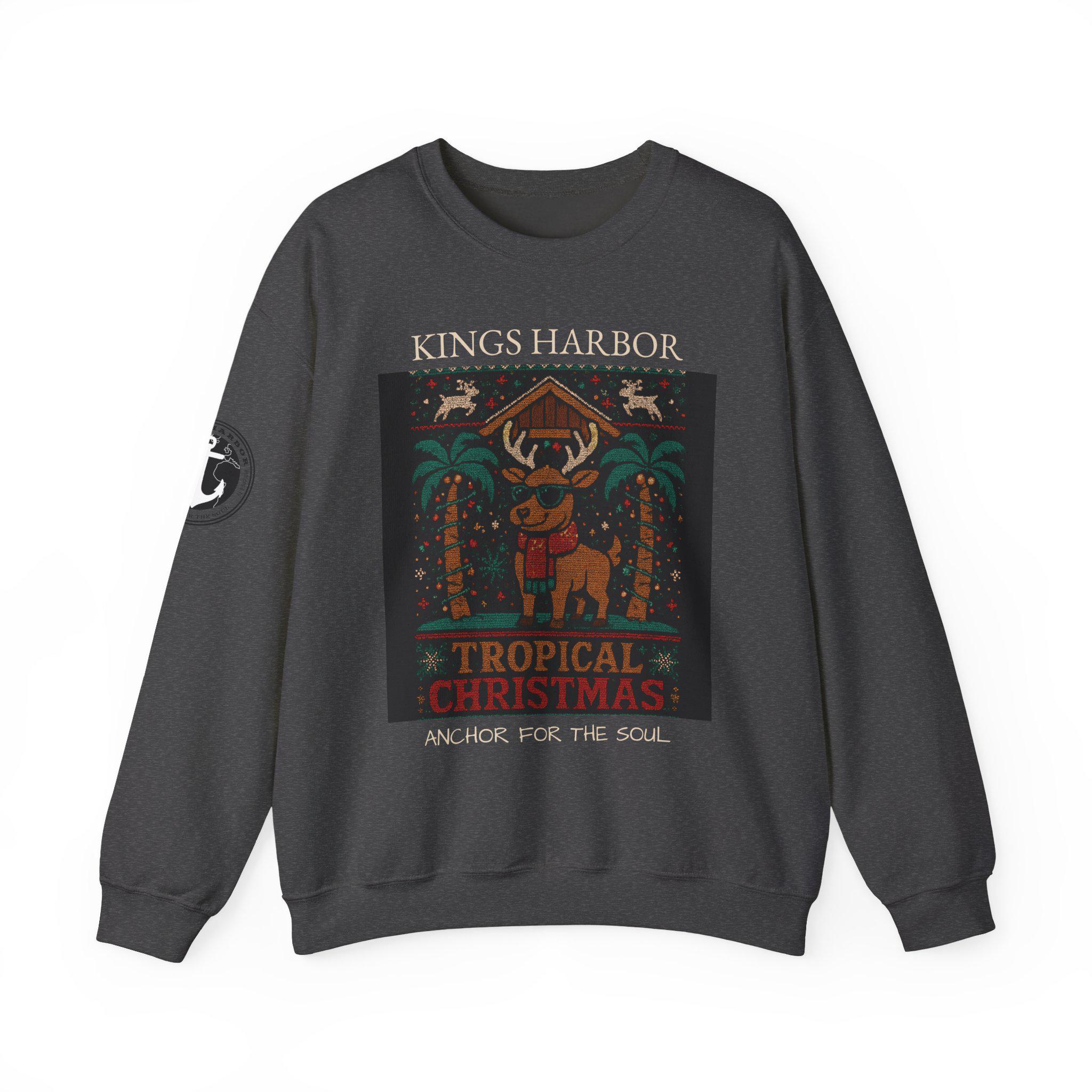 Get ready for the holiday season with this fun 'Ugly Sweater' inspired Sweatshirt featuring a reindeer and palm tree for a Tropical Christmas. Perfect for Christmas gatherings and festive celebrations, this unisex sweatshirt offers comfort, durability, and a unique holiday vibe.