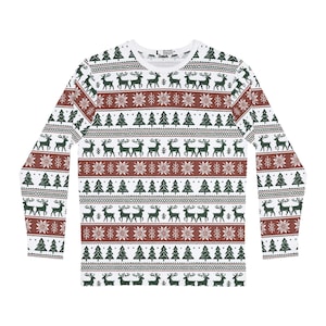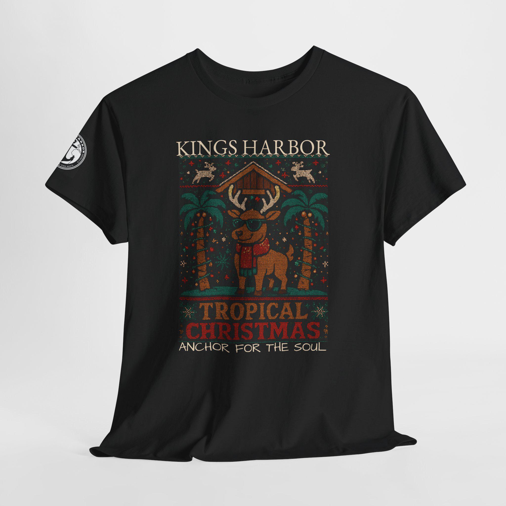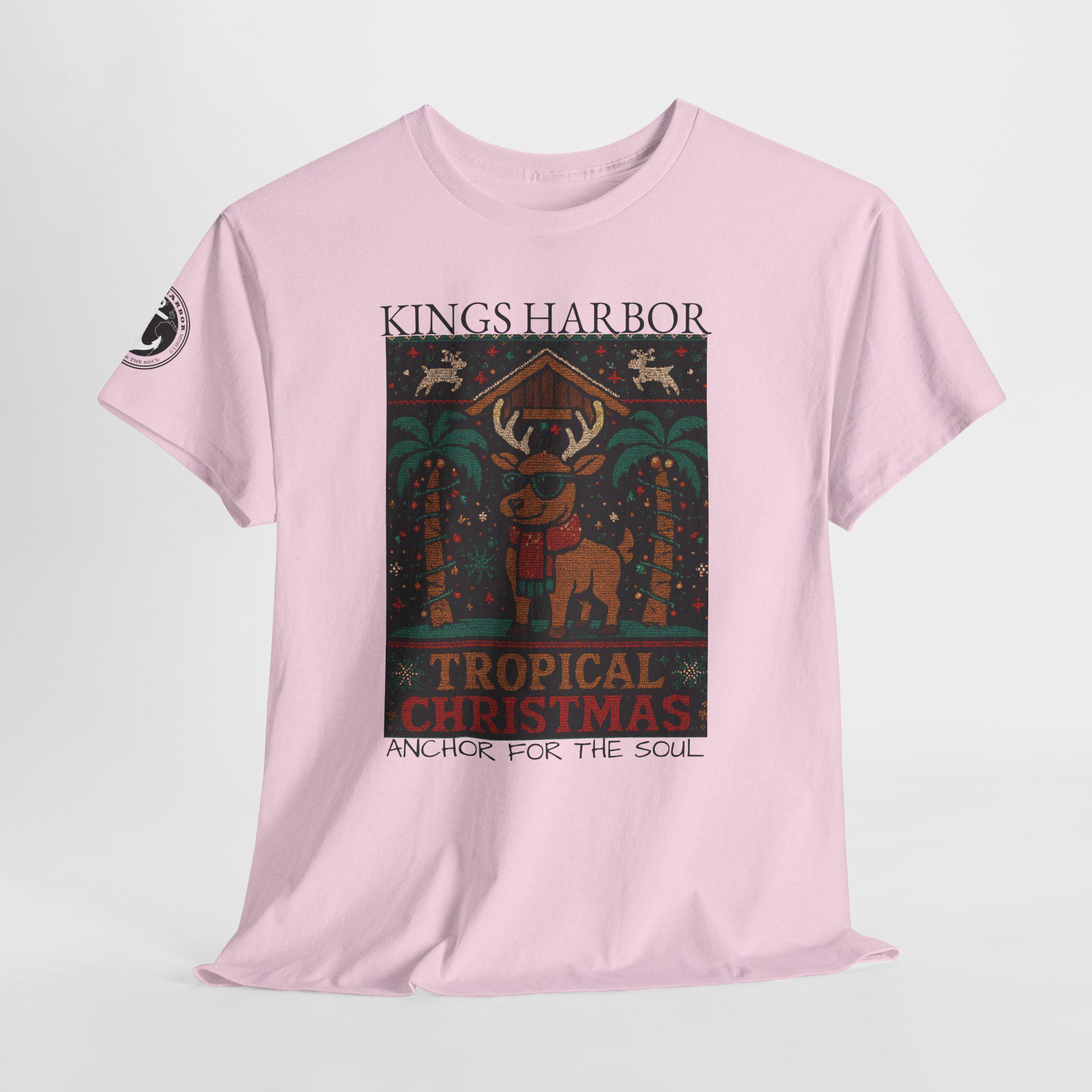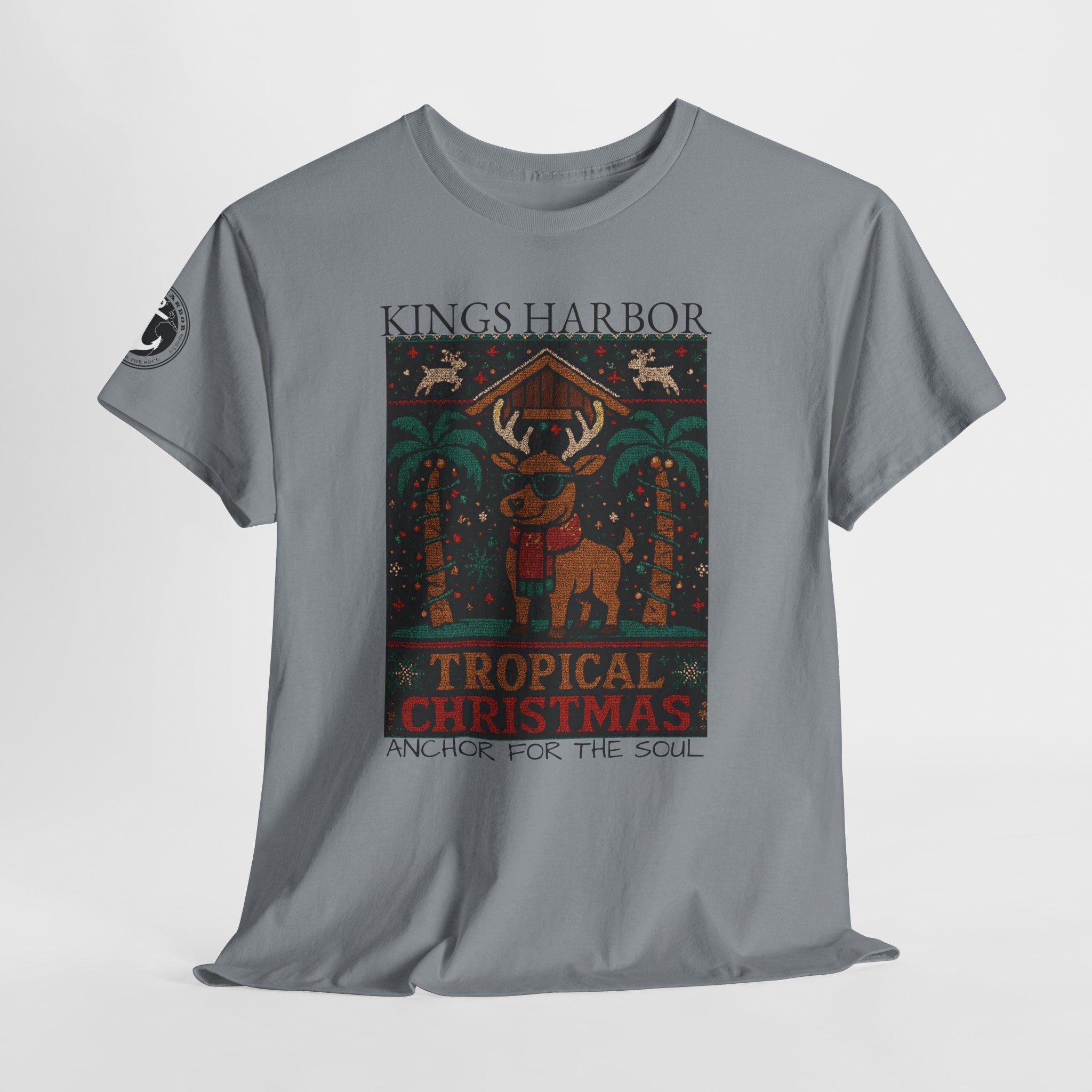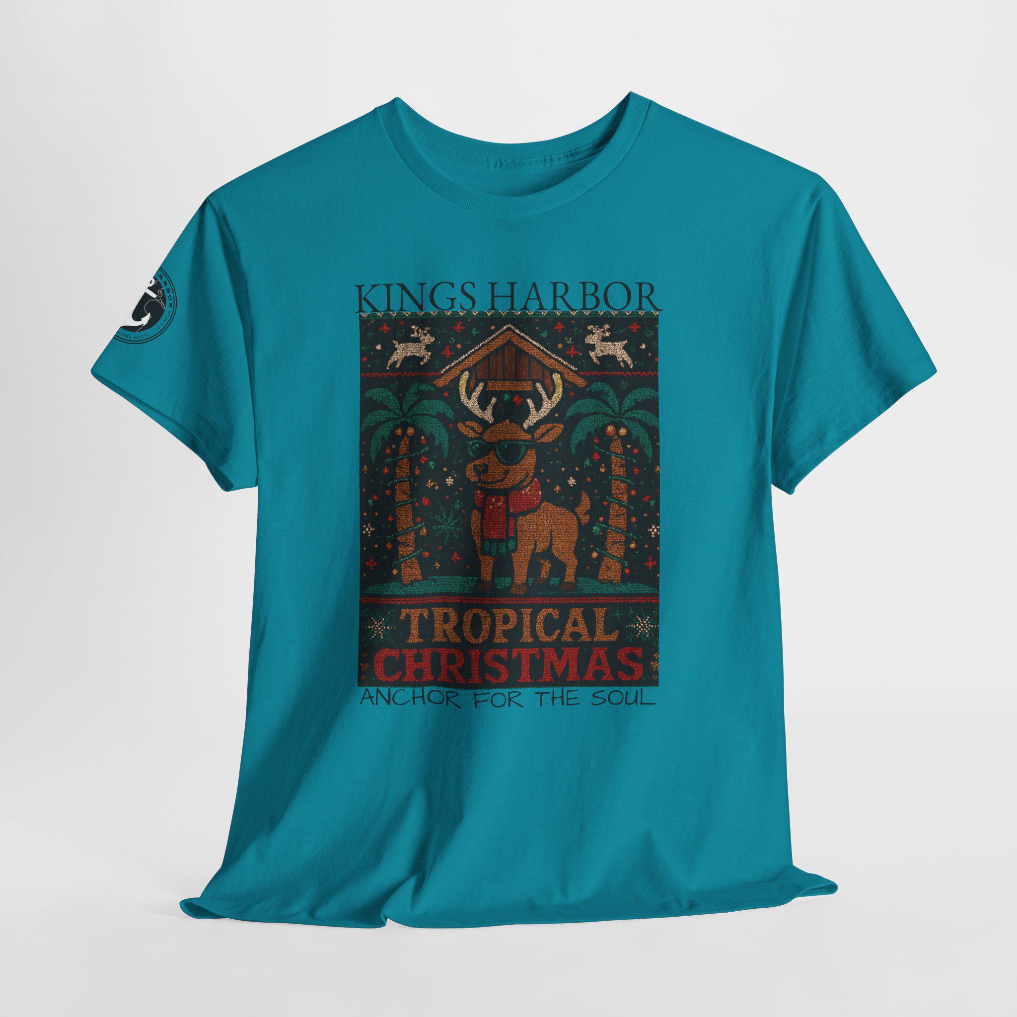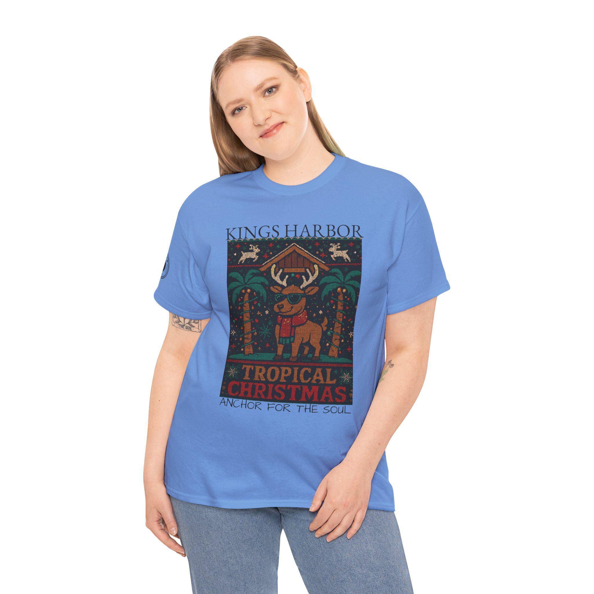 This 'Ugly Sweater' T-Shirt with a reindeer in a Tropical Christmas scene is a great way to celebrate the holidays. The design gives off a fun and festive vibe, perfect for those who enjoy unique holiday apparel. Ideal for adults looking to add a touch of humor to their holiday wardrobe, suitable for Christmas parties and festive gatherings.