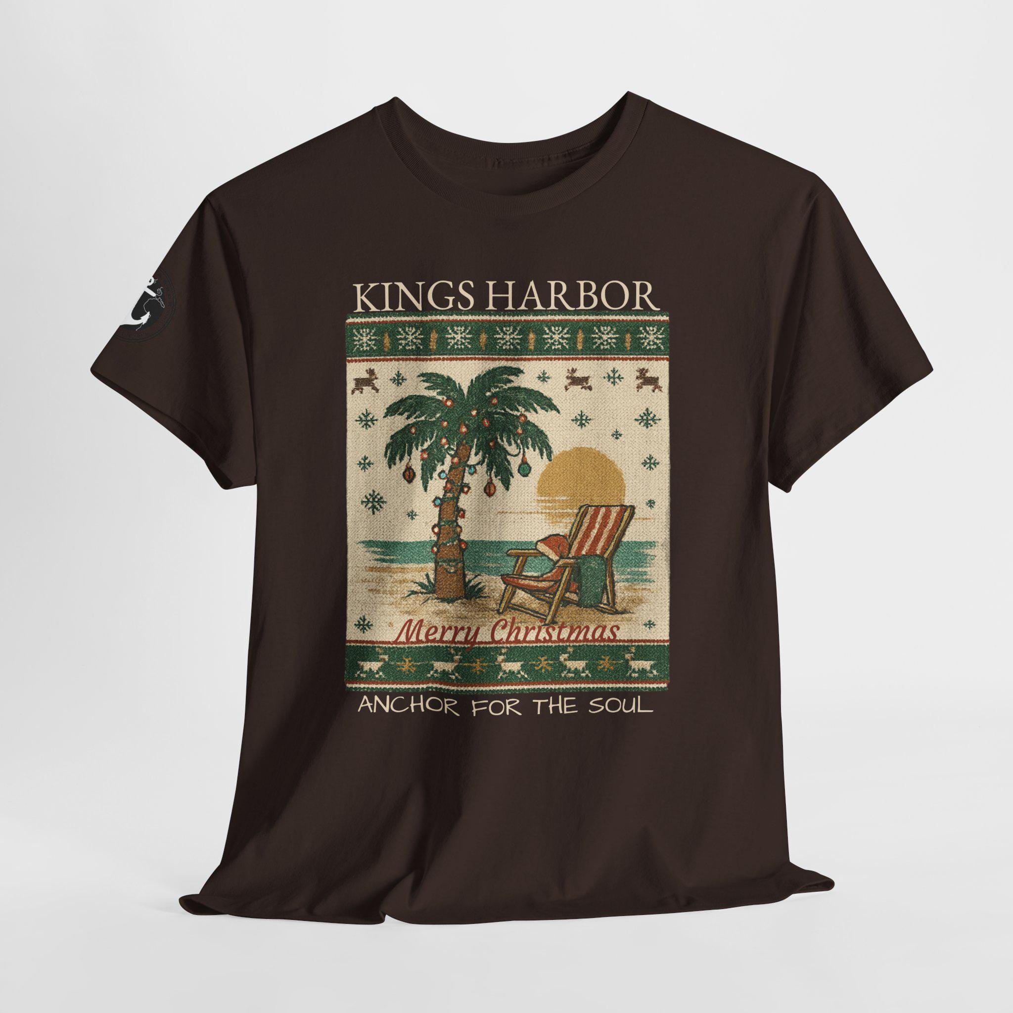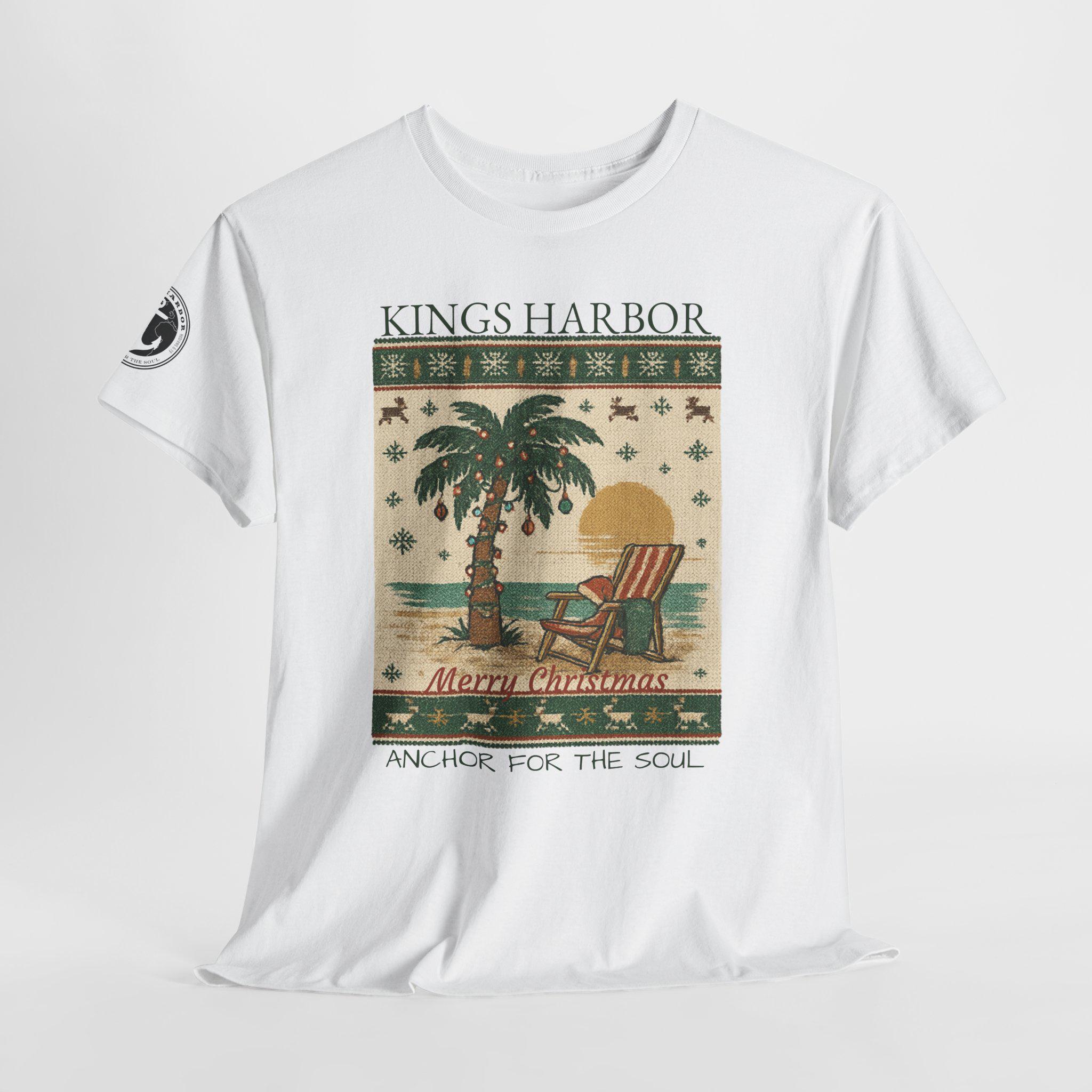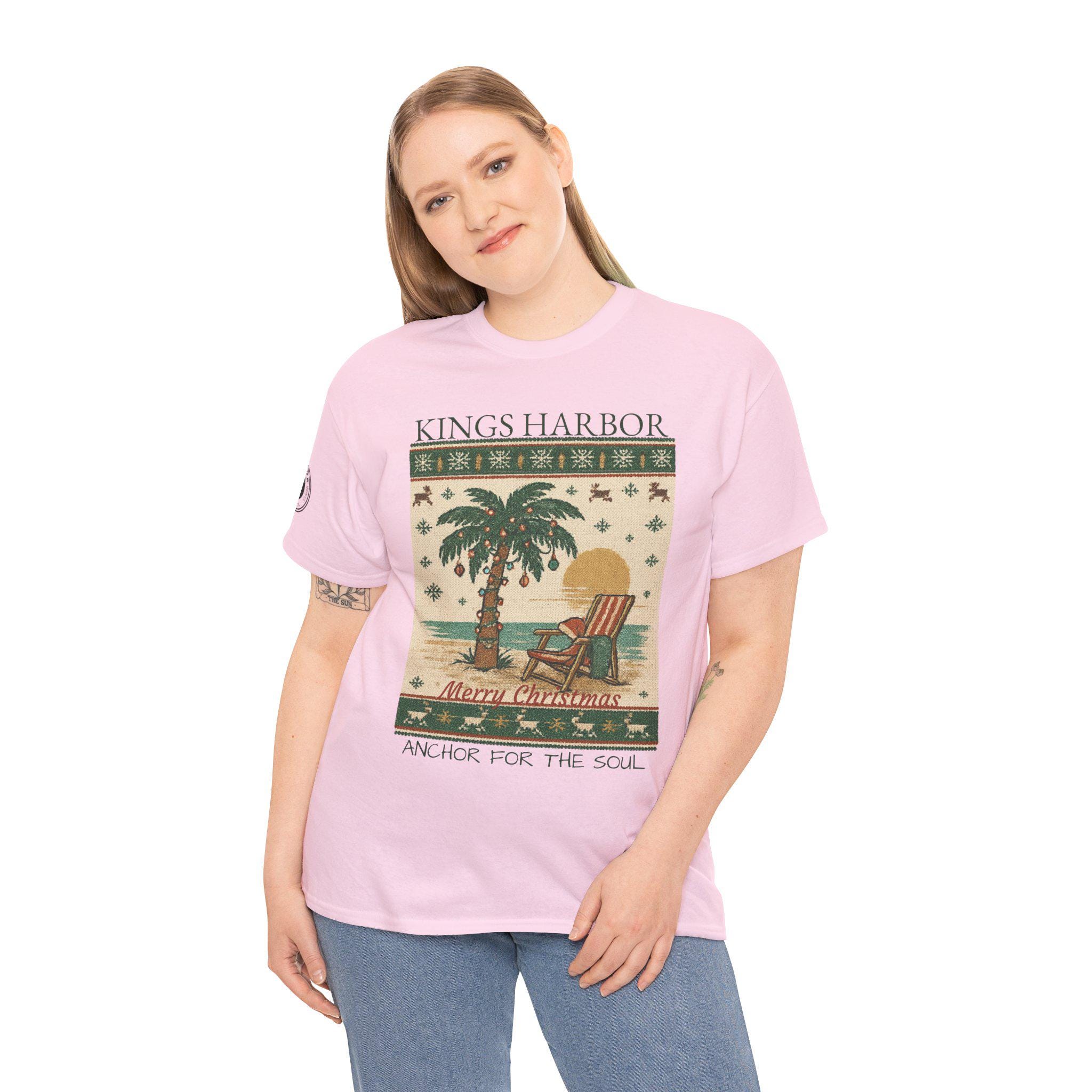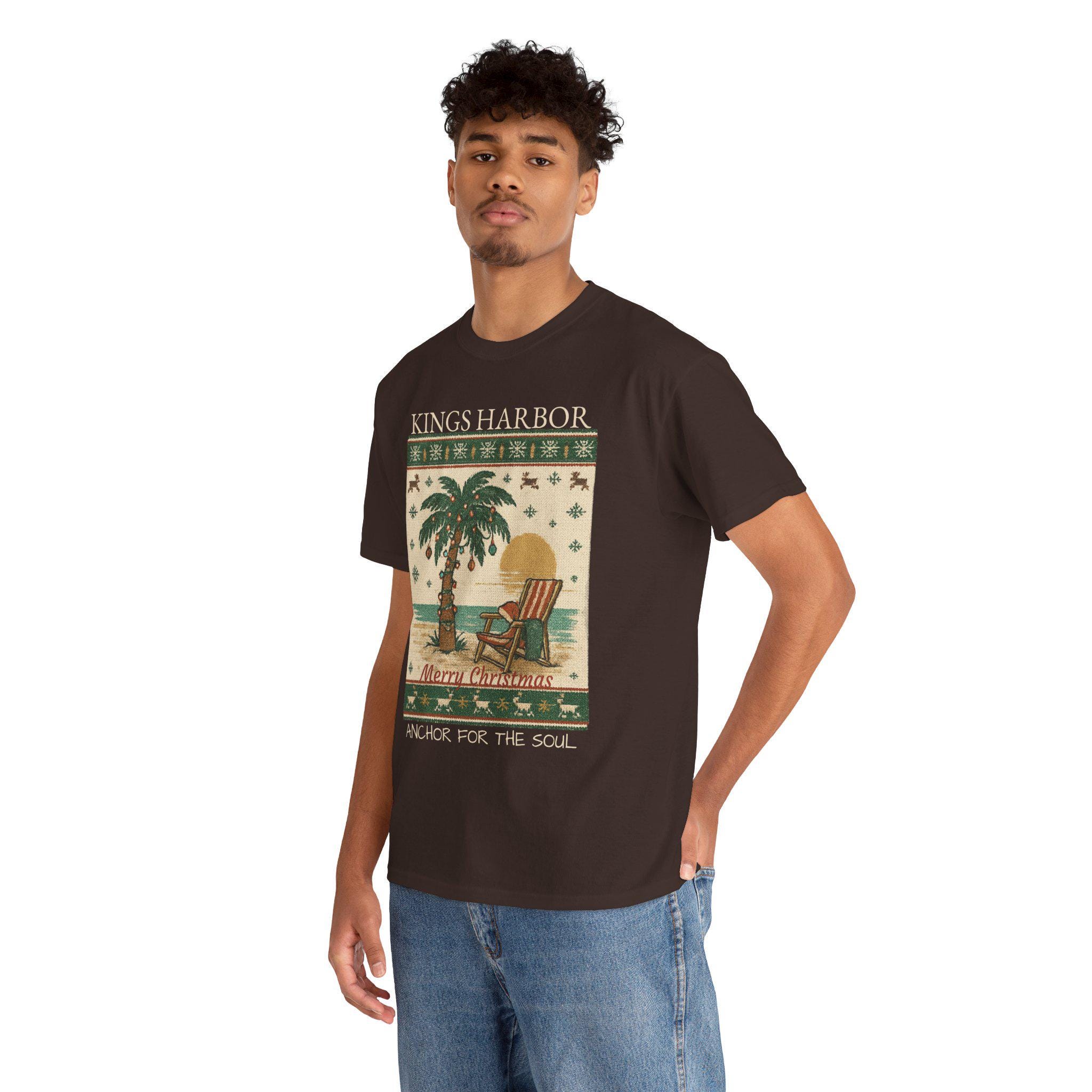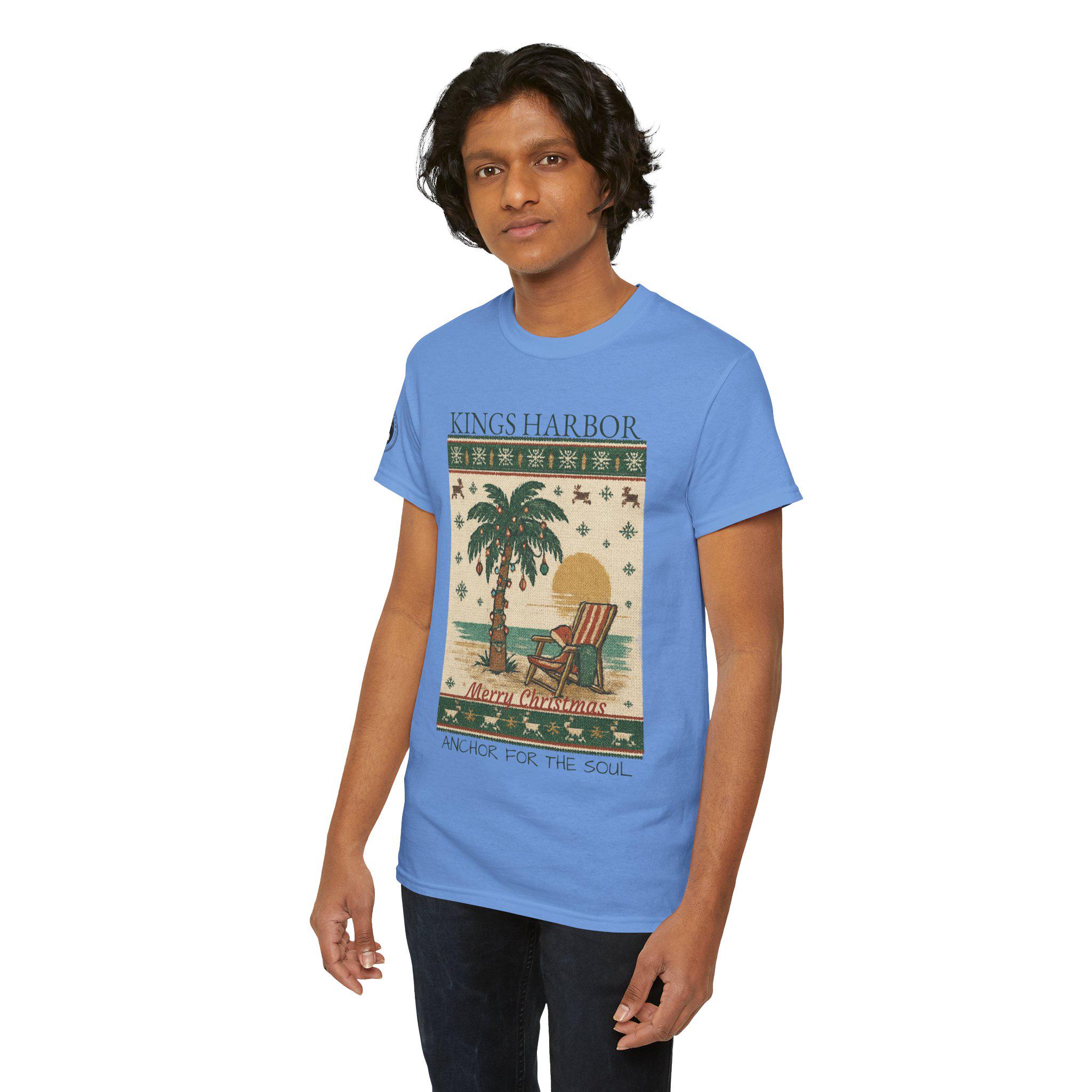 This 'Ugly Sweater' T-Shirt with a Palm Tree on the shore with a Tropical Christmas theme is a great way to celebrate the holidays. The shirt offers a comfy, relaxed fit with a crew neckline for a neat, timeless look. Made from 100% cotton fabric, it is perfect for printing and ensures lasting durability. Suitable for adults.