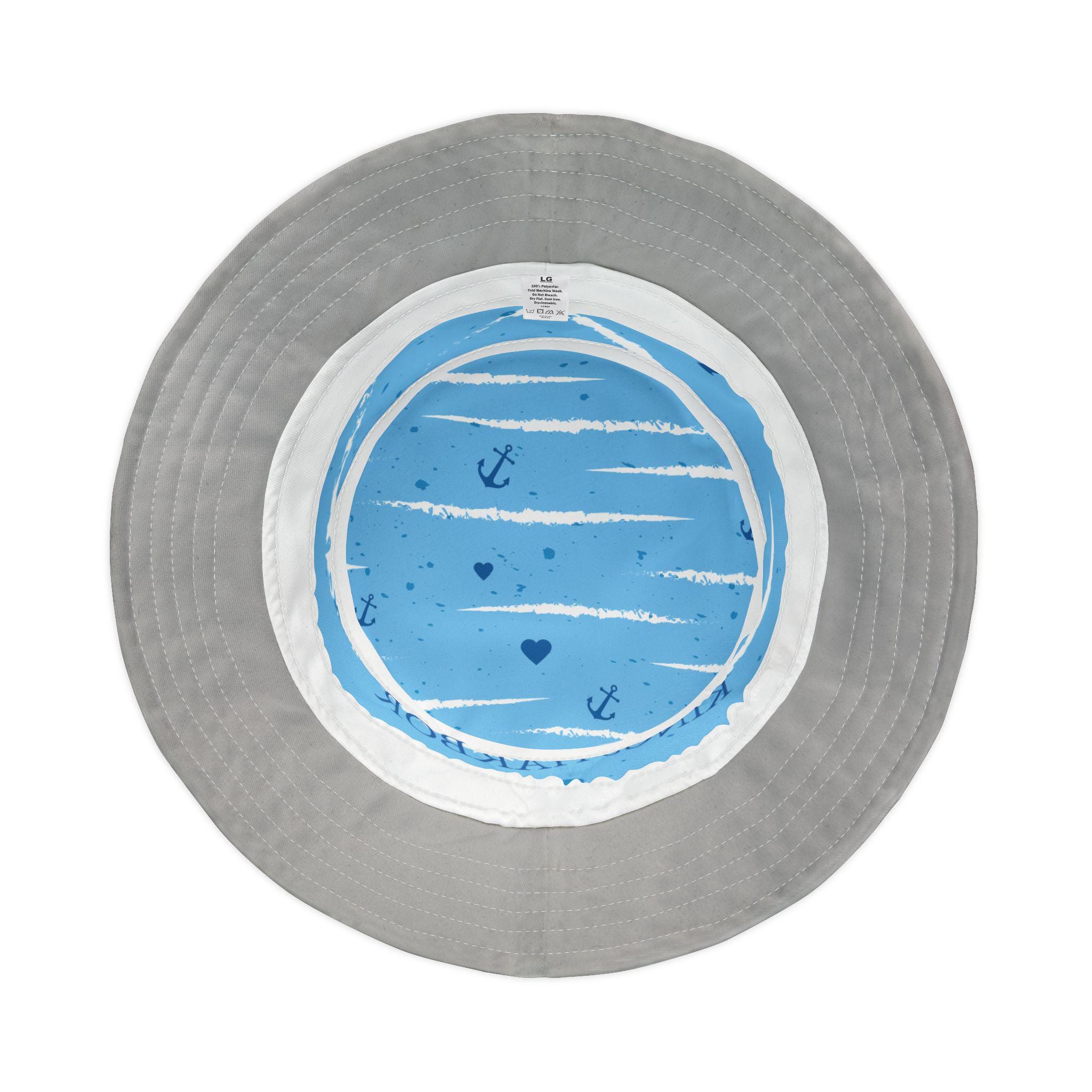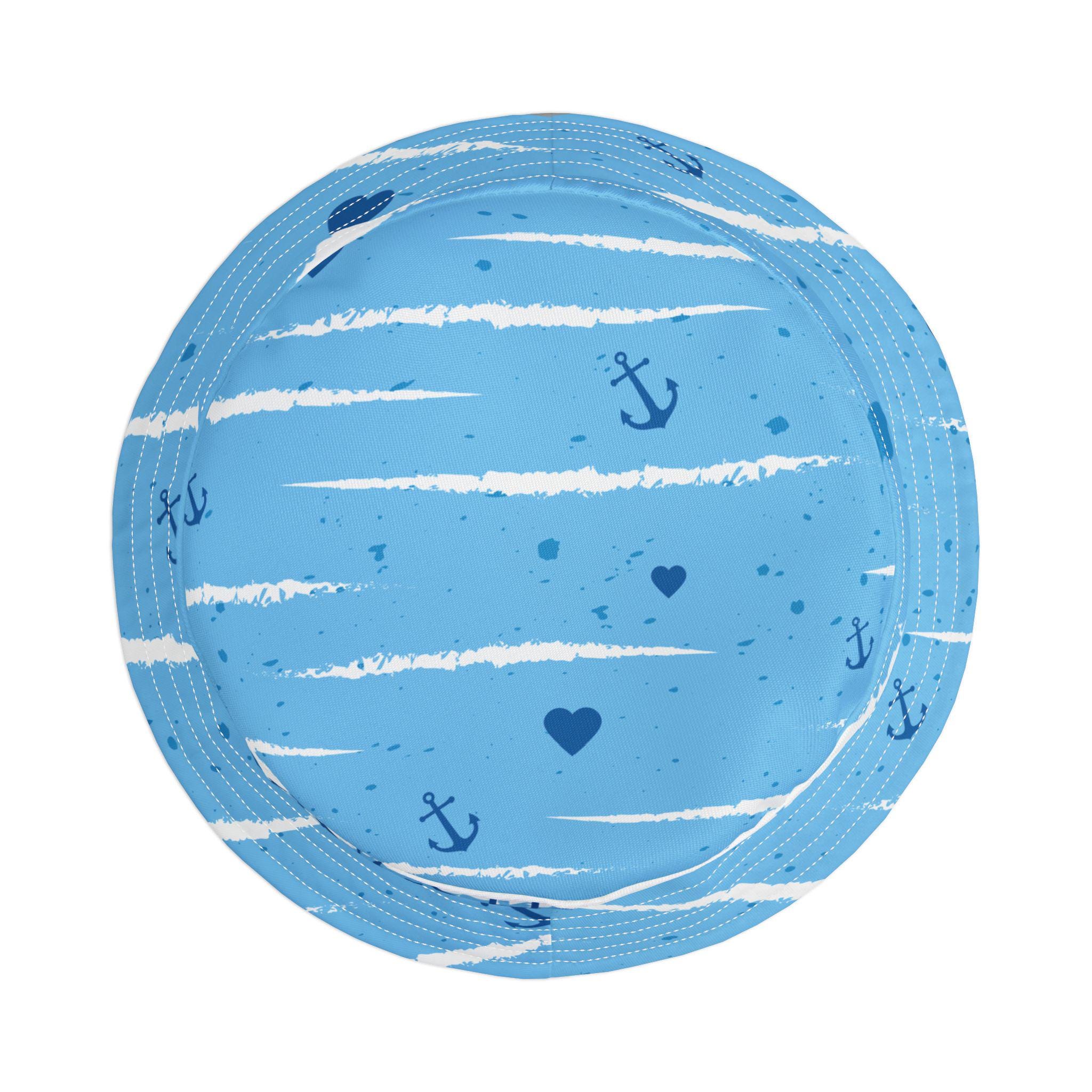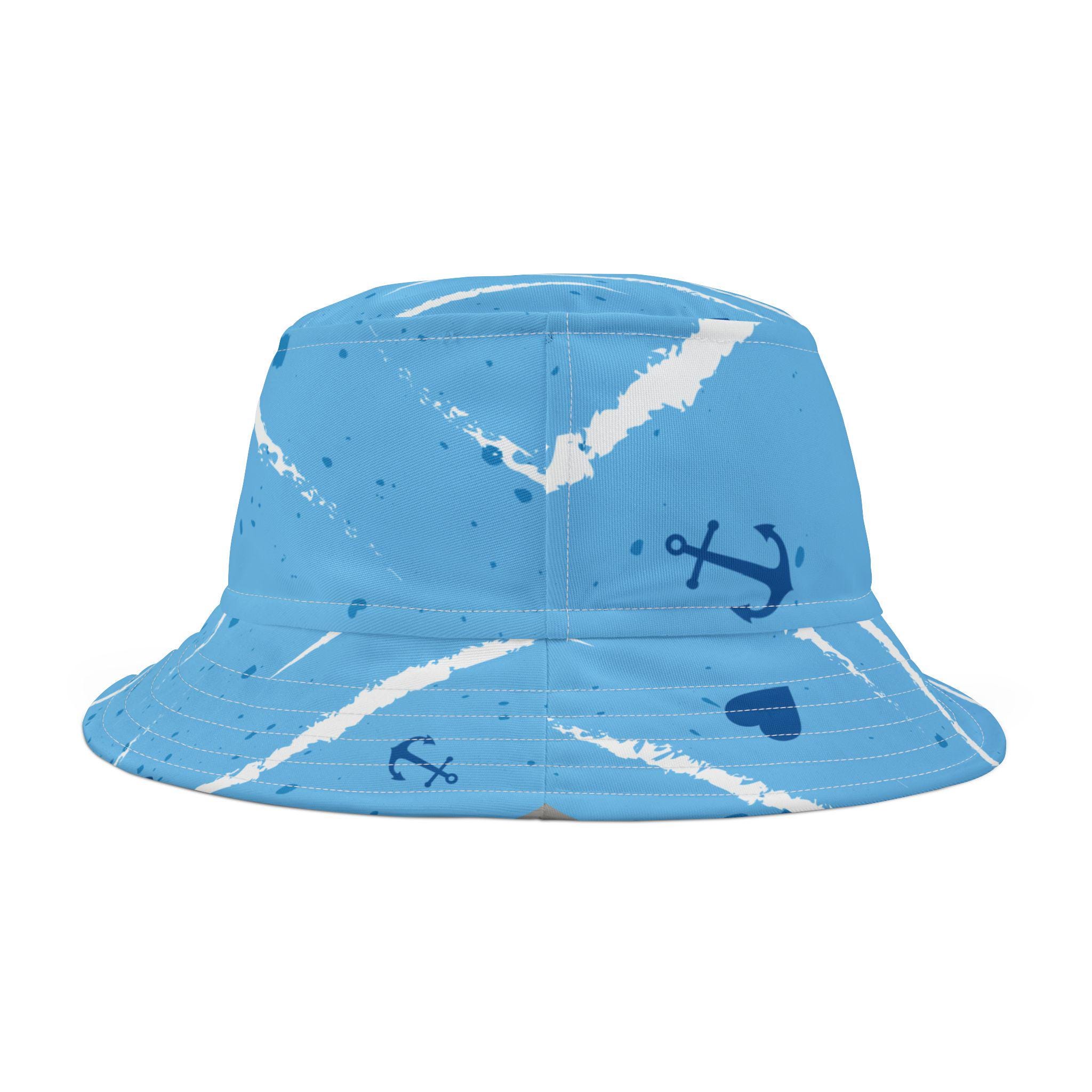 Stay stylish and protected from the sun with this Beachy Bucket Hat featuring an Anchor and Heart design in light blue. Perfect for a summer vacation or a fun festival, this hat is made of 100% polyester, with multiple size options available. The stitching color can be customized, adding a personal touch to your accessory collection. Made in the USA.