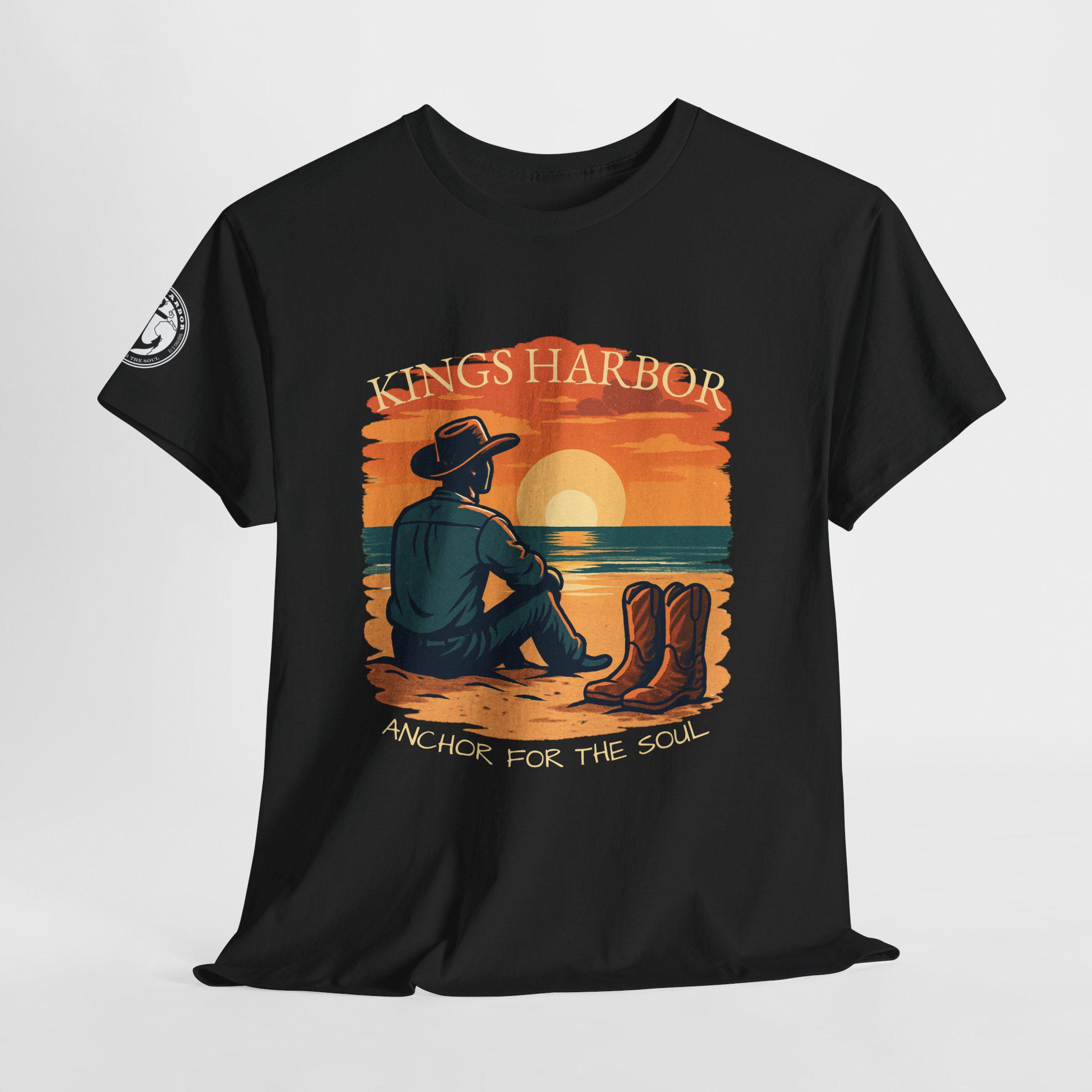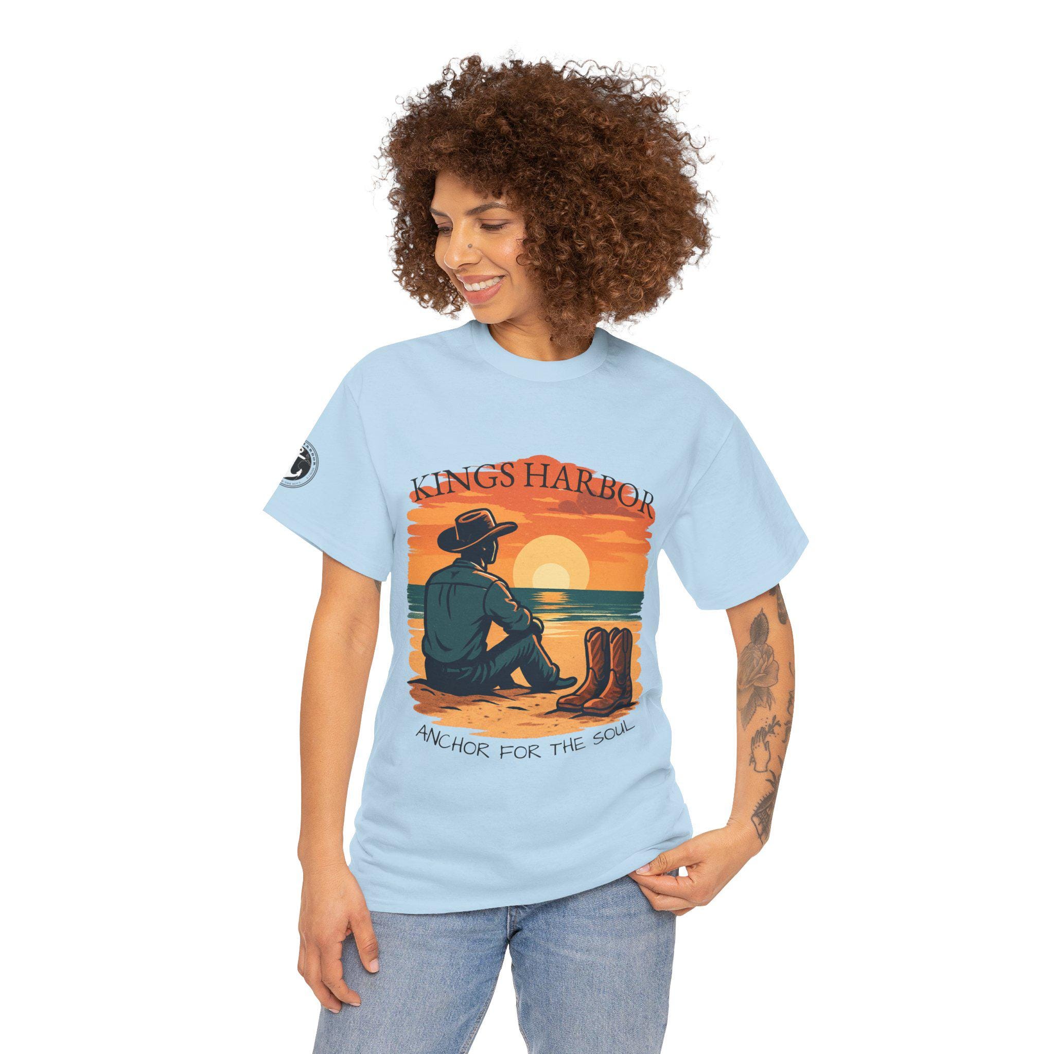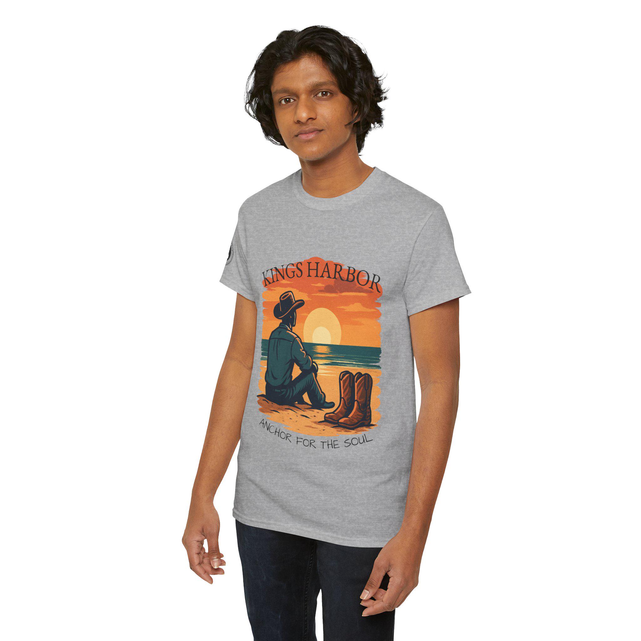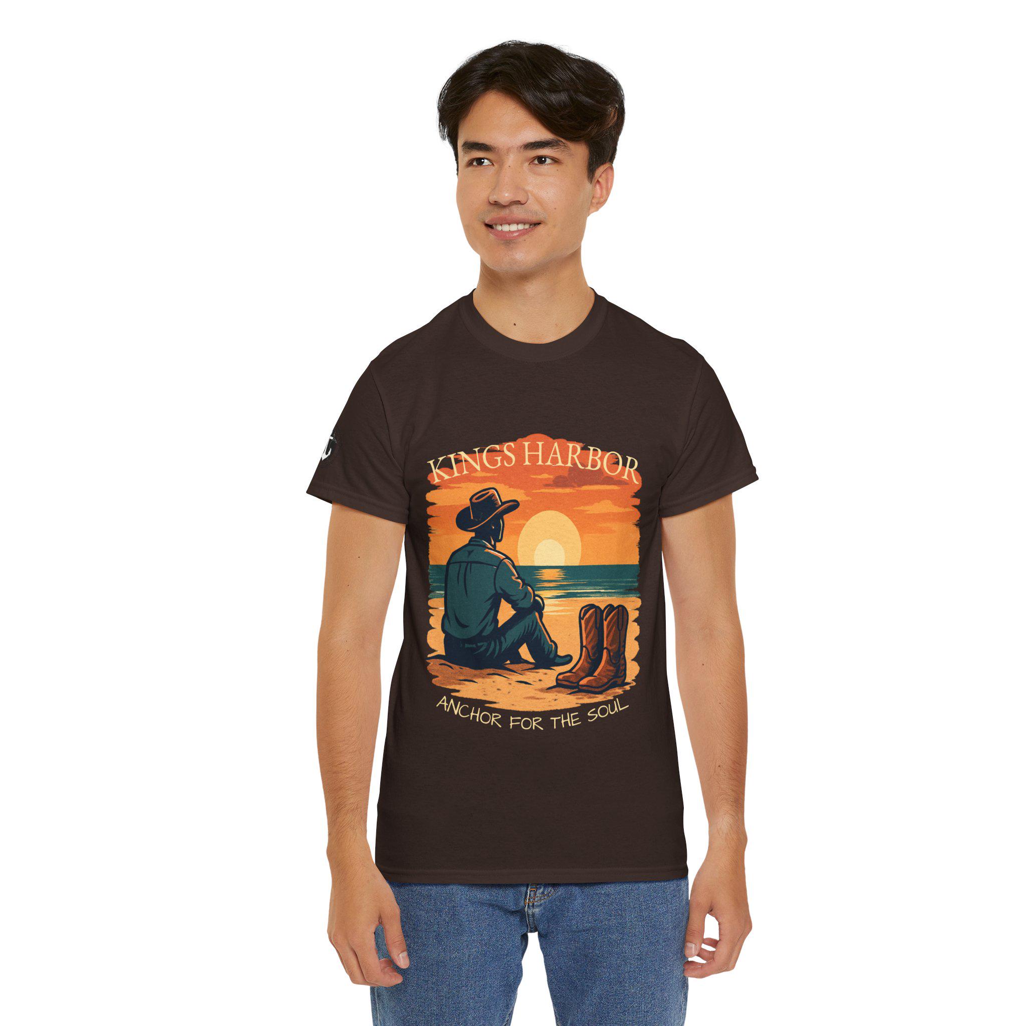 A relaxing and serene T-Shirt featuring a cowboy enjoying a sunset on the beach with his boots off. Perfect for those who love beach vibes and the wild west. Ideal for casual wear or as a statement piece for summer outings and vacations.