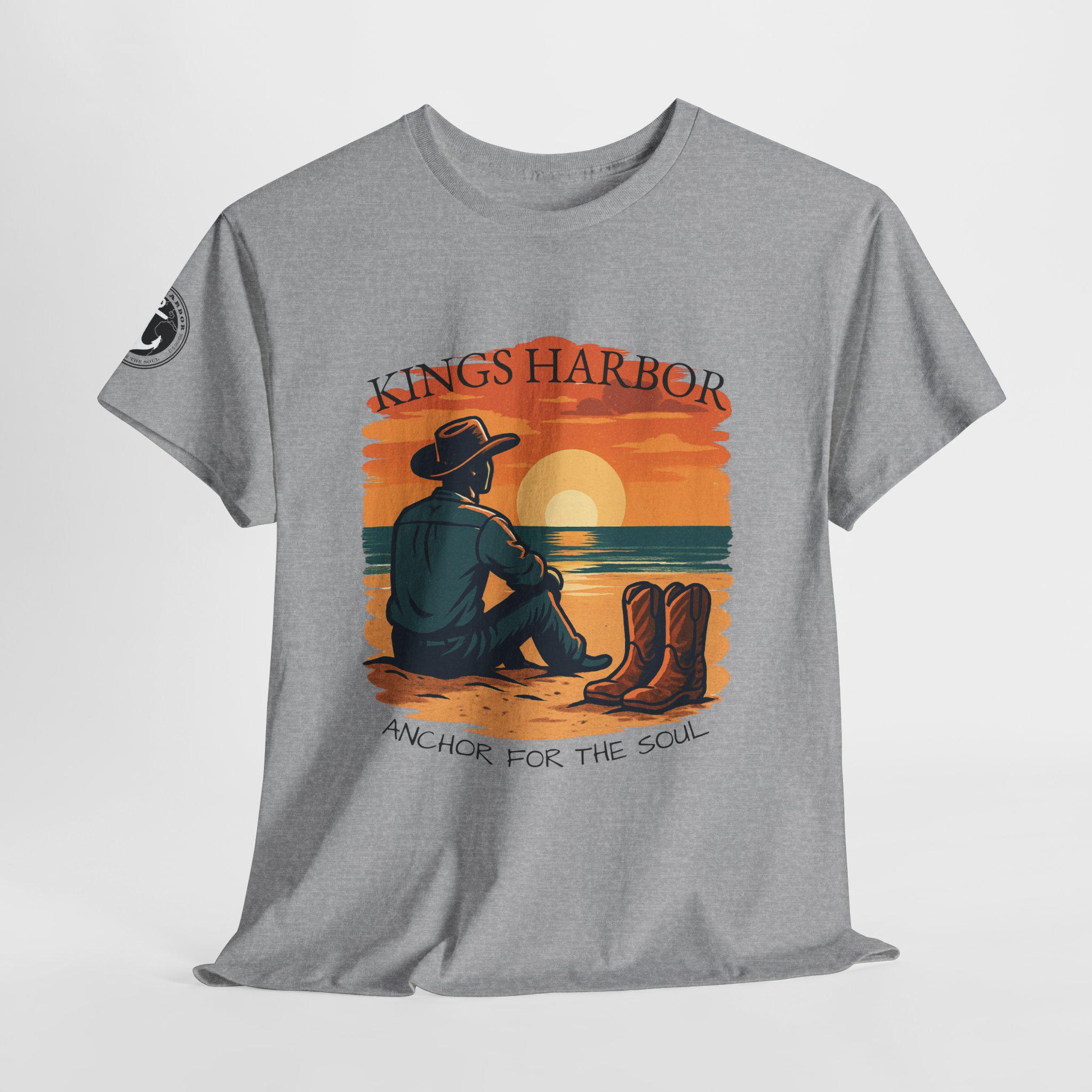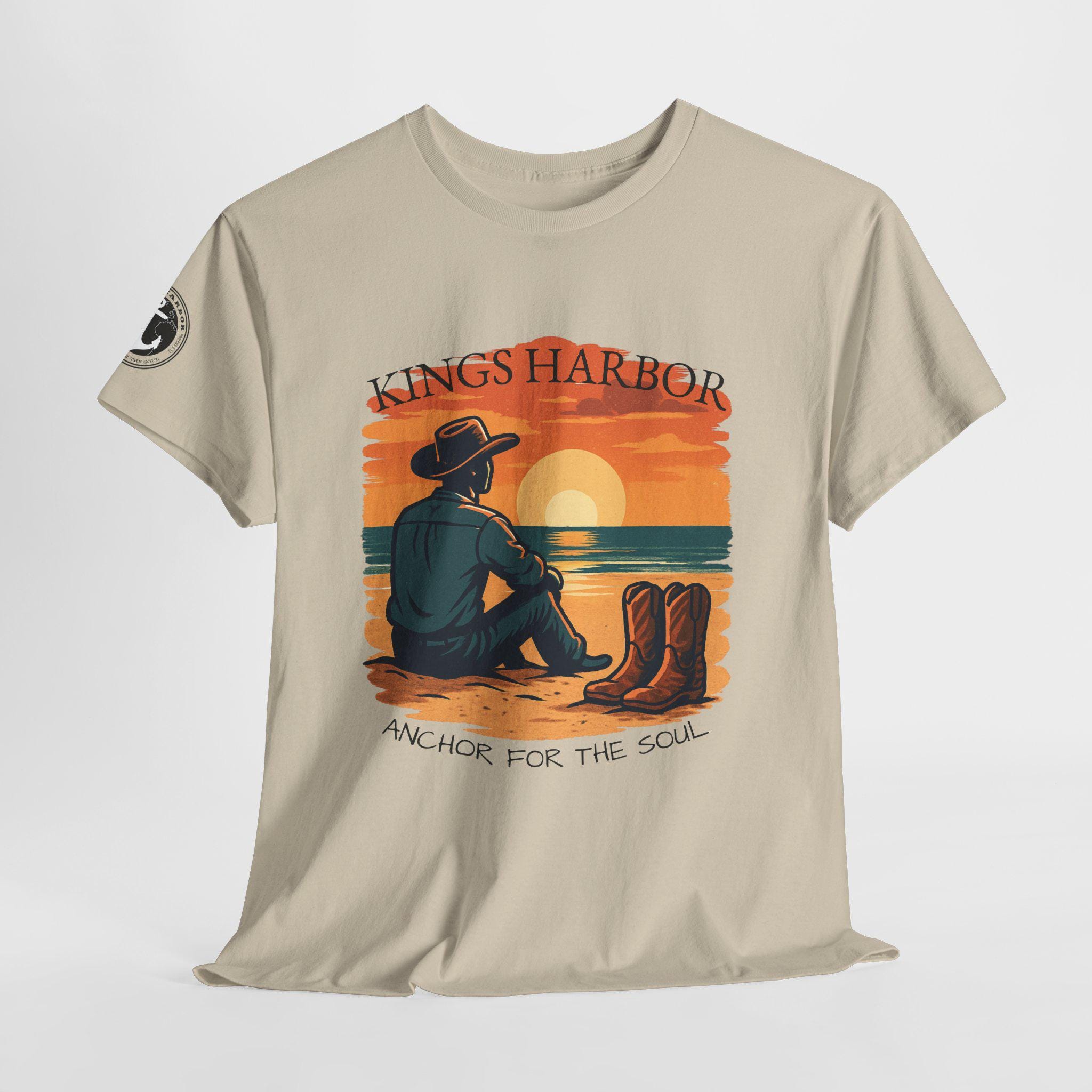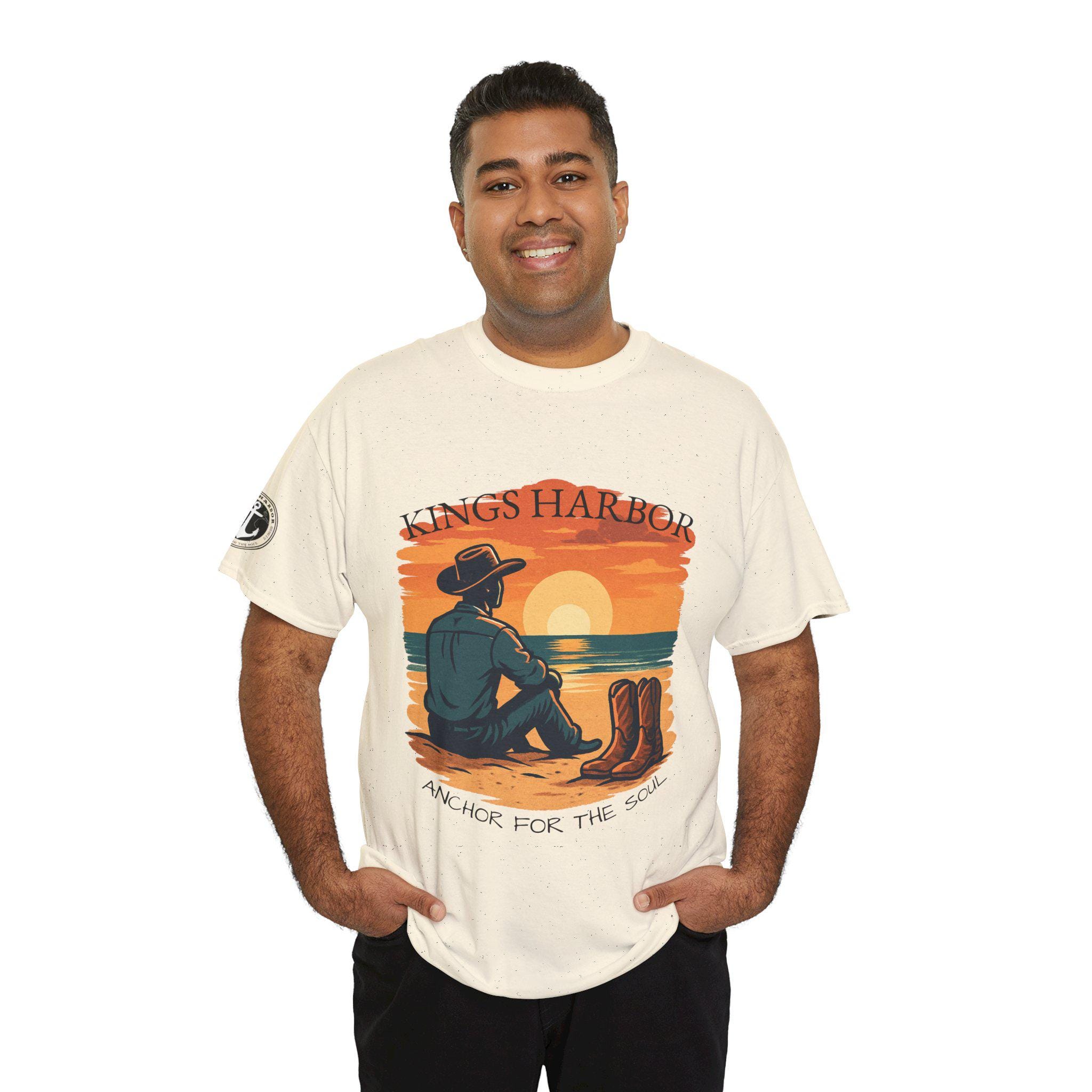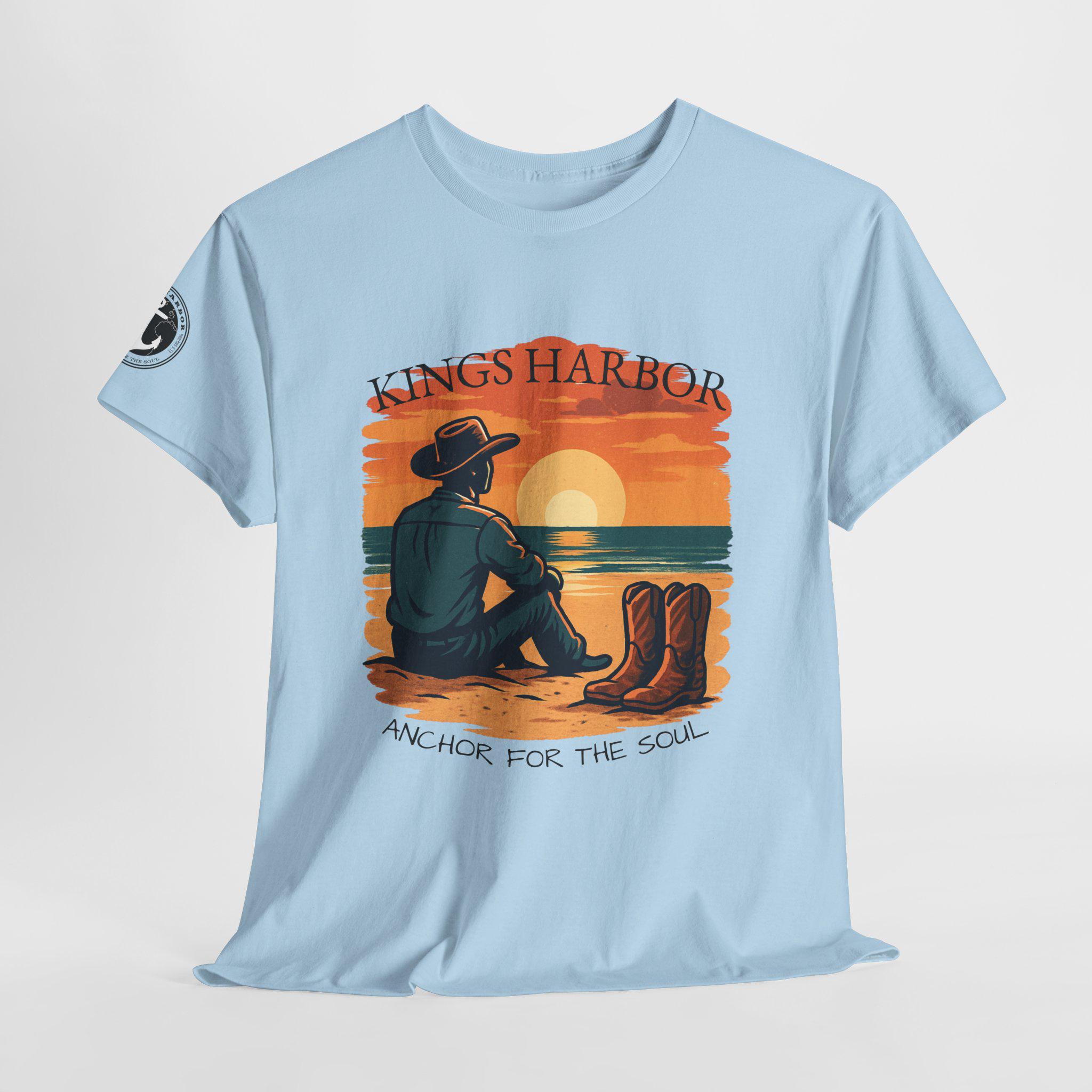 A relaxing and serene T-Shirt featuring a cowboy enjoying a sunset on the beach with his boots off. Perfect for those who love beach vibes and the wild west. Ideal for casual wear or as a statement piece for summer outings and vacations.