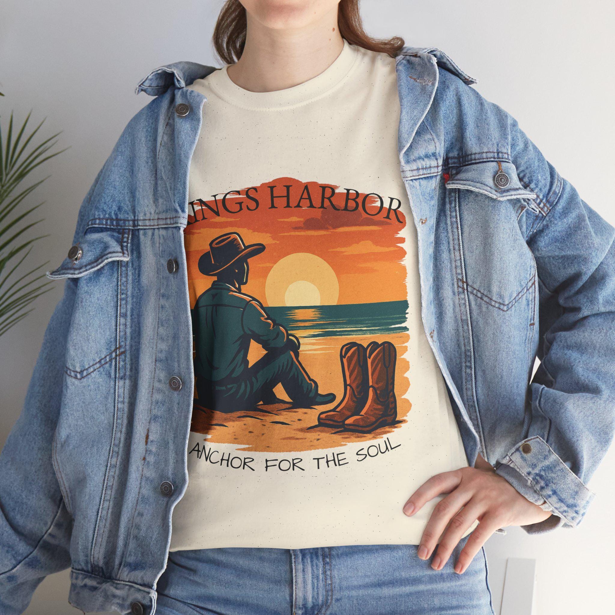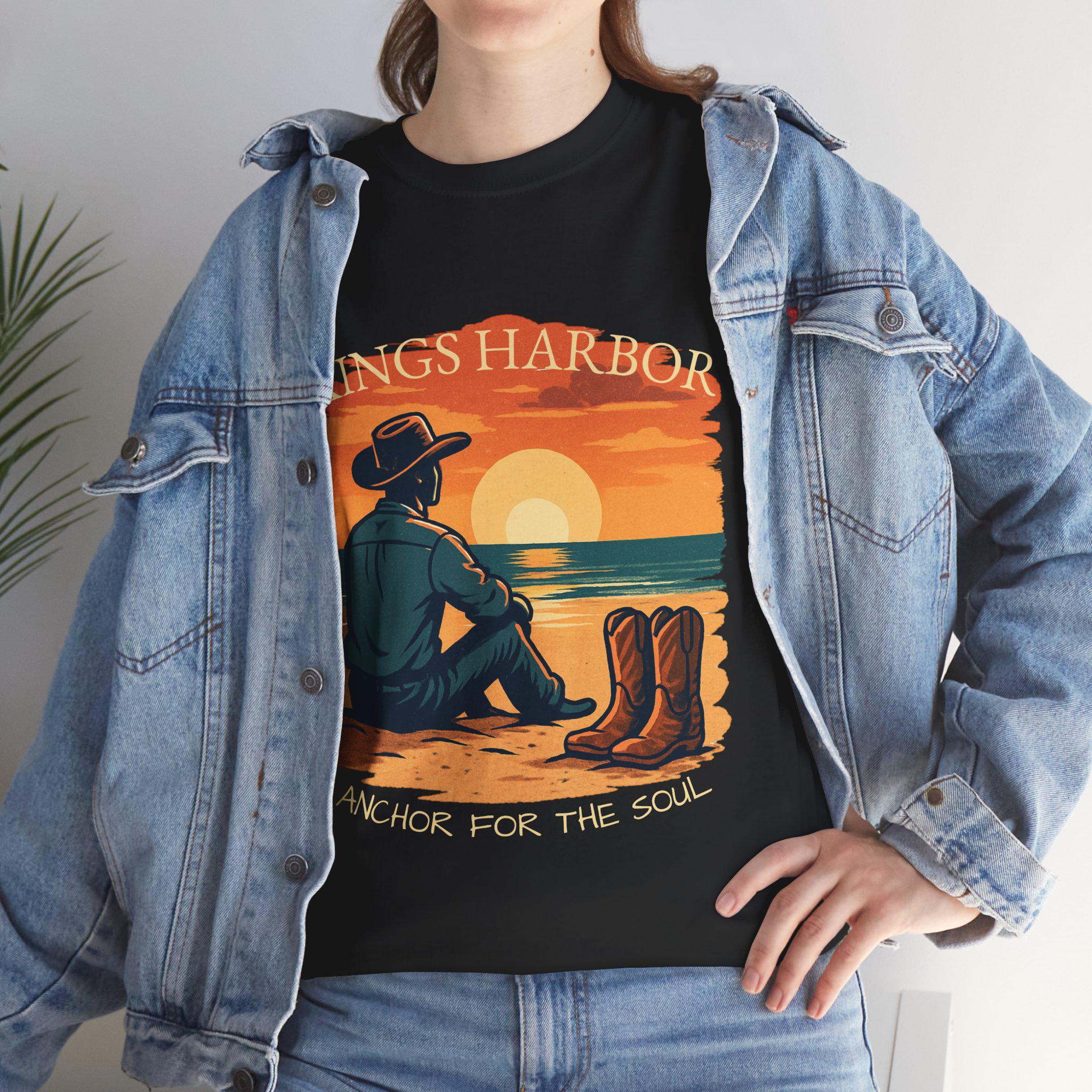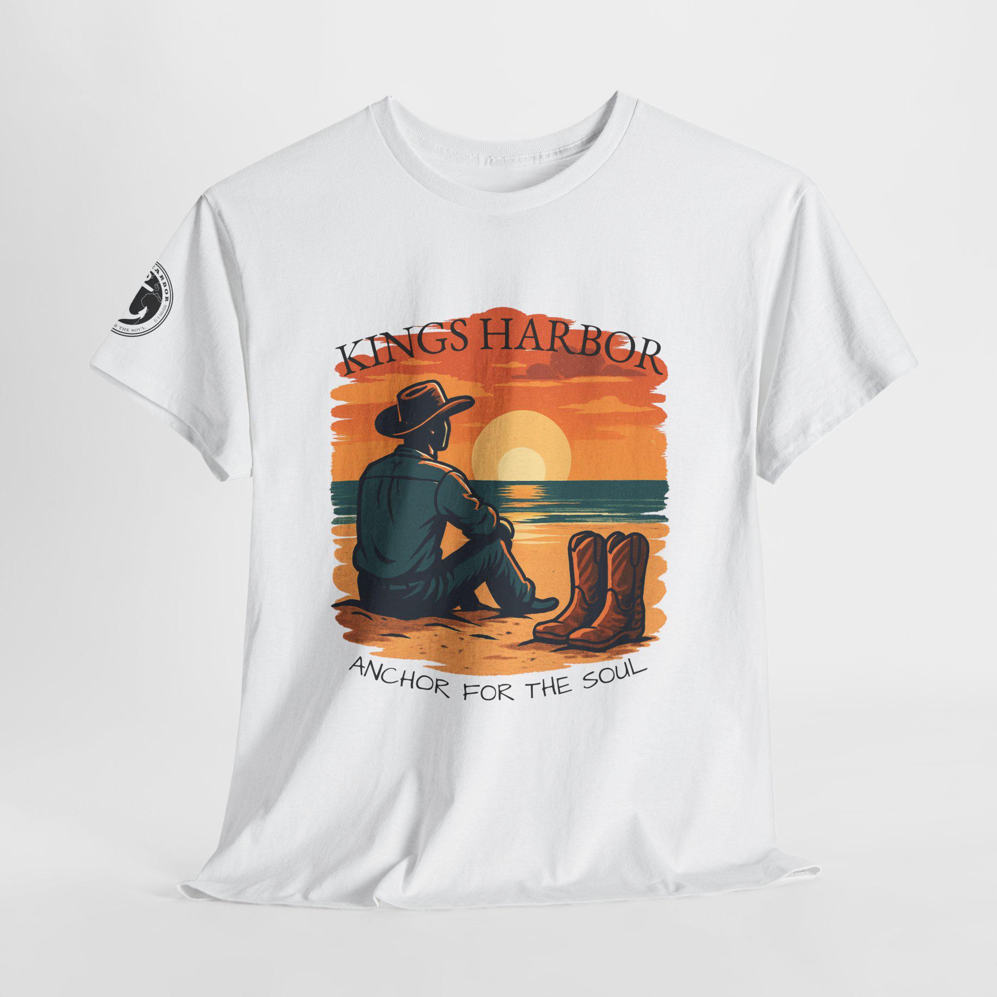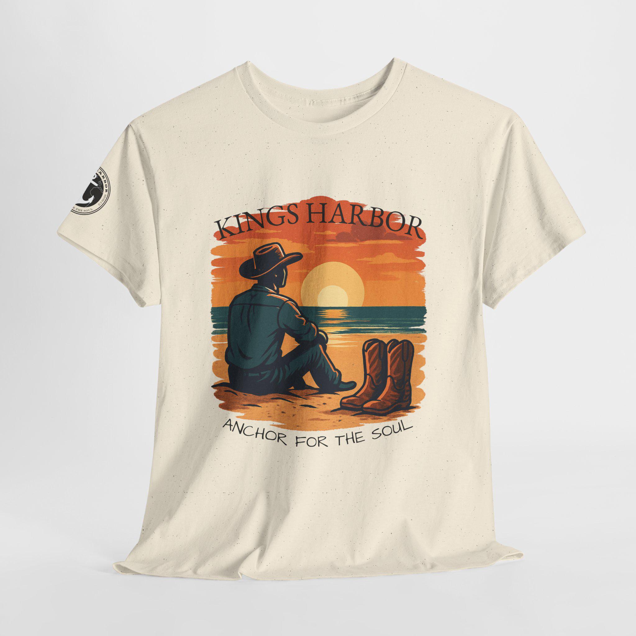 A relaxing and serene T-Shirt featuring a cowboy enjoying a sunset on the beach with his boots off. Perfect for those who love beach vibes and the wild west. Ideal for casual wear or as a statement piece for summer outings and vacations.