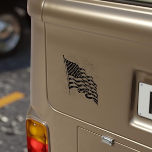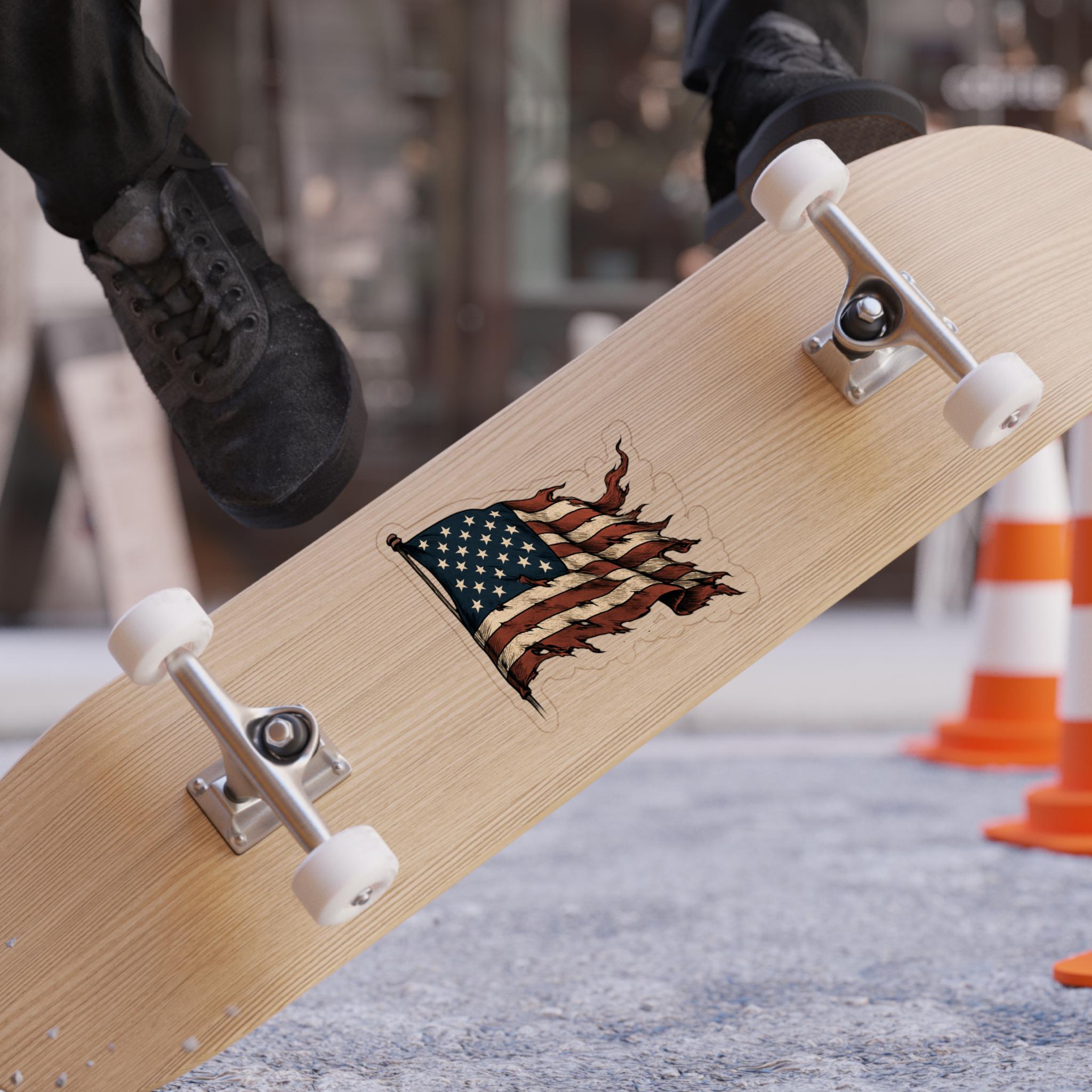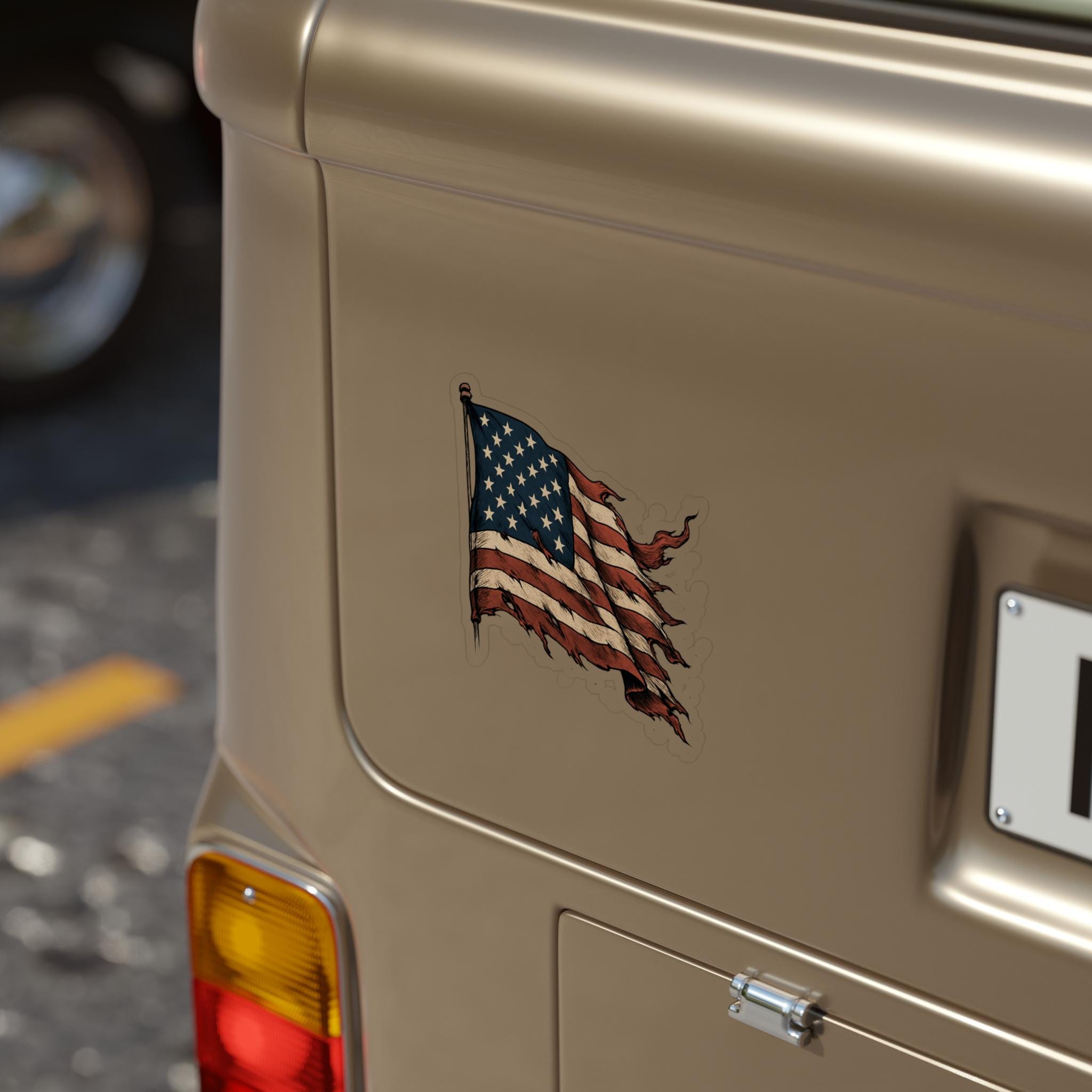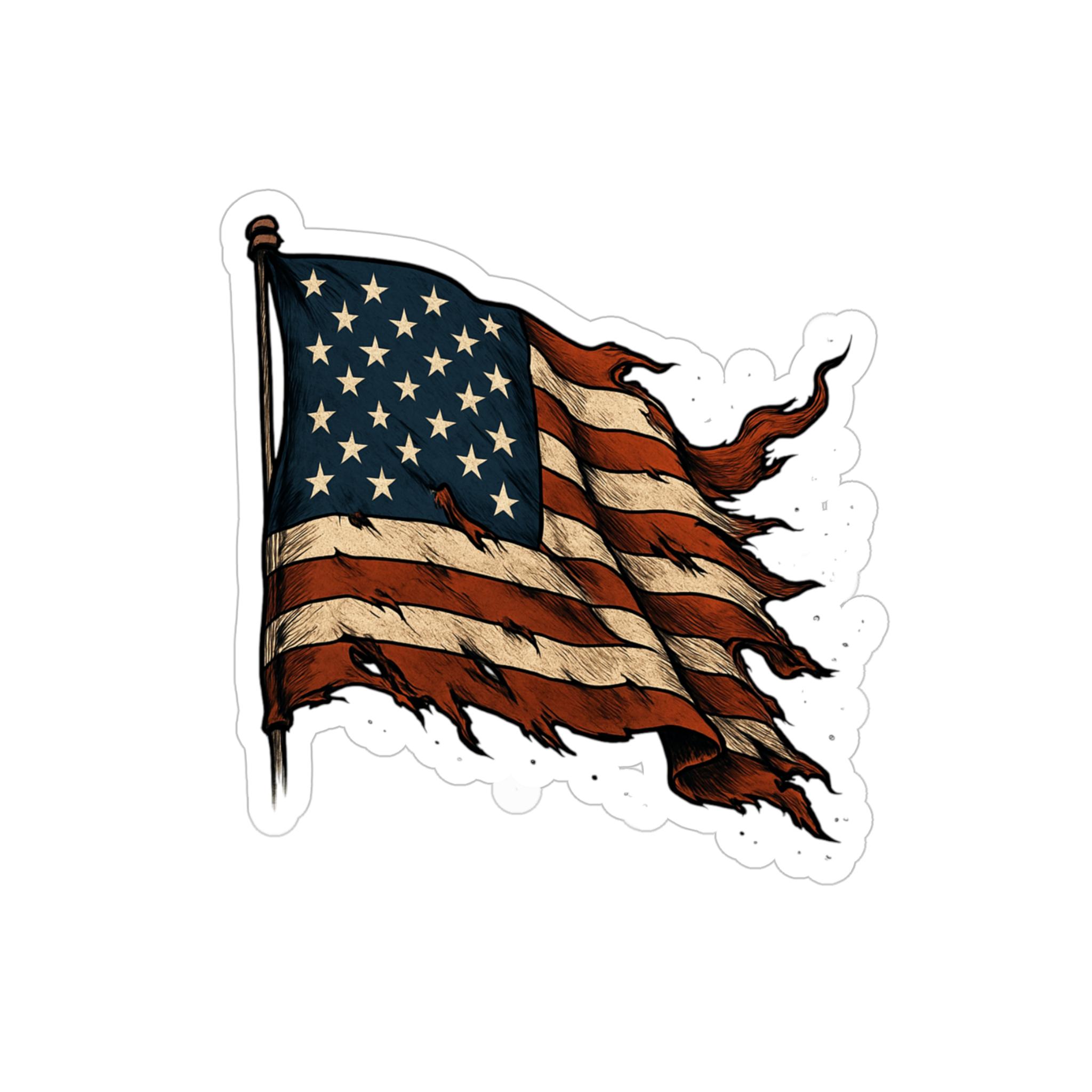 A patriotic Stickers featuring a flowing American flag with burns and rips, perfect for showing your American pride. Suitable for outdoor use, these stickers are made to last over 5 years in all weather conditions. Ideal for those who love the USA and want to add a touch of patriotism to their belongings. Relevant for Fourth of July, Memorial Day, Veterans Day, and everyday American spirit.