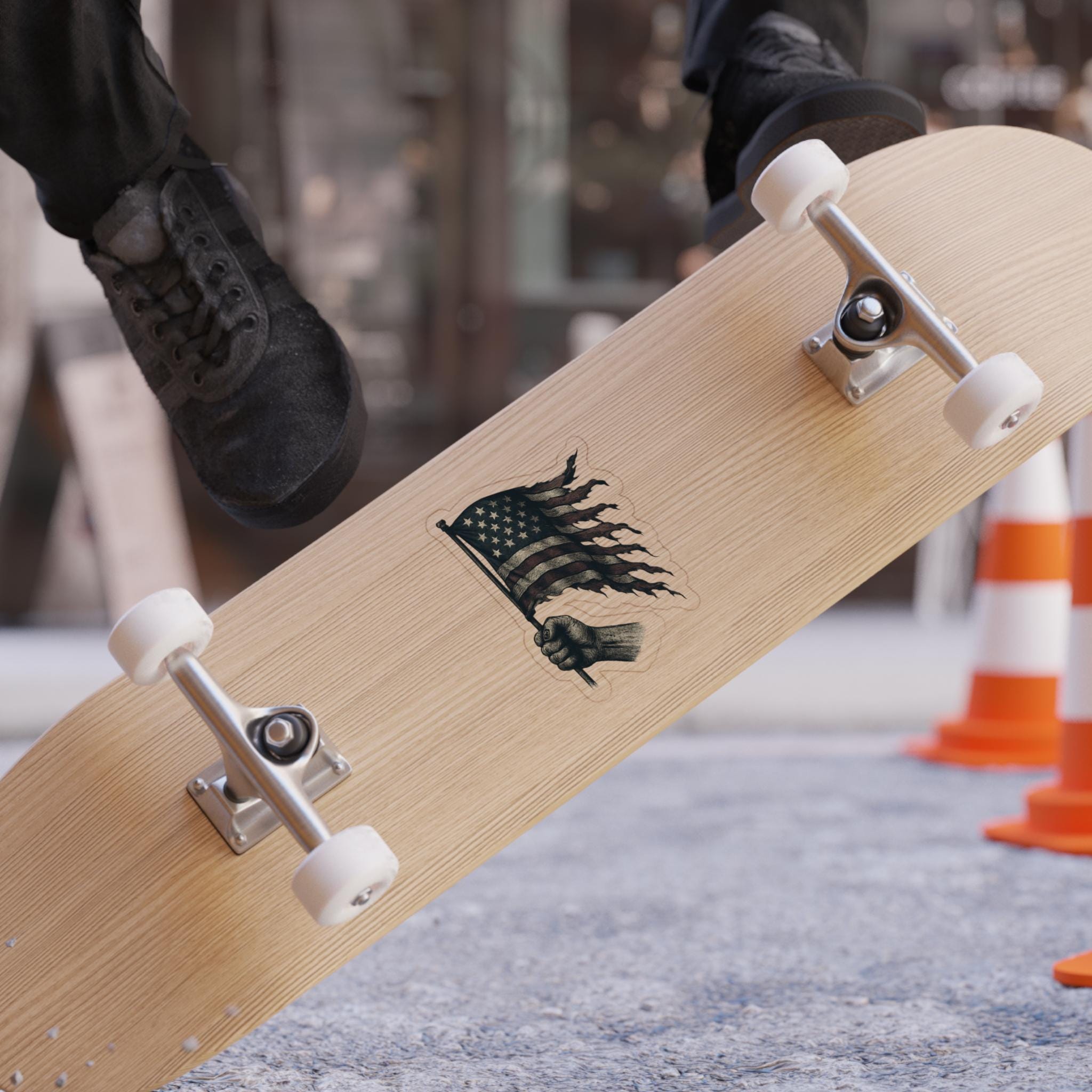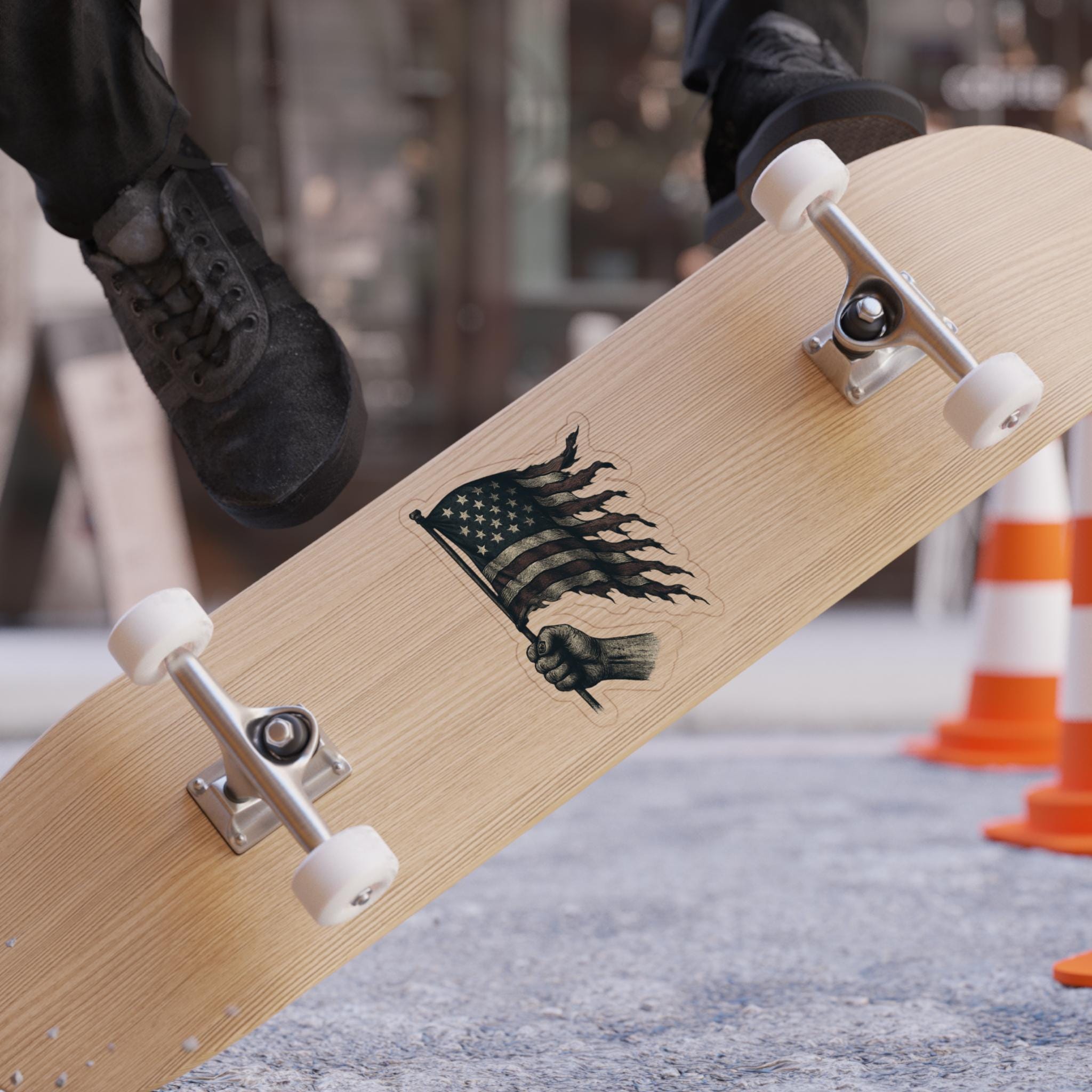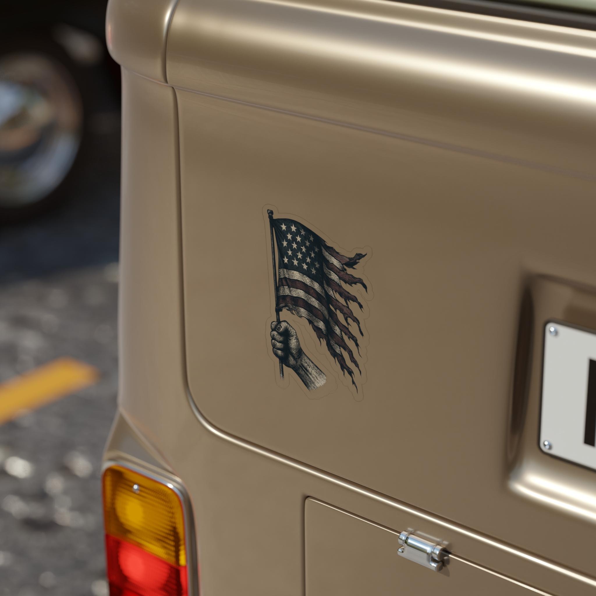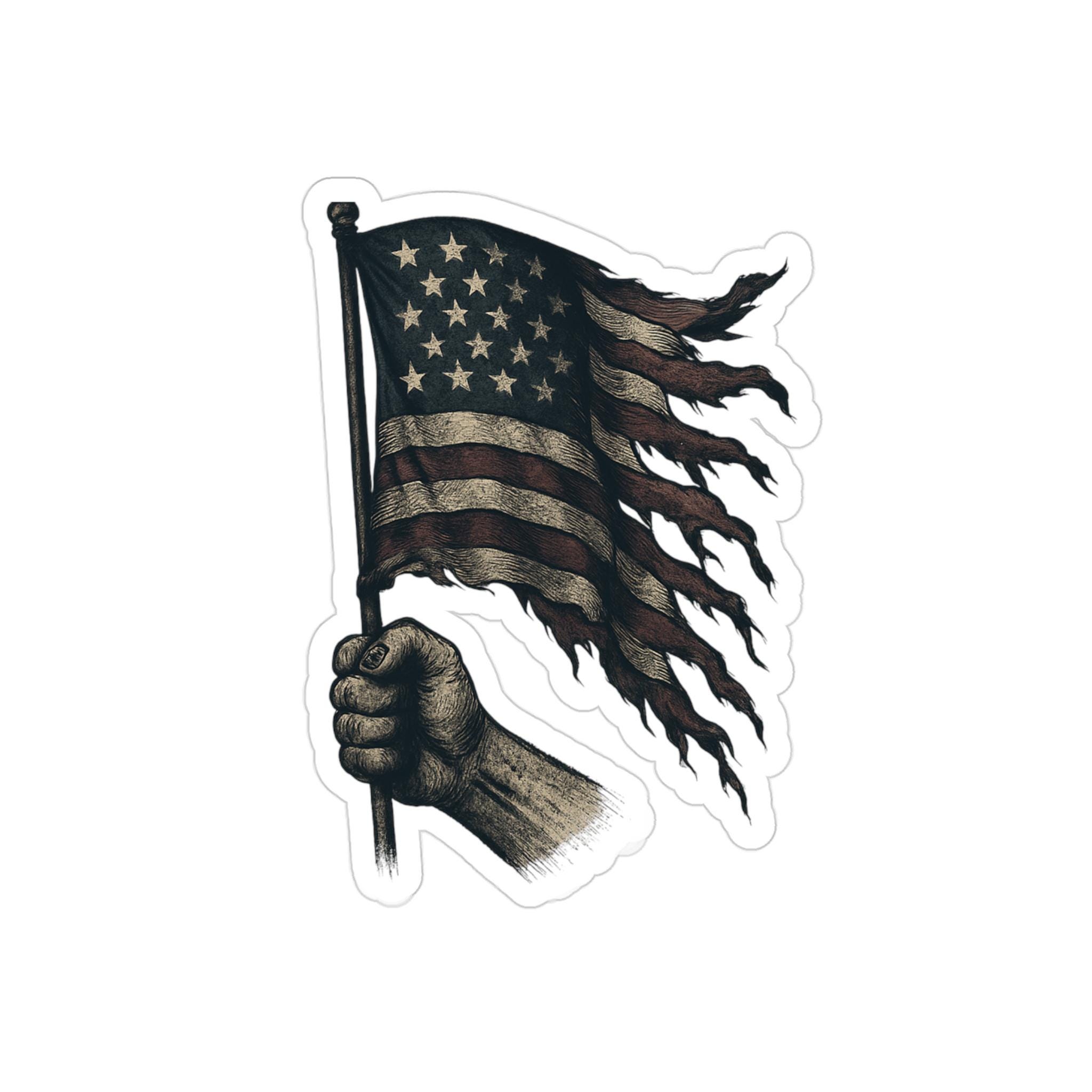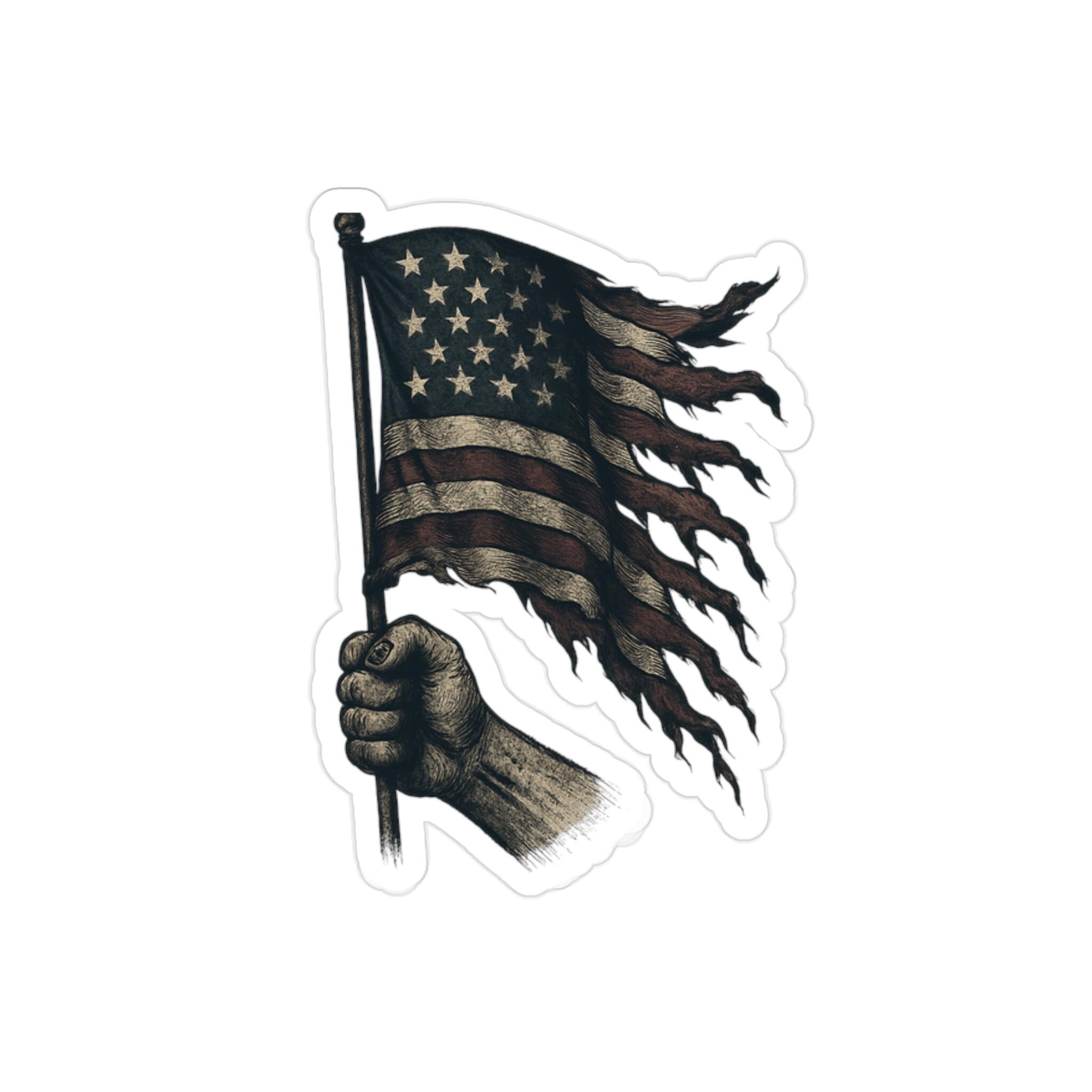 A patriotic Stickers featuring a flowing American flag with burns and rips, perfect for showing your American pride. Suitable for outdoor use, these stickers are made to last over 5 years in all weather conditions. Ideal for those who love the USA and want to add a touch of patriotism to their belongings. Relevant for Fourth of July, Memorial Day, Veterans Day, and everyday American spirit.