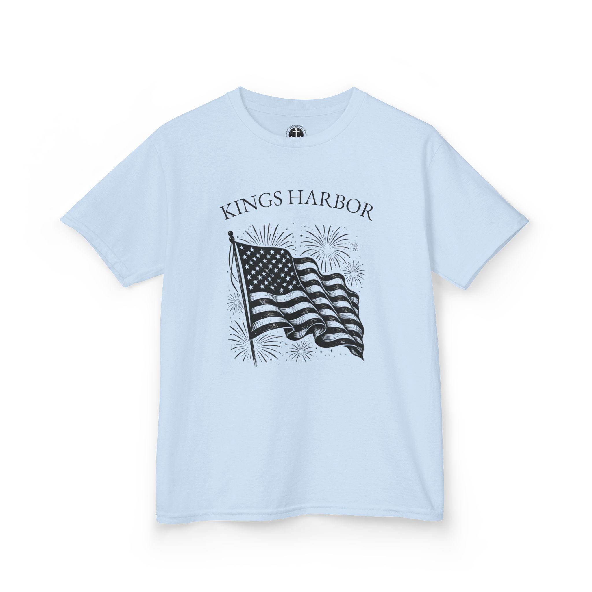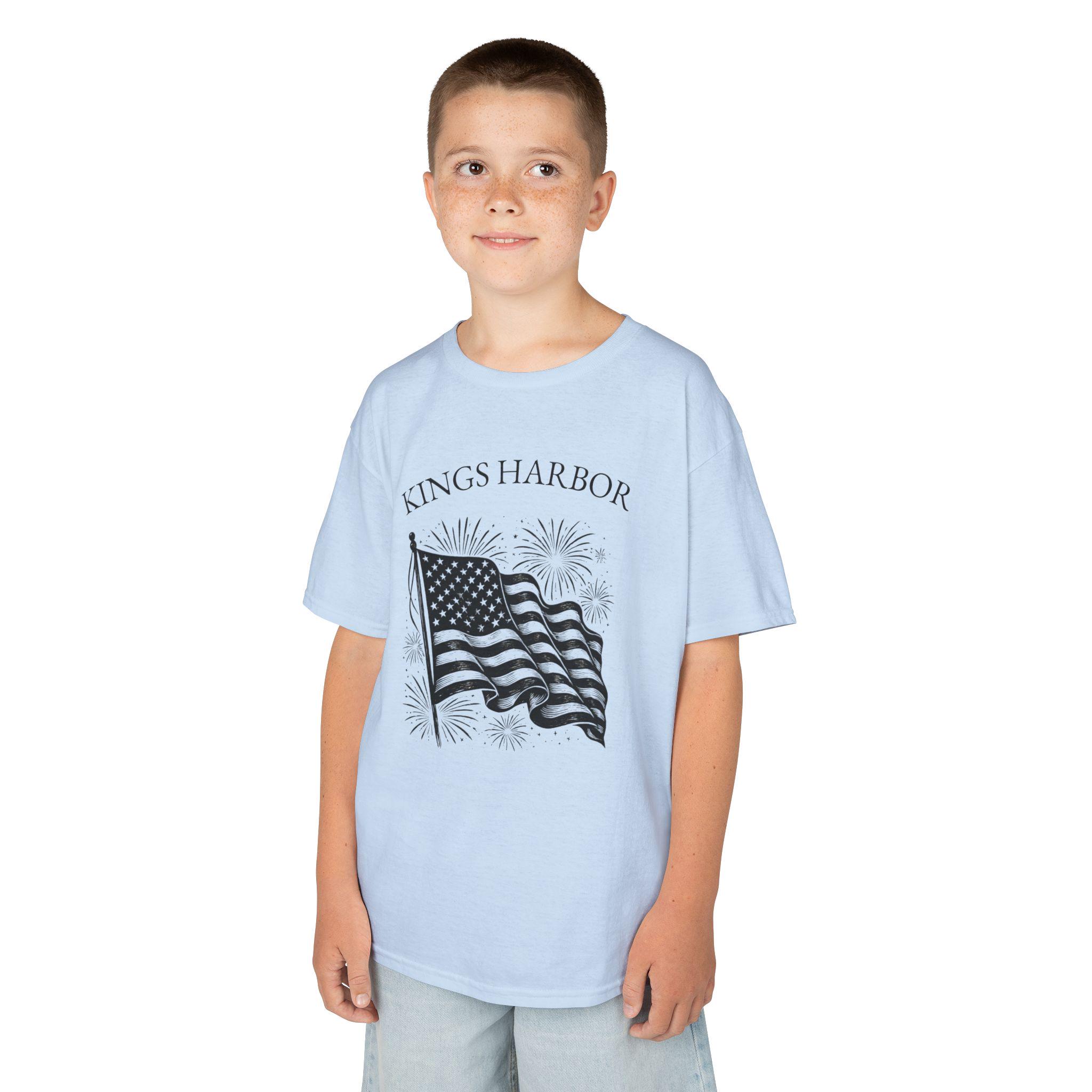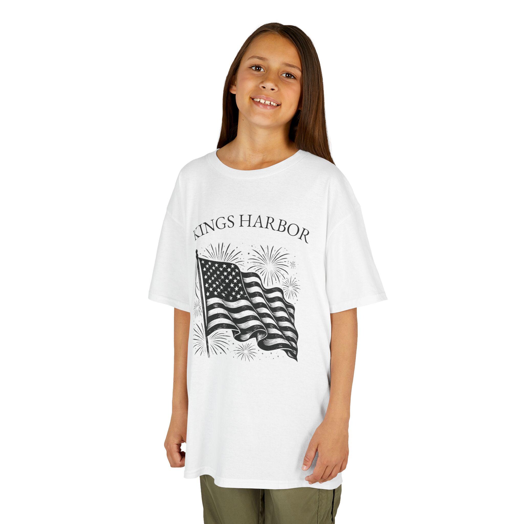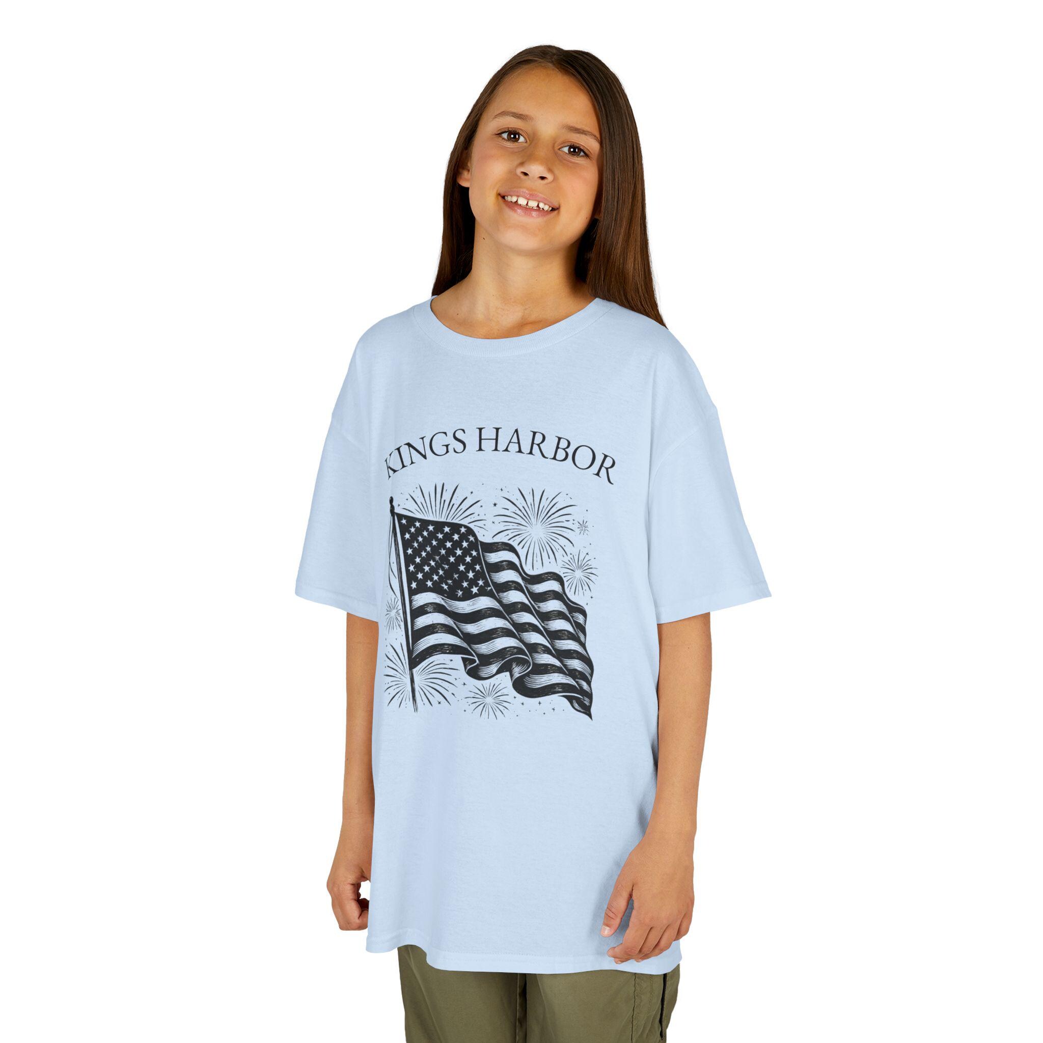 Show your patriotism for America with this Kids Tee featuring fireworks and a flag design. Perfect for young ones celebrating Independence Day, Memorial Day, Veterans Day, and other patriotic holidays. The tee is made with 100% US cotton, is ethically produced, and comes with a crew neckline for a timeless style.