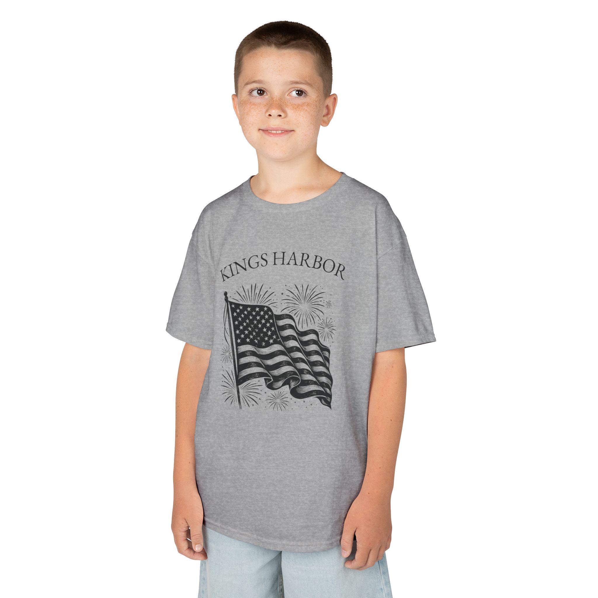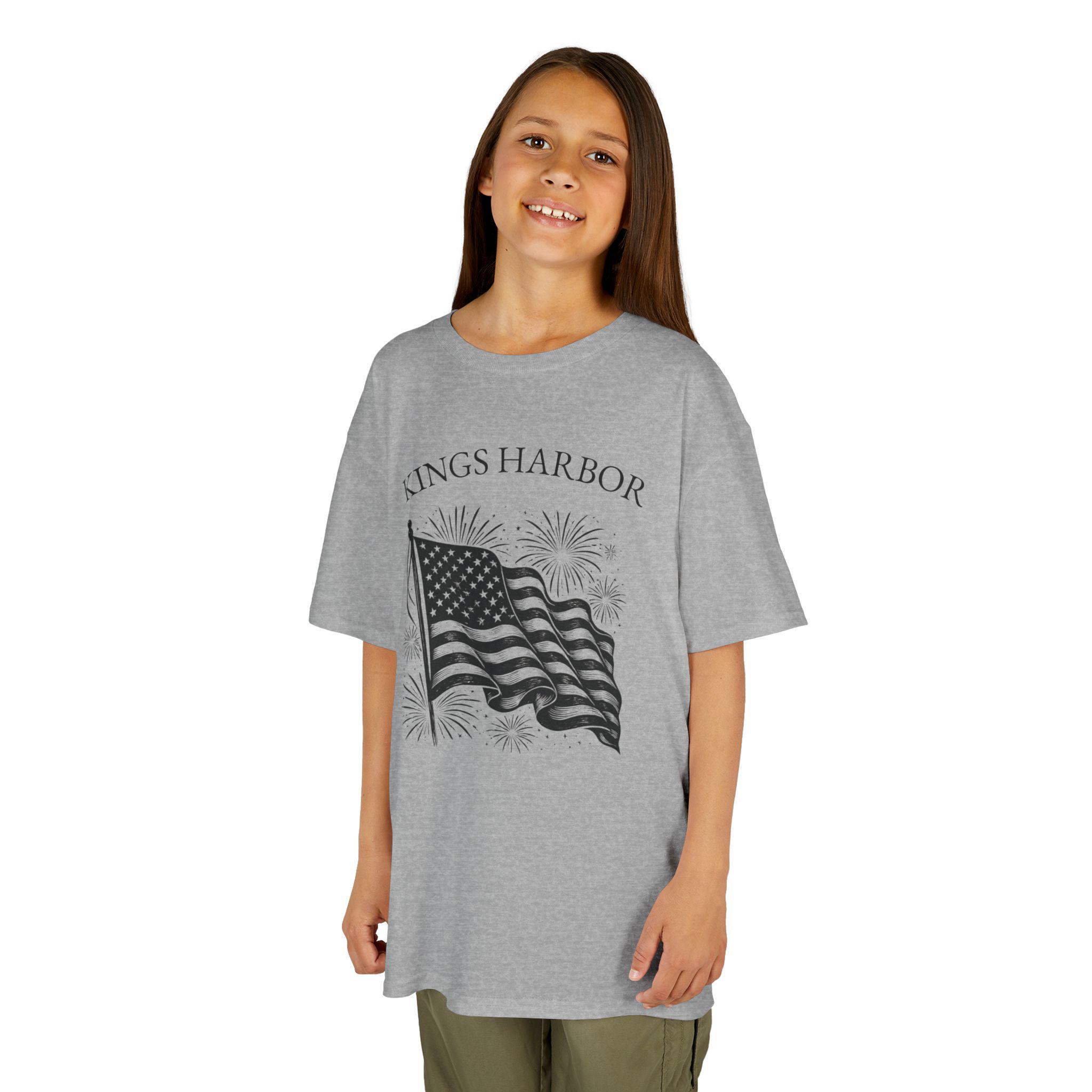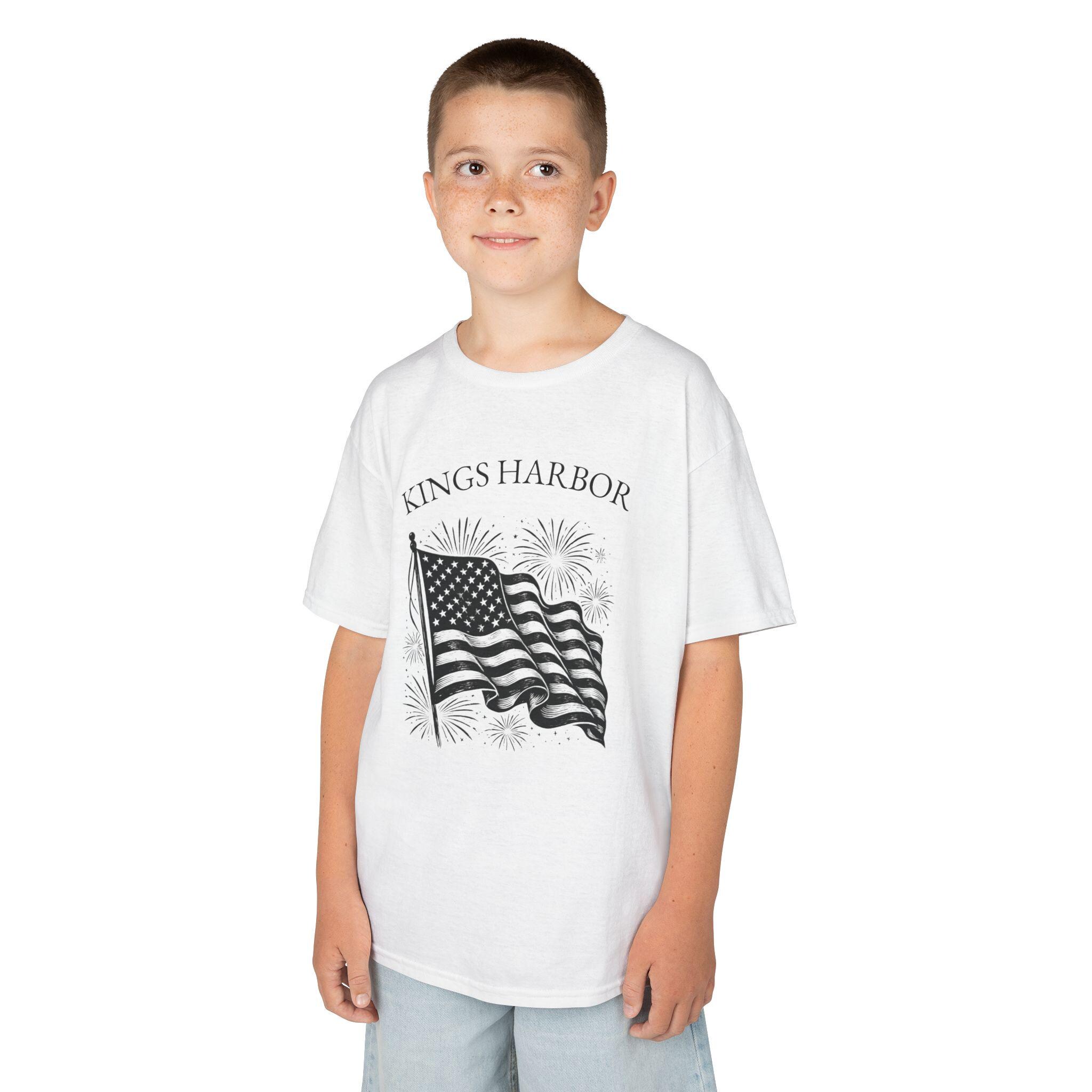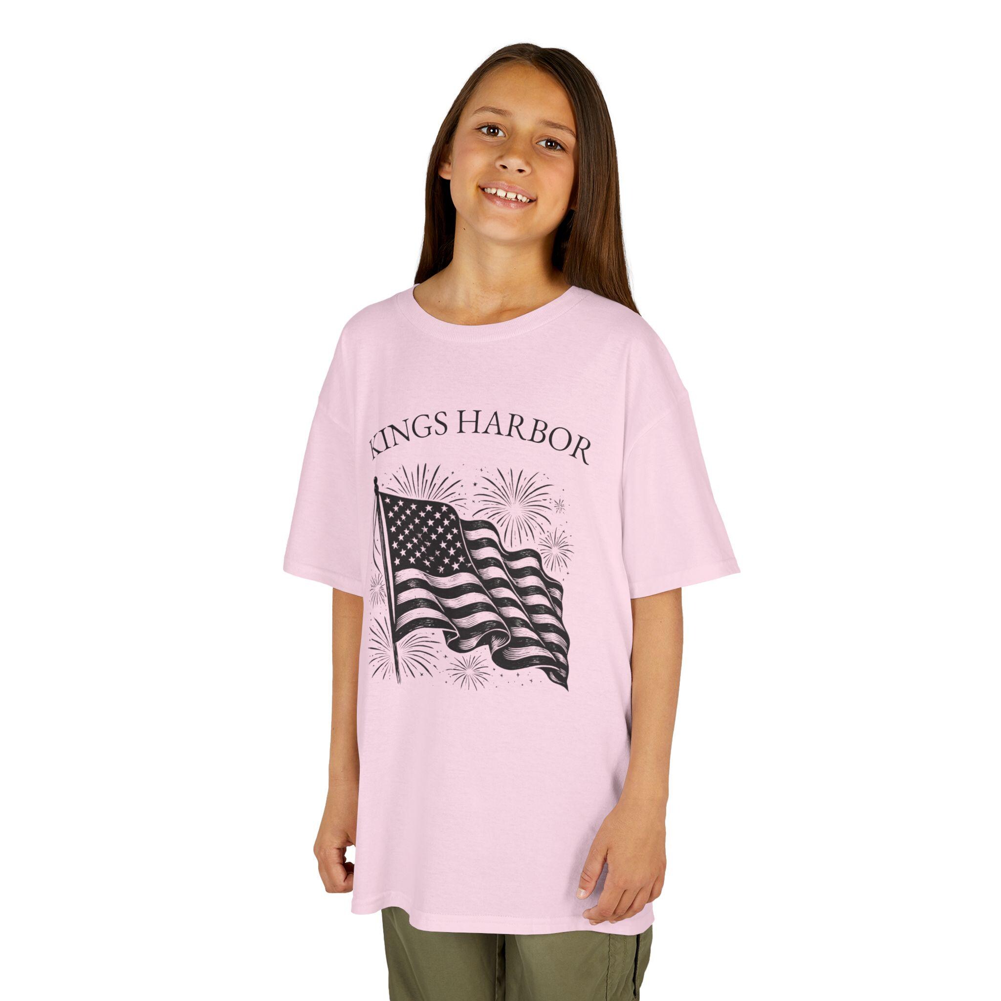 Show your patriotism for America with this Kids Tee featuring fireworks and a flag design. Perfect for young ones celebrating Independence Day, Memorial Day, Veterans Day, and other patriotic holidays. The tee is made with 100% US cotton, is ethically produced, and comes with a crew neckline for a timeless style.