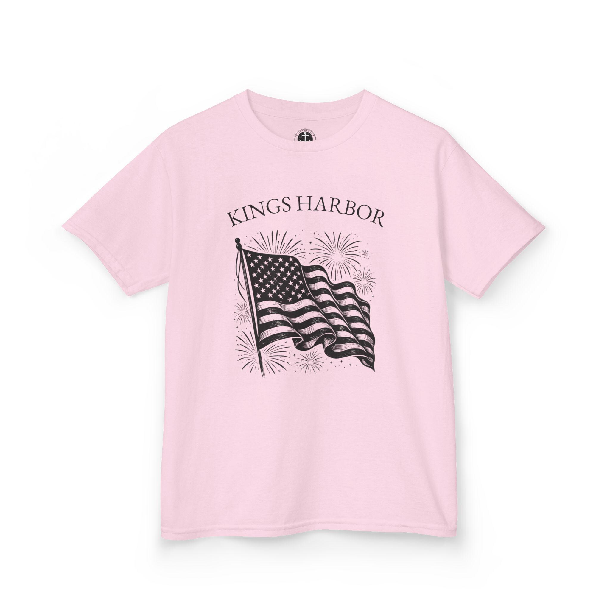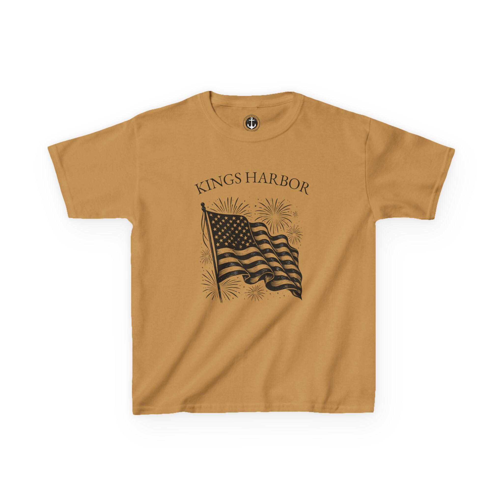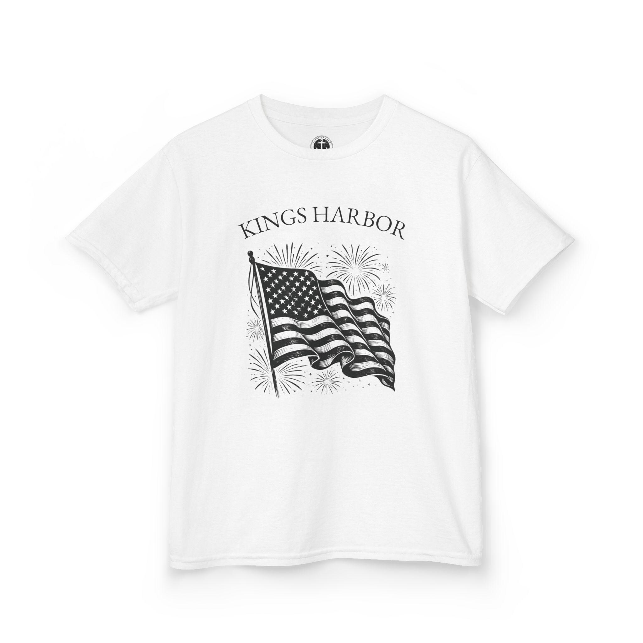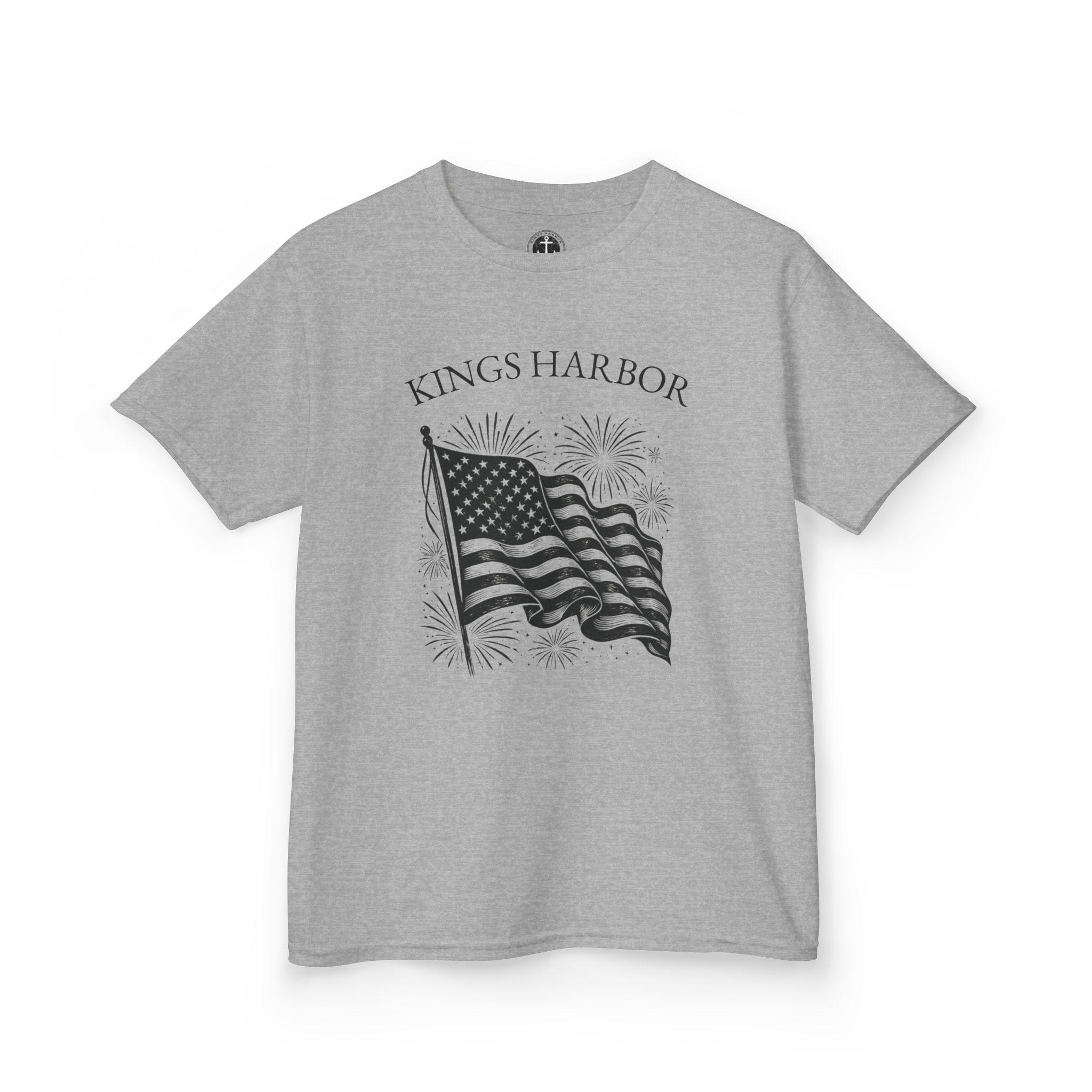 Show your patriotism for America with this Kids Tee featuring fireworks and a flag design. Perfect for young ones celebrating Independence Day, Memorial Day, Veterans Day, and other patriotic holidays. The tee is made with 100% US cotton, is ethically produced, and comes with a crew neckline for a timeless style.
