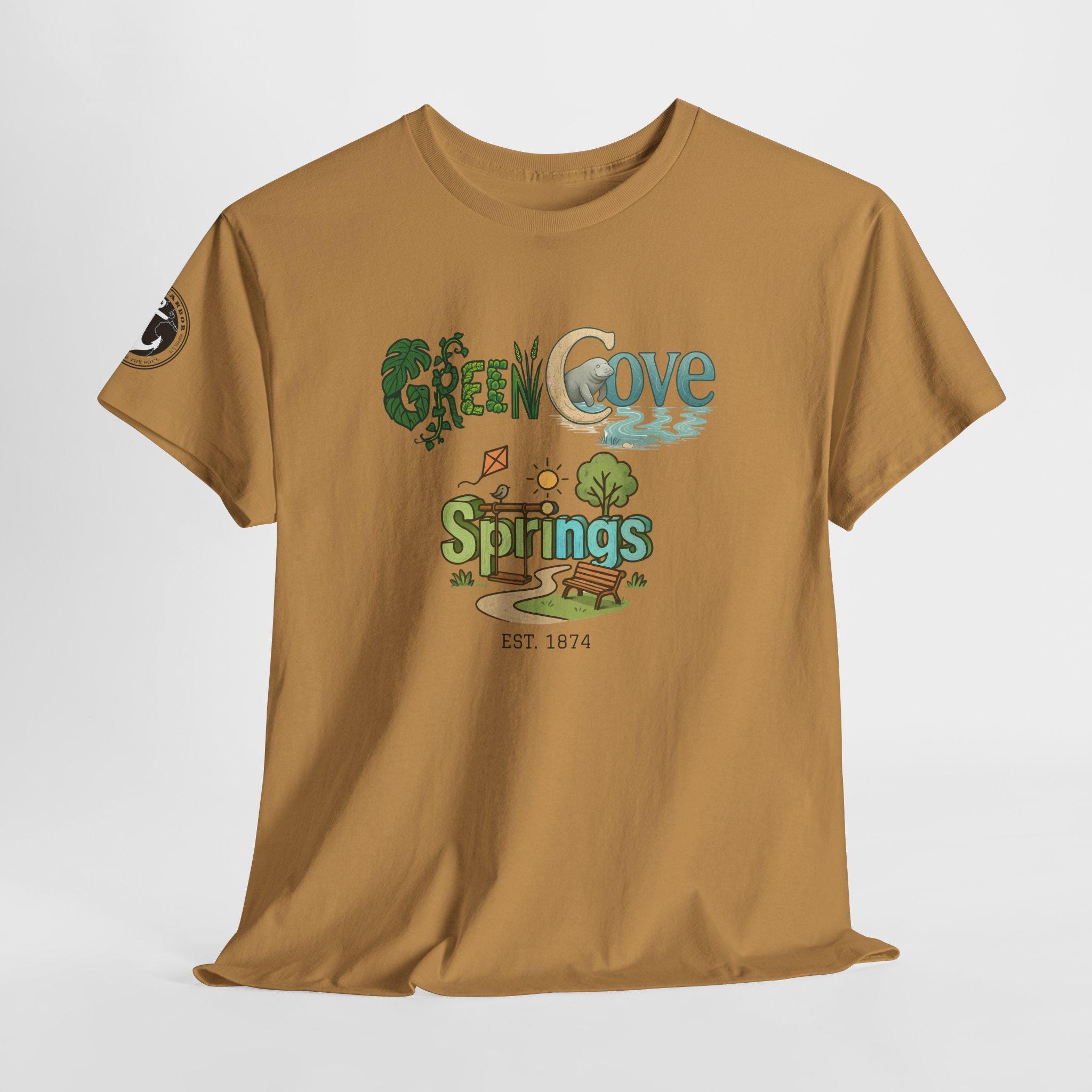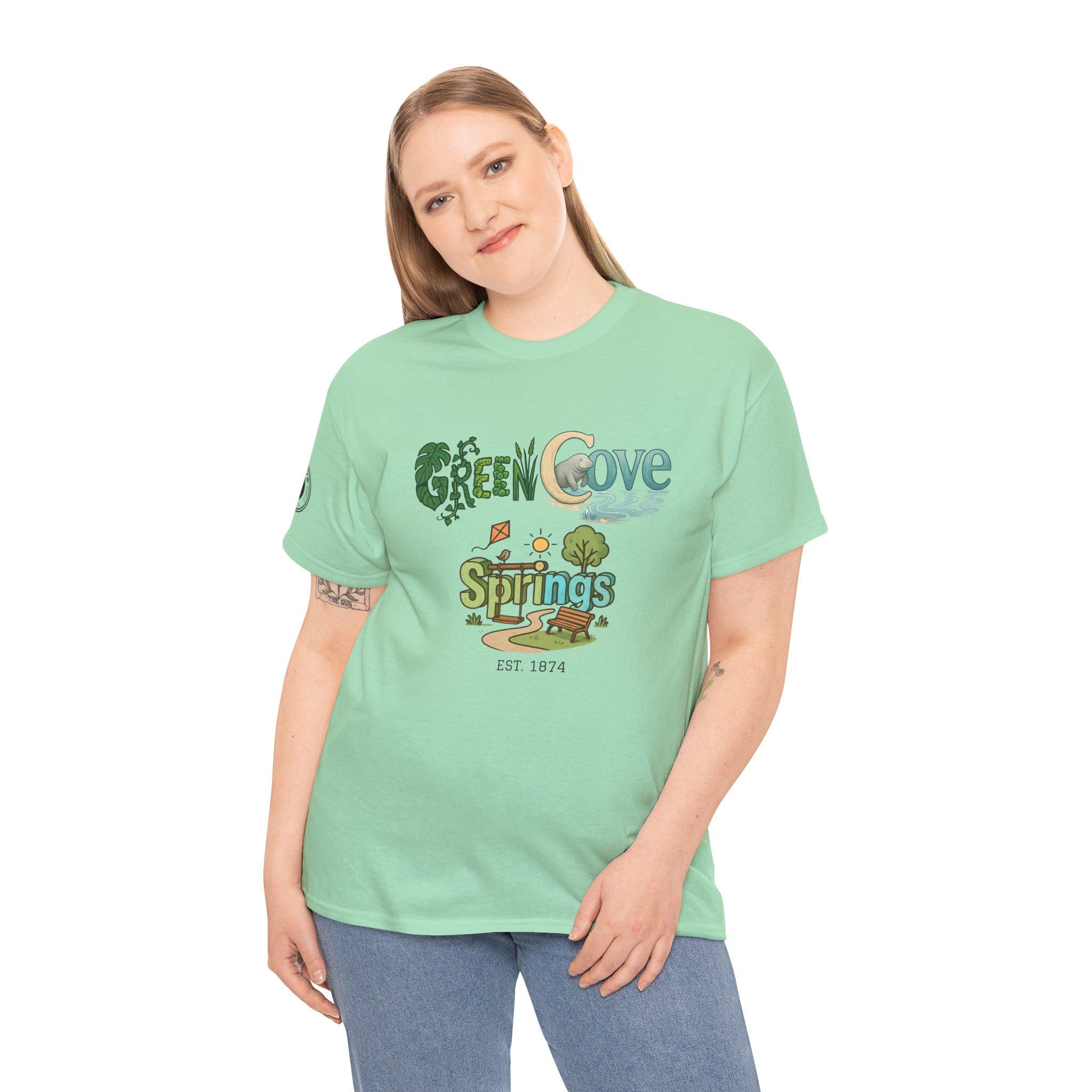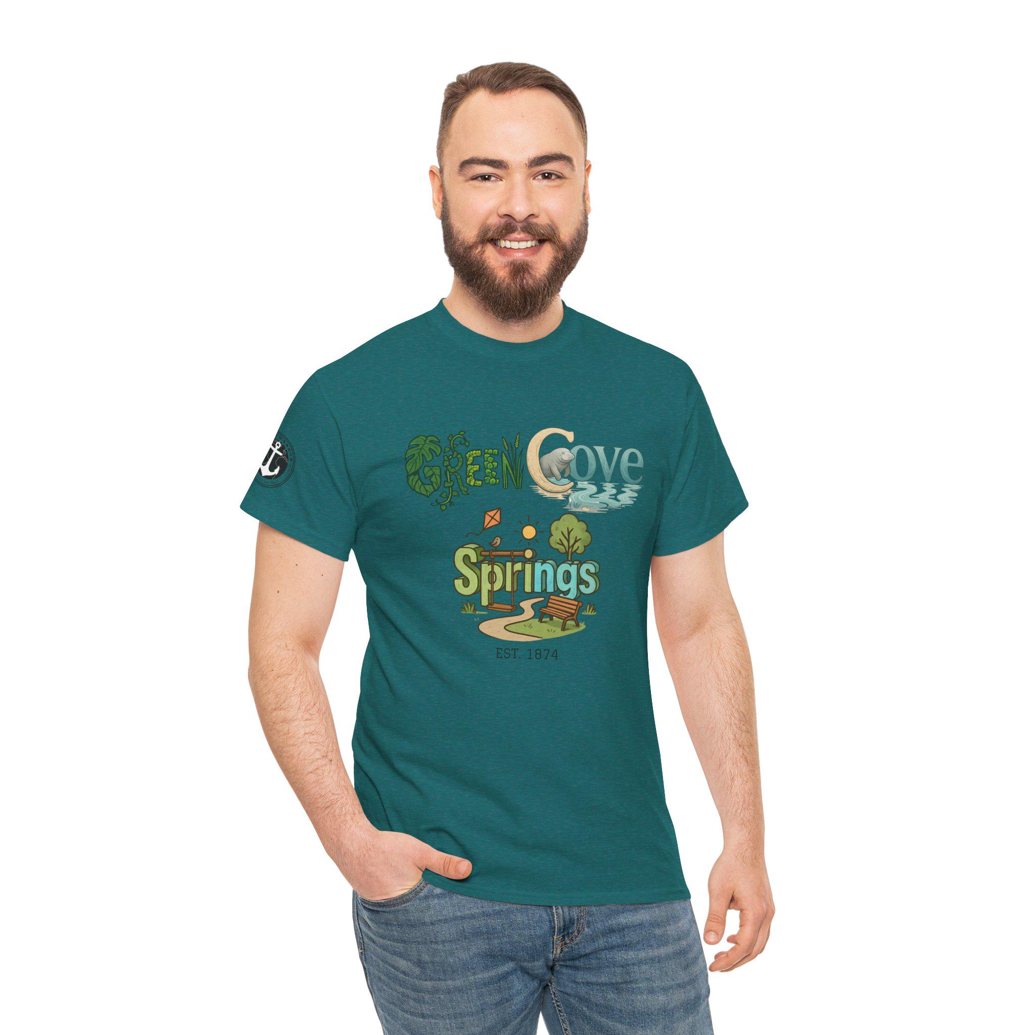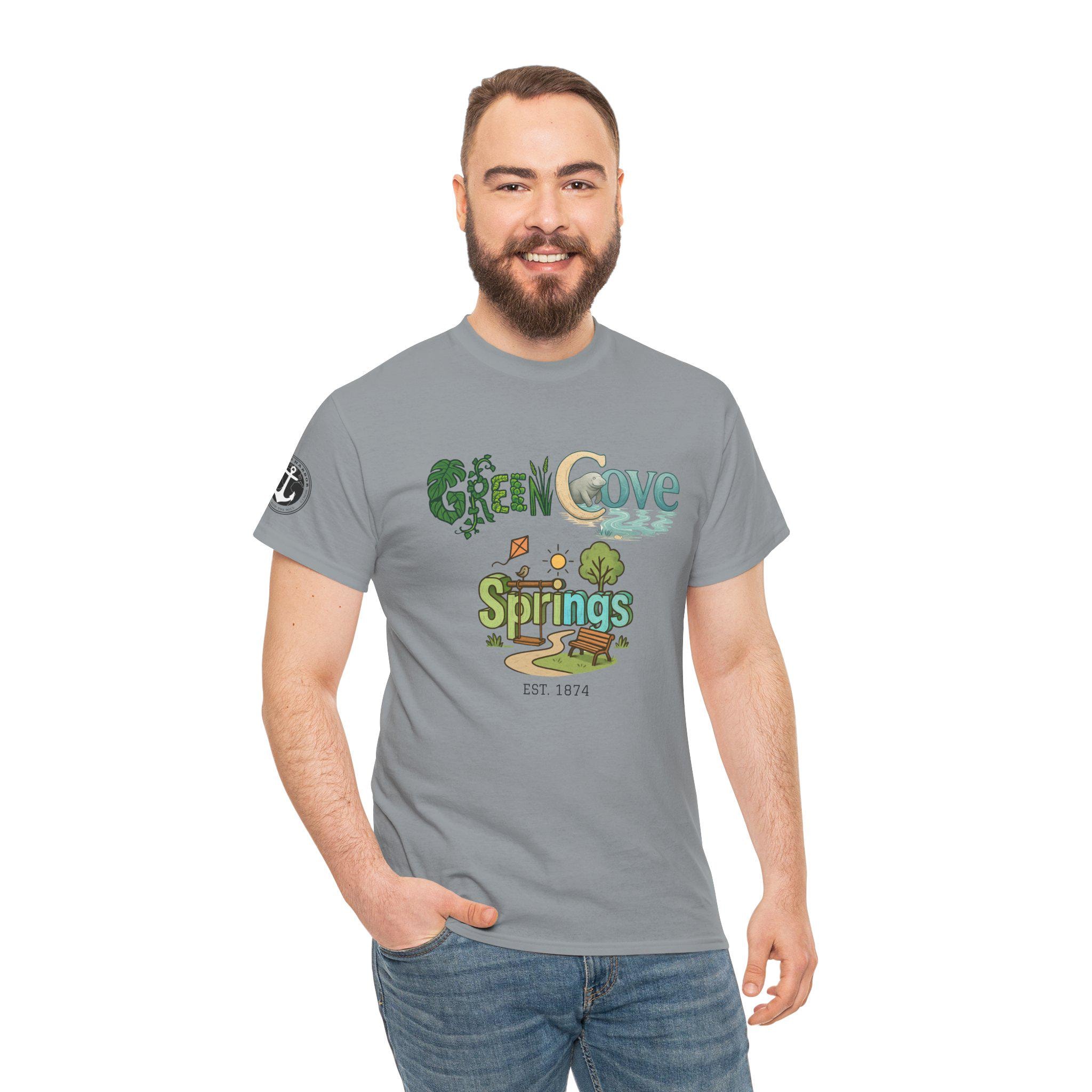 Soft, breathable, and built to last — this classic crew tee carries a cozy, outdoorsy vibe. A sunlit graphic reads “Green Cove Springs” in warm greens and sandy tones, with tiny icons of a tree, a winding path, and a river that whisper of lazy days by the water. The cut is relaxed and familiar: roomy shoulders, a ribbed collar that holds shape, and a tear-away label for itch-free wear. It layers easily under a flannel or pairs with board shorts for a weekend exploring parks, riversides, and small-town trails. Subtle sleeve printing adds a nod of authenticity without shouting for attention.