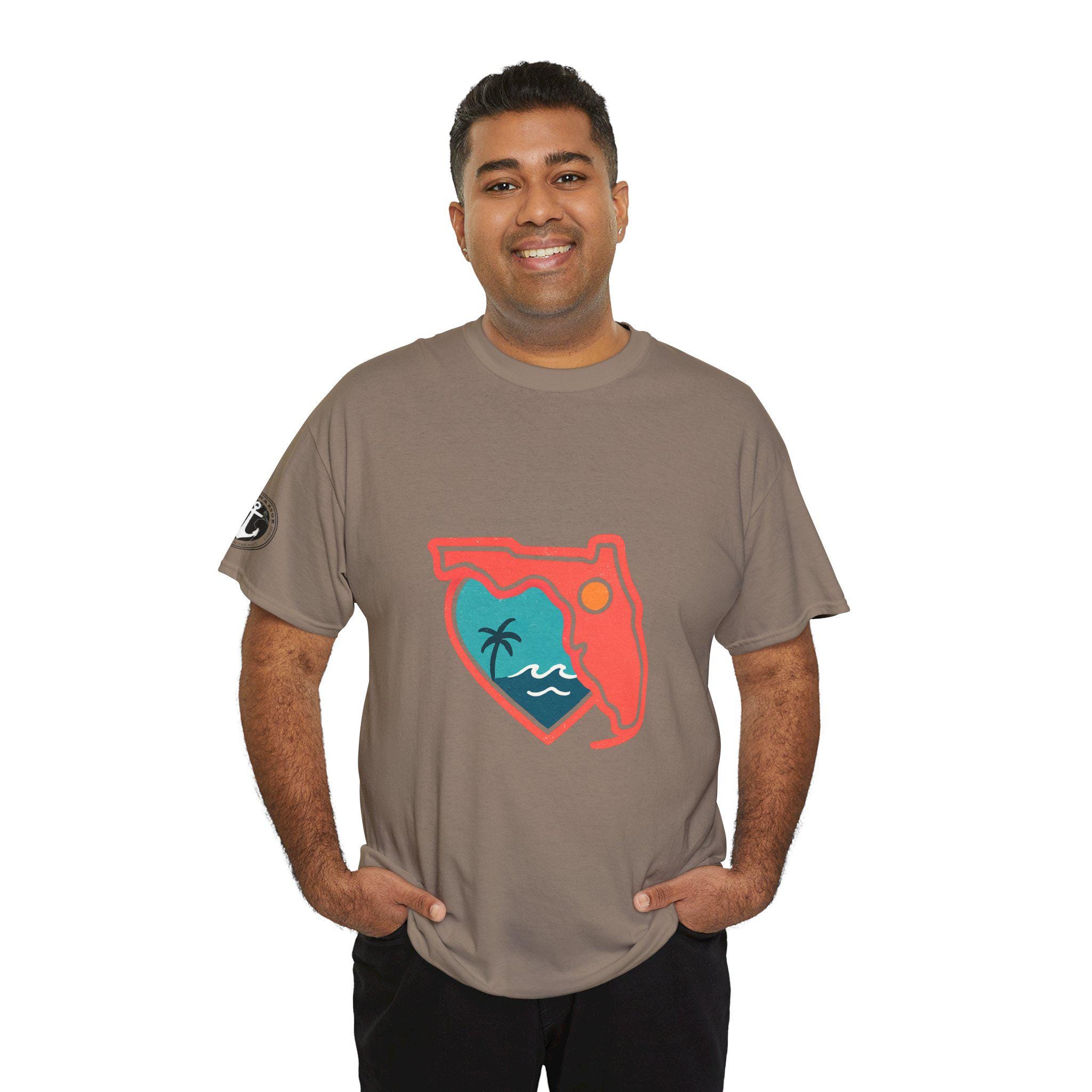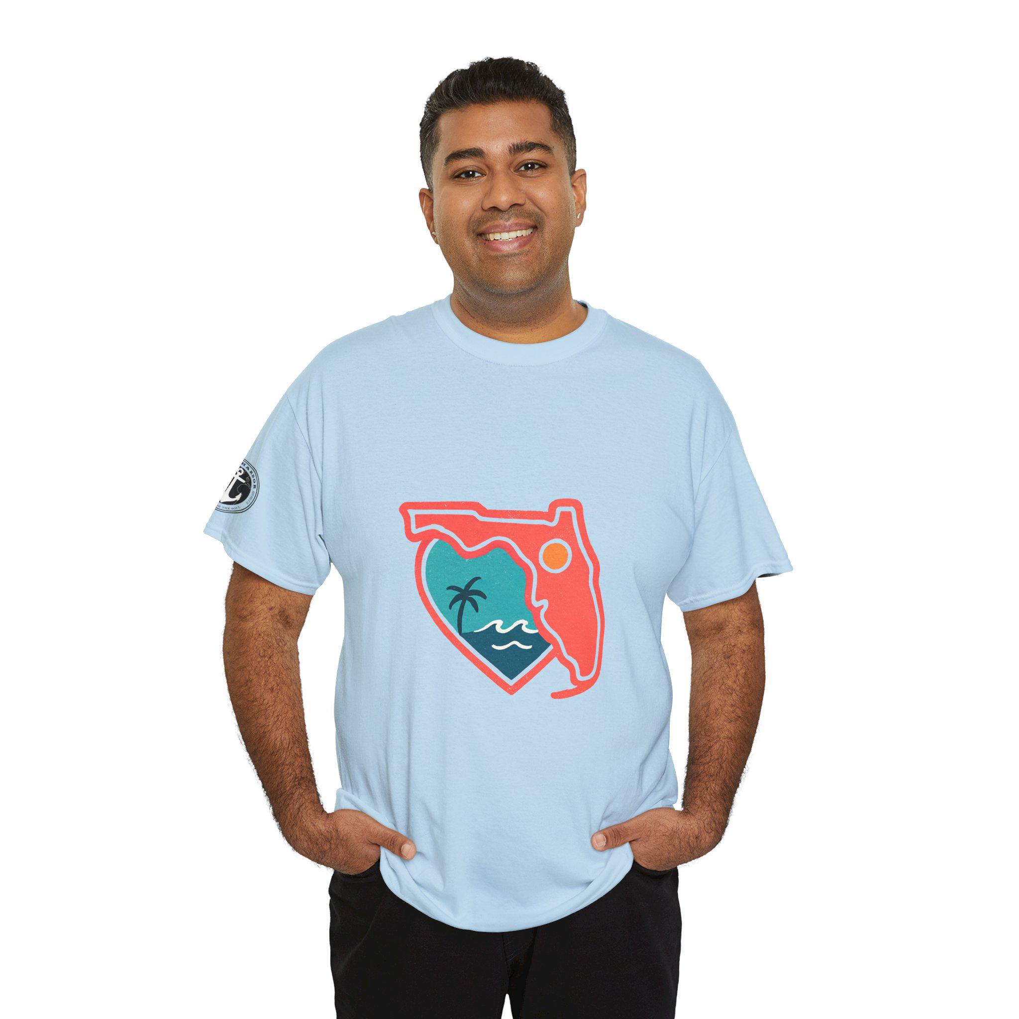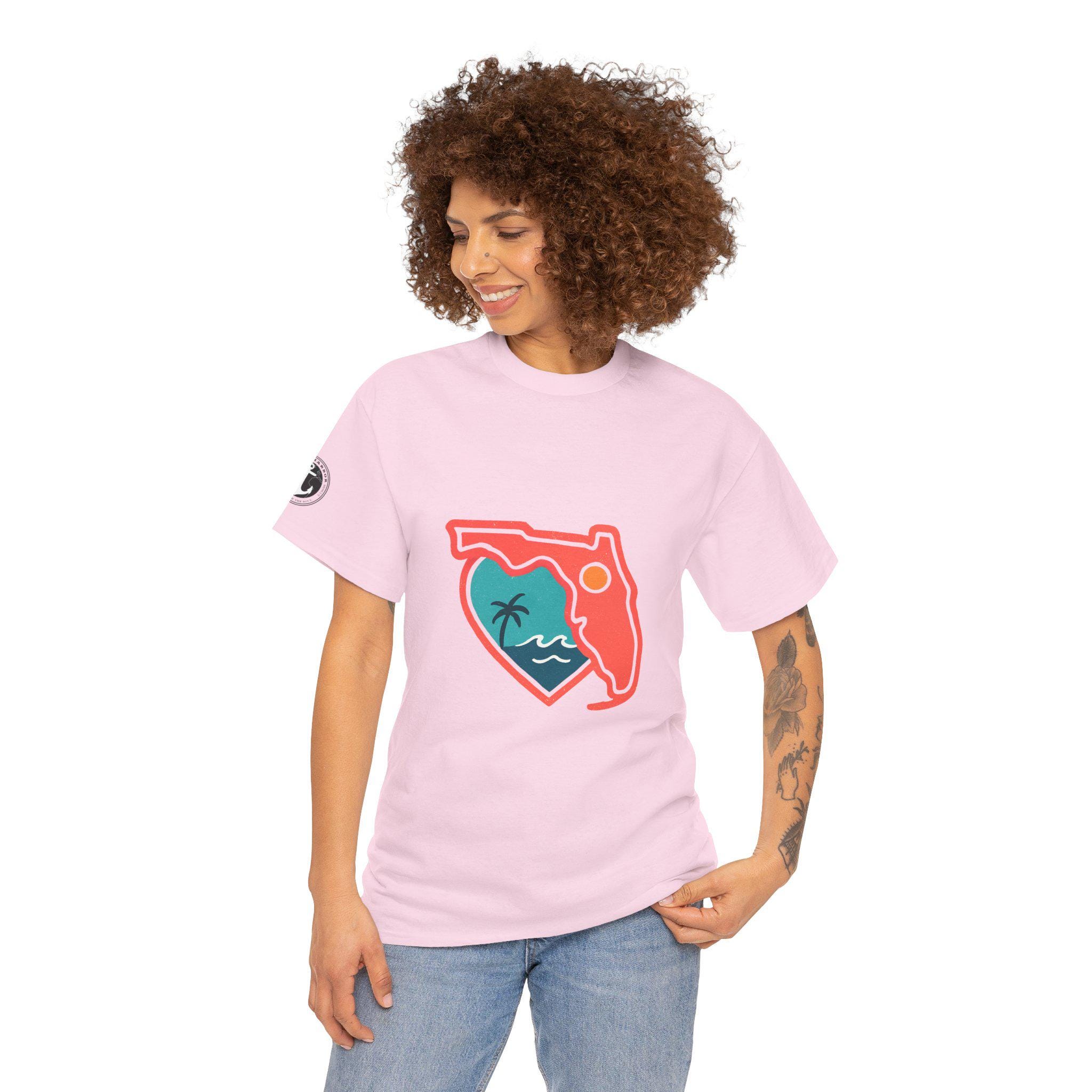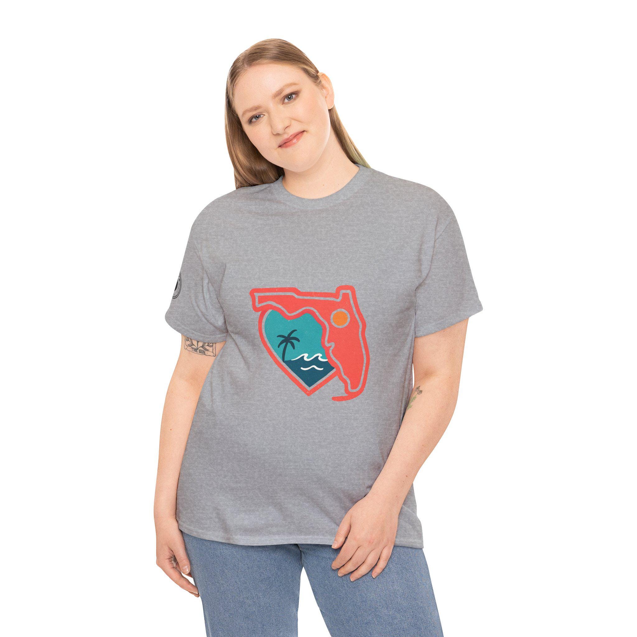 Show your love for the state of Florida in this heart Florida motif design. This unisex heavy cotton T-shirt is perfect for anyone looking to represent their favorite state in a stylish and comfortable way. Ideal for Florida residents, visitors, and anyone with a connection to the state. Perfect for wearing on vacations, during state celebrations, or as a thoughtful gift for Florida enthusiasts.