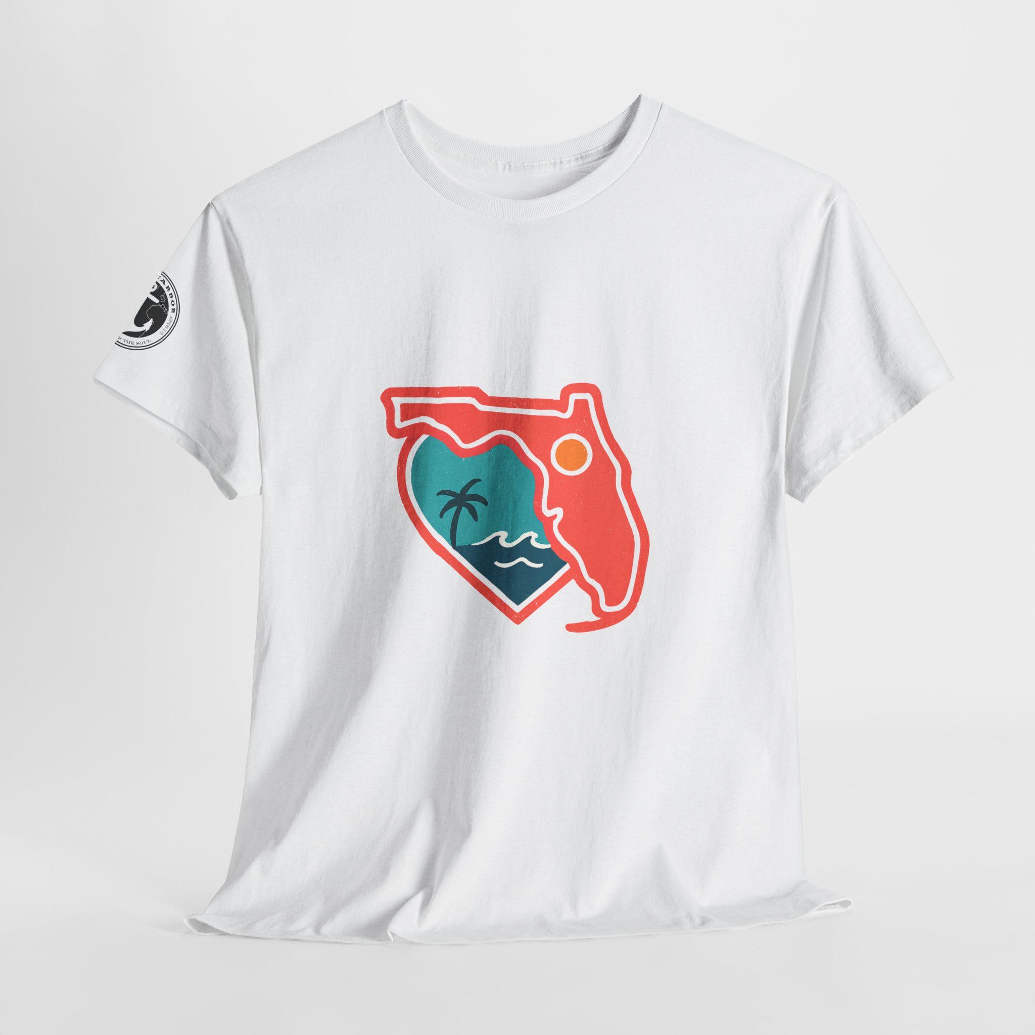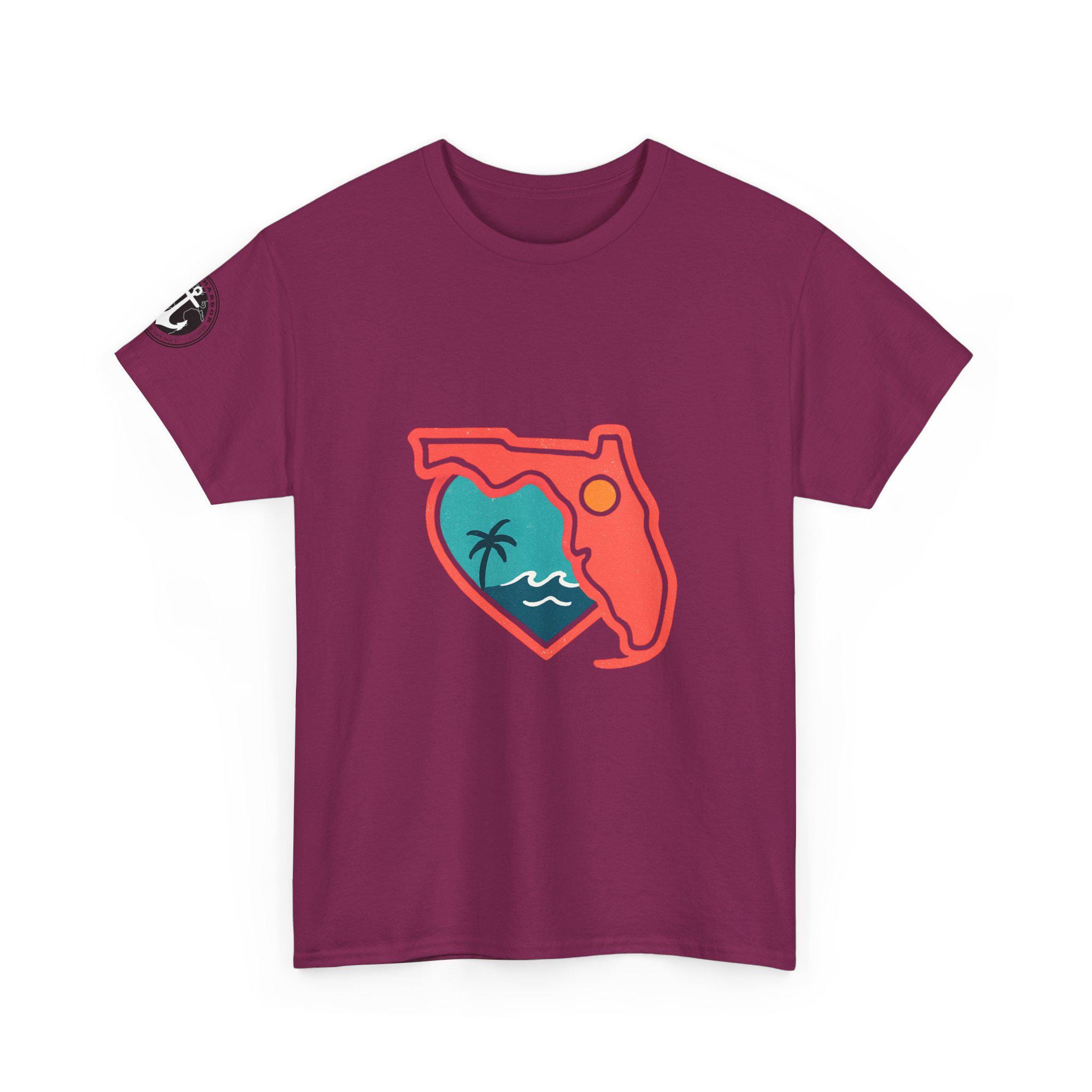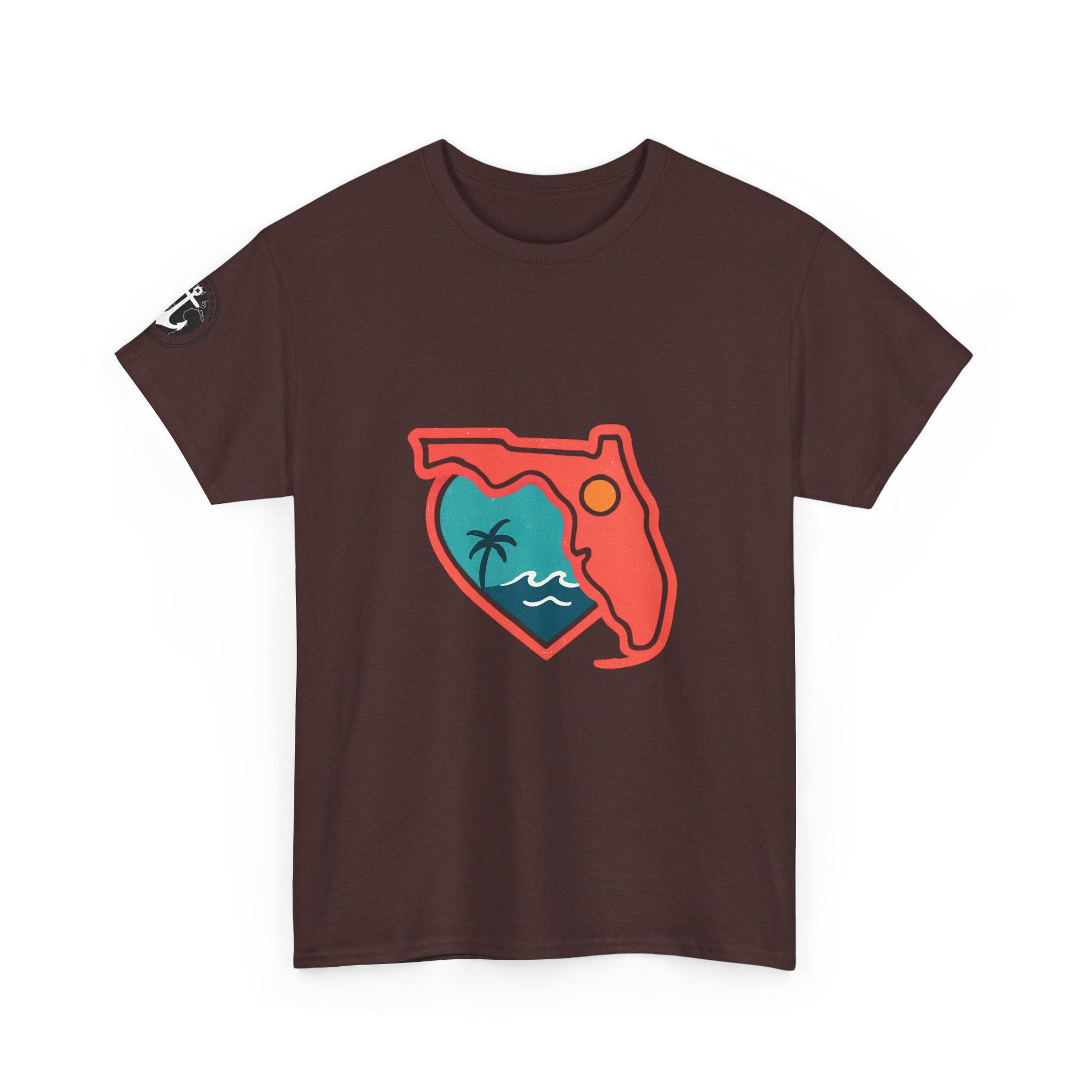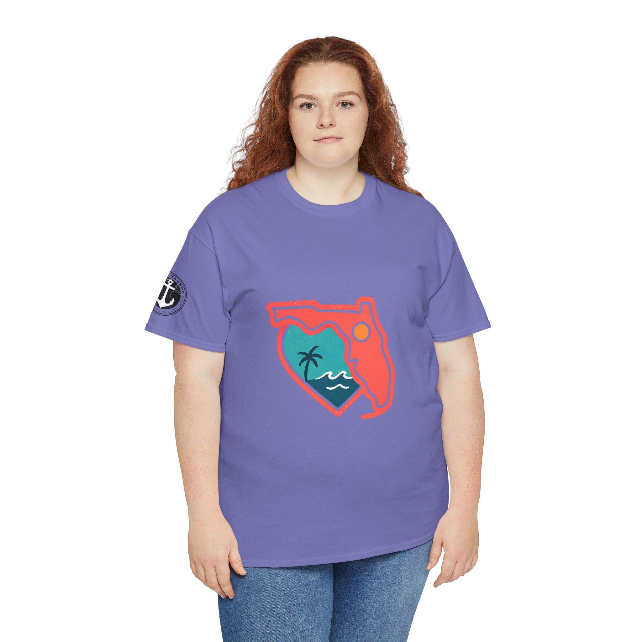 Show your love for the state of Florida in this heart Florida motif design. This unisex heavy cotton T-shirt is perfect for anyone looking to represent their favorite state in a stylish and comfortable way. Ideal for Florida residents, visitors, and anyone with a connection to the state. Perfect for wearing on vacations, during state celebrations, or as a thoughtful gift for Florida enthusiasts.