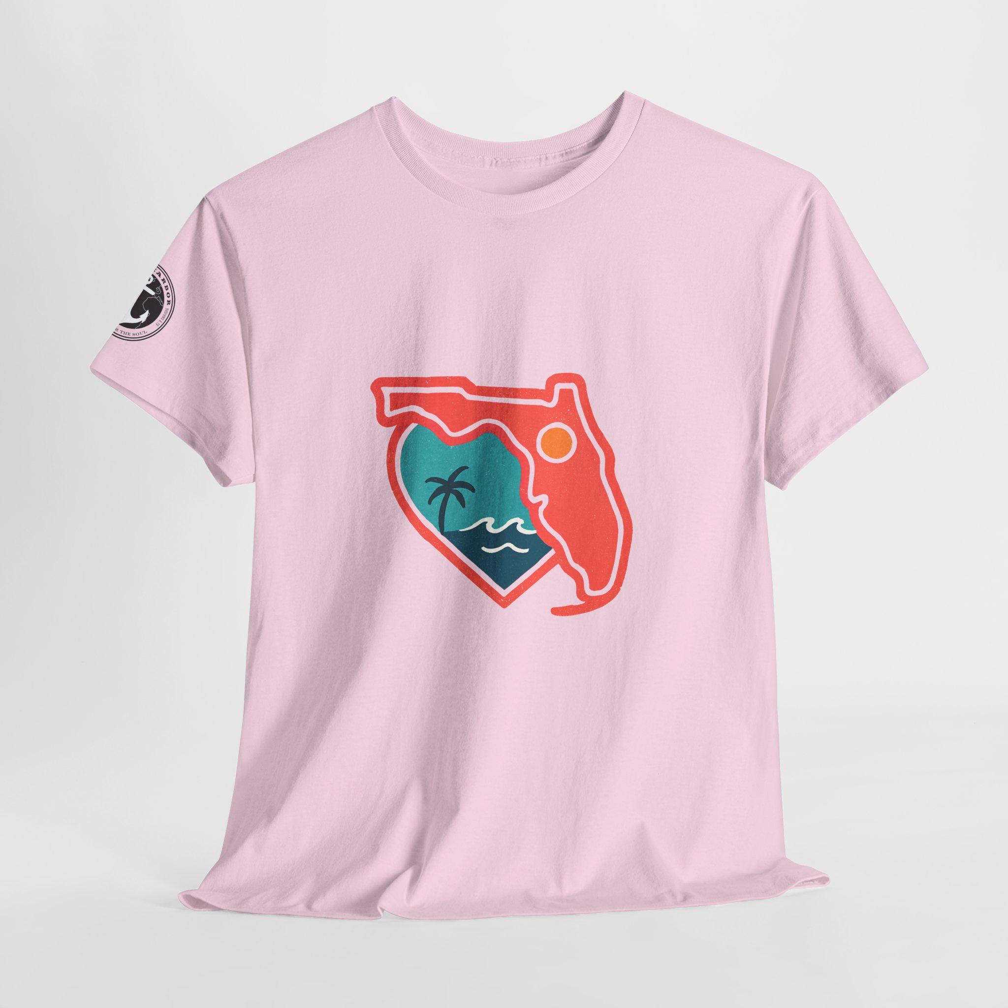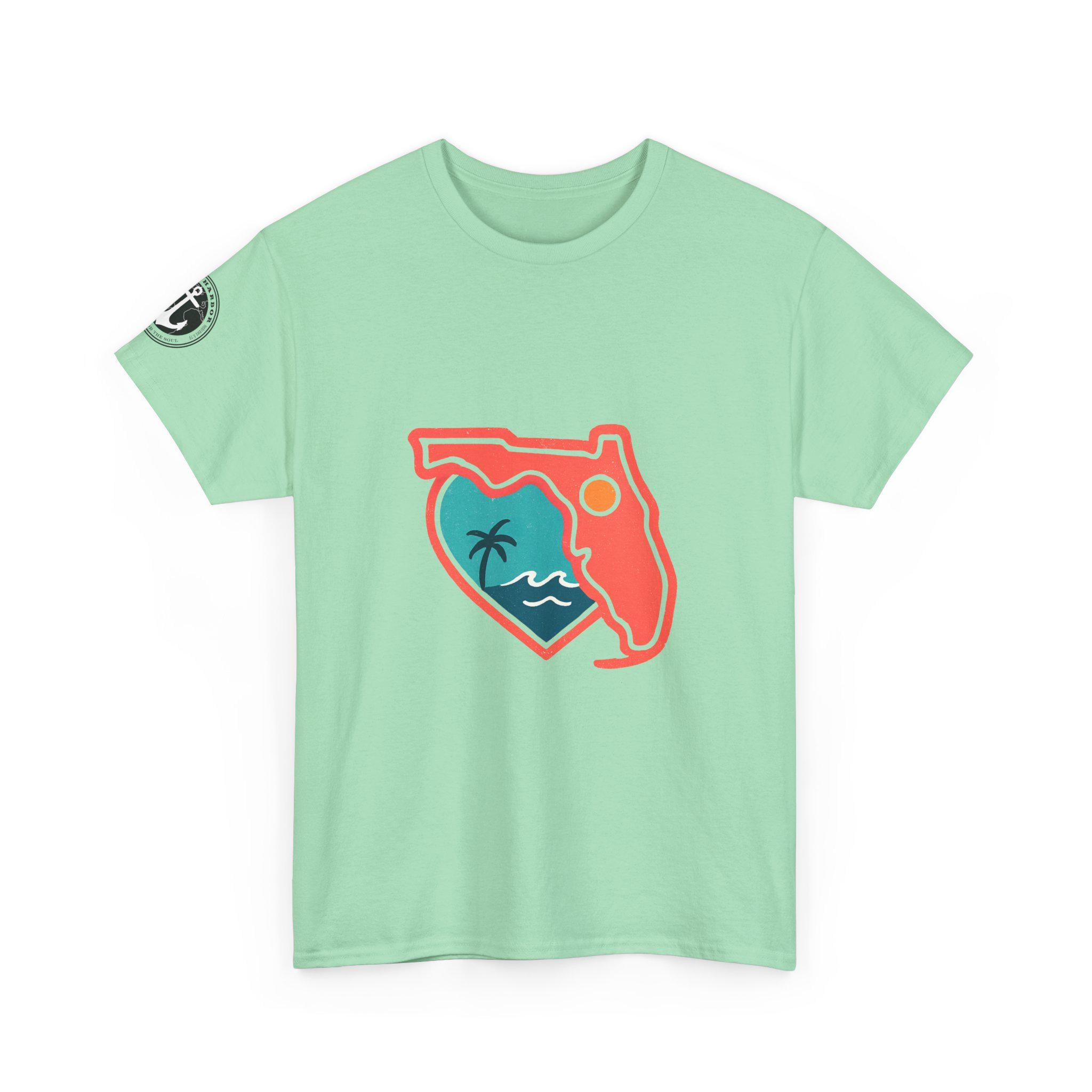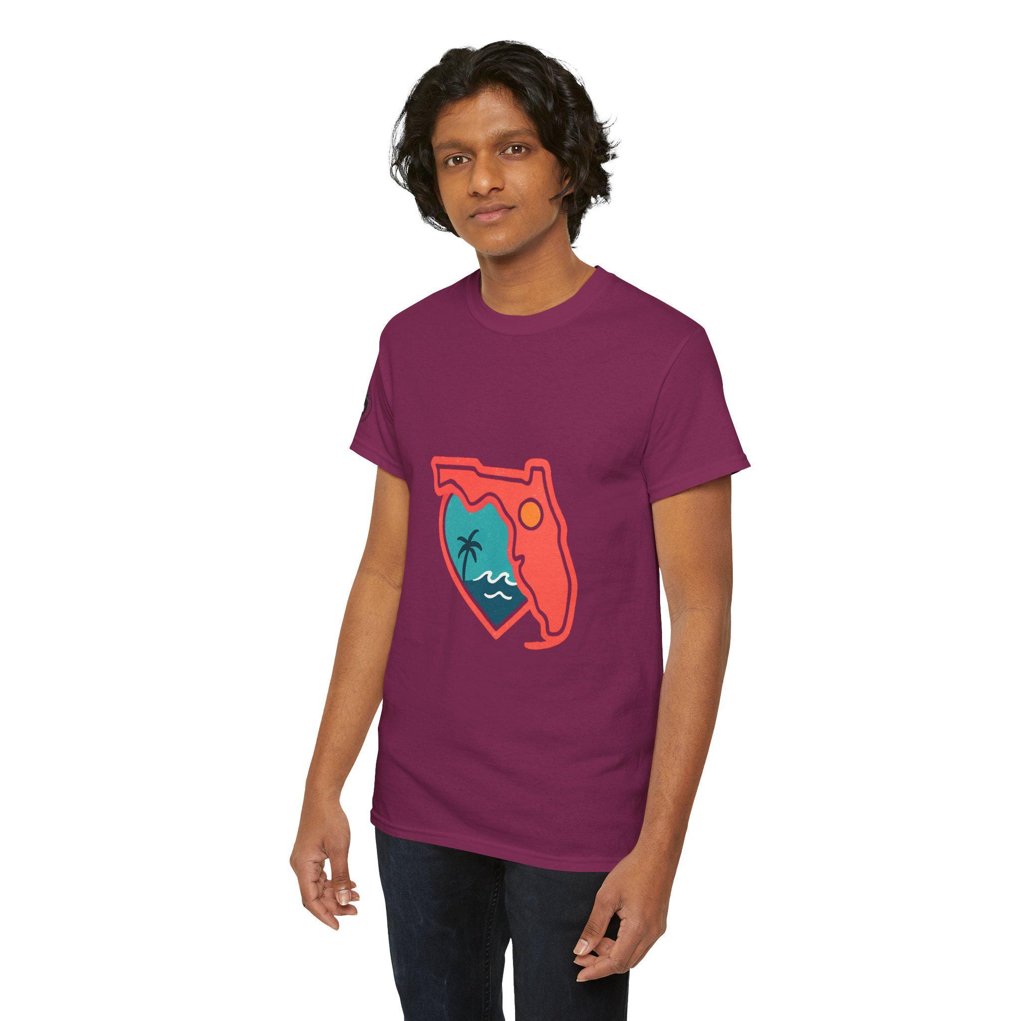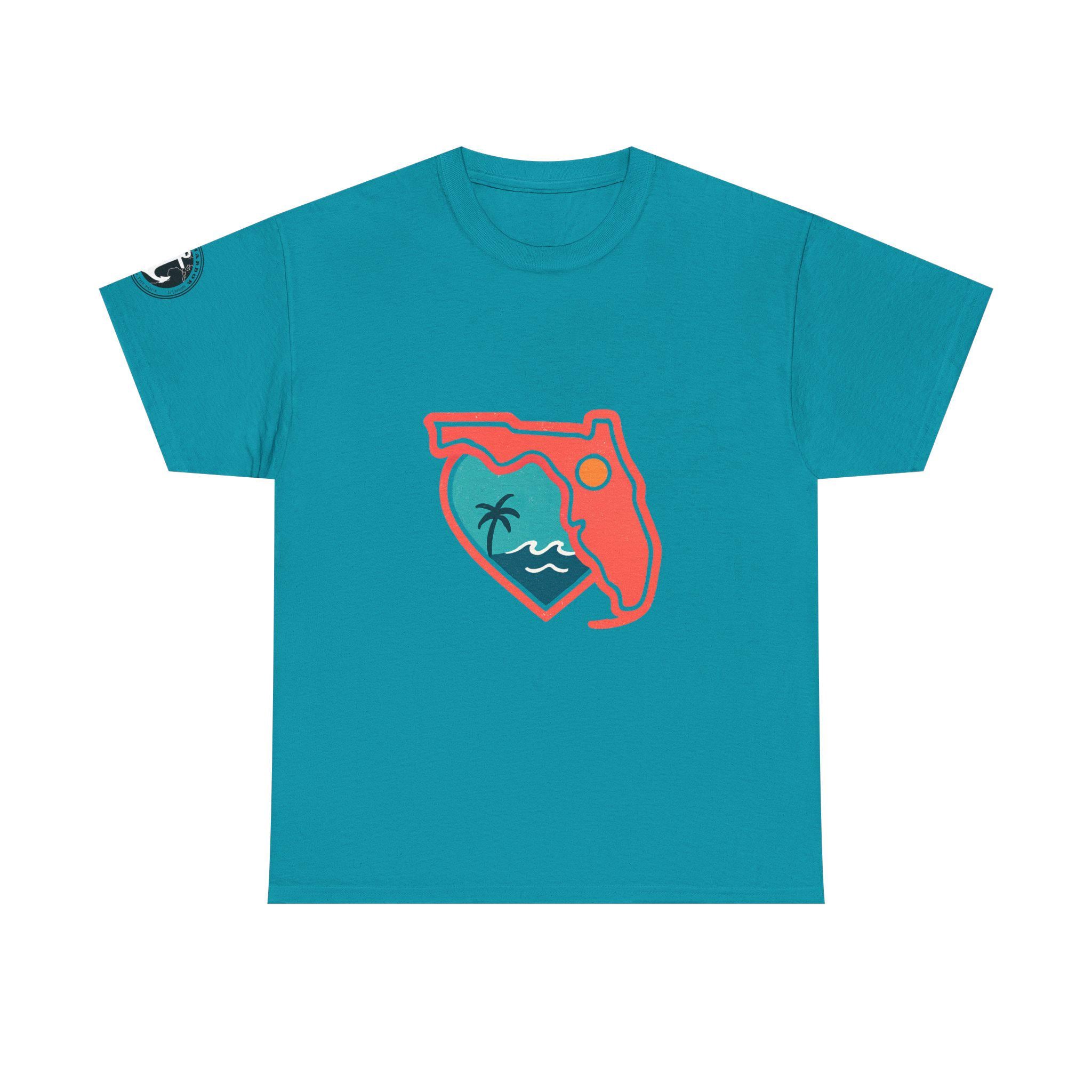 Show your love for the state of Florida in this heart Florida motif design. This unisex heavy cotton T-shirt is perfect for anyone looking to represent their favorite state in a stylish and comfortable way. Ideal for Florida residents, visitors, and anyone with a connection to the state. Perfect for wearing on vacations, during state celebrations, or as a thoughtful gift for Florida enthusiasts.