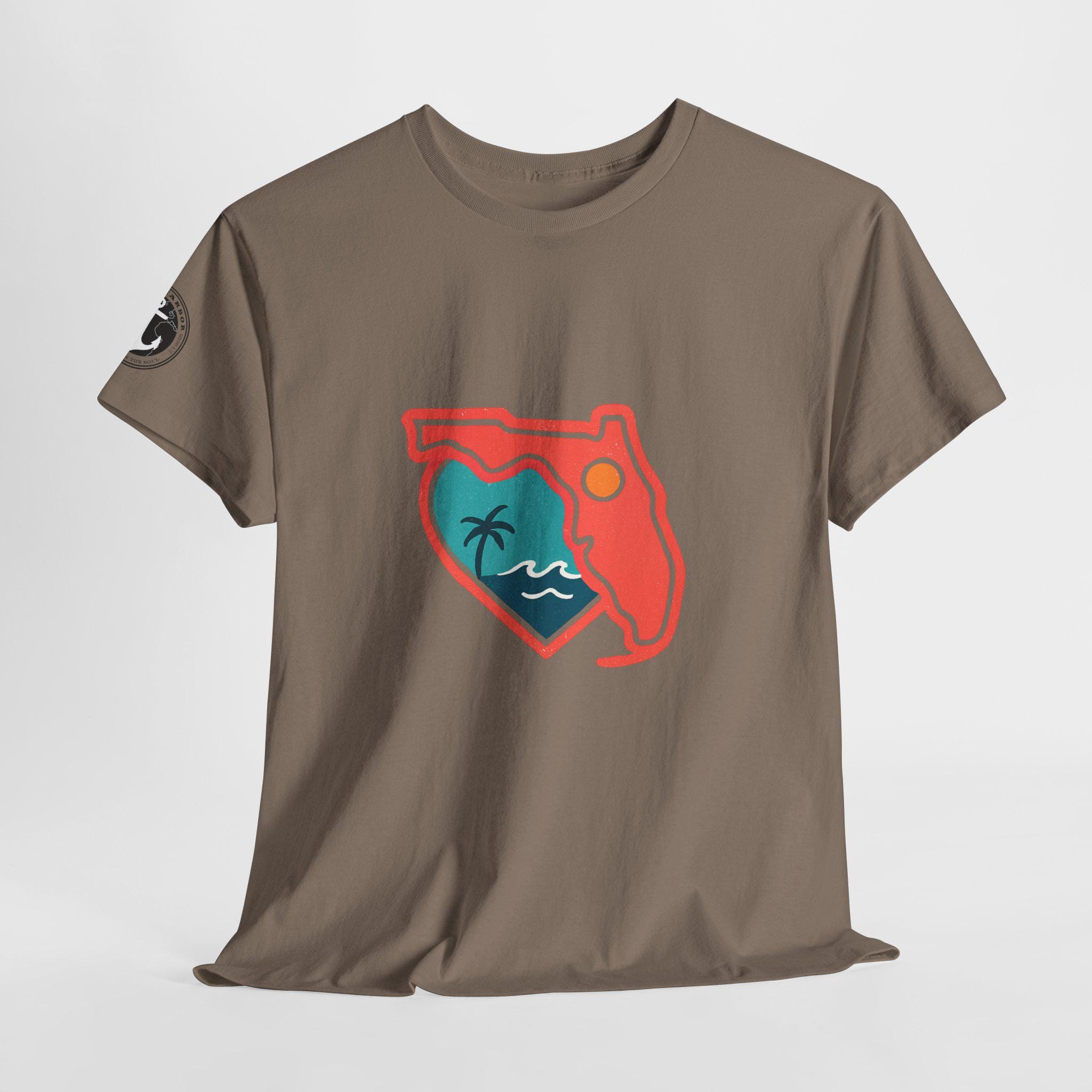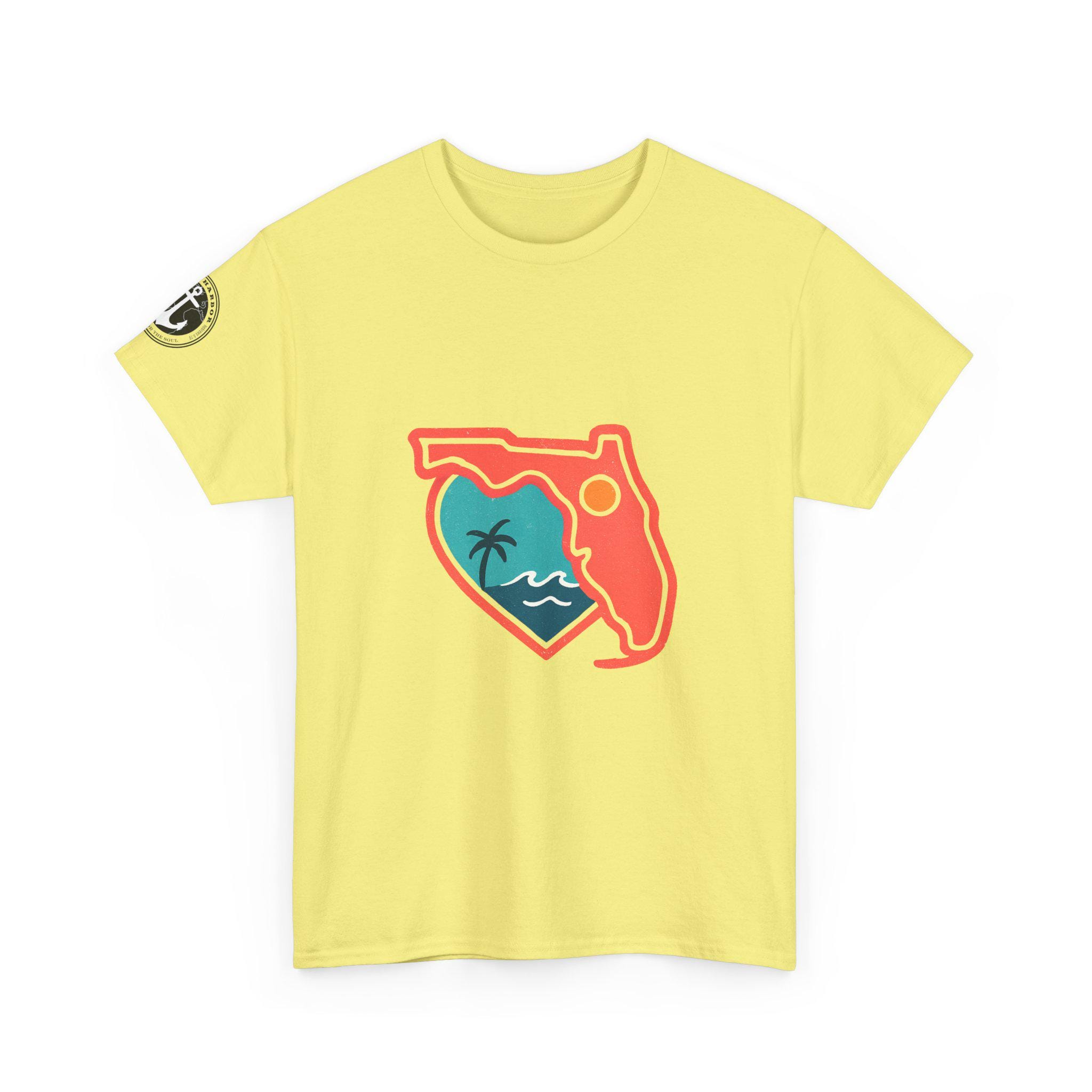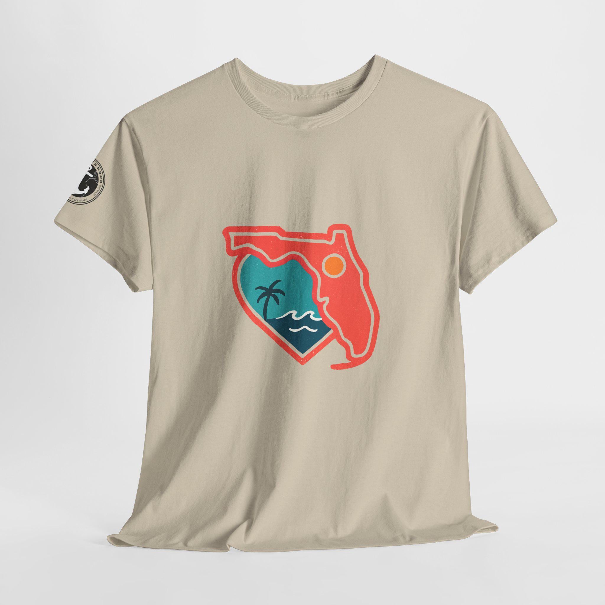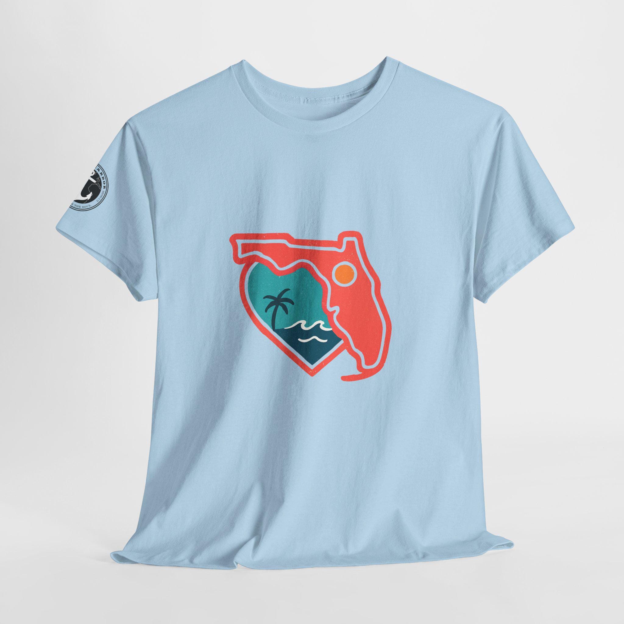 Show your love for the state of Florida in this heart Florida motif design. This unisex heavy cotton T-shirt is perfect for anyone looking to represent their favorite state in a stylish and comfortable way. Ideal for Florida residents, visitors, and anyone with a connection to the state. Perfect for wearing on vacations, during state celebrations, or as a thoughtful gift for Florida enthusiasts.