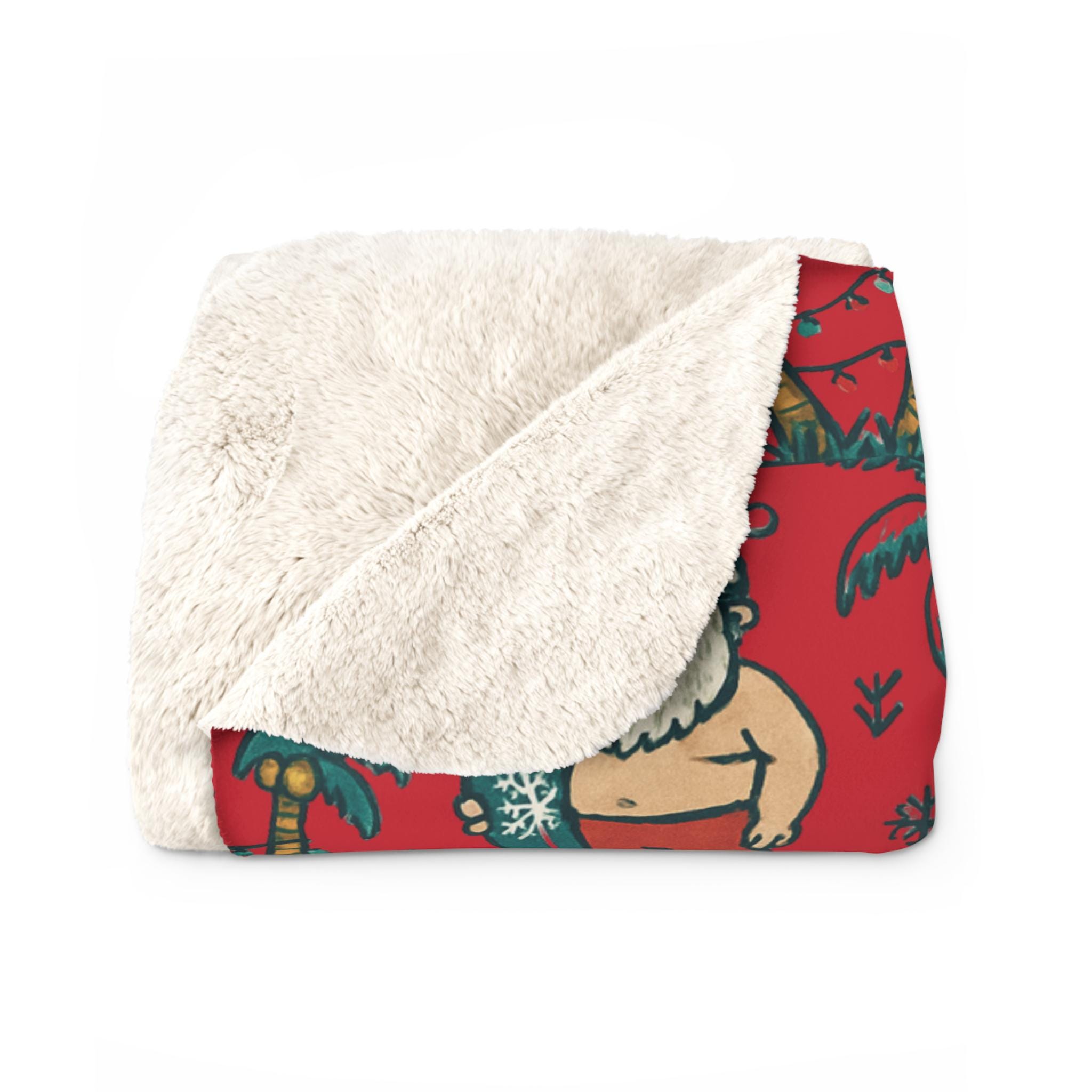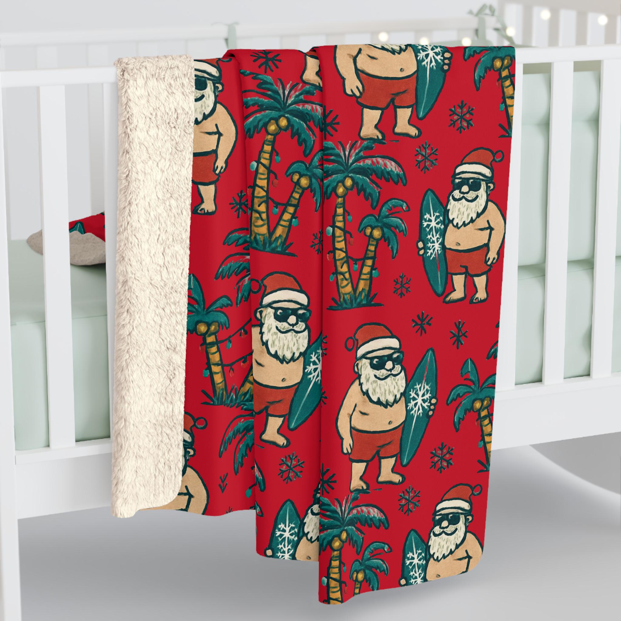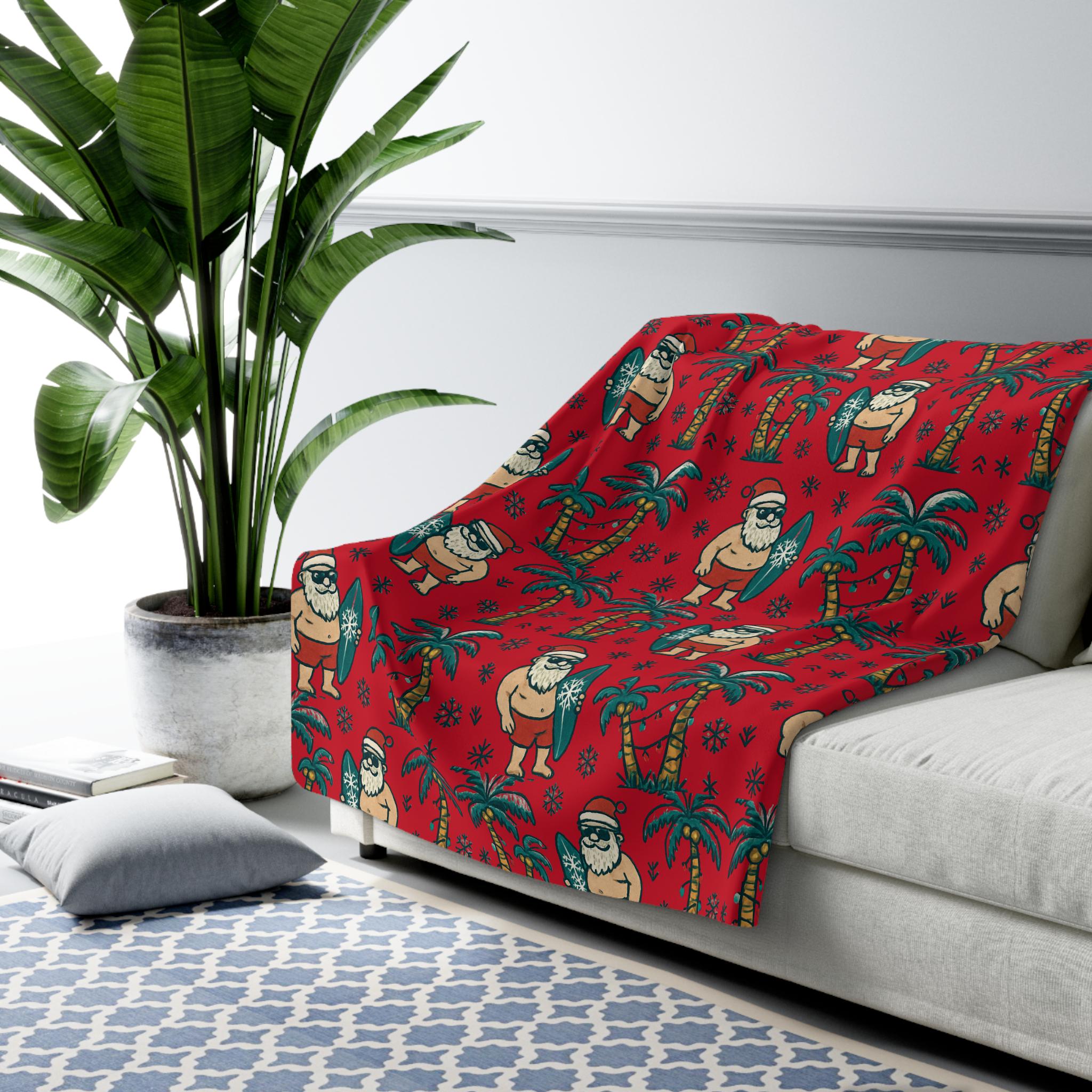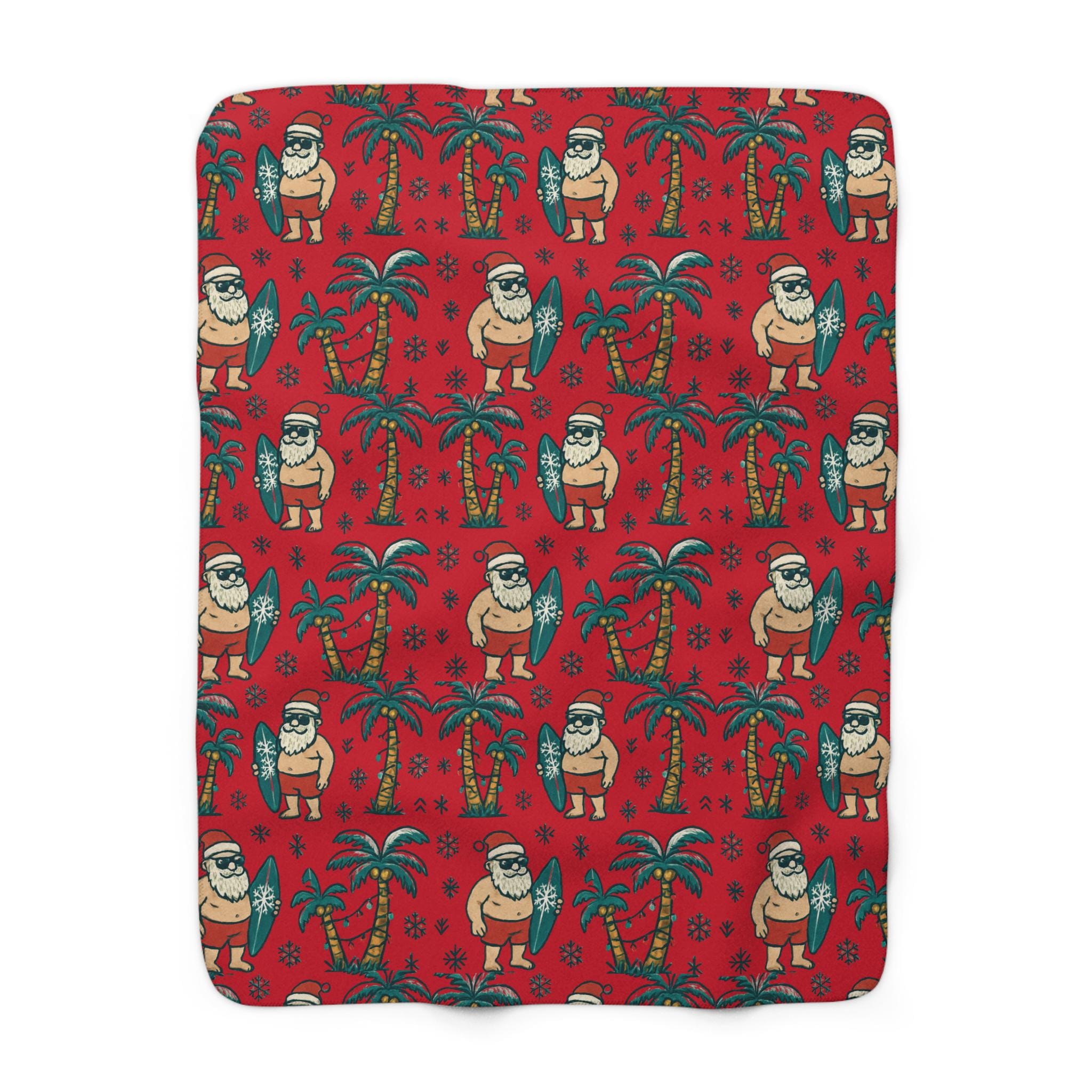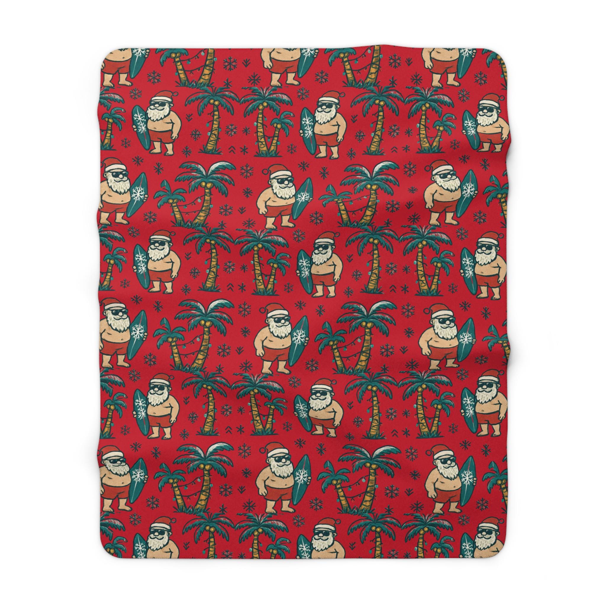 Imagine curling up under a blanket that smells like salt air and tinsel—Santa trading sleigh bells for surfboards, palm trees wrapped in twinkling lights. This sherpa fleece blanket brings that warm, playful holiday mood into quiet mornings and late-night movie marathons. It drapes easily over a sofa or beach chair, adding a burst of tropical cheer to a winter night. For adults who love seasonal whimsy and coastal vibes, it turns ordinary evenings into a small celebration of sun, sand, and holiday sparkle. - Color - Red