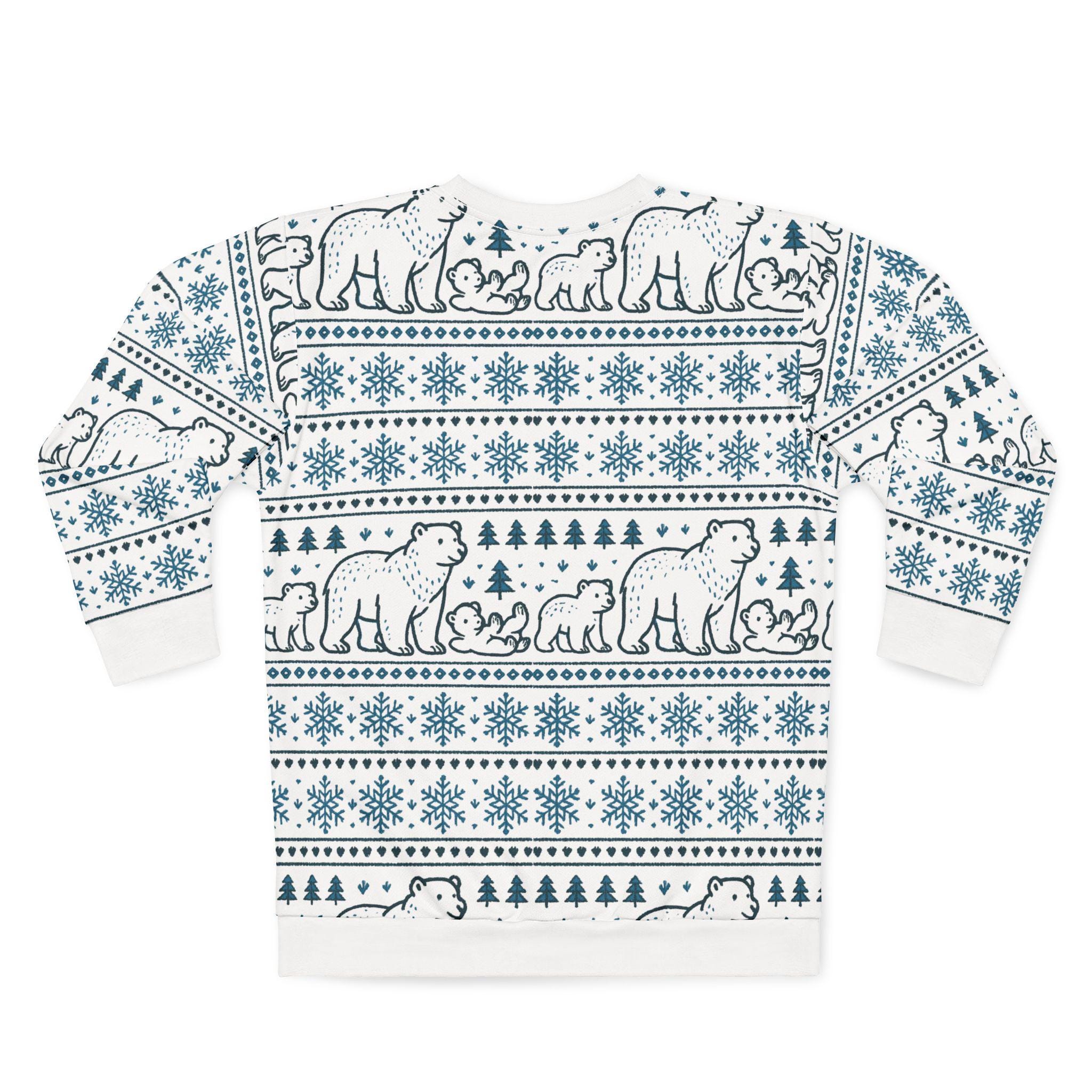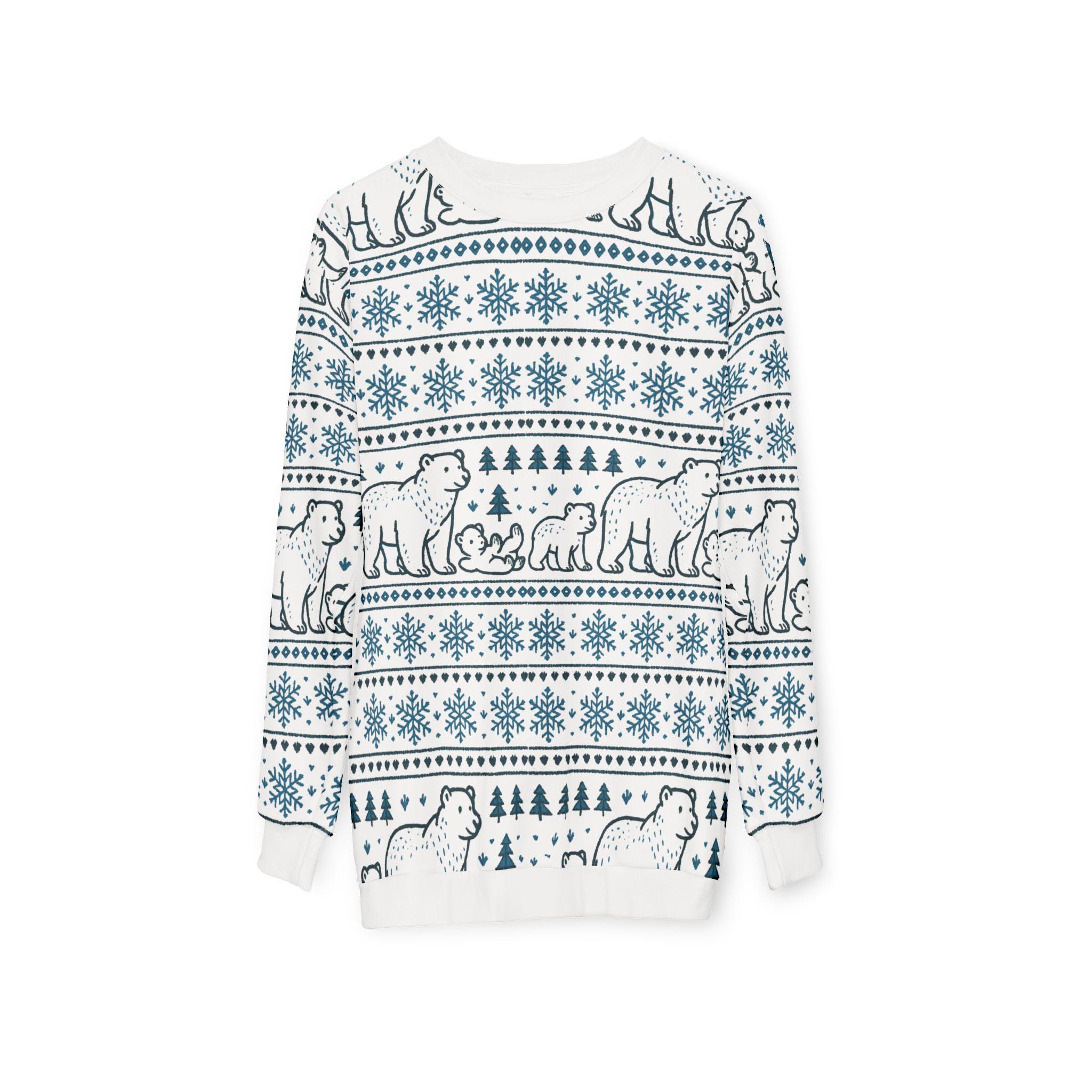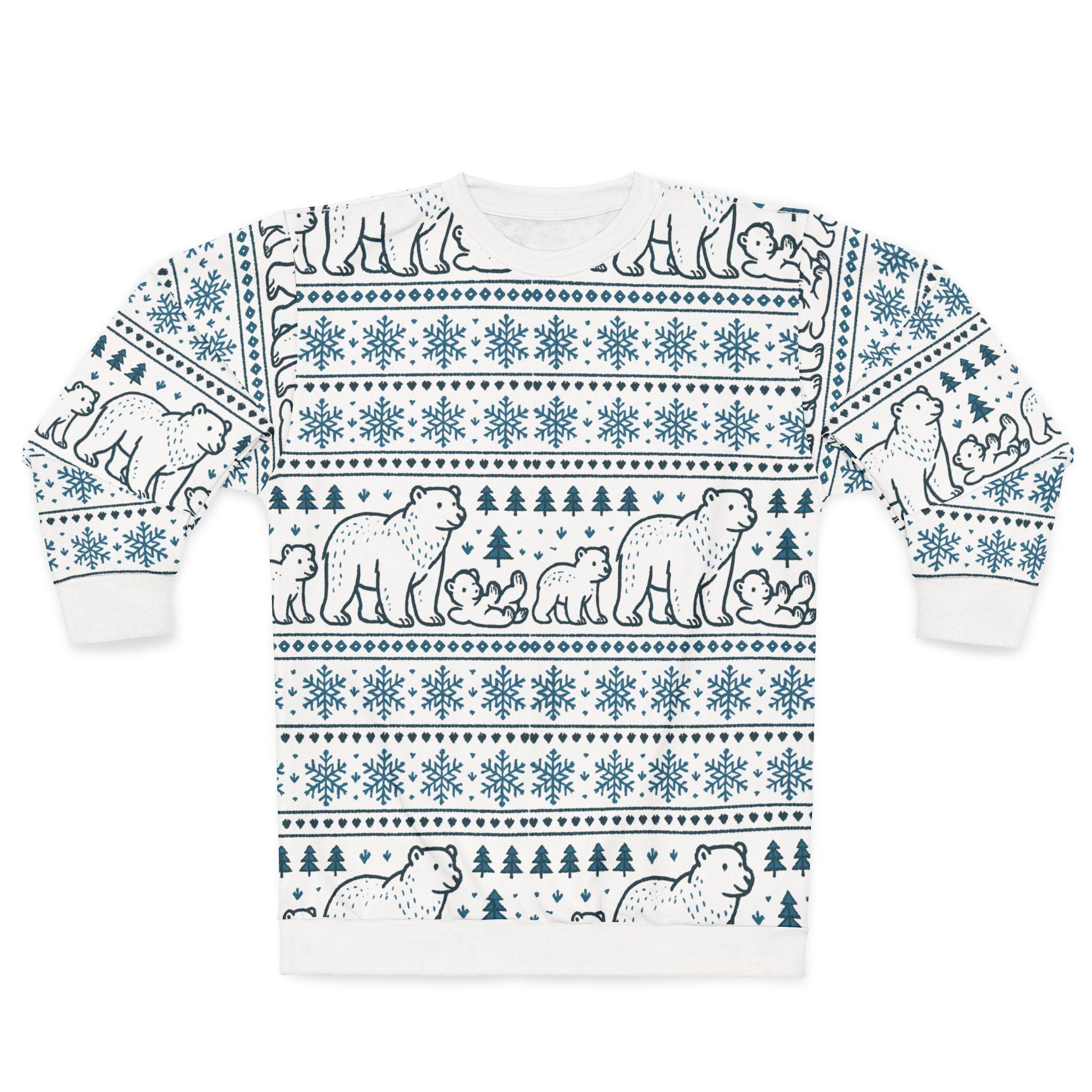 Wrap yourself in a quiet arctic evening with this cozy sweater featuring a tender polar bear and cubs winter pattern. Soft, cloud-like polyester holds the scene in vivid, all-over color — frosty blues, ivory fur, and warm glows around the family — so every glance feels like a small, calming story. It sits comfortably at the crew neck and falls in a relaxed, classic fit, making it easy to layer over a tee or wear alone while sipping something hot by a frosted window. The ribbed-knit collar and cuffs stretch and bounce back, keeping the silhouette neat through many wears. Whether you’re heading out for a peaceful winter walk, settling in for a movie night, or gifting a quiet moment of comfort to someone who loves wildlife, this sweater brings a gentle, nature-first presence to everyday life.