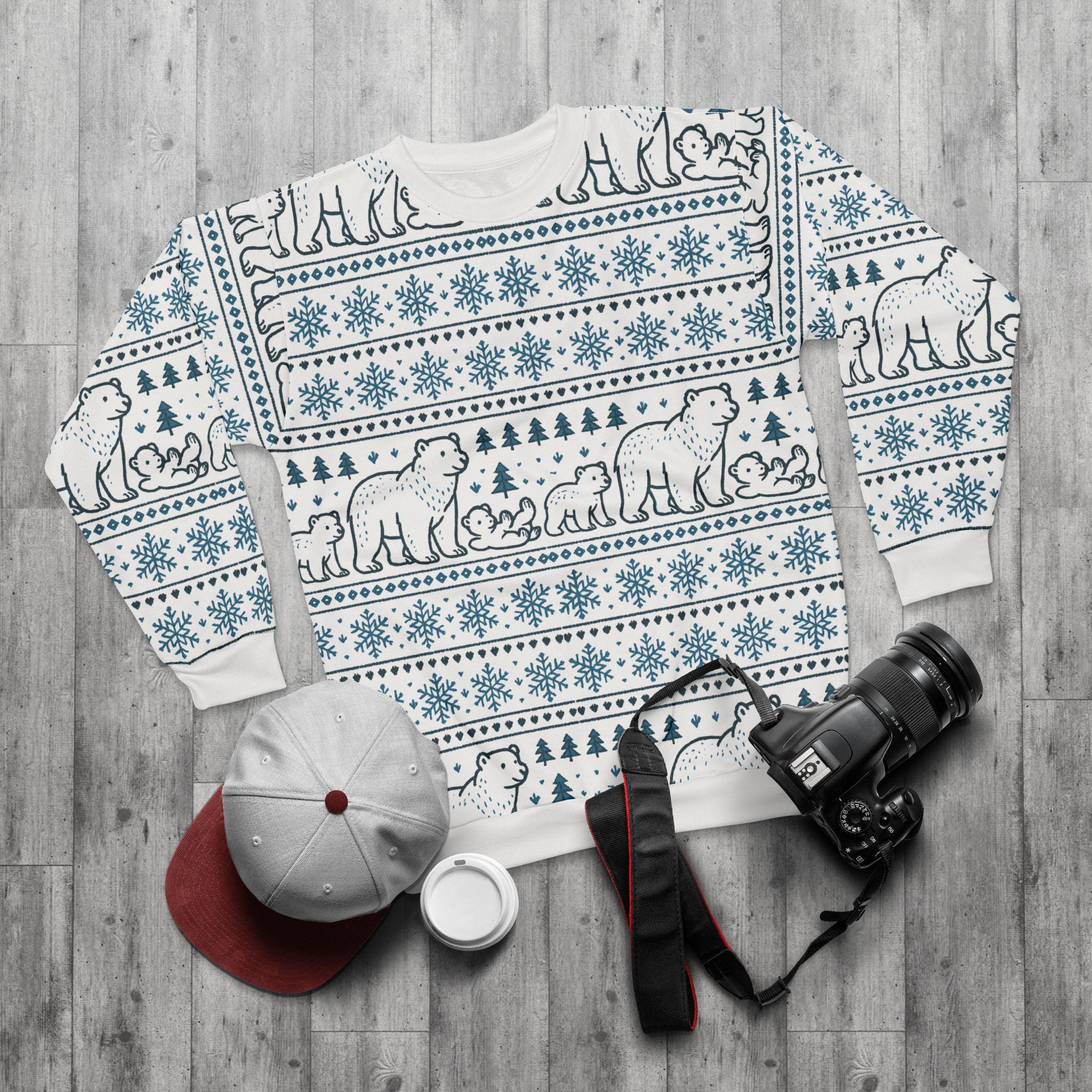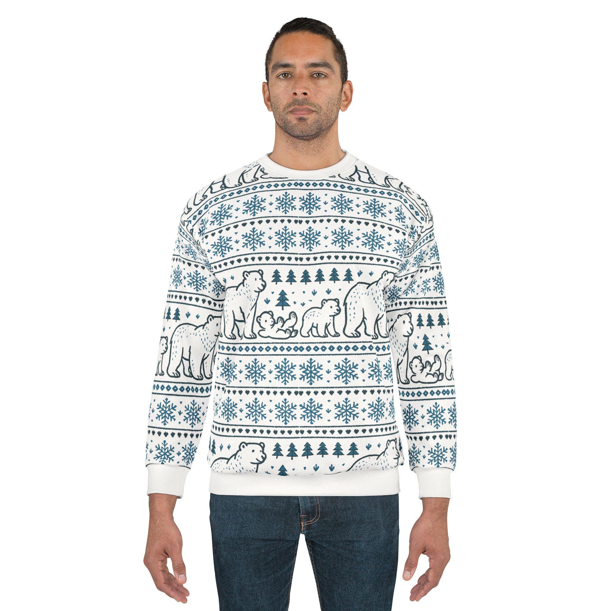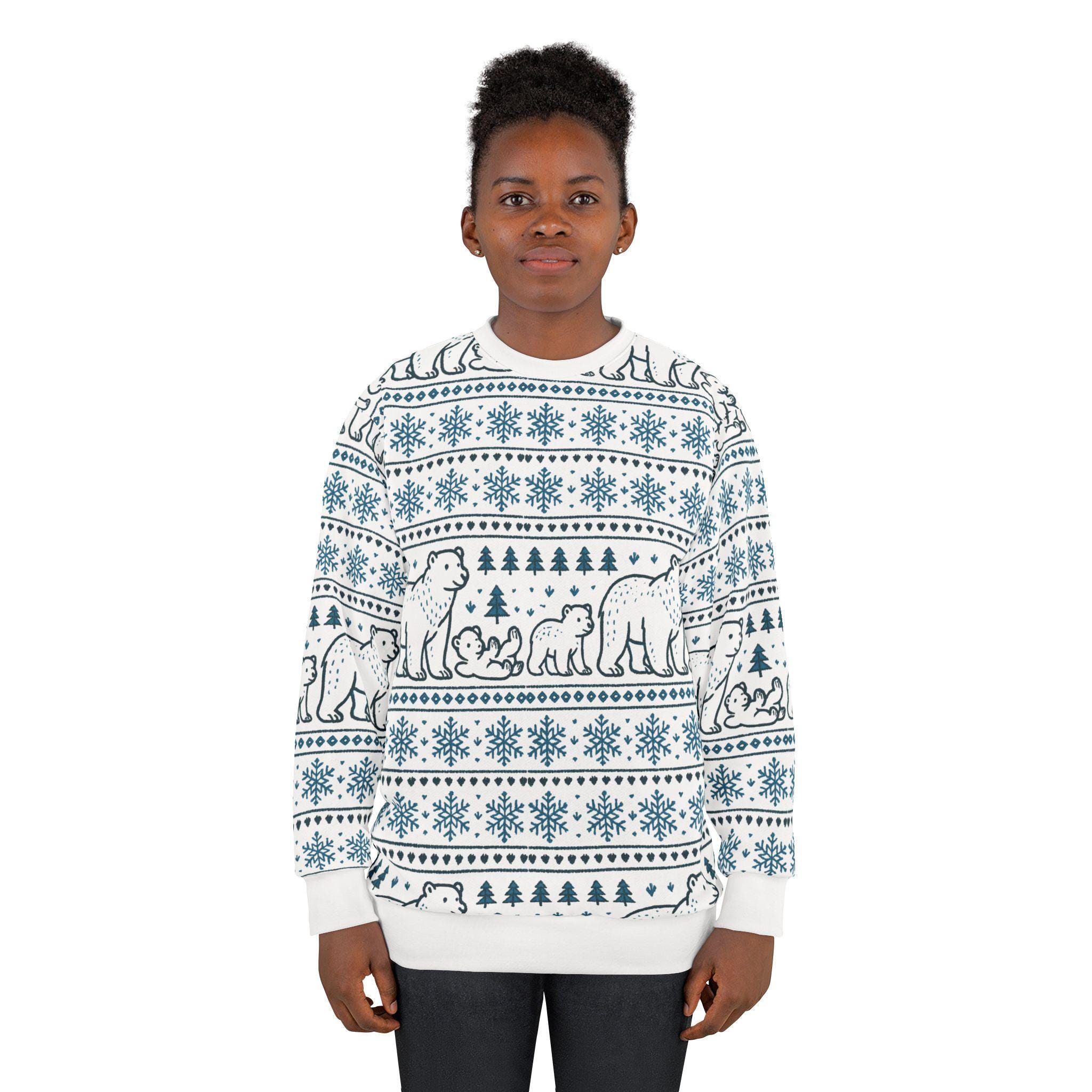 Wrap yourself in a quiet arctic evening with this cozy sweater featuring a tender polar bear and cubs winter pattern. Soft, cloud-like polyester holds the scene in vivid, all-over color — frosty blues, ivory fur, and warm glows around the family — so every glance feels like a small, calming story. It sits comfortably at the crew neck and falls in a relaxed, classic fit, making it easy to layer over a tee or wear alone while sipping something hot by a frosted window. The ribbed-knit collar and cuffs stretch and bounce back, keeping the silhouette neat through many wears. Whether you’re heading out for a peaceful winter walk, settling in for a movie night, or gifting a quiet moment of comfort to someone who loves wildlife, this sweater brings a gentle, nature-first presence to everyday life.
