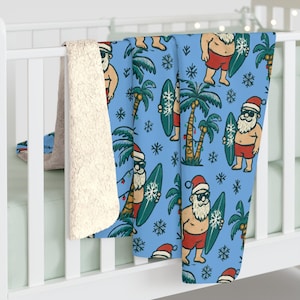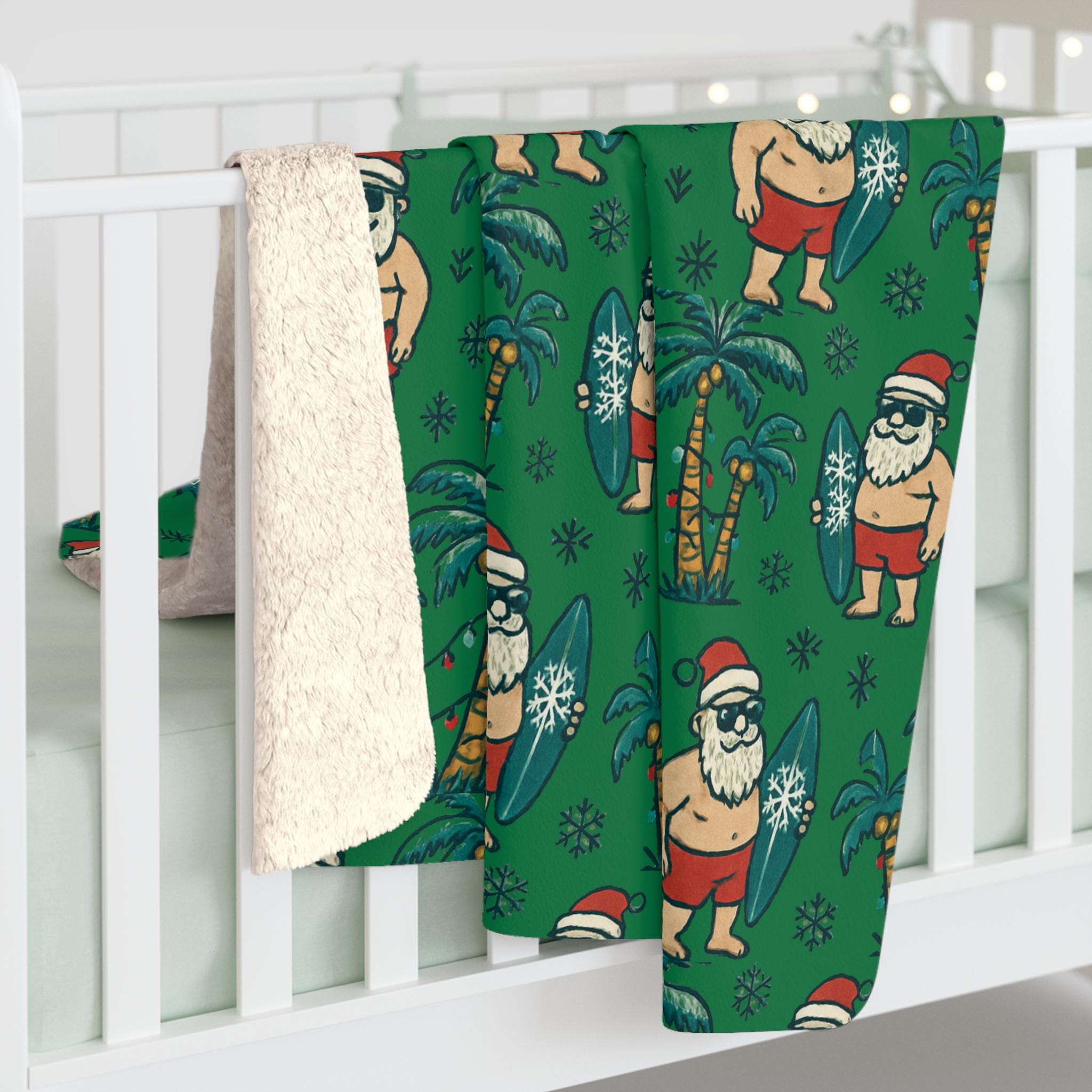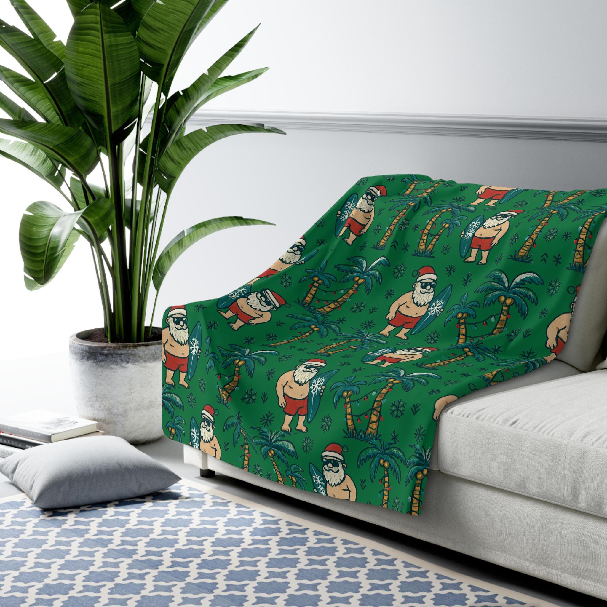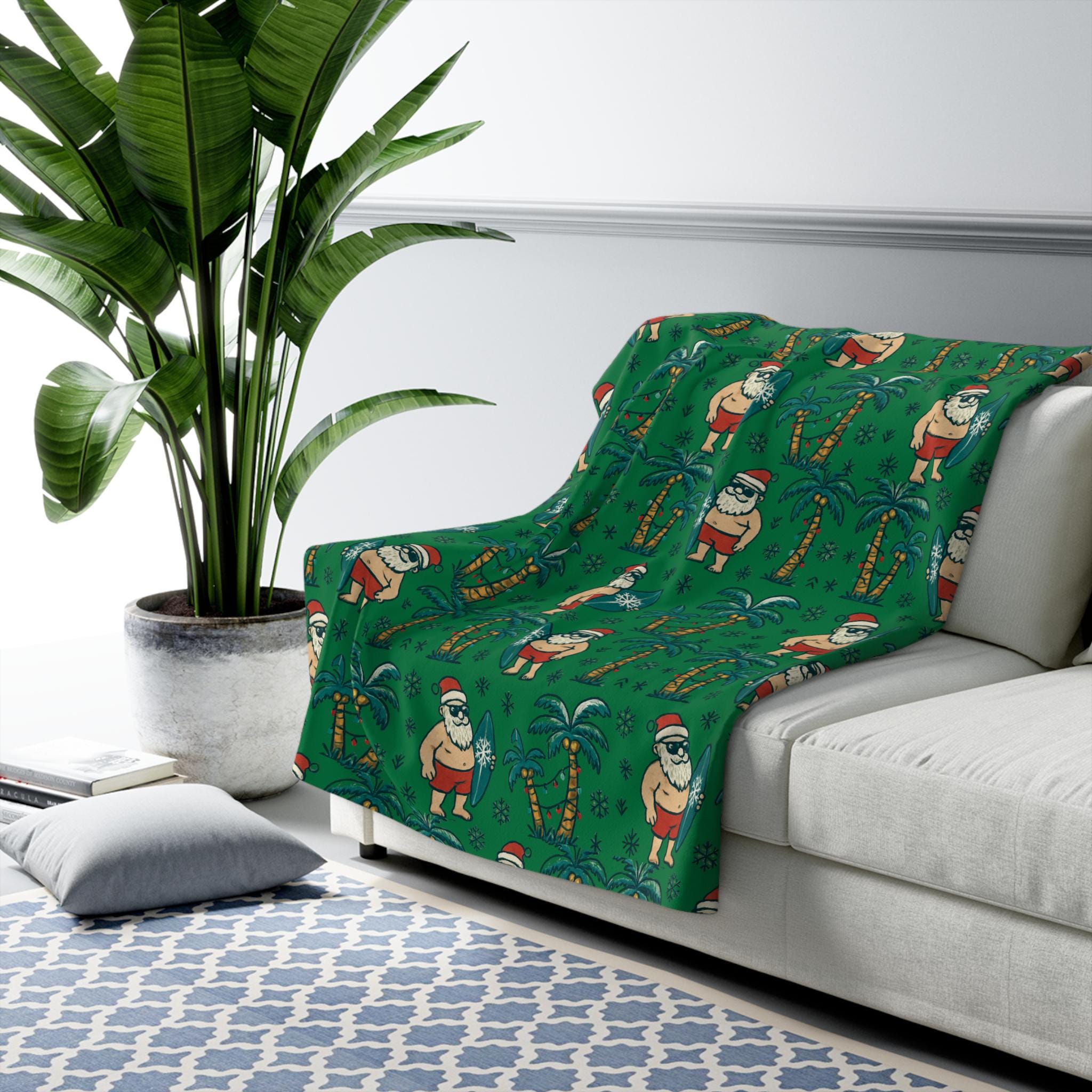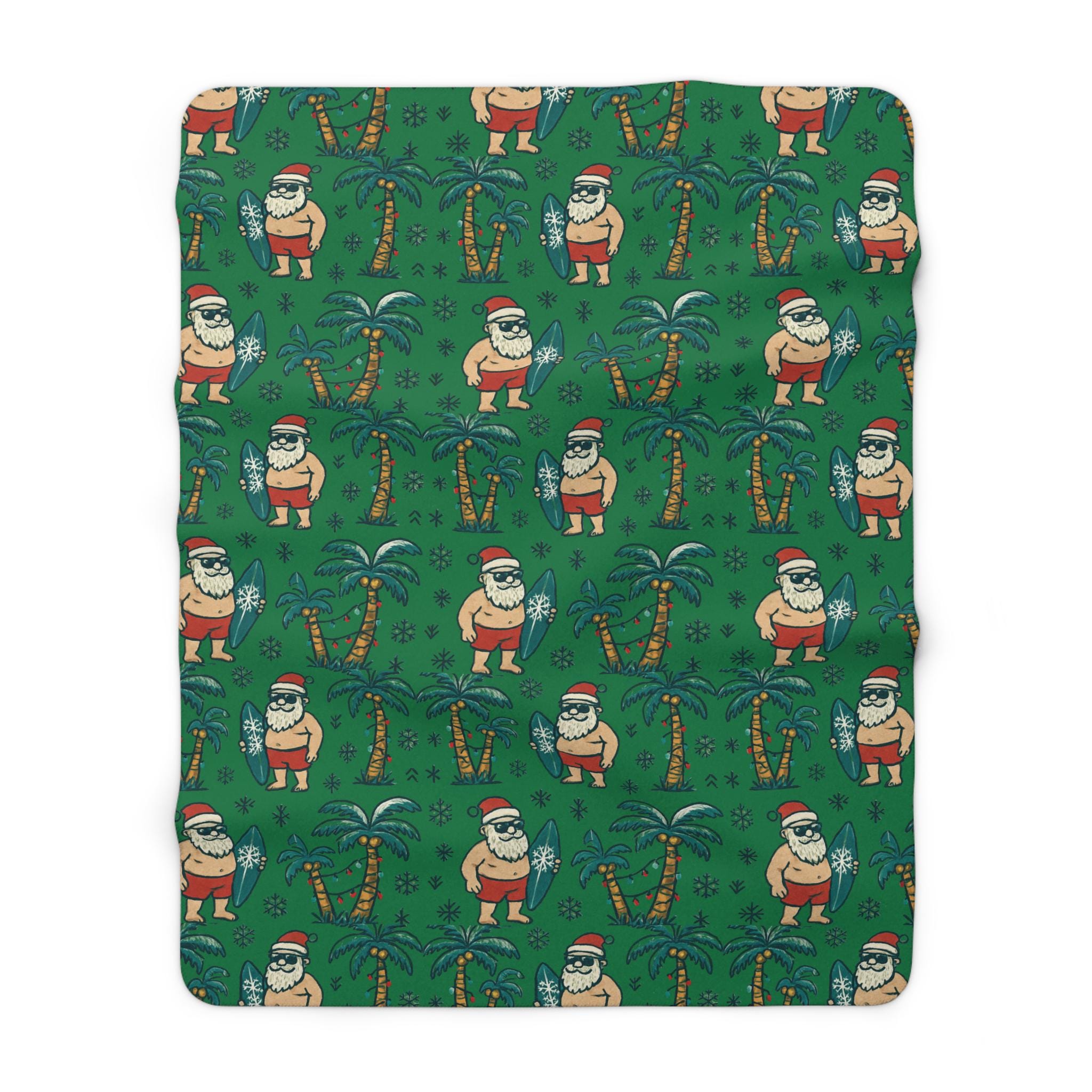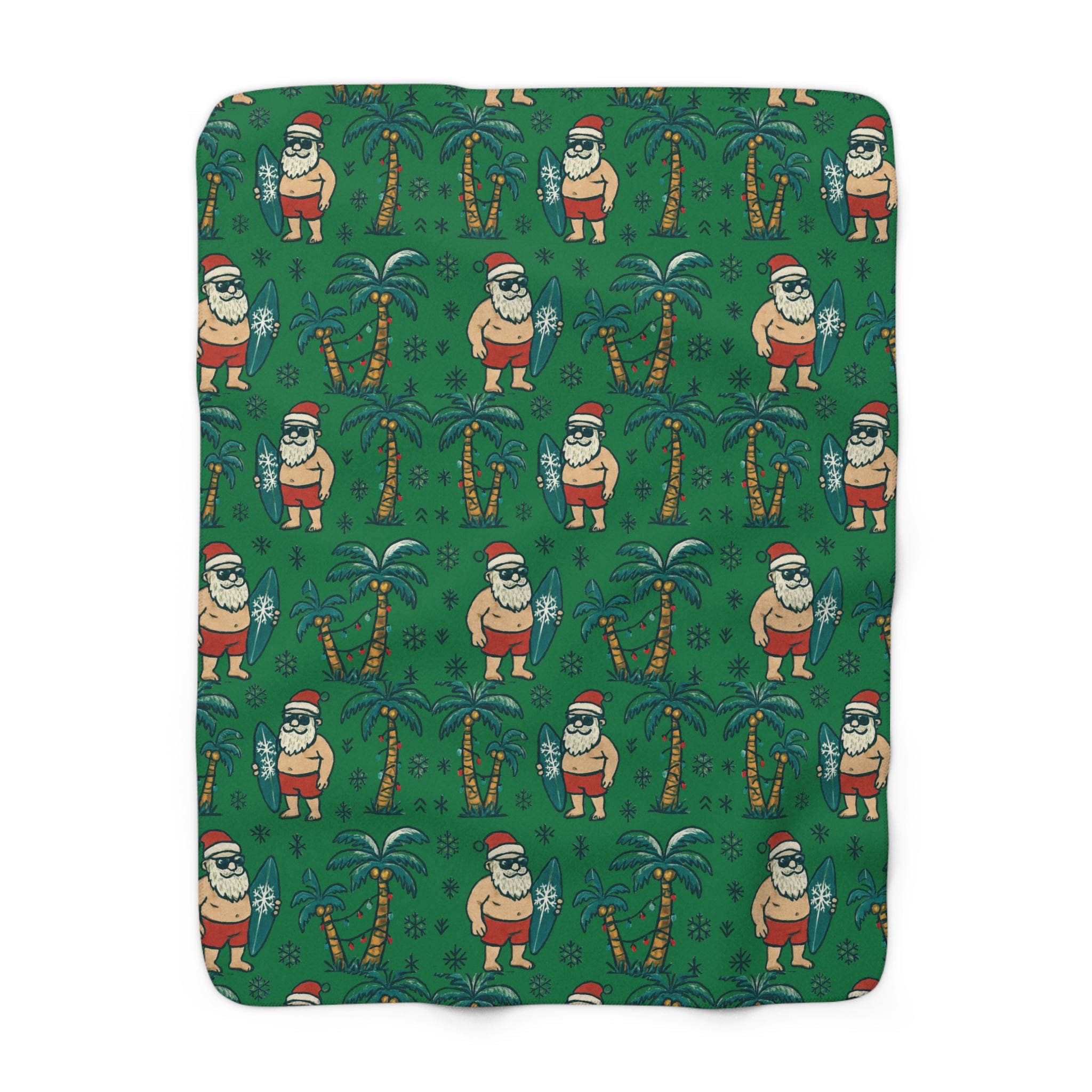 Imagine curling up under a blanket that smells like salt air and tinsel—Santa trading sleigh bells for surfboards, palm trees wrapped in twinkling lights. This sherpa fleece blanket brings that warm, playful holiday mood into quiet mornings and late-night movie marathons. It drapes easily over a sofa or beach chair, adding a burst of tropical cheer to a winter night. For adults who love seasonal whimsy and coastal vibes, it turns ordinary evenings into a small celebration of sun, sand, and holiday sparkle. - Color - Green