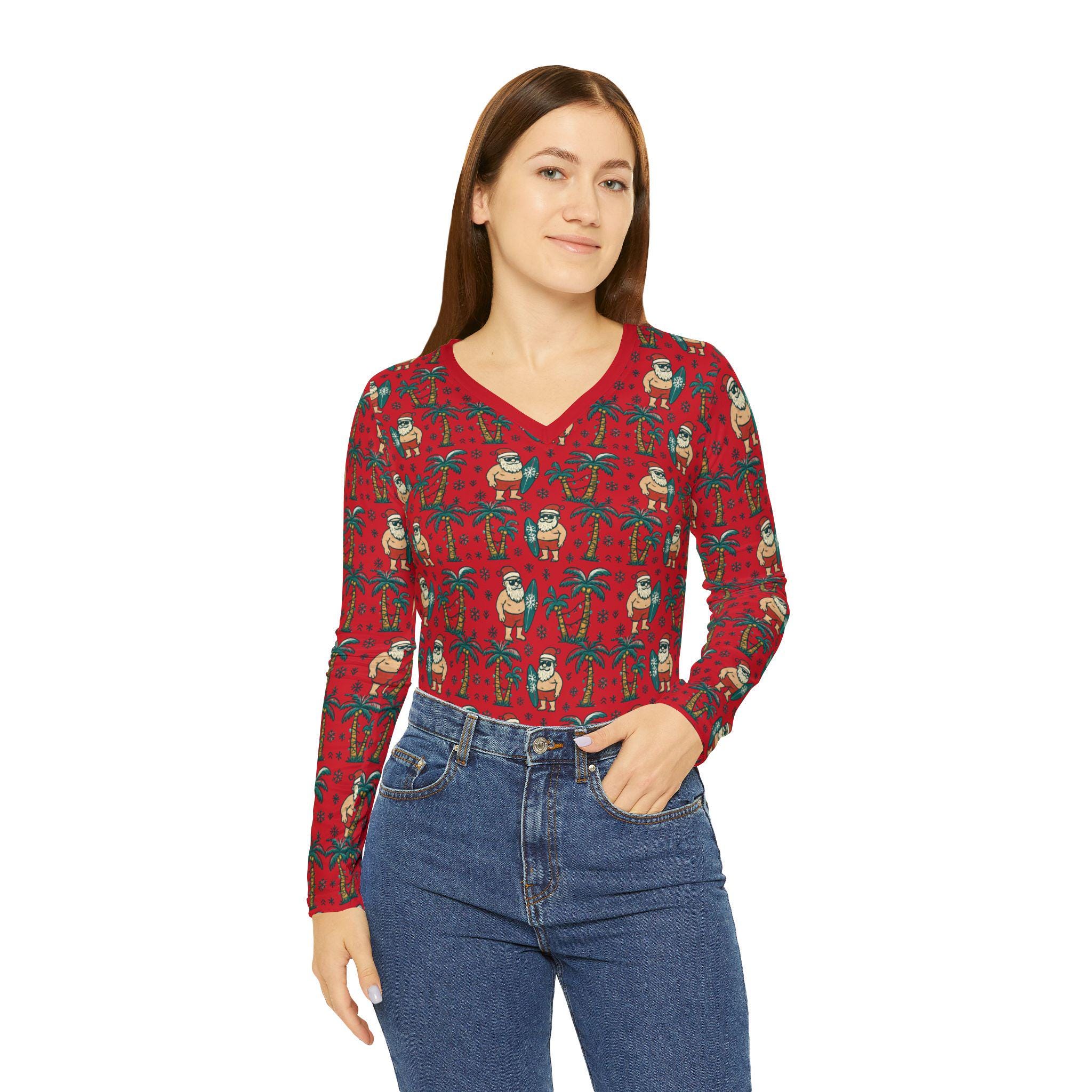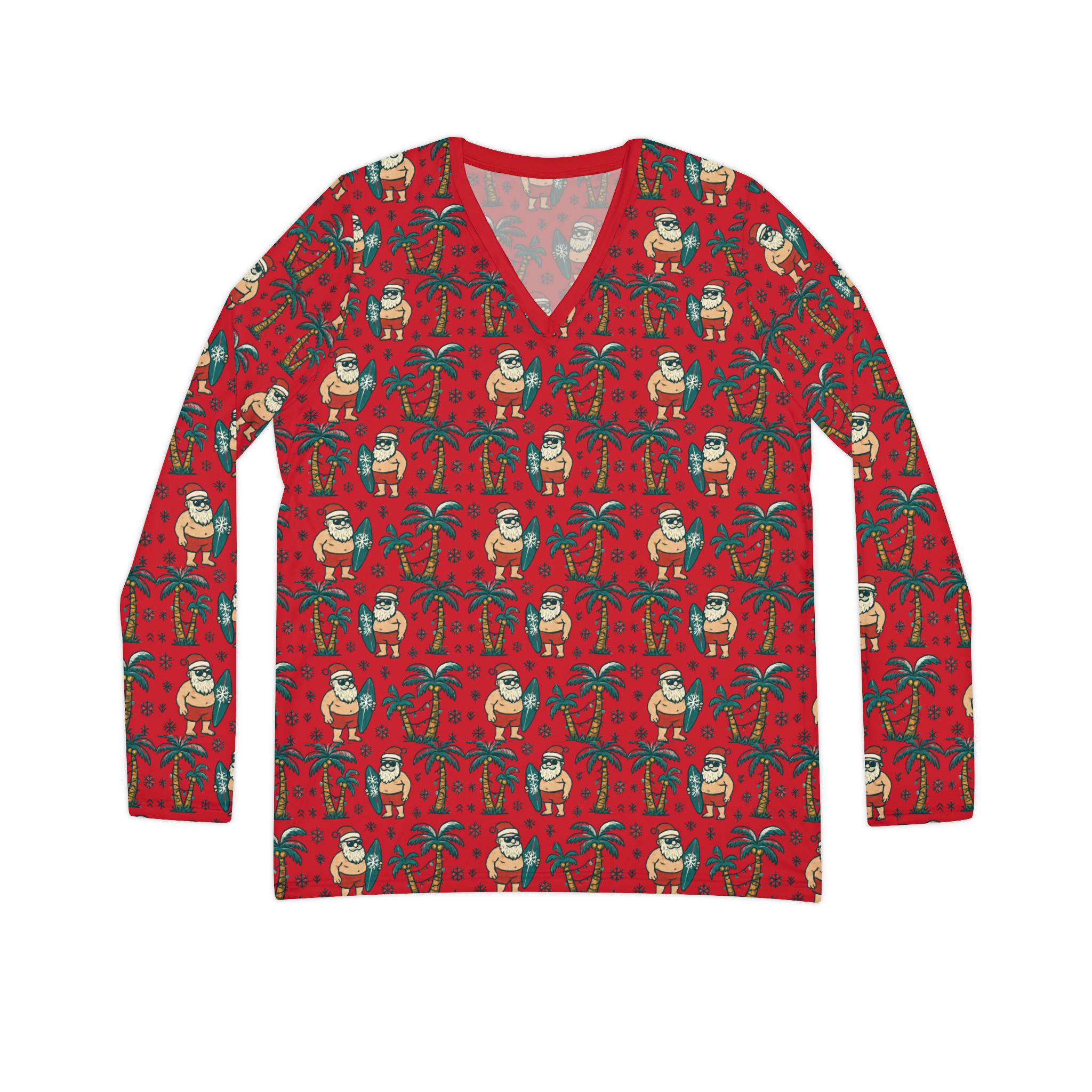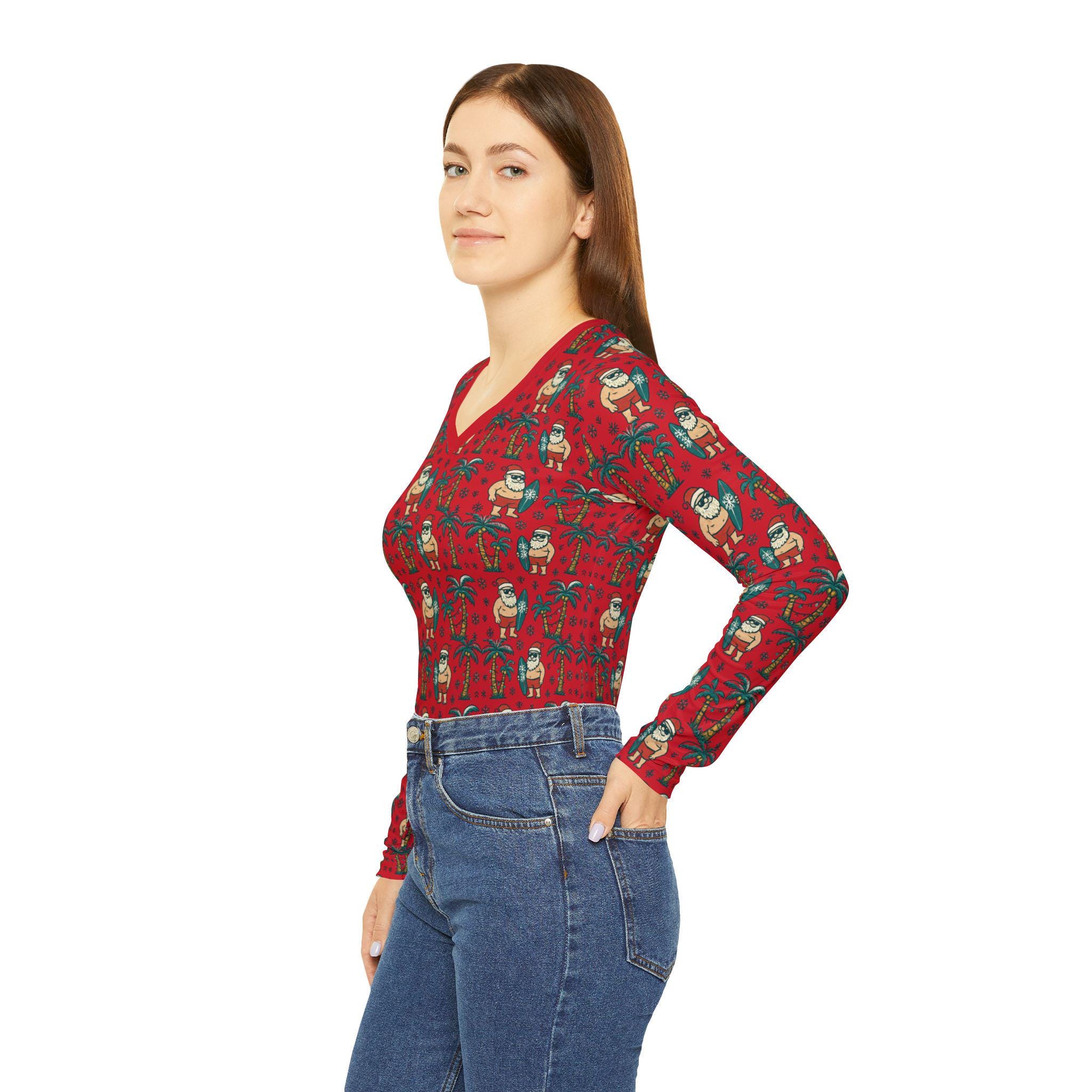 Sunlight, salt air, and string lights — this long sleeve V-neck brings a cheeky tropical twist to holiday wardrobes. A surfing Santa rides slow, warm waves while palm trees blink with colorful lights. Slip it on for evenings around a tiki torch, laid-back caroling on the beach, or when you want to trade snow boots for flip-flops in your mind. The lightweight knit drapes easily, moves with you, and keeps the mood breezy and bright. It feels like a holiday postcard you can wear: playful, warm, and full of seaside cheer.