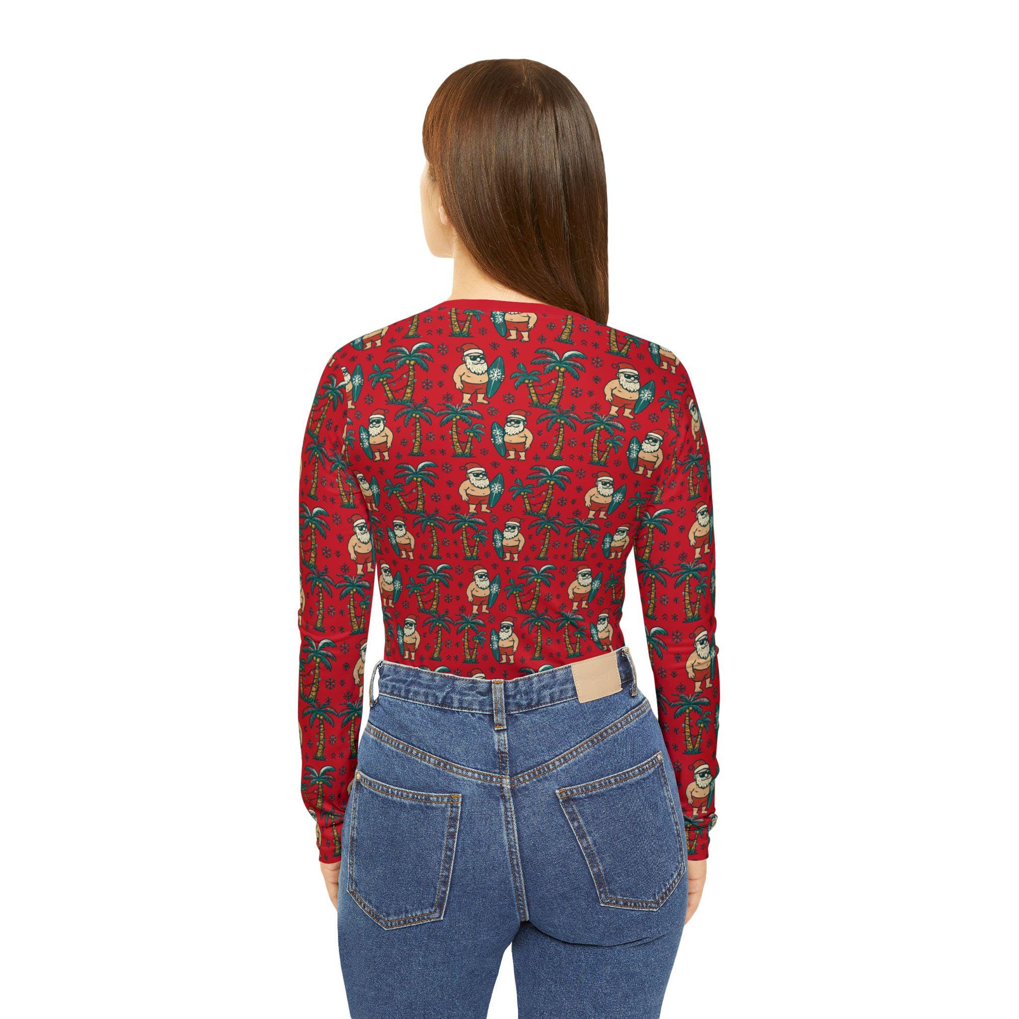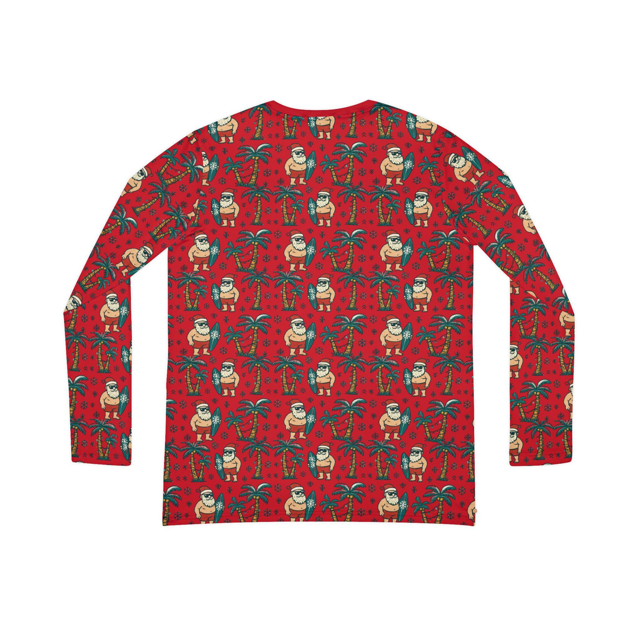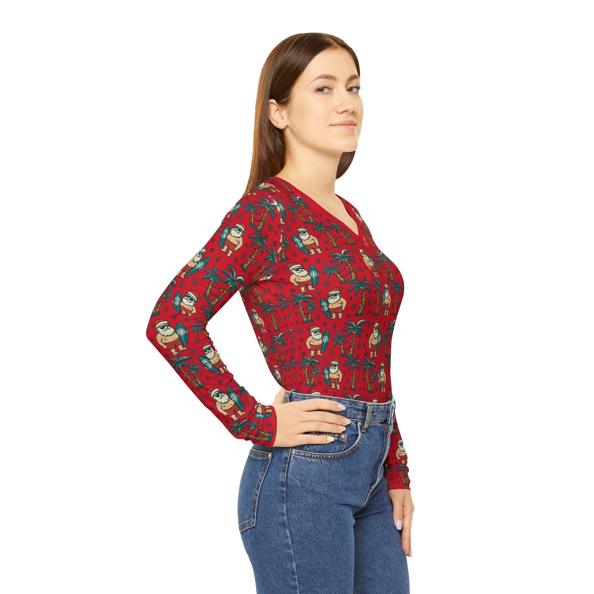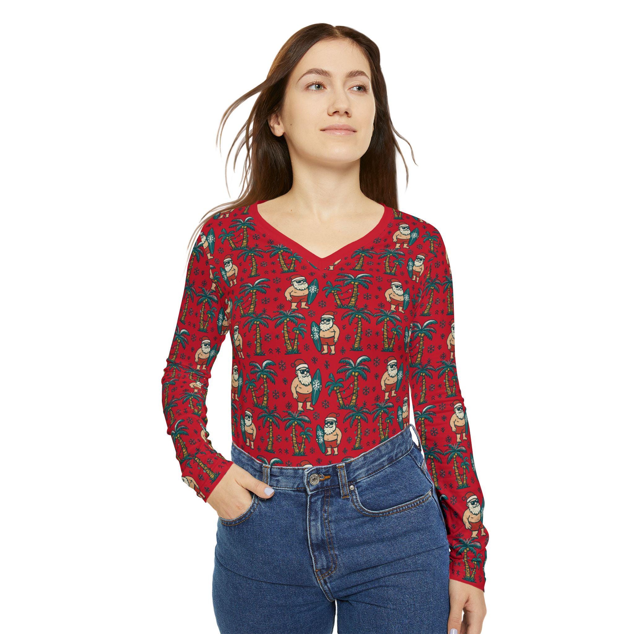 Sunlight, salt air, and string lights — this long sleeve V-neck brings a cheeky tropical twist to holiday wardrobes. A surfing Santa rides slow, warm waves while palm trees blink with colorful lights. Slip it on for evenings around a tiki torch, laid-back caroling on the beach, or when you want to trade snow boots for flip-flops in your mind. The lightweight knit drapes easily, moves with you, and keeps the mood breezy and bright. It feels like a holiday postcard you can wear: playful, warm, and full of seaside cheer.