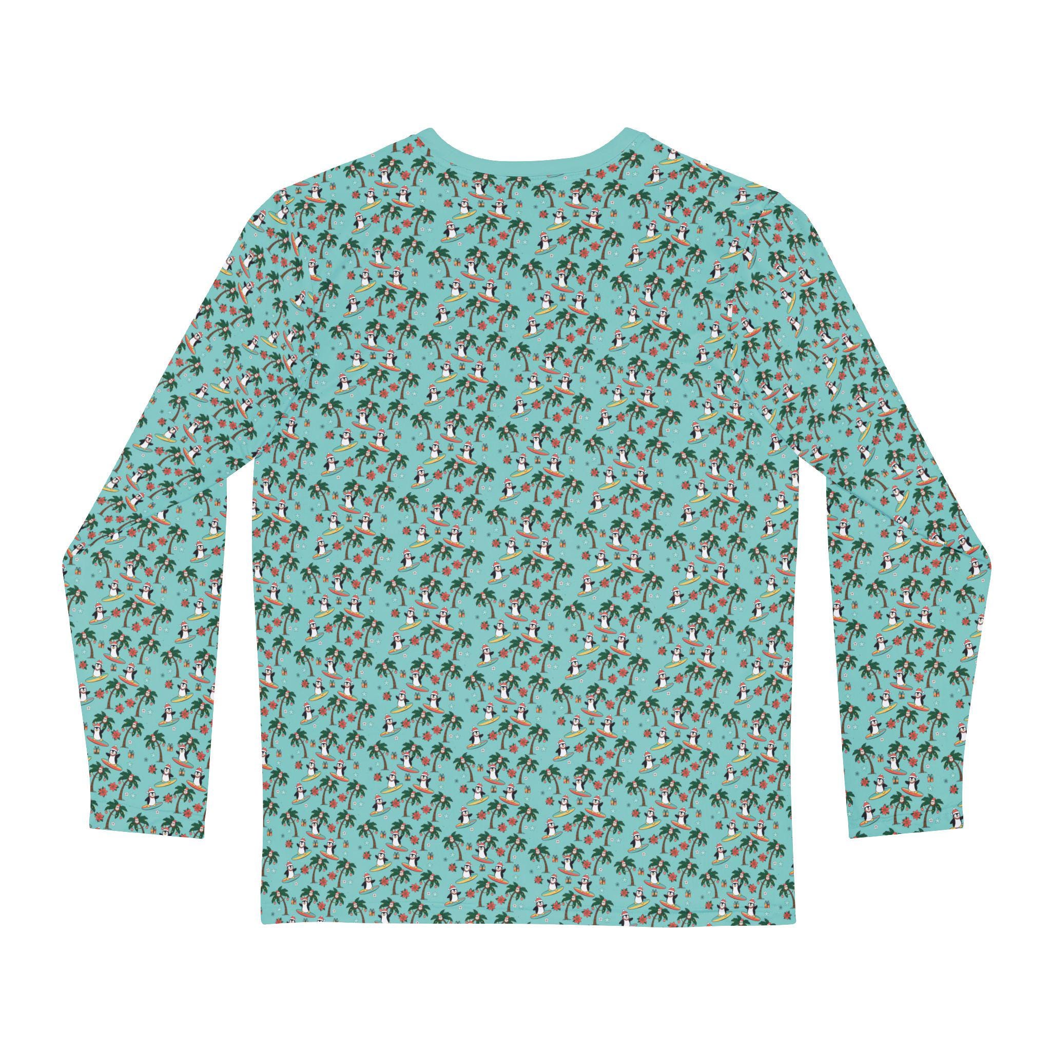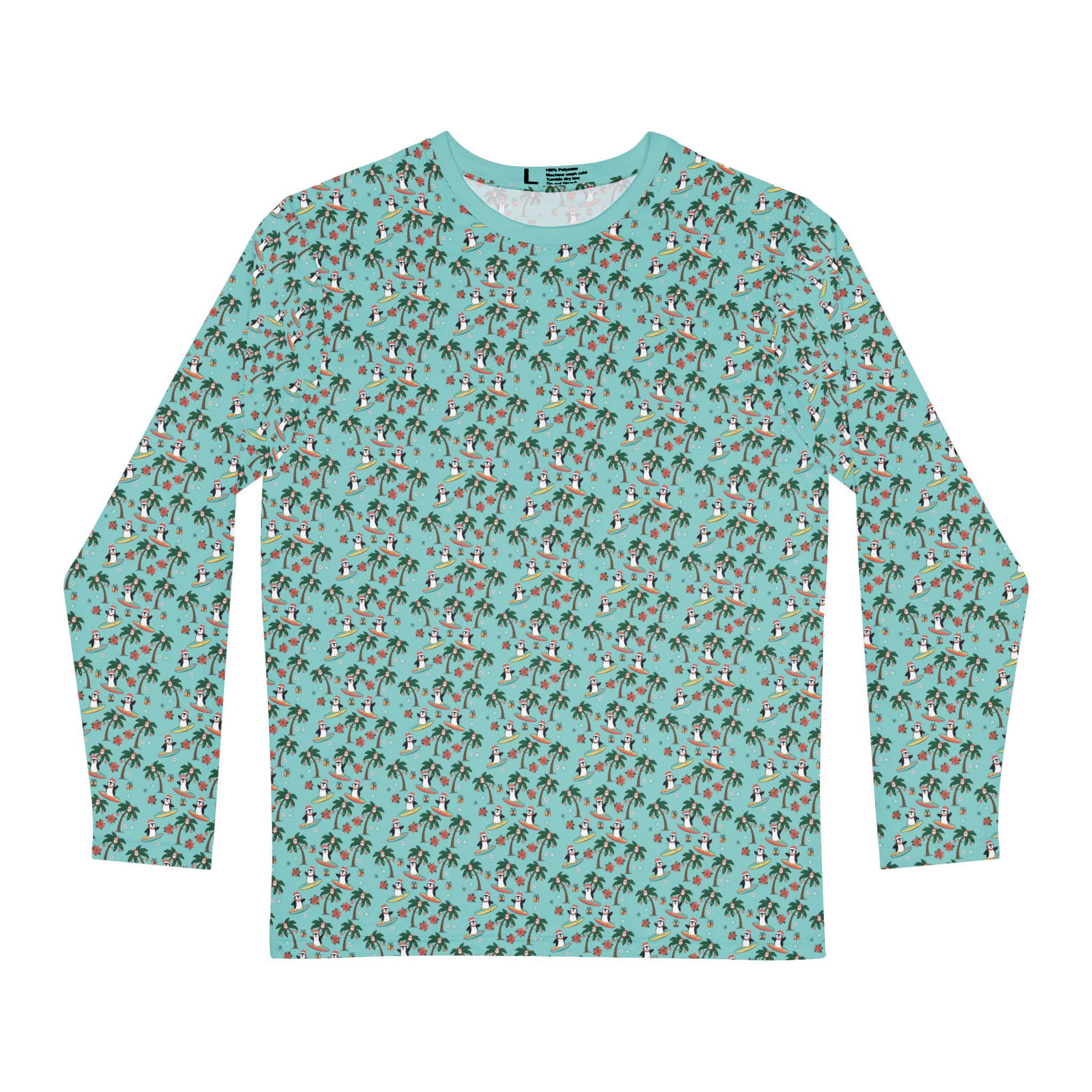 A playful, sun-soaked long sleeve that brings a tropical twist to holiday cheer. Imagine a little beachside chaos: penguins carving waves on surfboards, coconuts dressed in Santa hats, and palm trees strung with twinkling lights. Starfish, wrapped presents and bright poinsettias peek through the sand, turning cold-weather traditions into a warm, silly scene. This shirt lives in the moments between family laughs and barefoot walks on warm decks — worn while wrapping gifts with a soundtrack of crashing waves, or at a laid-back holiday party where island beats replace carols. It speaks to people who mix seasons with a wink: salt on their skin, tinsel in their hair, and a fondness for holiday humor that doesn’t take itself seriously.