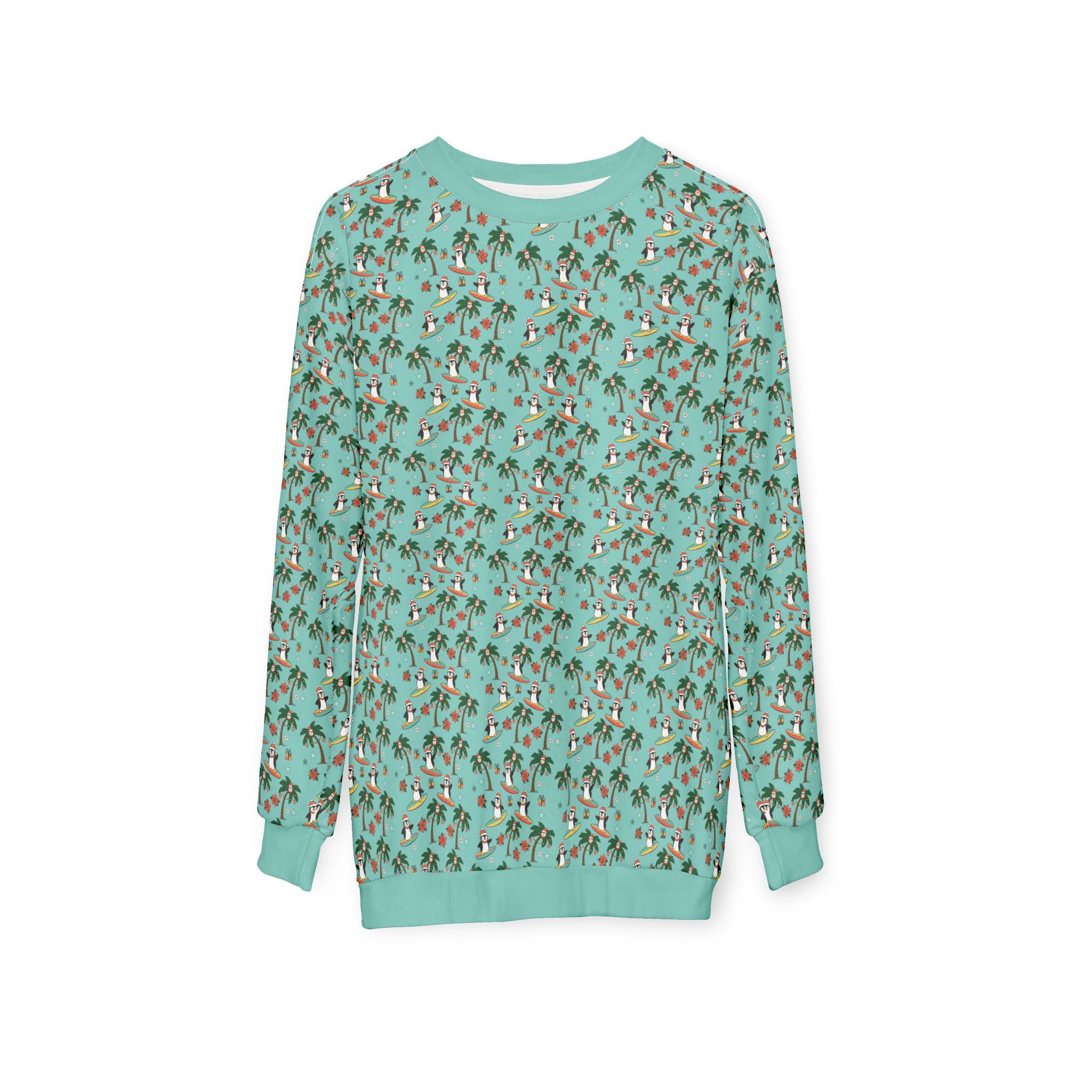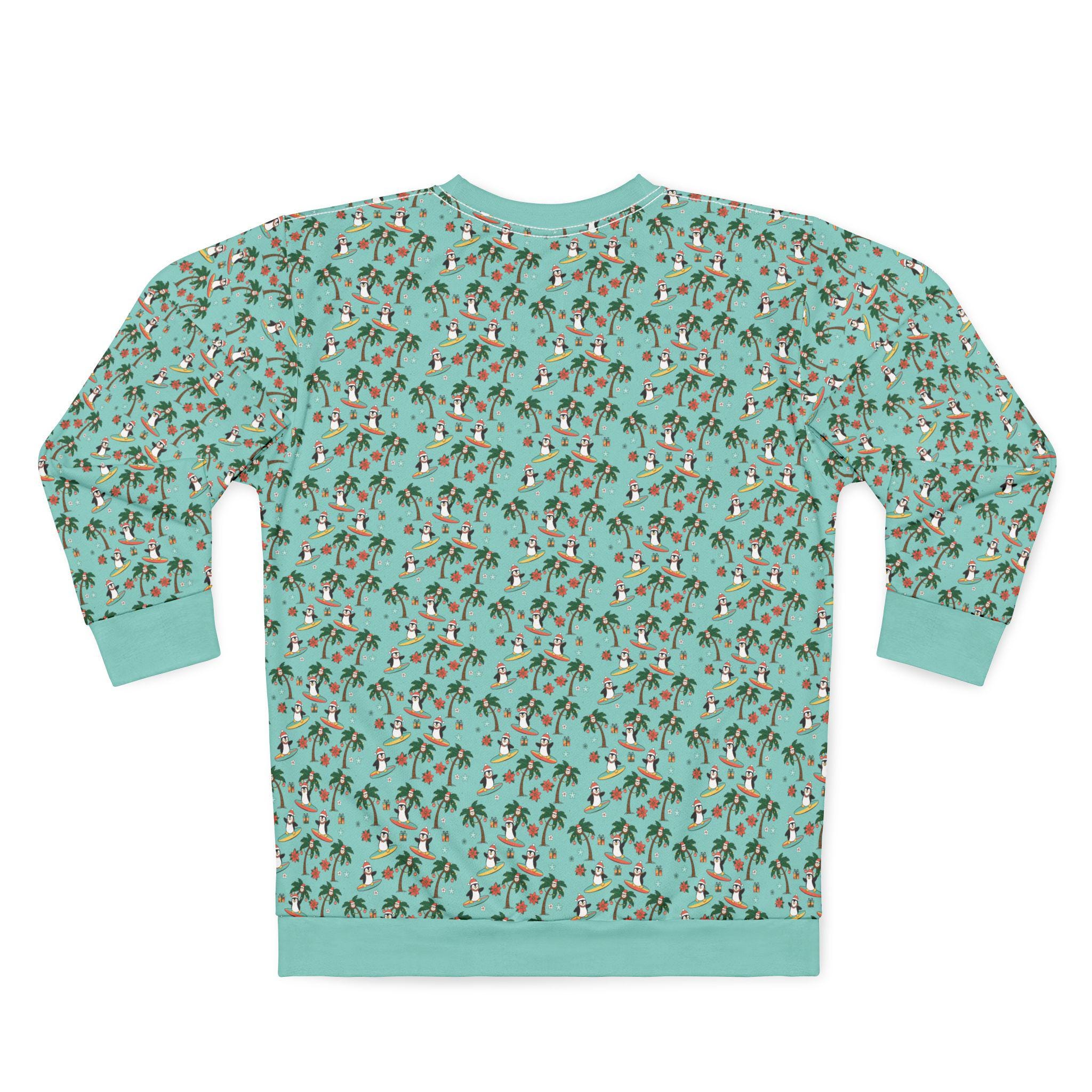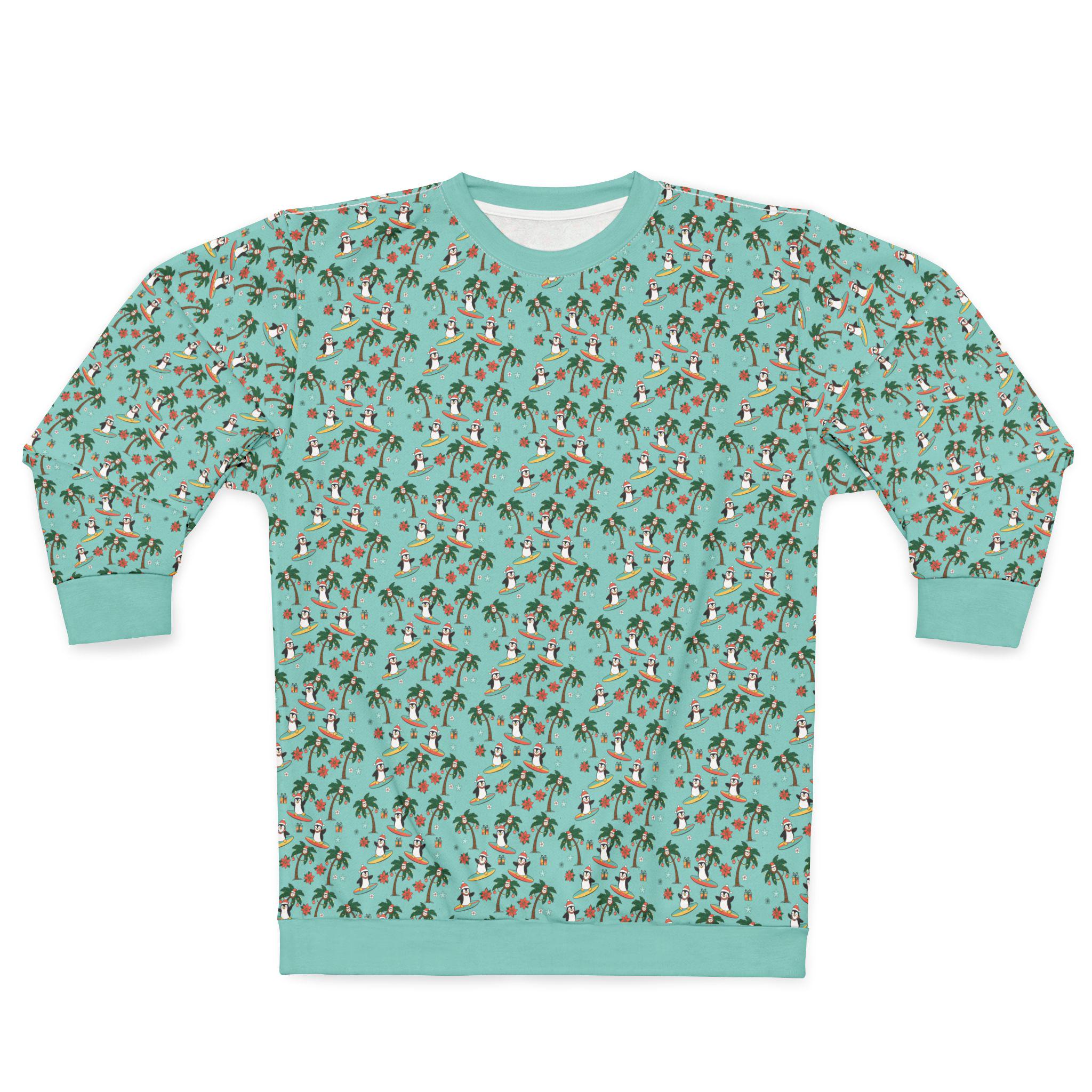 Bring a little island mischief to winter mornings with this cozy crewneck. Playful penguins surf beneath swaying palms, smiling Christmas coconuts while starfish, wrapped presents and poinsettia accents nod to the season. The bright, all-over print keeps the scene bold from edge to edge, so every glance sparks a smile and a memory of sunlit sand meeting frosty air. Wear it on chilly beach strolls, at laid-back holiday parties, or while decorating the tree with a tropical twist — it fits right into the life of someone who mixes seaside cheer with seasonal traditions.