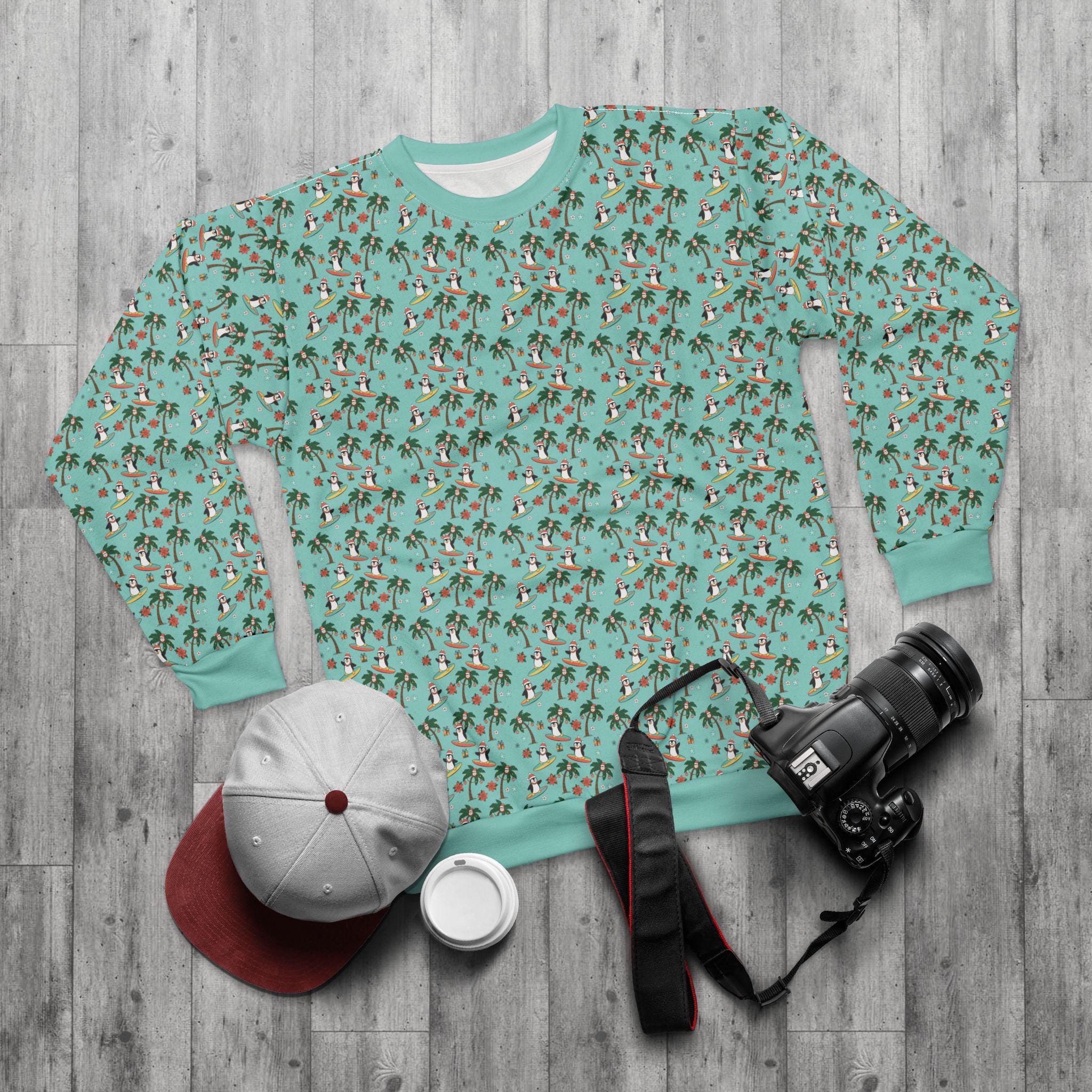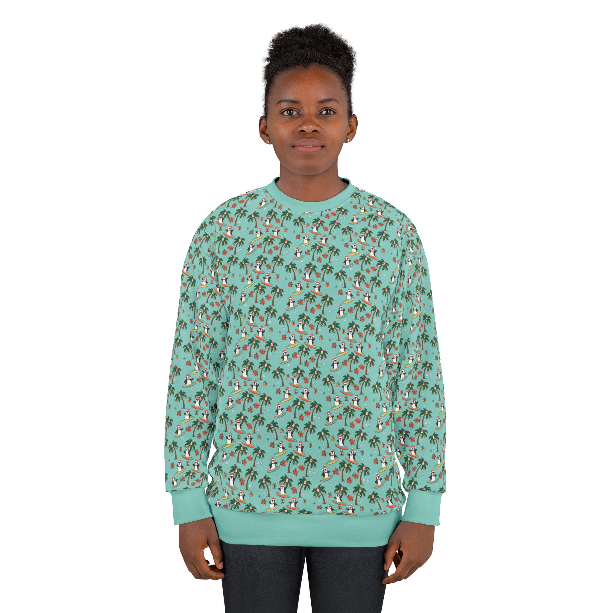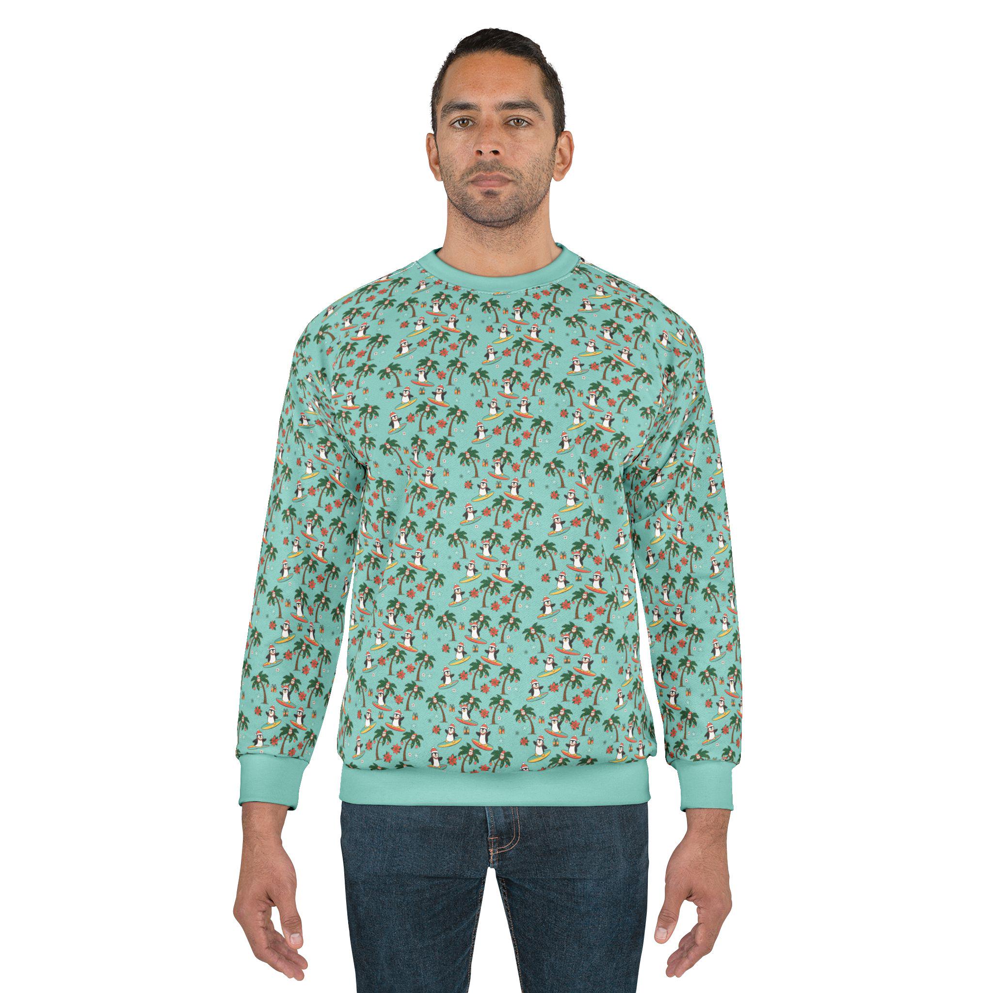 Bring a little island mischief to winter mornings with this cozy crewneck. Playful penguins surf beneath swaying palms, smiling Christmas coconuts while starfish, wrapped presents and poinsettia accents nod to the season. The bright, all-over print keeps the scene bold from edge to edge, so every glance sparks a smile and a memory of sunlit sand meeting frosty air. Wear it on chilly beach strolls, at laid-back holiday parties, or while decorating the tree with a tropical twist — it fits right into the life of someone who mixes seaside cheer with seasonal traditions.