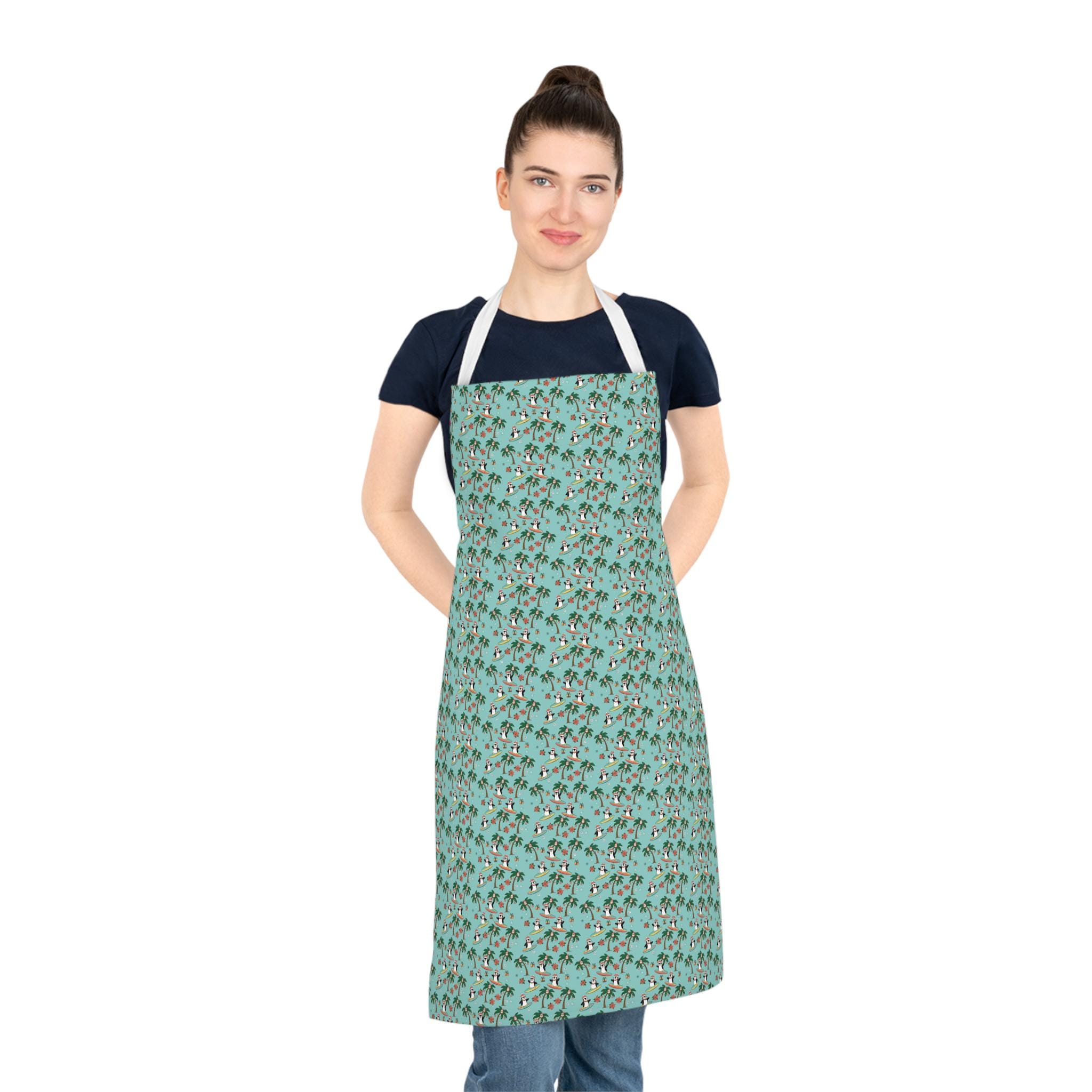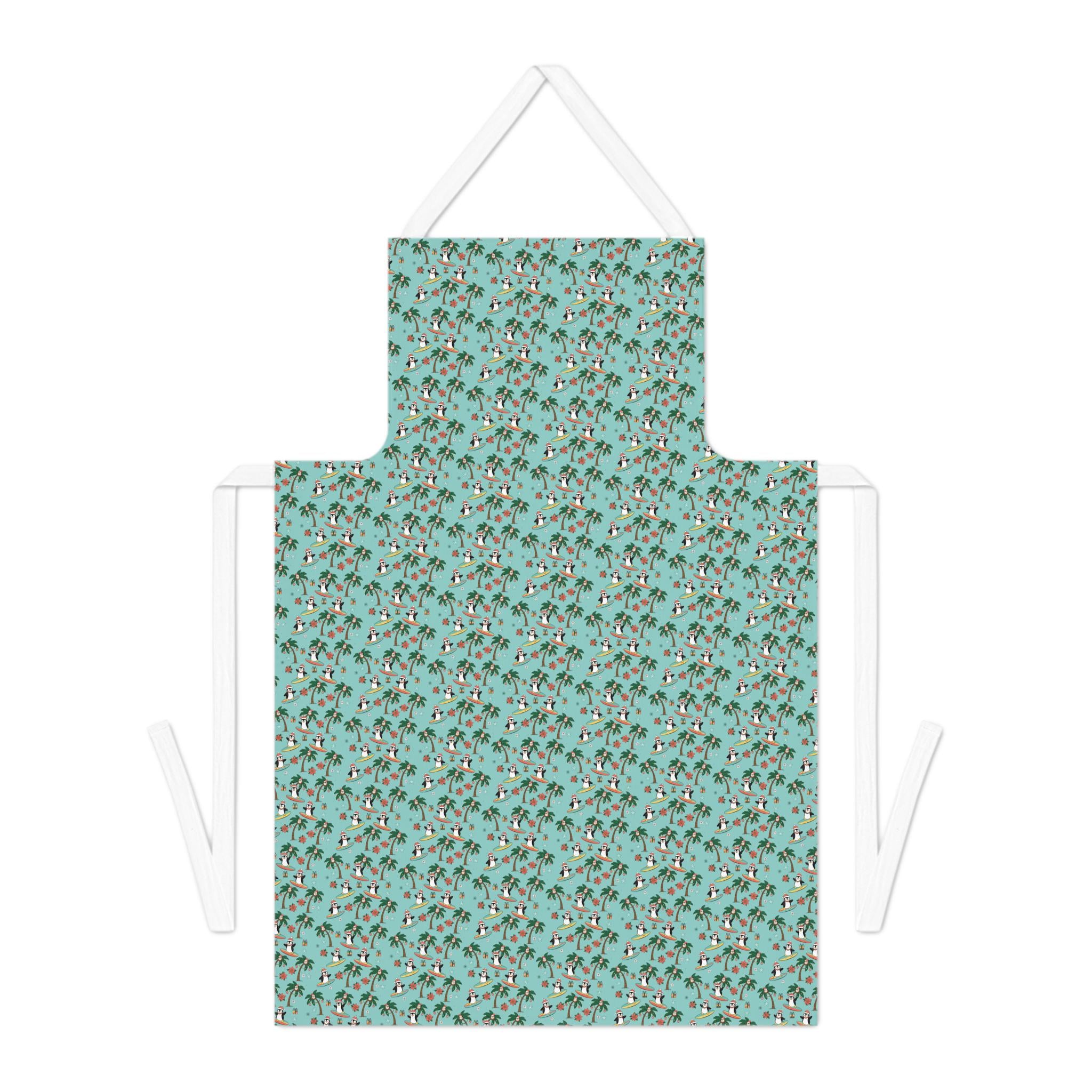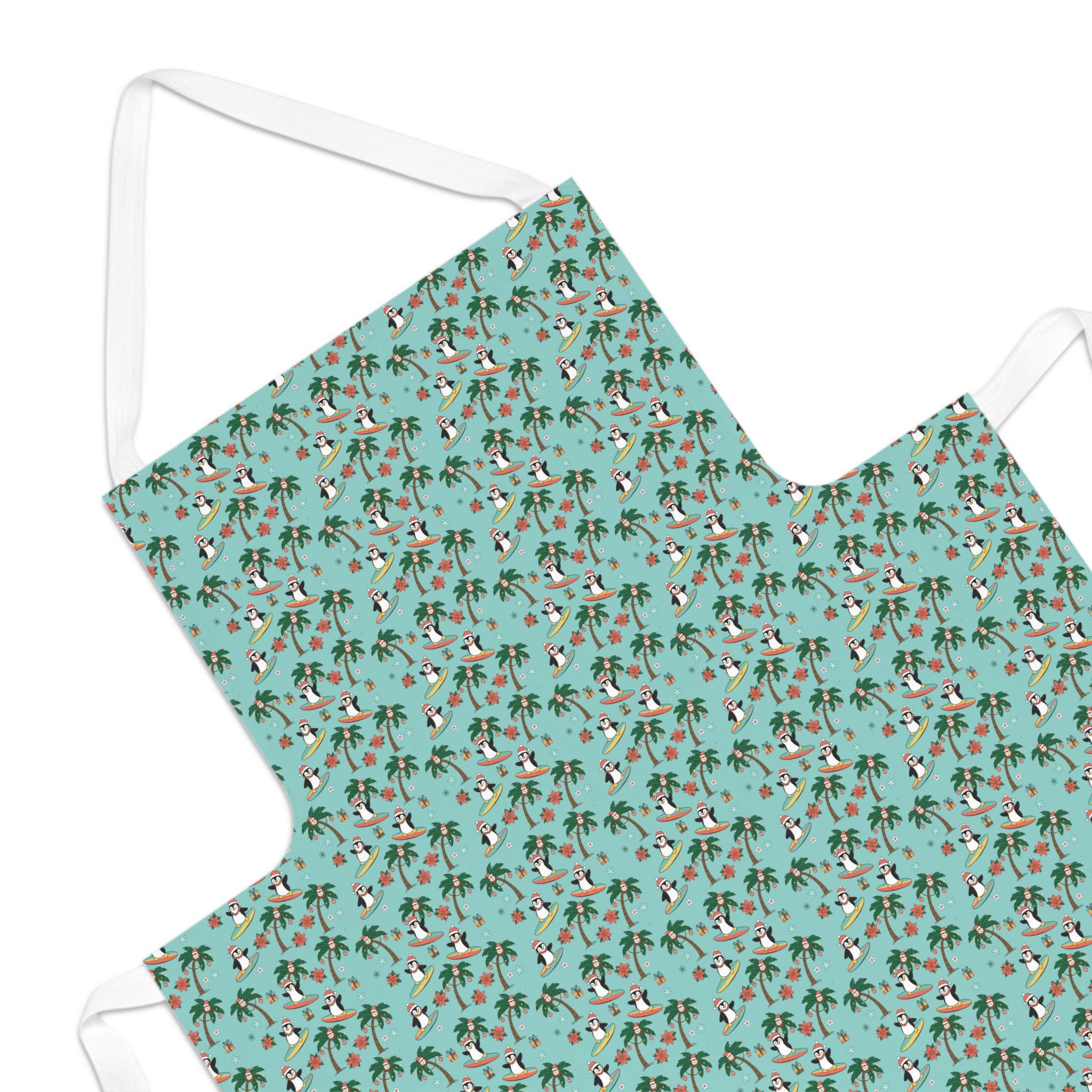 Bring a sun-soaked holiday to the kitchen with this playful adult apron featuring surfing penguins, coconut Christmas ornaments, and swaying palm trees. Bright starfish, wrapped presents, and poinsettias peek through the scene, turning everyday cooking into a mini beach celebration. Lightweight and breathable, the apron moves with you while keeping messy moments contained, and the cheerful print adds a relaxed, festive note to cookie-baking mornings or laid-back holiday brunches. The single-sided, vibrant design reads like a postcard from a warm-climate Christmas — fun, nostalgic, and a little bit unexpected.