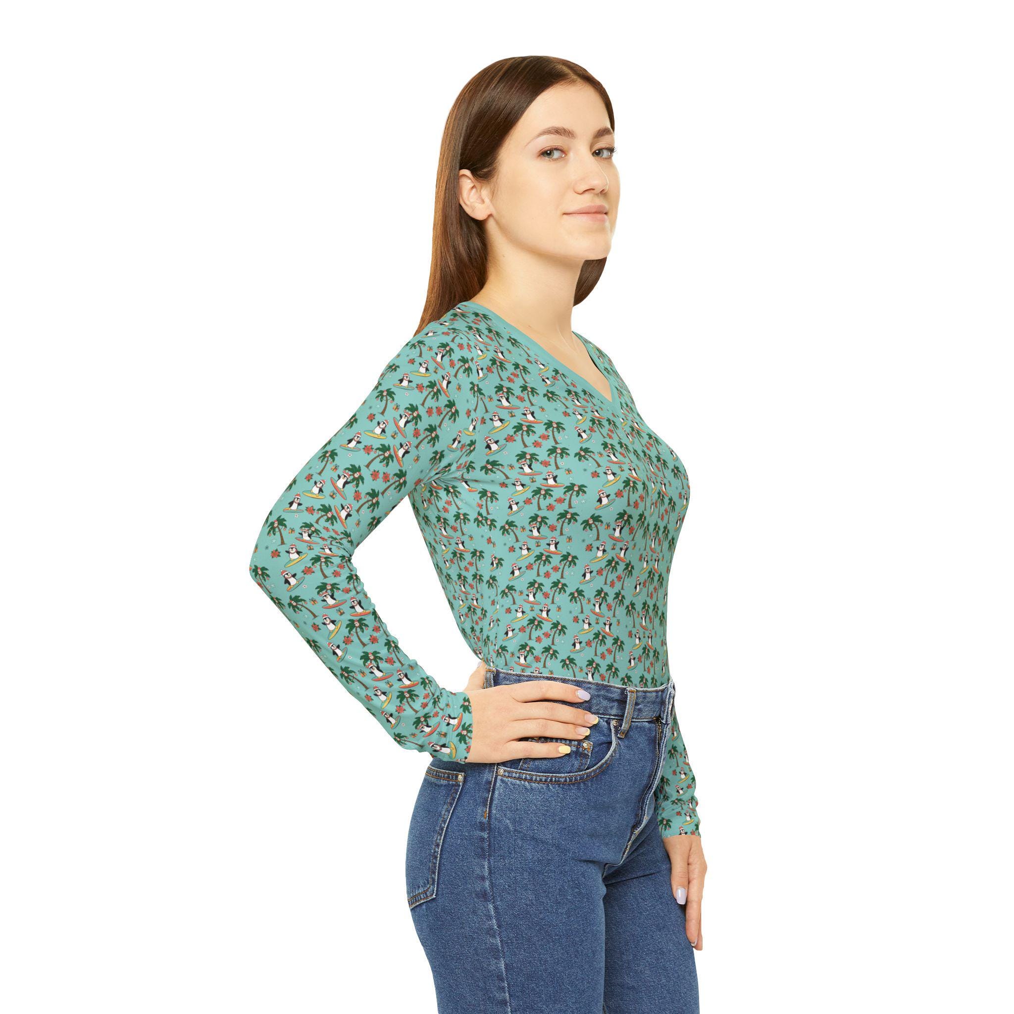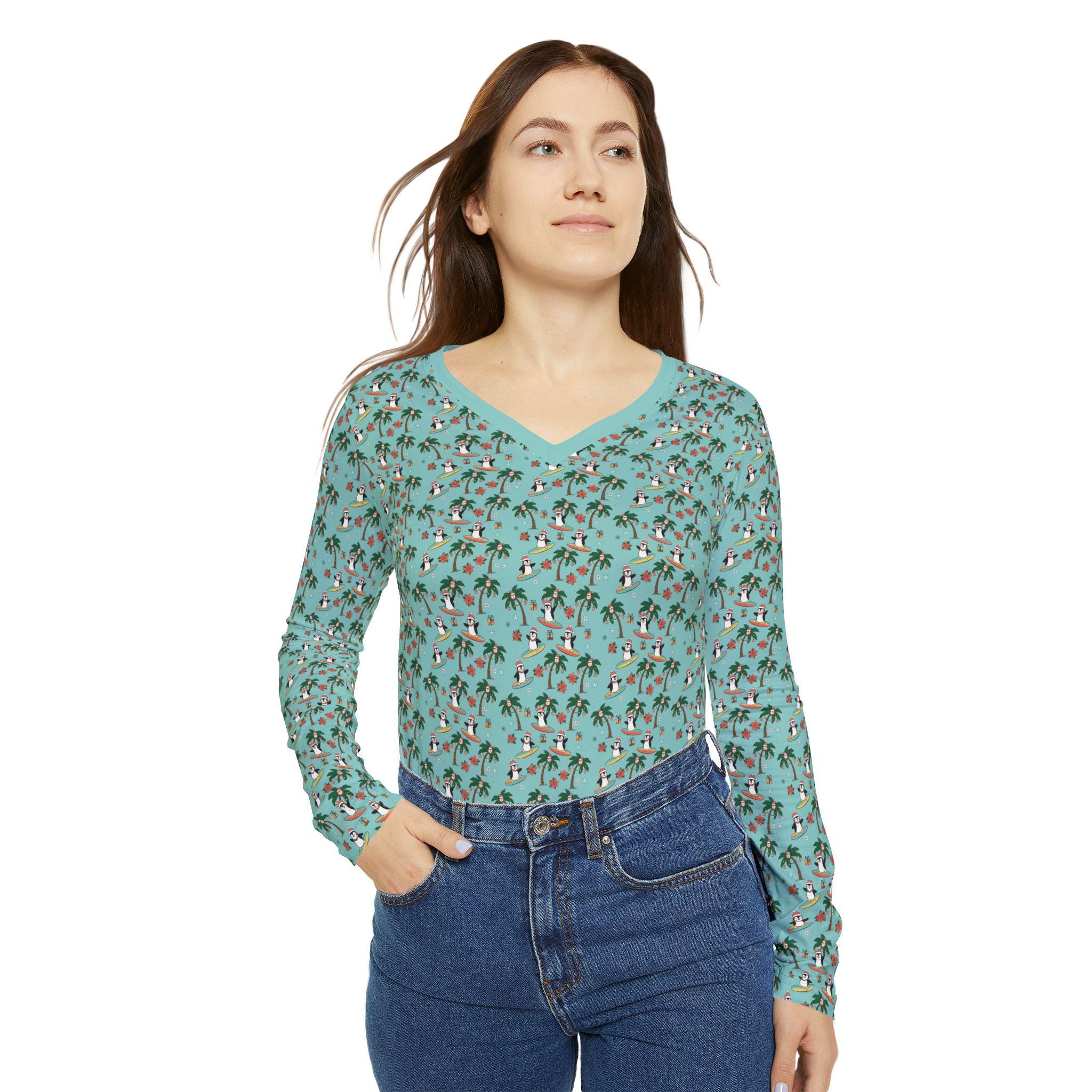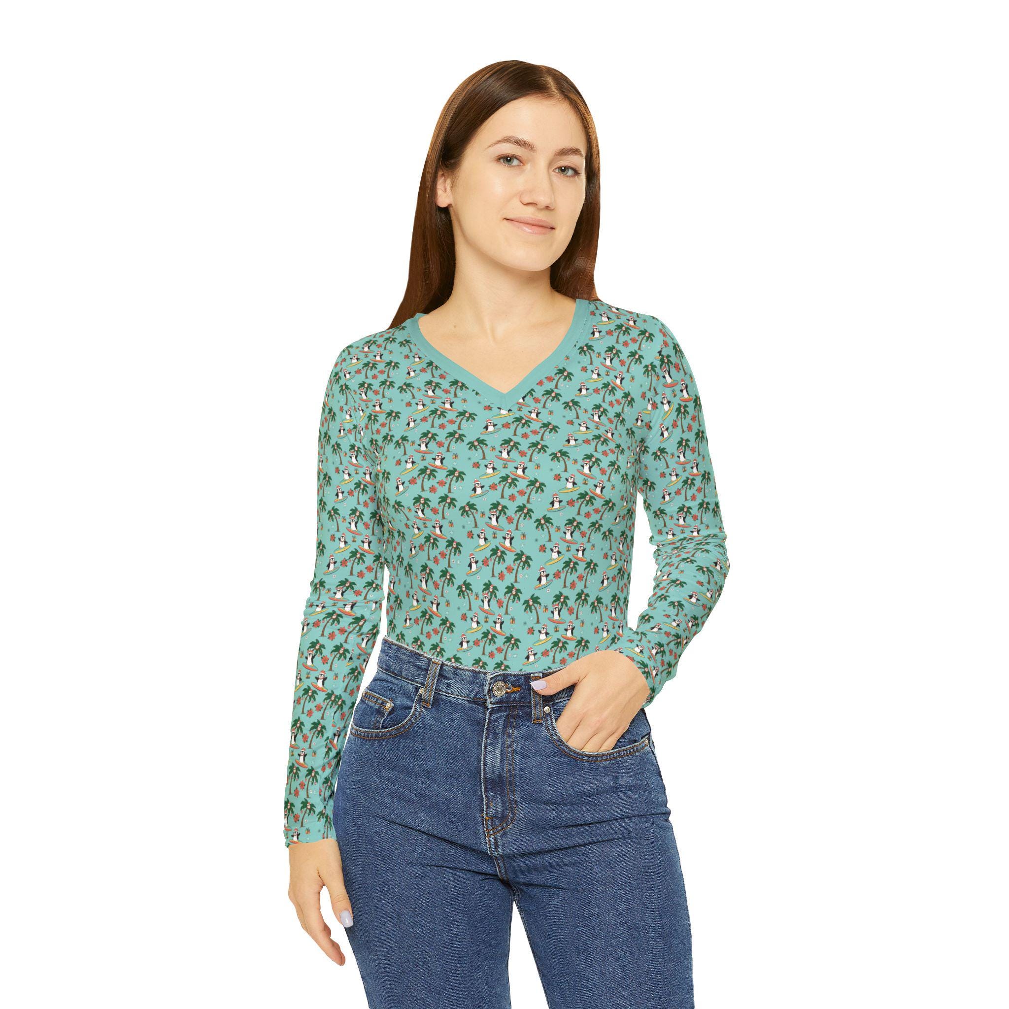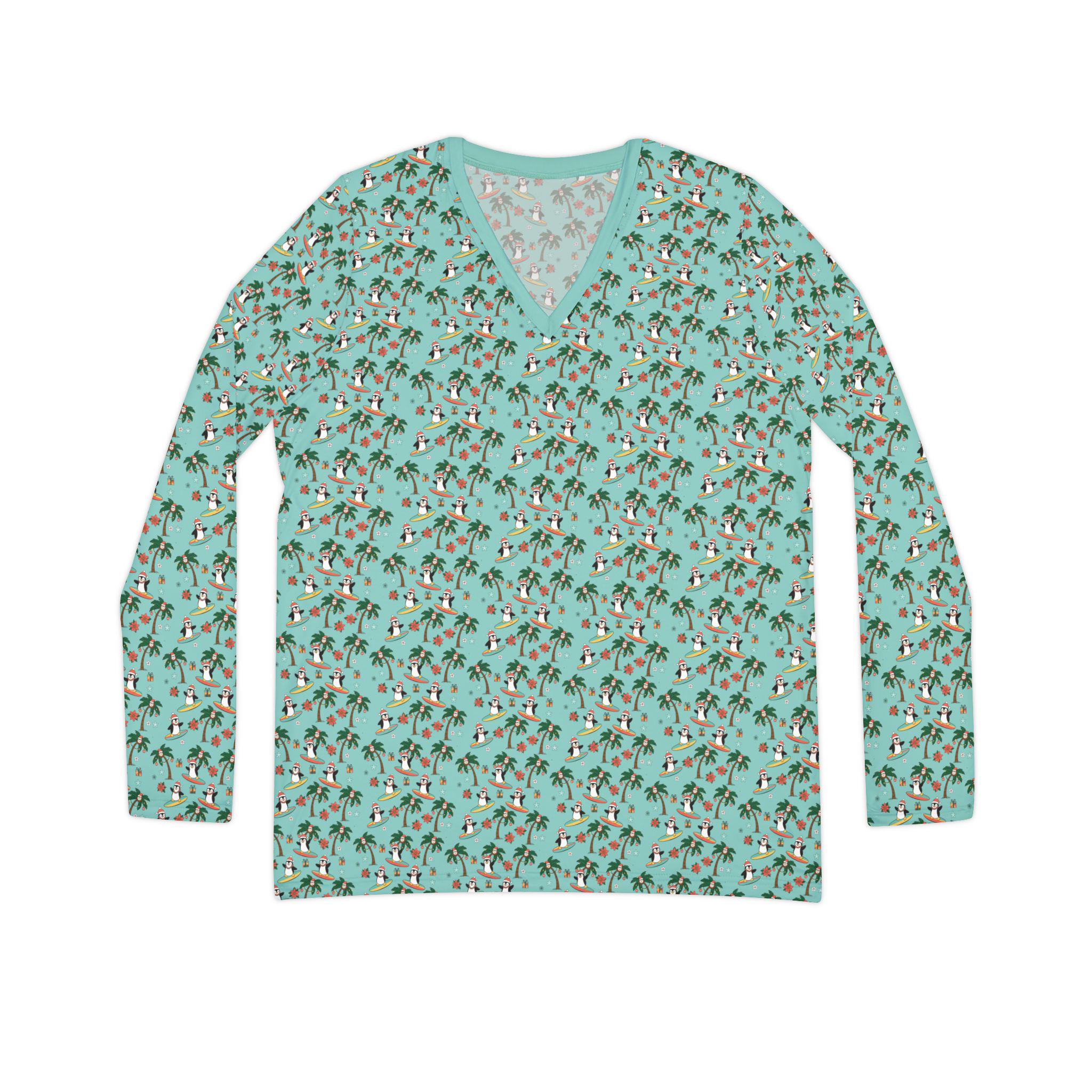 Imagine warm sand underfoot and a salty breeze, but with a string of twinkling lights overhead. This long-sleeve V-neck brings a playful holiday twist to sunny escapes: penguins paddle on tiny surfboards beneath coconut-laden palms, while poinsettias, starfish and wrapped presents dot the scene. It feels like a Christmas postcard from the coast — cozy enough for an evening bonfire, bright enough for a holiday market stroll. The soft, lightweight knit moves with you during brisk seaside walks or layered gatherings, and the V-neck keeps the silhouette breezy and feminine. Wear it to sip spiced cider at a casual winter get-together or to add a cheerful, kitschy touch to seasonal photos. The design reads like a wink to folks who trade snow boots for flip-flops come December—a playful, warm-weather celebration of the holidays.