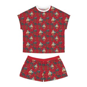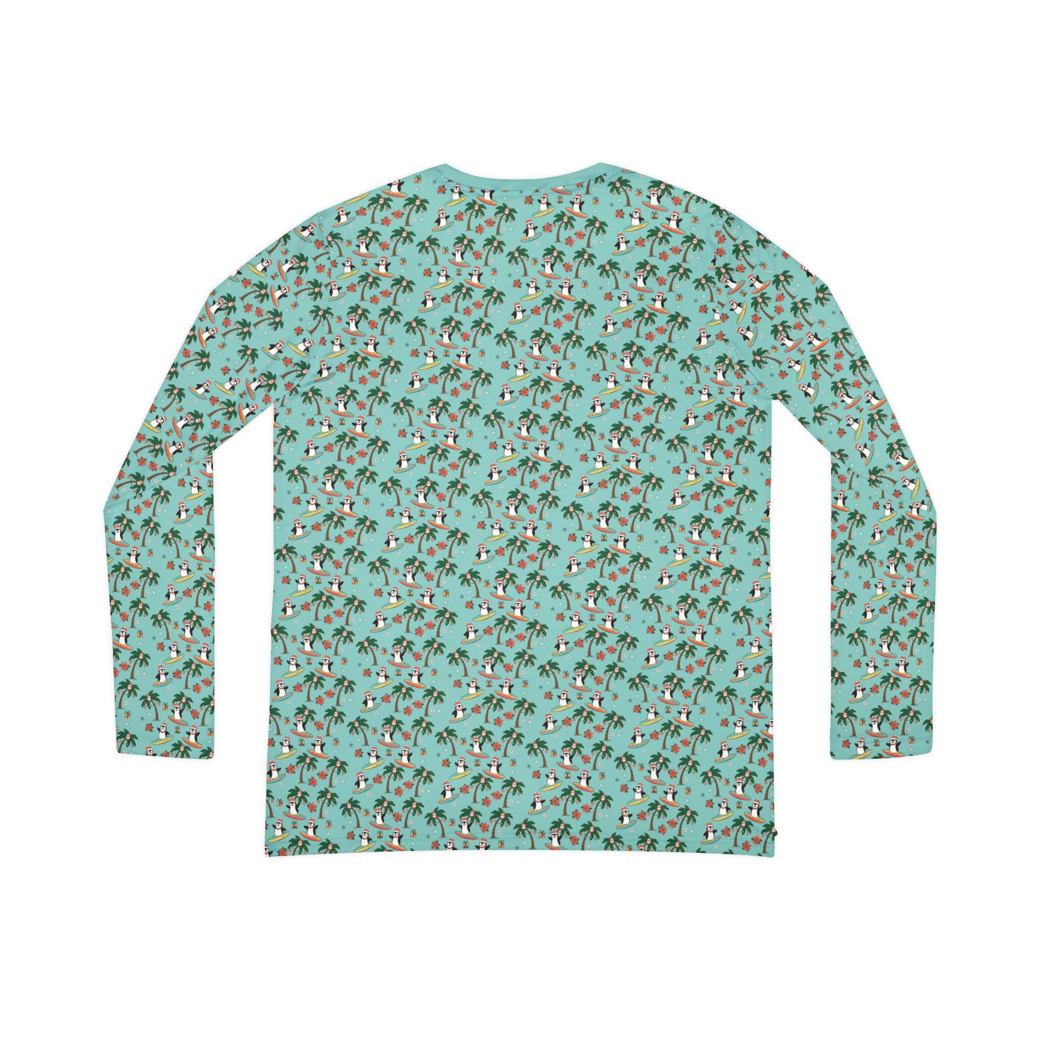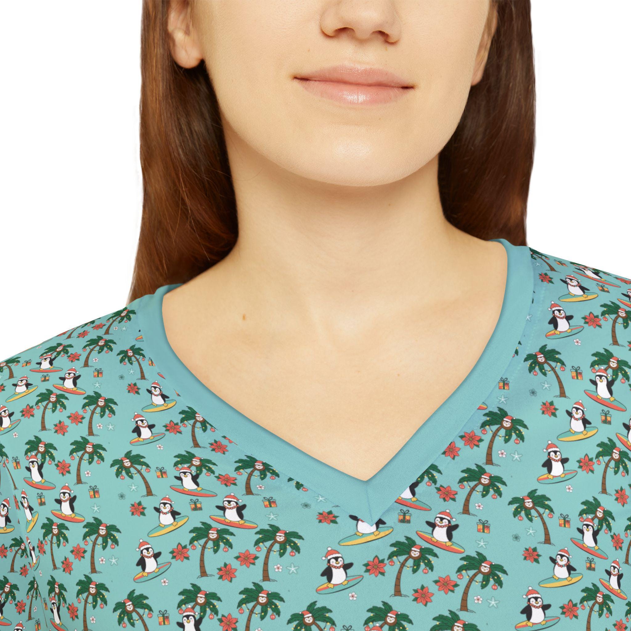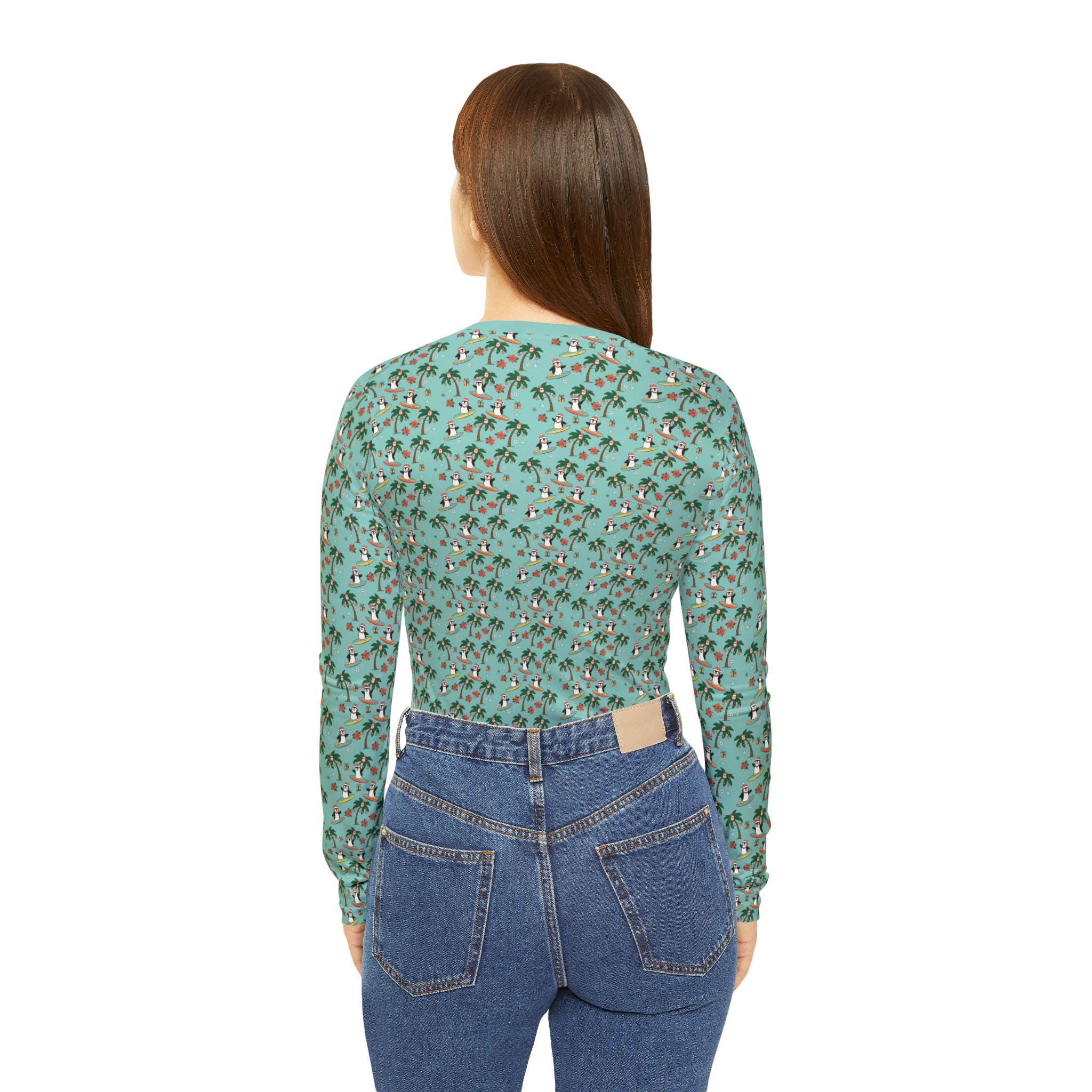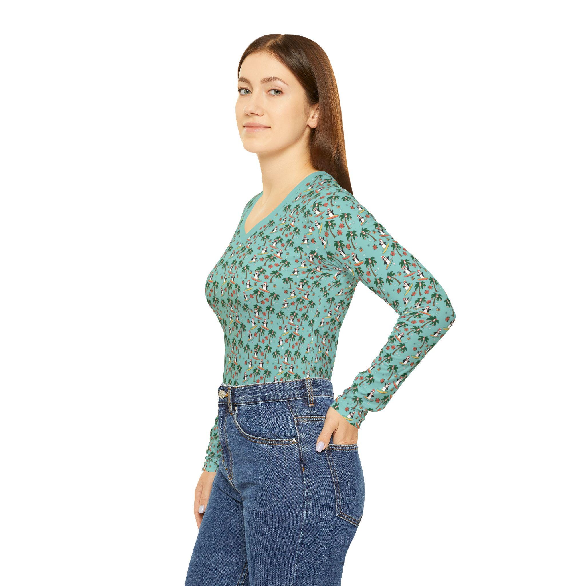 Imagine warm sand underfoot and a salty breeze, but with a string of twinkling lights overhead. This long-sleeve V-neck brings a playful holiday twist to sunny escapes: penguins paddle on tiny surfboards beneath coconut-laden palms, while poinsettias, starfish and wrapped presents dot the scene. It feels like a Christmas postcard from the coast — cozy enough for an evening bonfire, bright enough for a holiday market stroll. The soft, lightweight knit moves with you during brisk seaside walks or layered gatherings, and the V-neck keeps the silhouette breezy and feminine. Wear it to sip spiced cider at a casual winter get-together or to add a cheerful, kitschy touch to seasonal photos. The design reads like a wink to folks who trade snow boots for flip-flops come December—a playful, warm-weather celebration of the holidays.