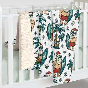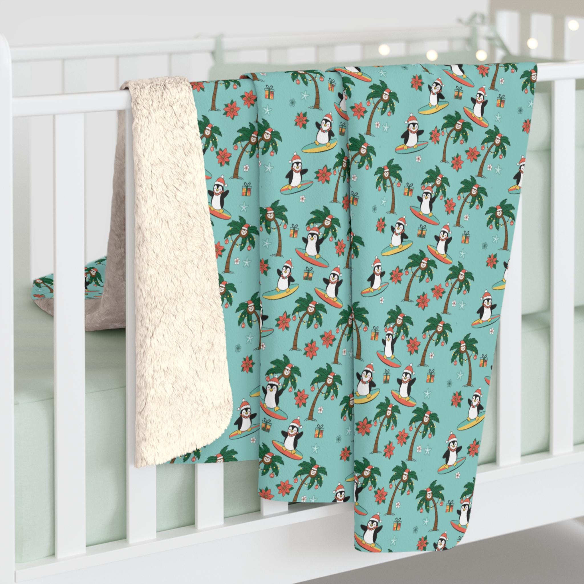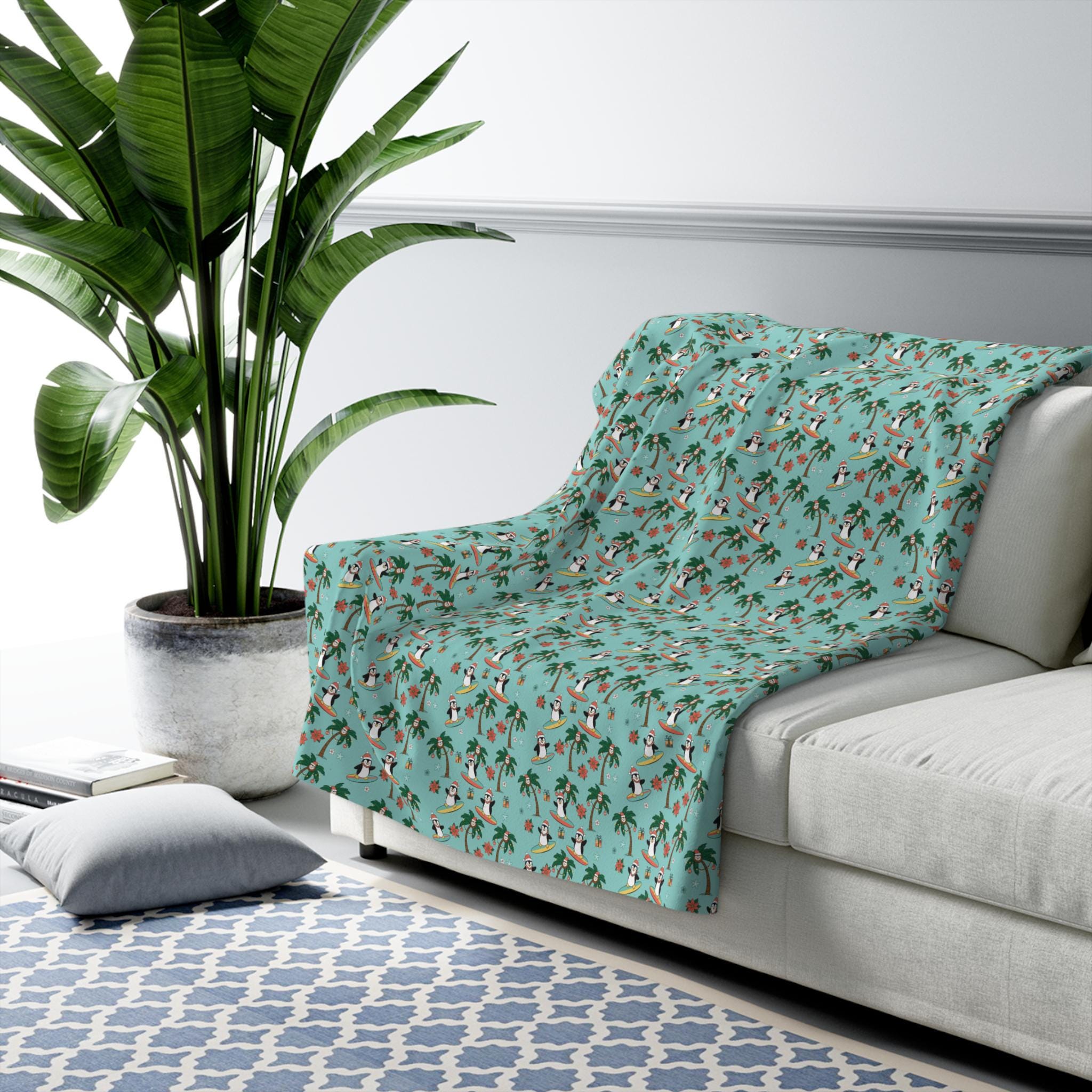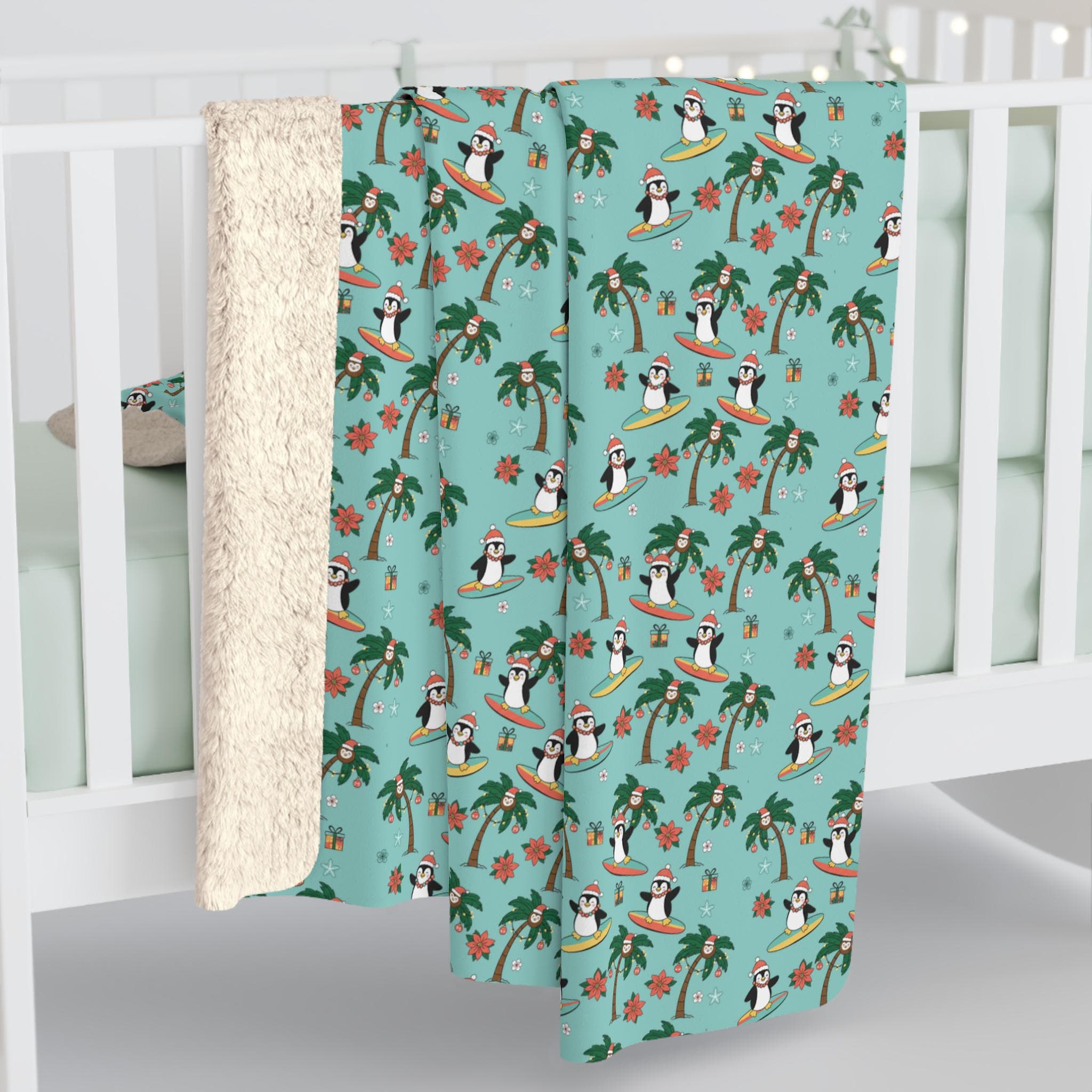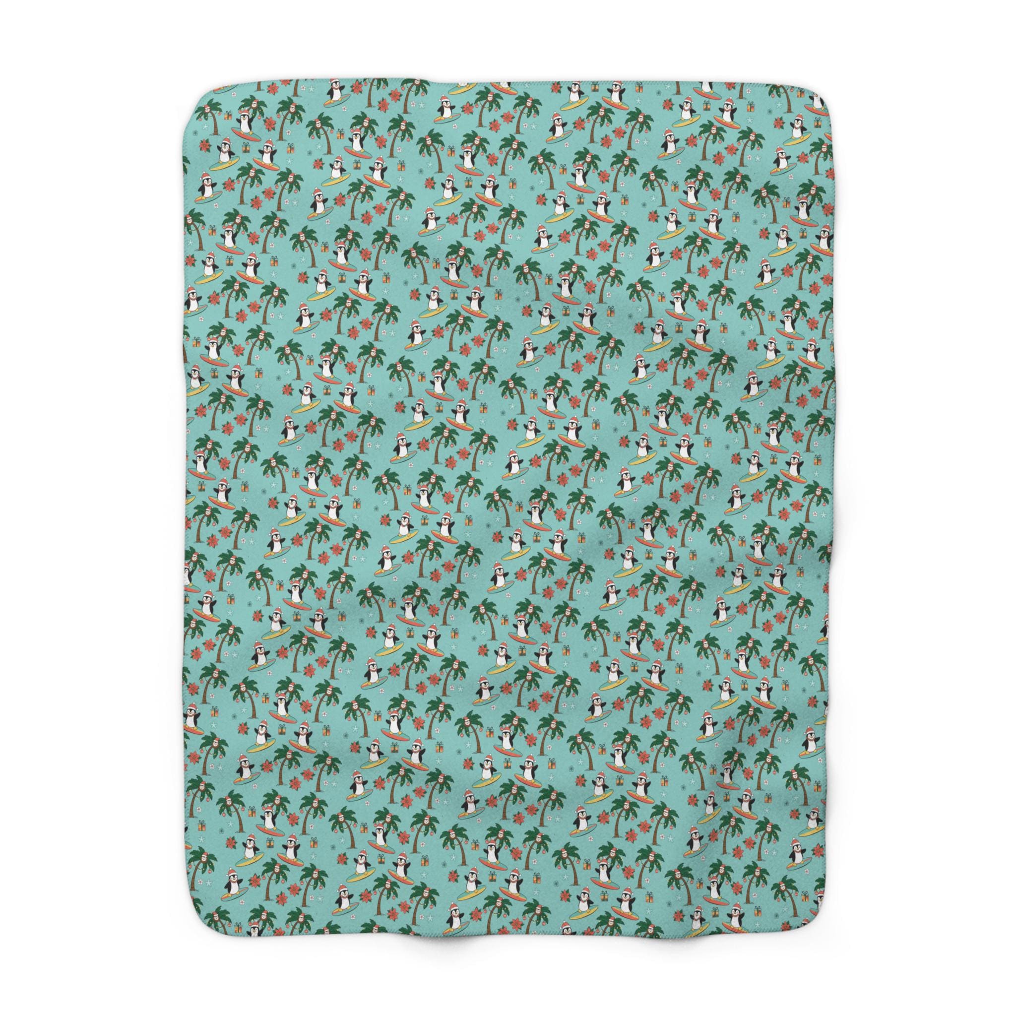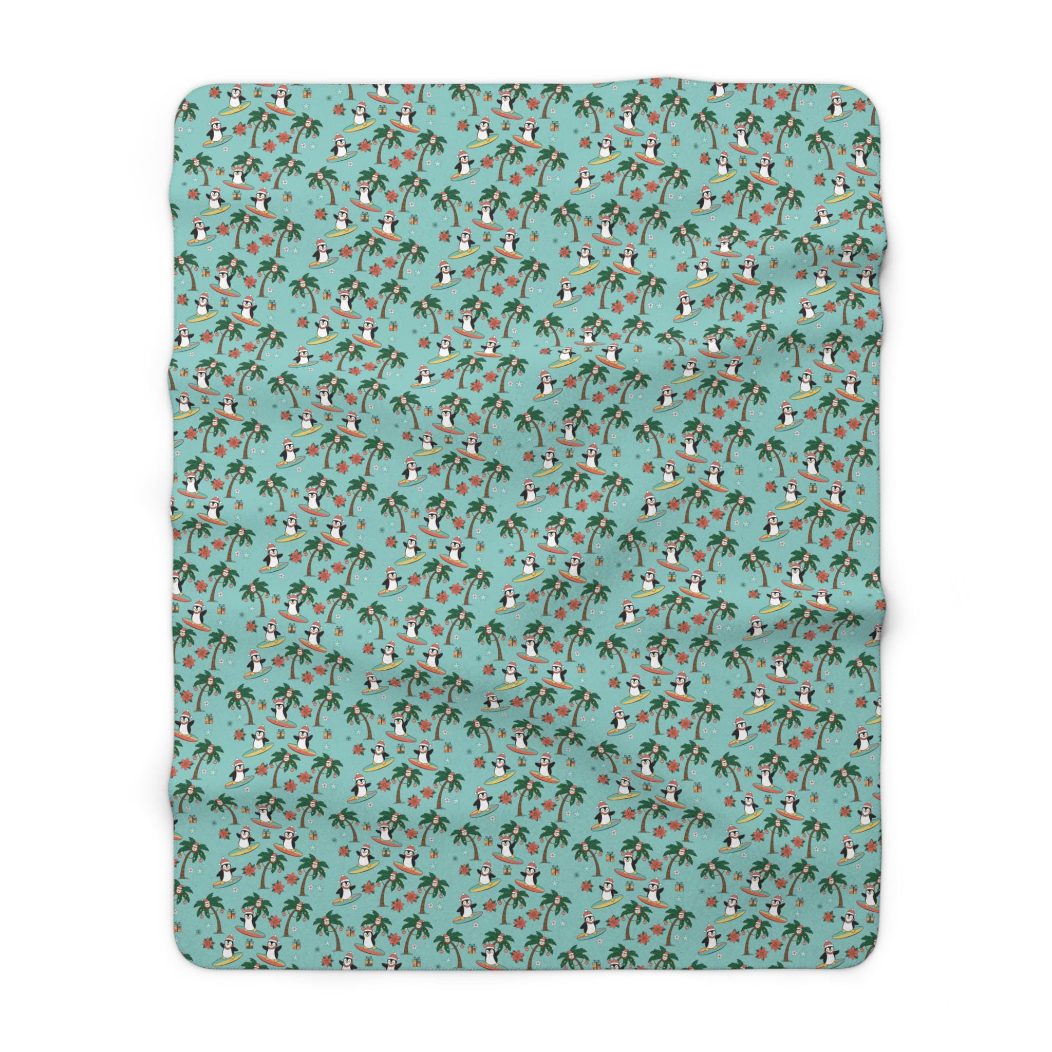 Wrap yourself in holiday mischief with a Sherpa fleece blanket that brings surfboard sunsets to a winter morning. Tiny penguins carve playful arcs among palm trees and Christmas coconuts, while starfish and poinsettias peep out around neatly wrapped presents. The plush Sherpa reverse cushions chilly evenings; the velvety front shows off the bright, whimsical print. Drape it over the sofa for movie nights, toss it in the car for a warm beach-to-cabin drive, or keep it nearby during slow, cozy afternoons with hot cocoa. This blanket reads like a postcard from somewhere warm and silly — cheerful, soft, and made to be lived in.
