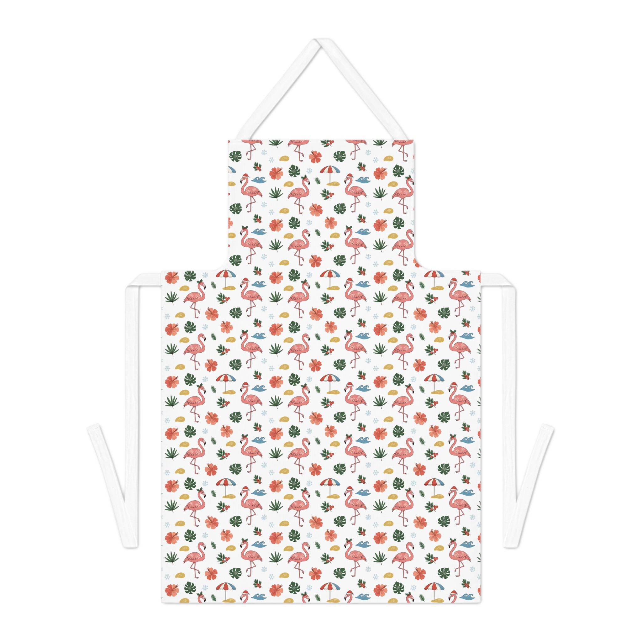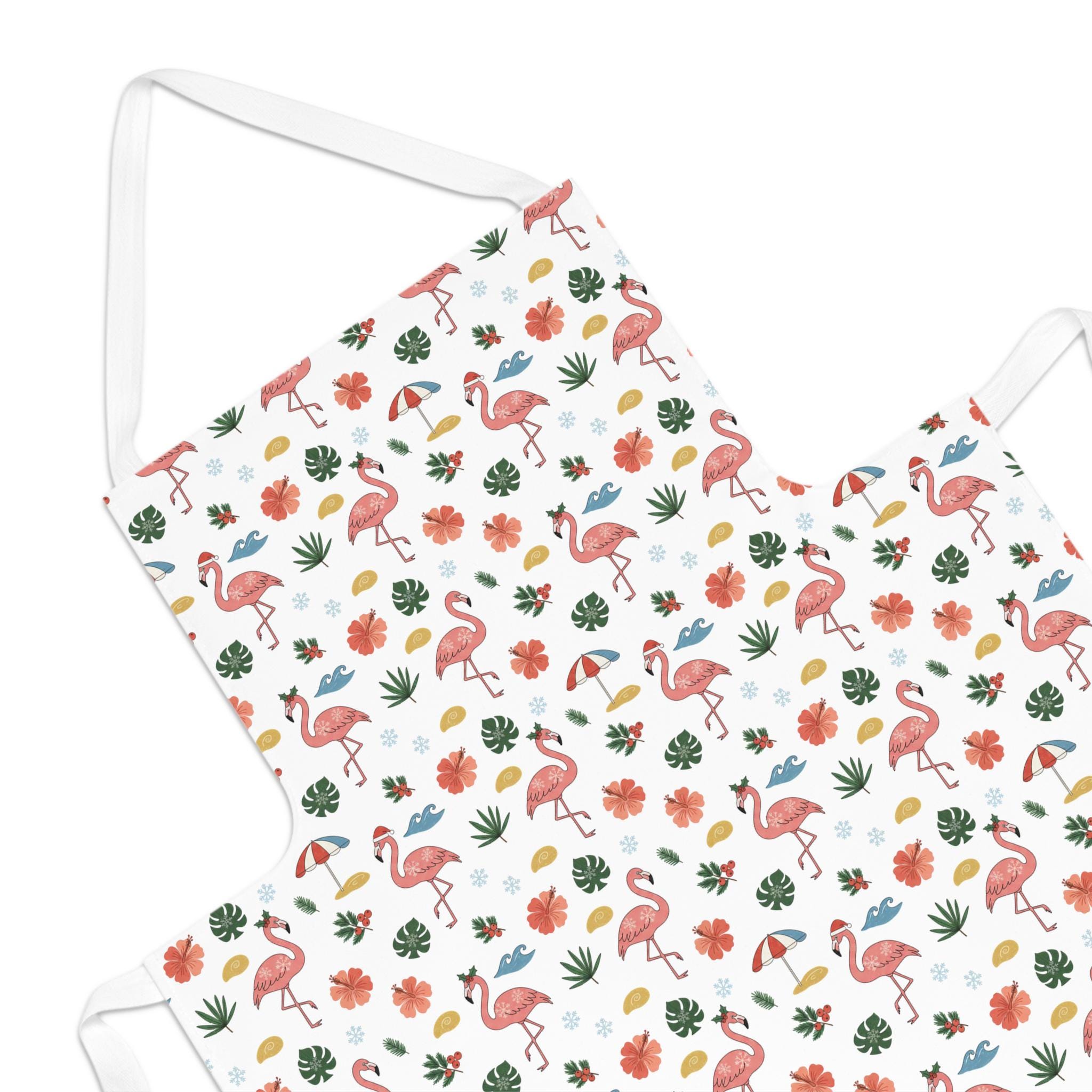 Product features - Durable overlocked seams for long-lasting wear - Lightweight 100% cotton with polyester sublimation coating - Tie-back closure with white straps for adjustable fit - One-sided vibrant all-over print featuring flamingos, mistletoe, and seashells - One-size adult design, easy to move in