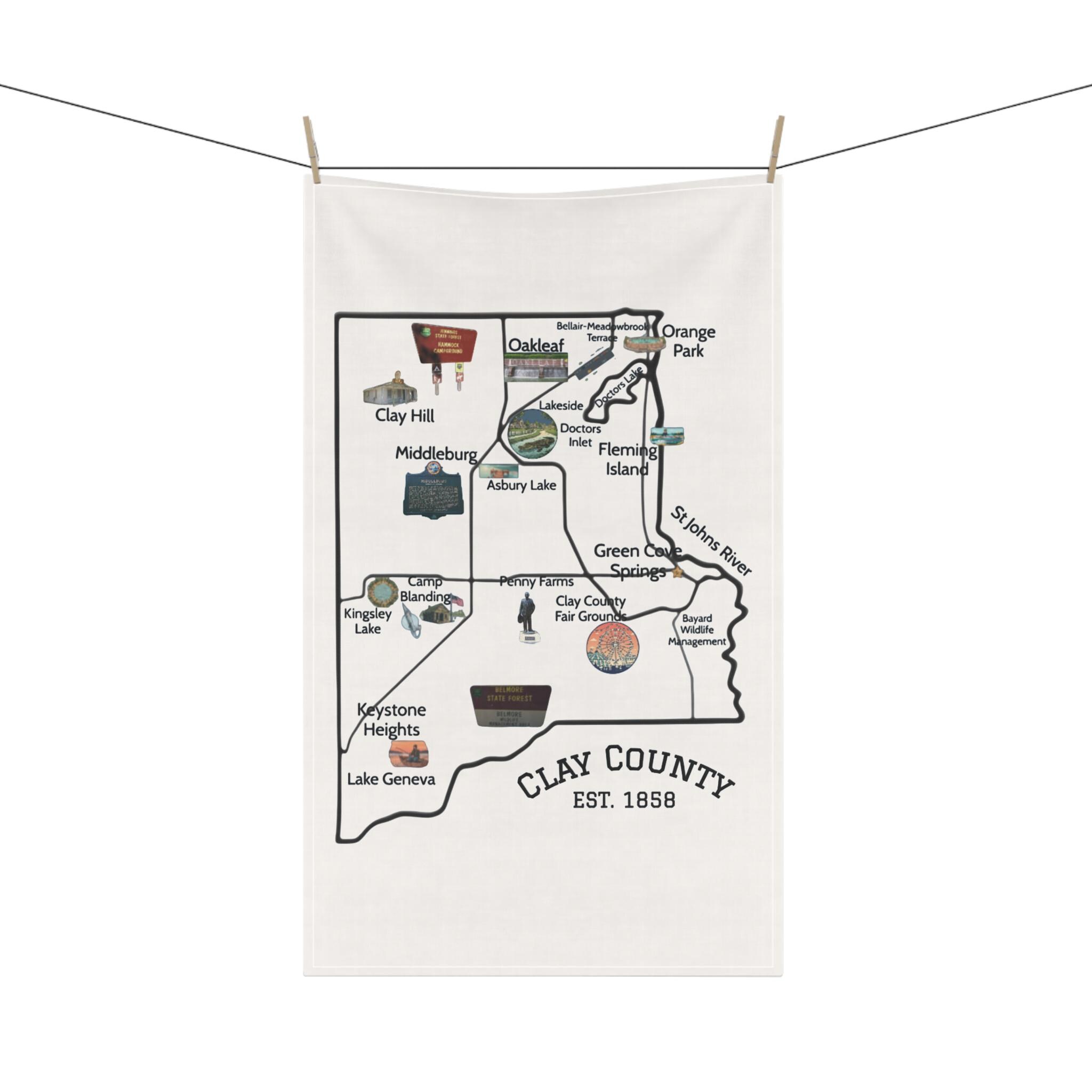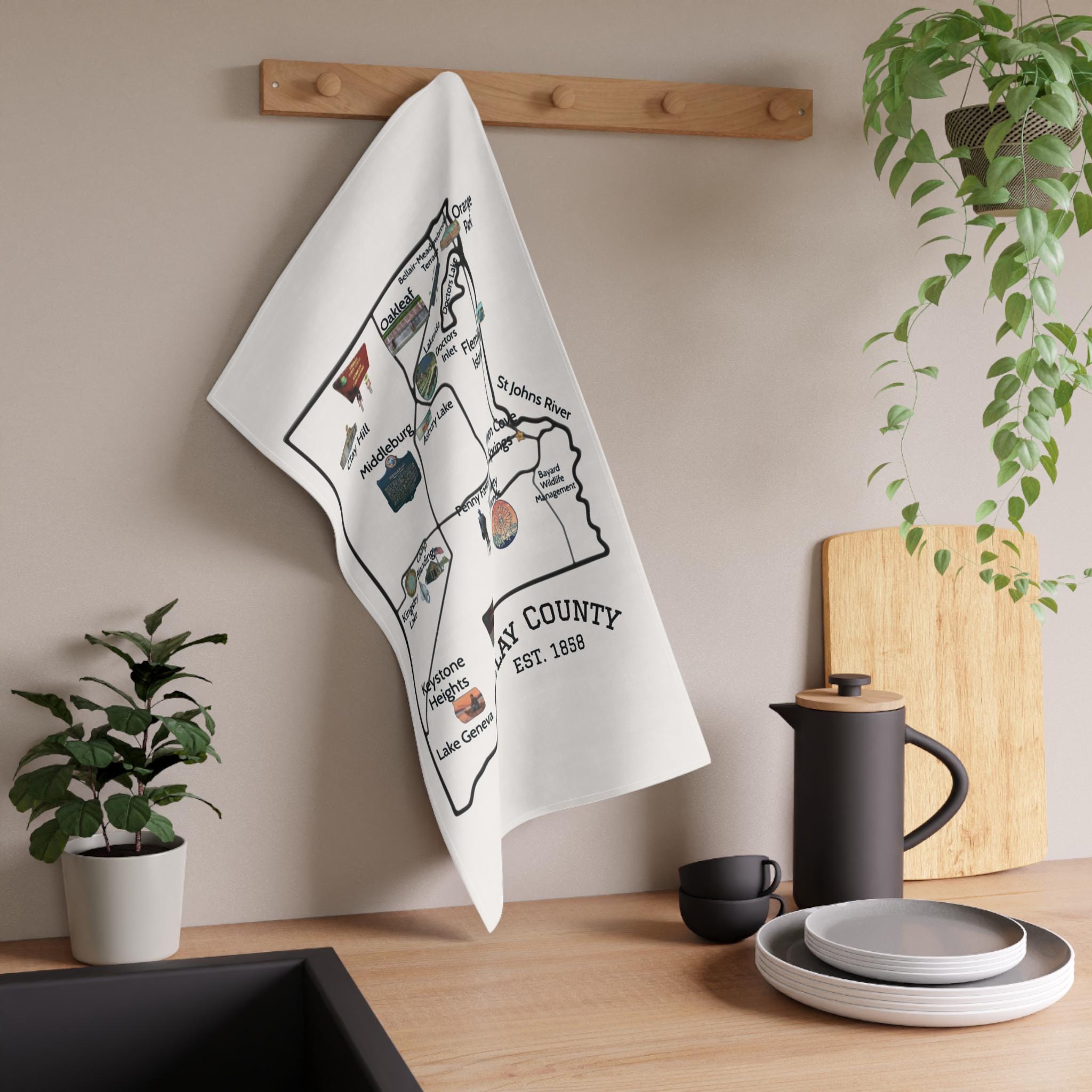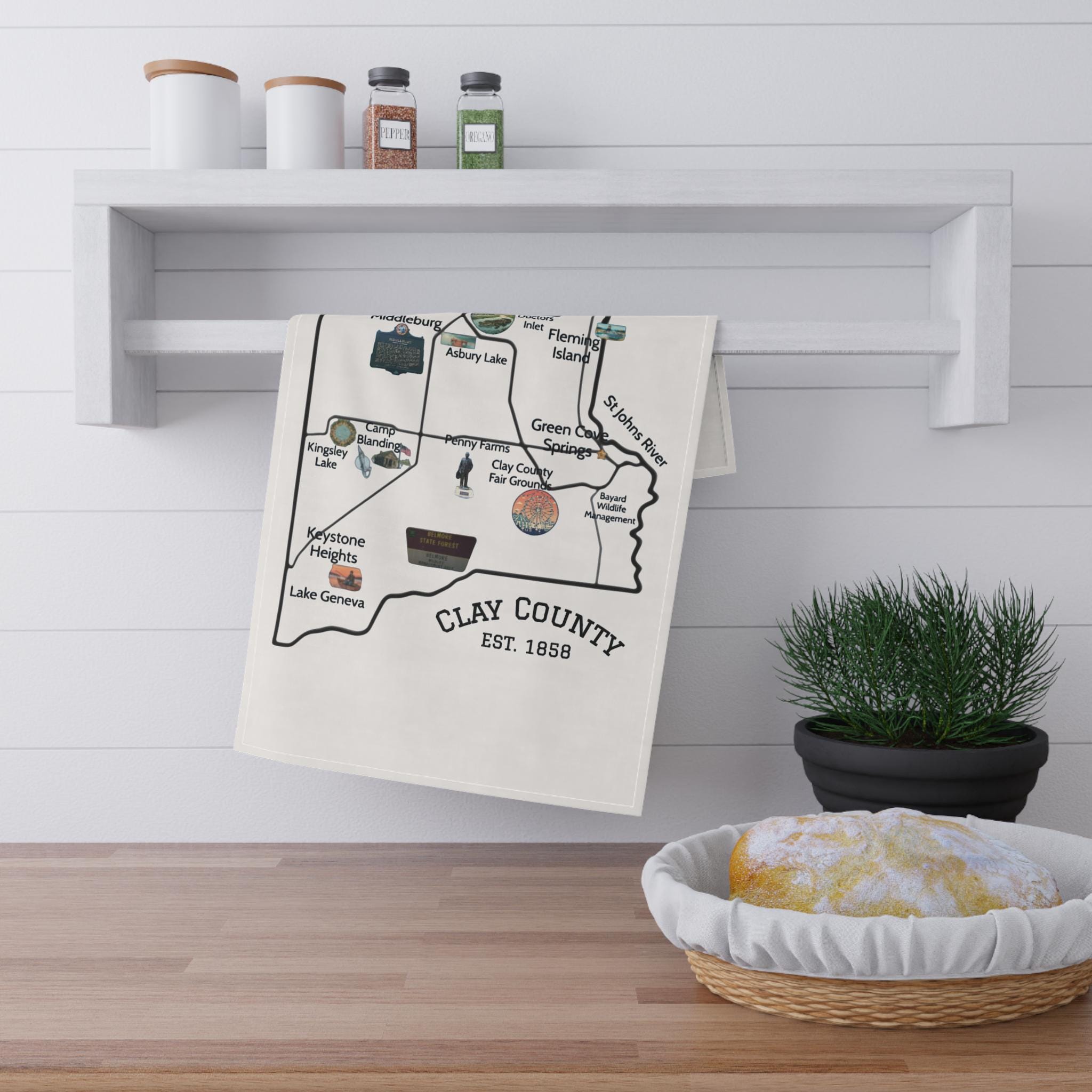 This tea towel is a snapshot of Clay County life—an artful map printed with the names, landmarks, and neighborhood details of the towns and communities that shaped the county since 1858. Drape it over a kitchen sink or hang it on a hook and you’ll see streets, little icons, and town names rendered in bright, crisp color that feels like local history you can touch. The fabric choices let you prioritize absorbency or durability: pick the softer, more absorbent cotton twill for everyday dishwork, or the resilient polyester for a bold, lasting print that stands up to frequent use. Hemmed edges keep the towel neat through washes, and the one-sided design puts the map on proud display. It settles into farmhouse kitchens, lake houses, and community-minded homes—where people love to see their hometown marked and remembered in everyday objects.