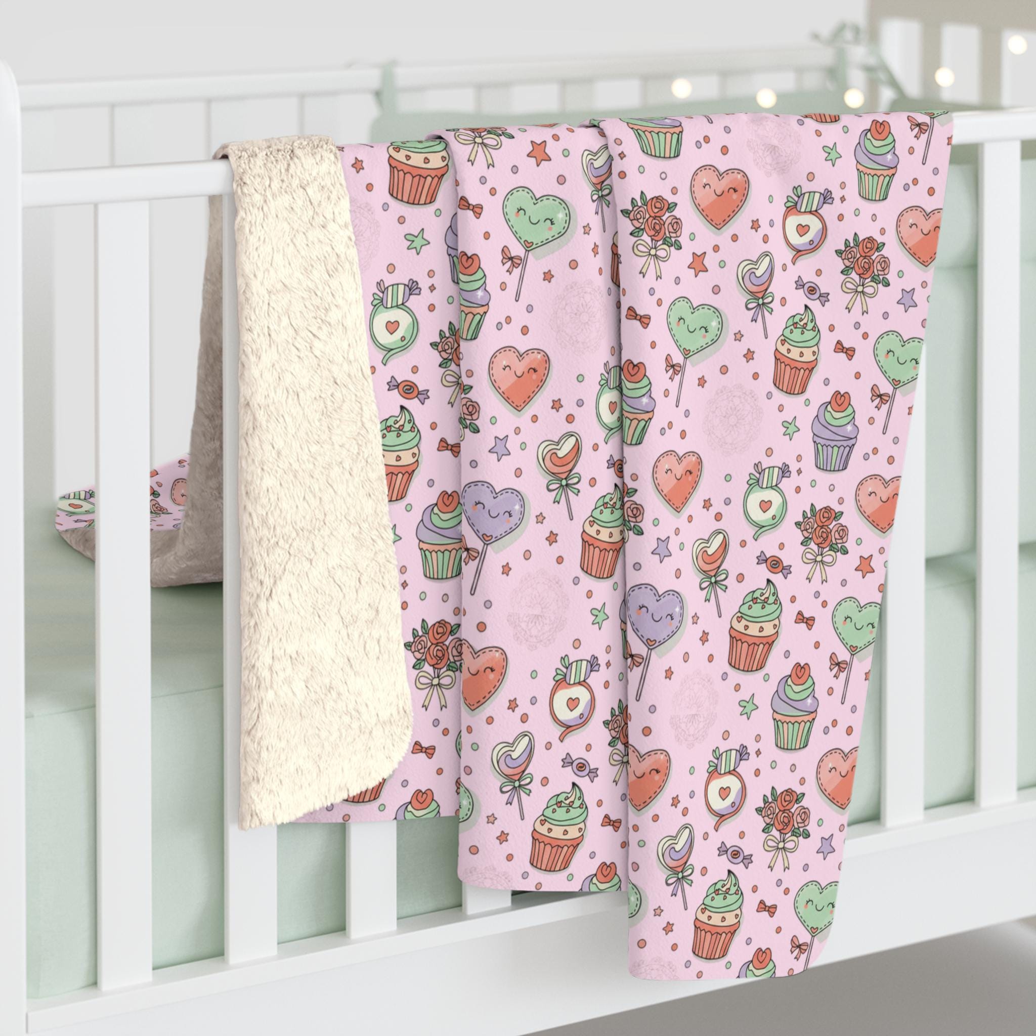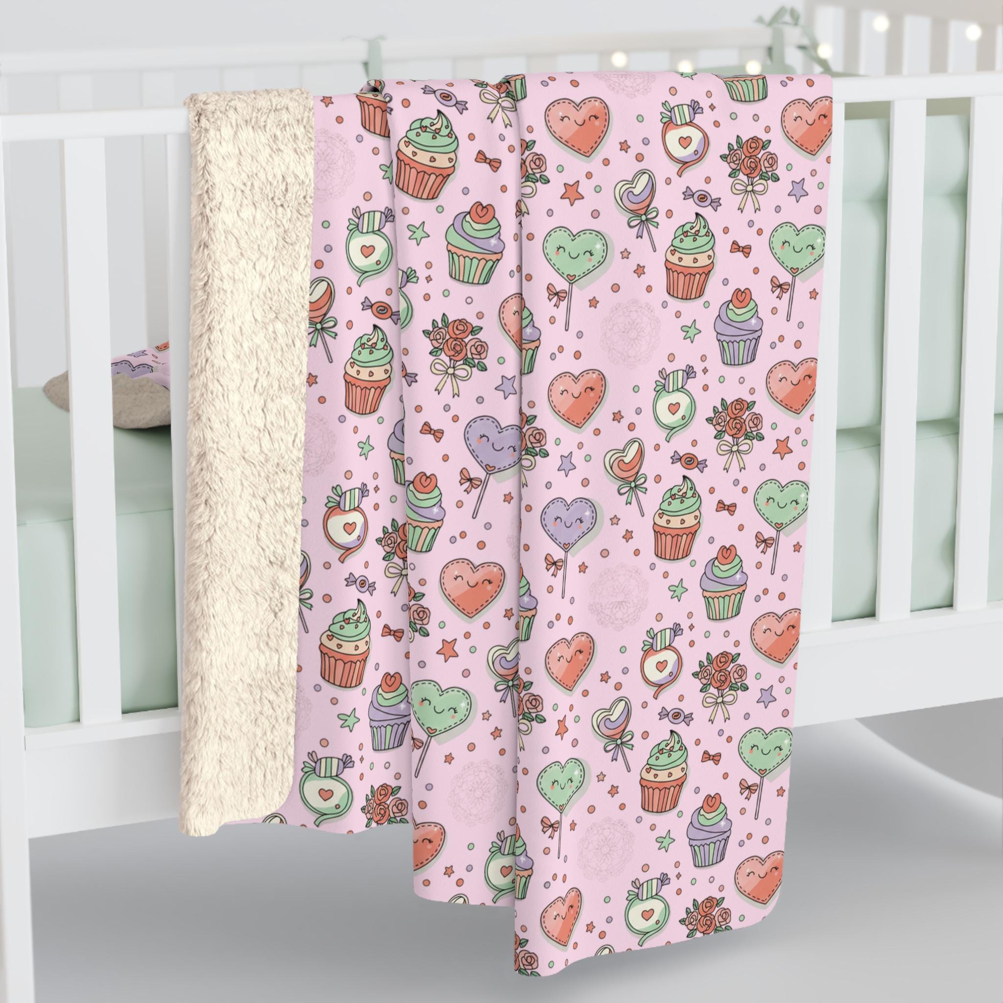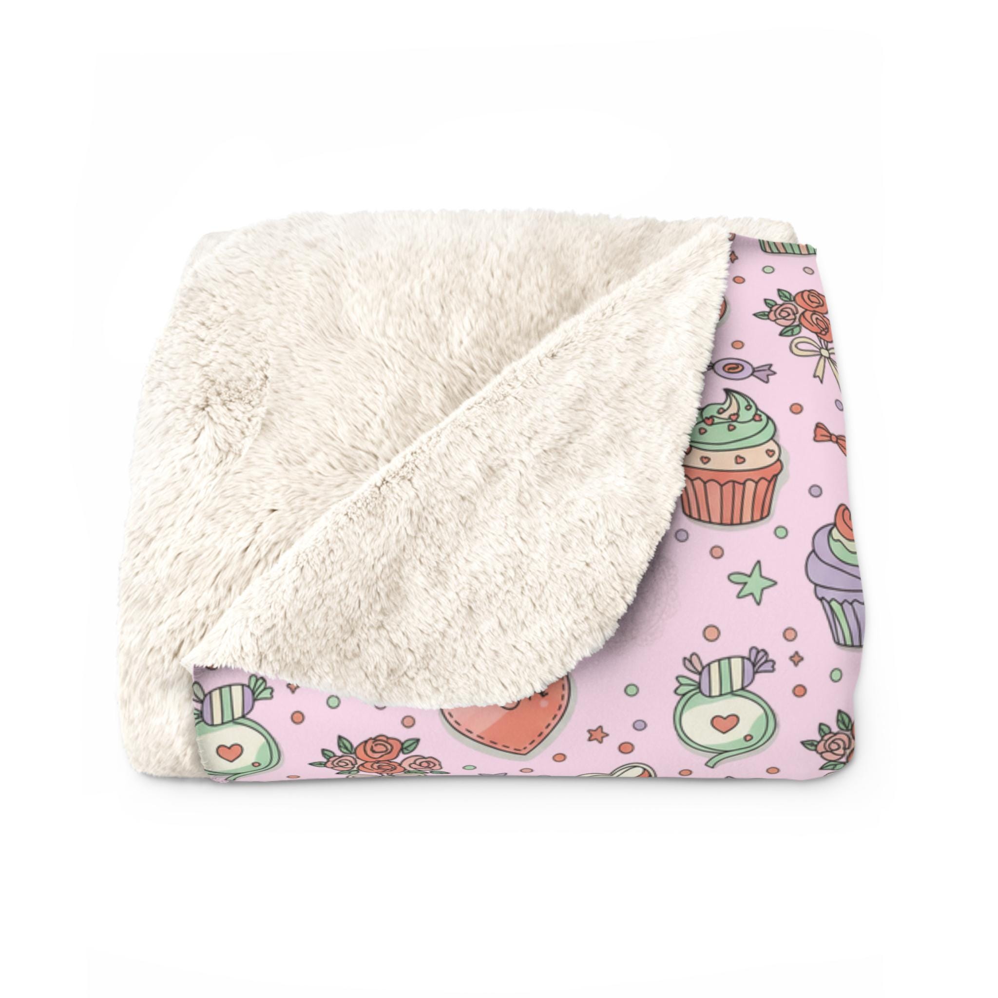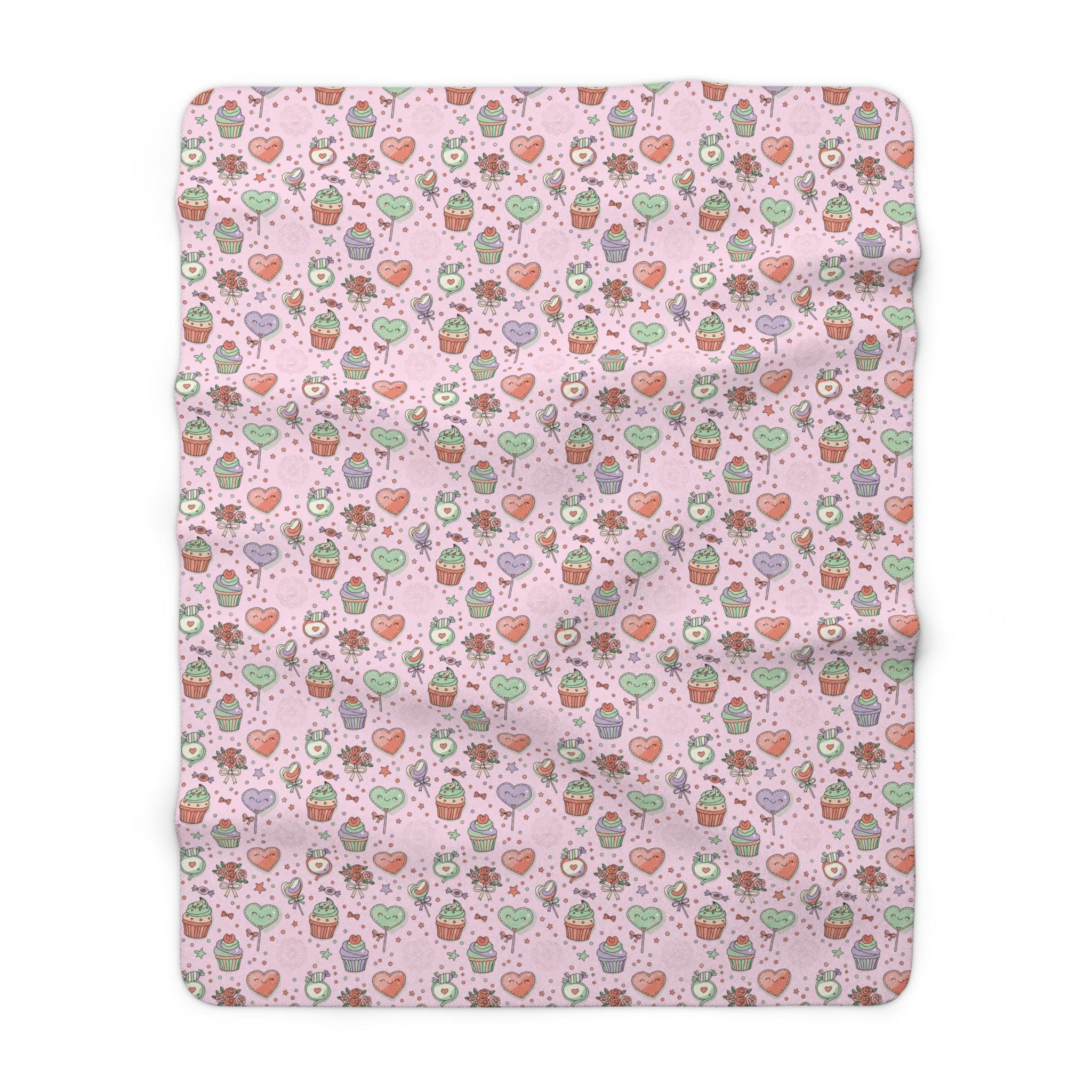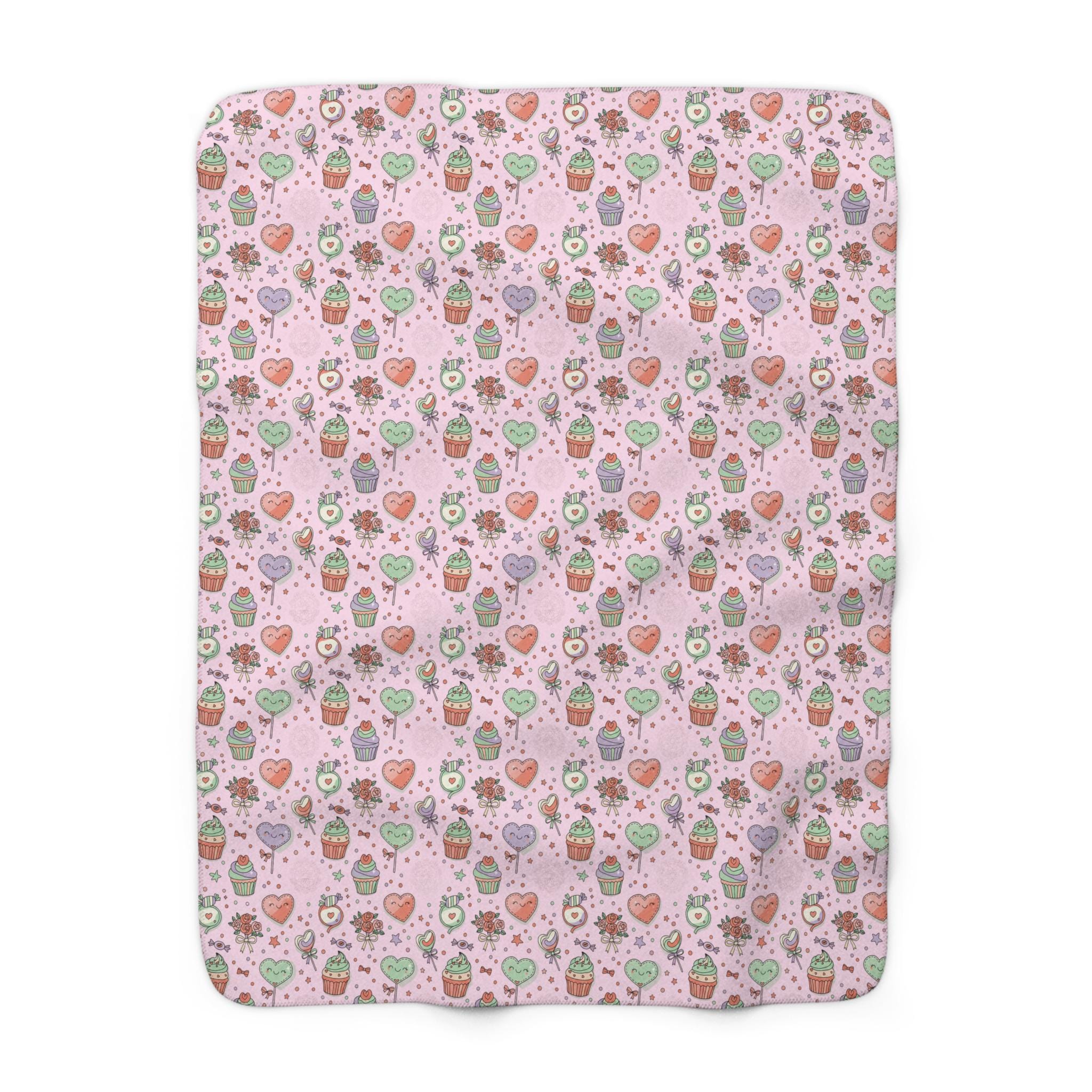 Wrap yourself in a wash of playful sweetness. This sherpa fleece blanket pairs a blush-pink field of cupcakes, roses, hearts, and candy with a velvety plush sherpa reverse that invites you to sink in. It reads like a cozy afternoon at a bakery — lighthearted, warm, and a little indulgent — and layers easily on a couch, at the foot of a bed, or across a favorite reading chair. The pattern’s whimsical details add a cheerful note to quiet moments and make chilly evenings feel more like a snug, comforting pause.