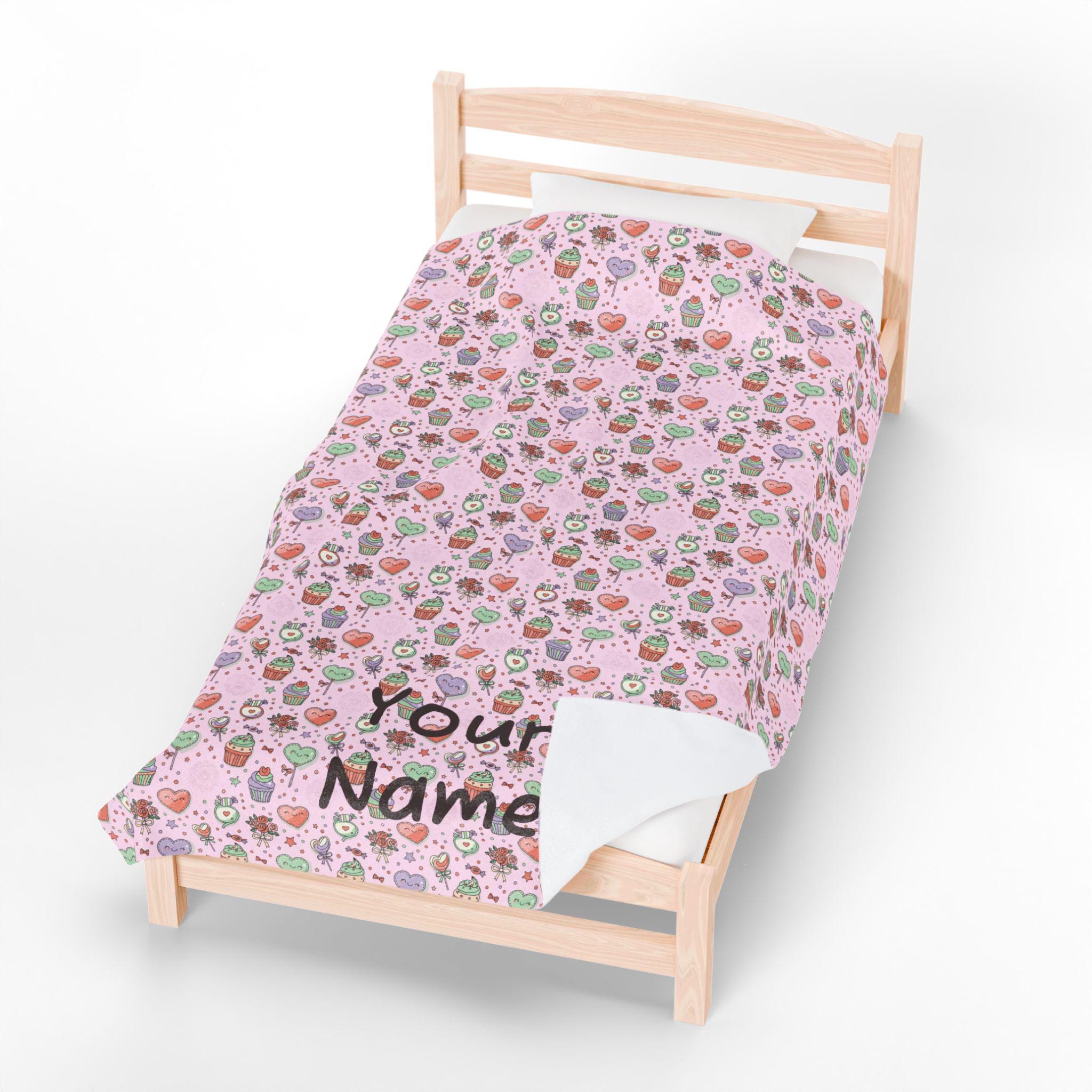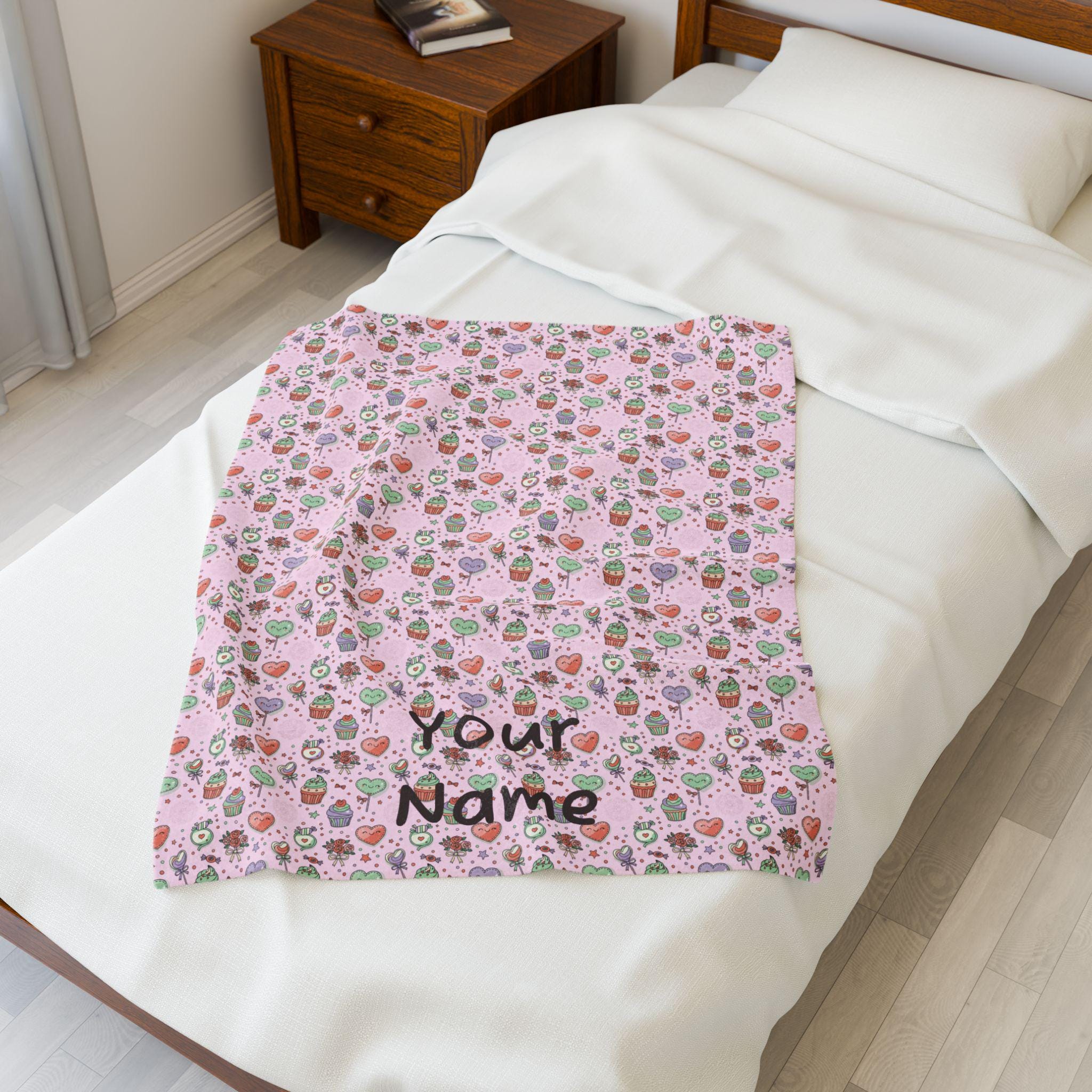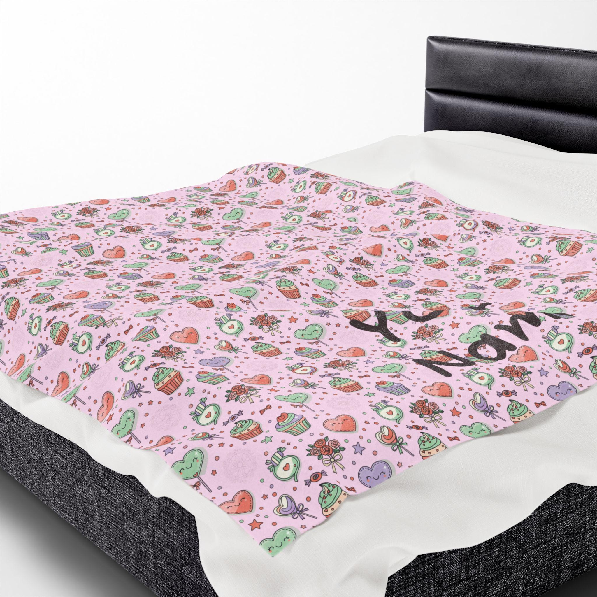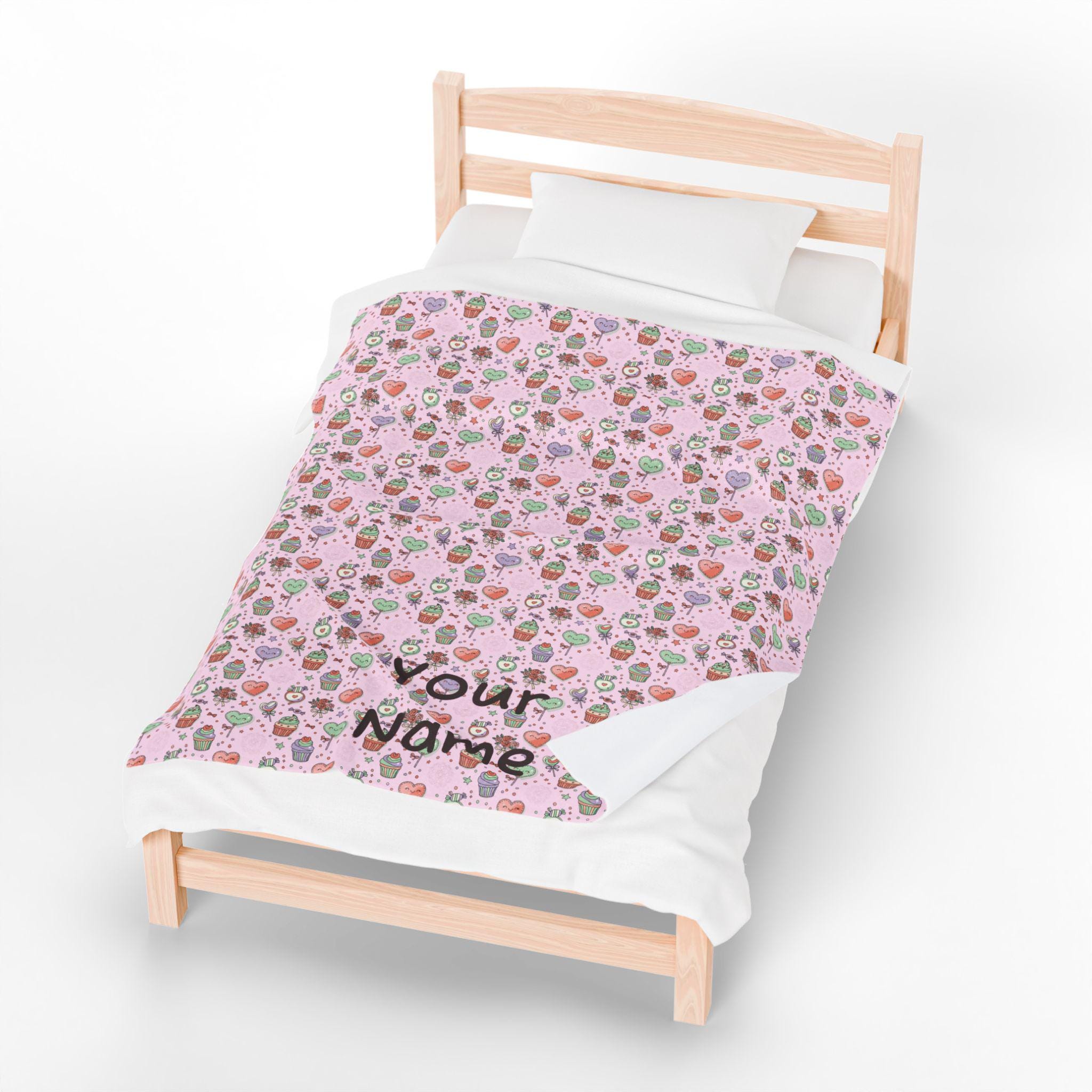 Wrap yourself in a soft, whimsical world with this velveteen plush blanket. A candy-dream pattern of cupcake roses, hearts, and sweets blooms across a blush-pink field, evoking cozy afternoons curled up with a warm drink and a good story. The plush surface feels silky against the skin; the medium heavy-weight fabric holds gentle warmth without feeling bulky. Thoughtfully stitched with double-needle topstitching, the edges stay neat wash after wash. This blanket brings a playful, comforting touch to quiet mornings, birthday movie nights, or when you want a little sweet nostalgia in your space.