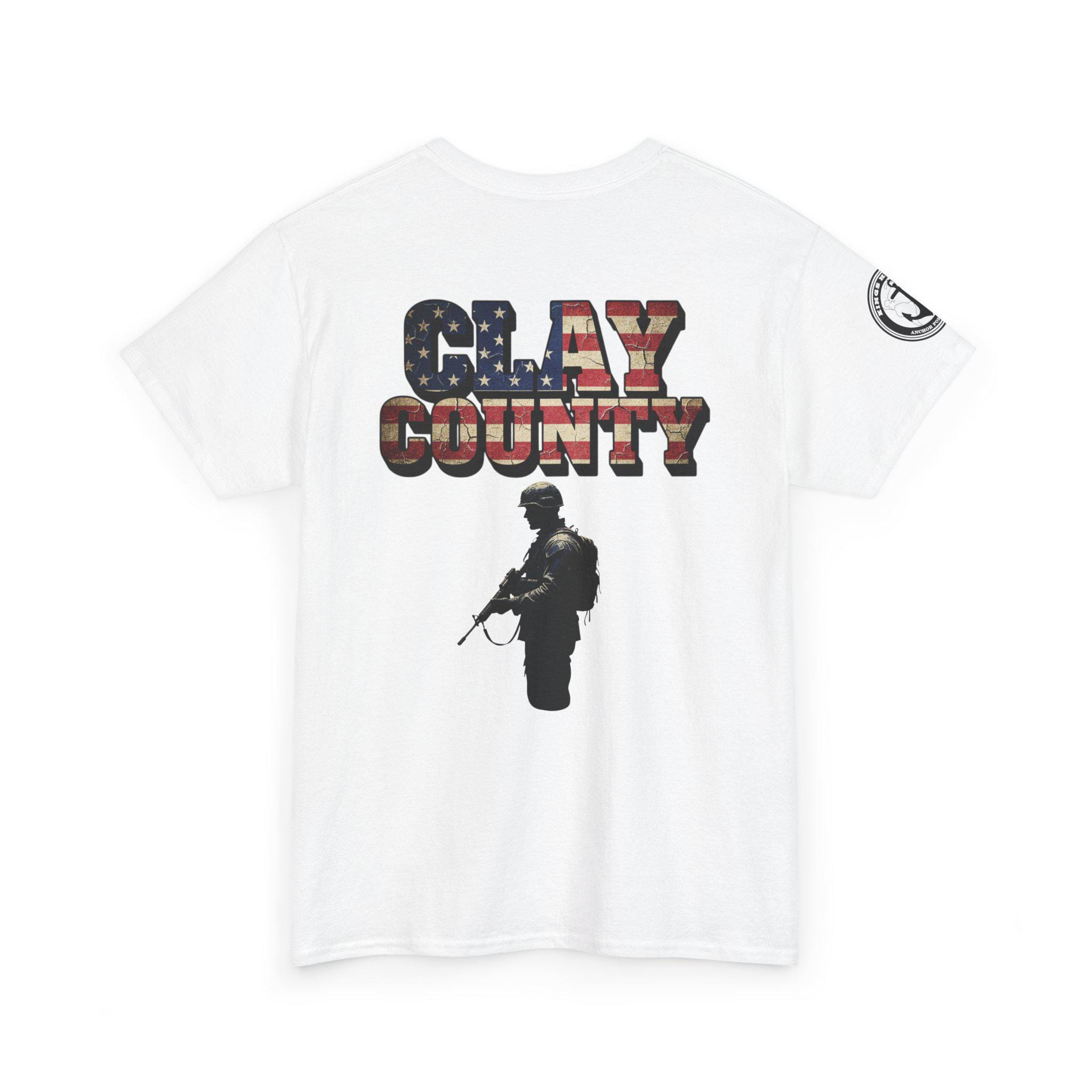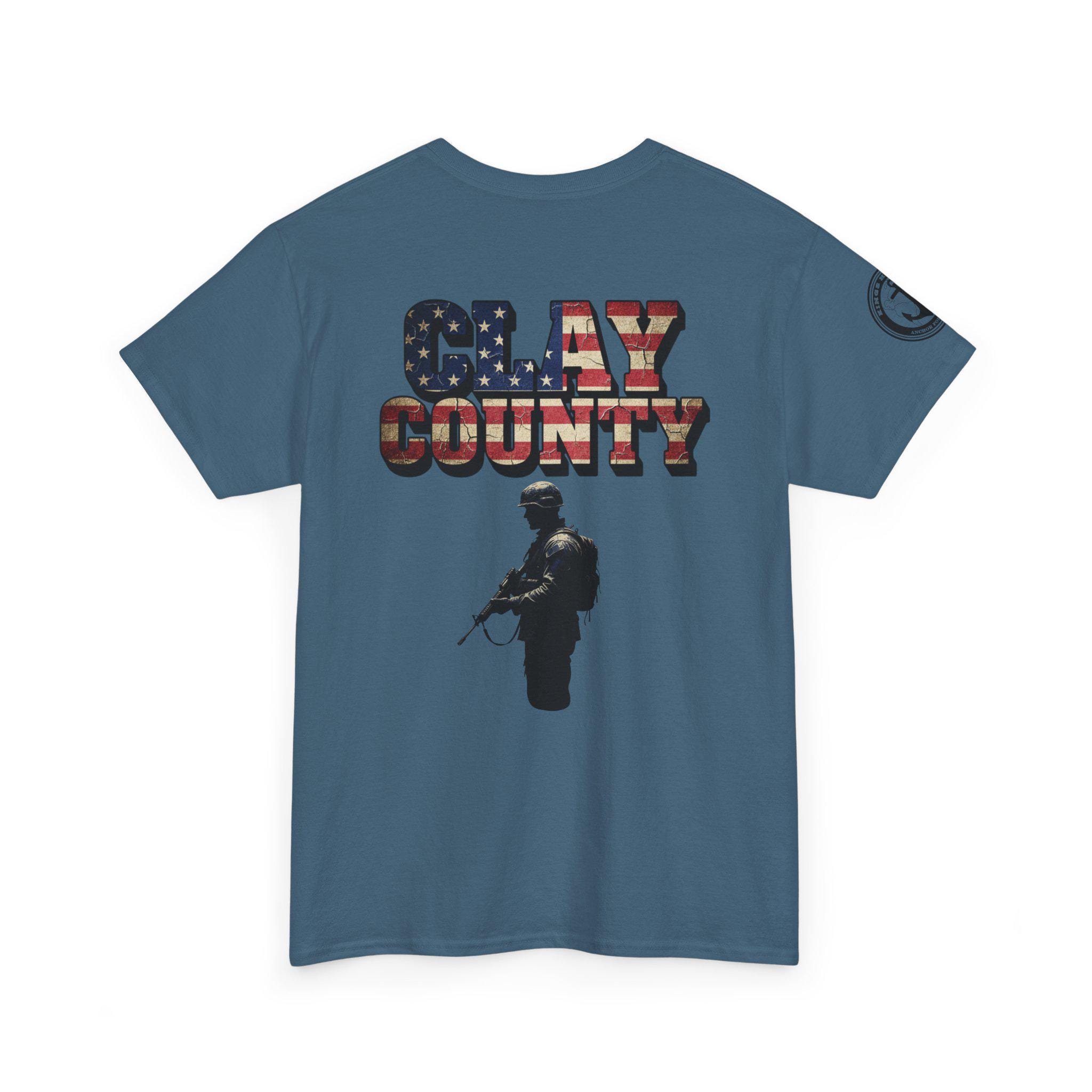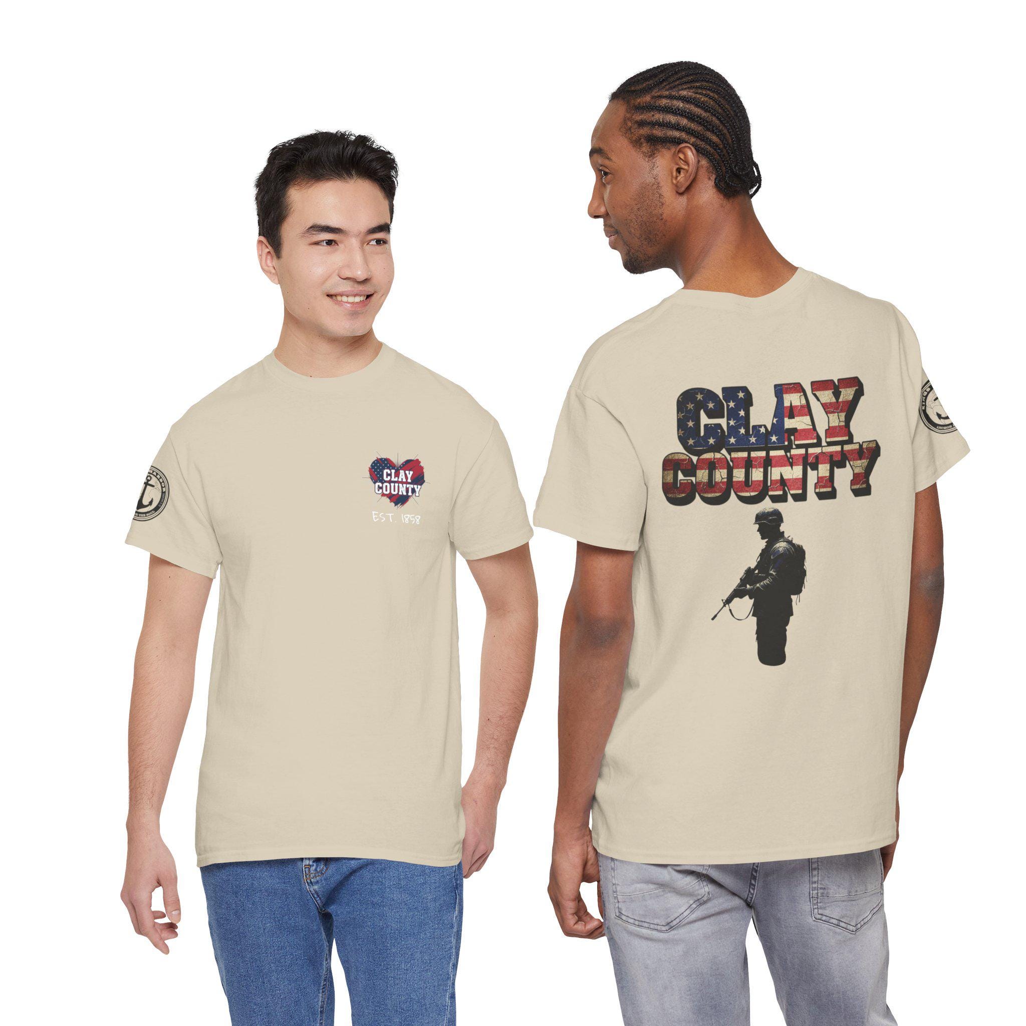 This tee carries quiet, steady pride. The words “Clay County” form an American flag, its stripes and stars shaped by the lettering, while a soldier’s silhouette stands within — a simple, respectful emblem of service rooted in local soil. Wear it to rallies, parades, or low-key neighborhood gatherings and feel anchored to the people and stories that matter. The fabric breathes easily; the fit drapes relaxed but neat over the shoulders. It’s the kind of shirt you reach for when you want to show allegiance without shouting. It pairs naturally with jeans, a field jacket, or a workshirt after a long day at the post. For veterans, active duty, family members, and neighbors, this shirt reads like recognition — familiar, steady, and made to be lived in.