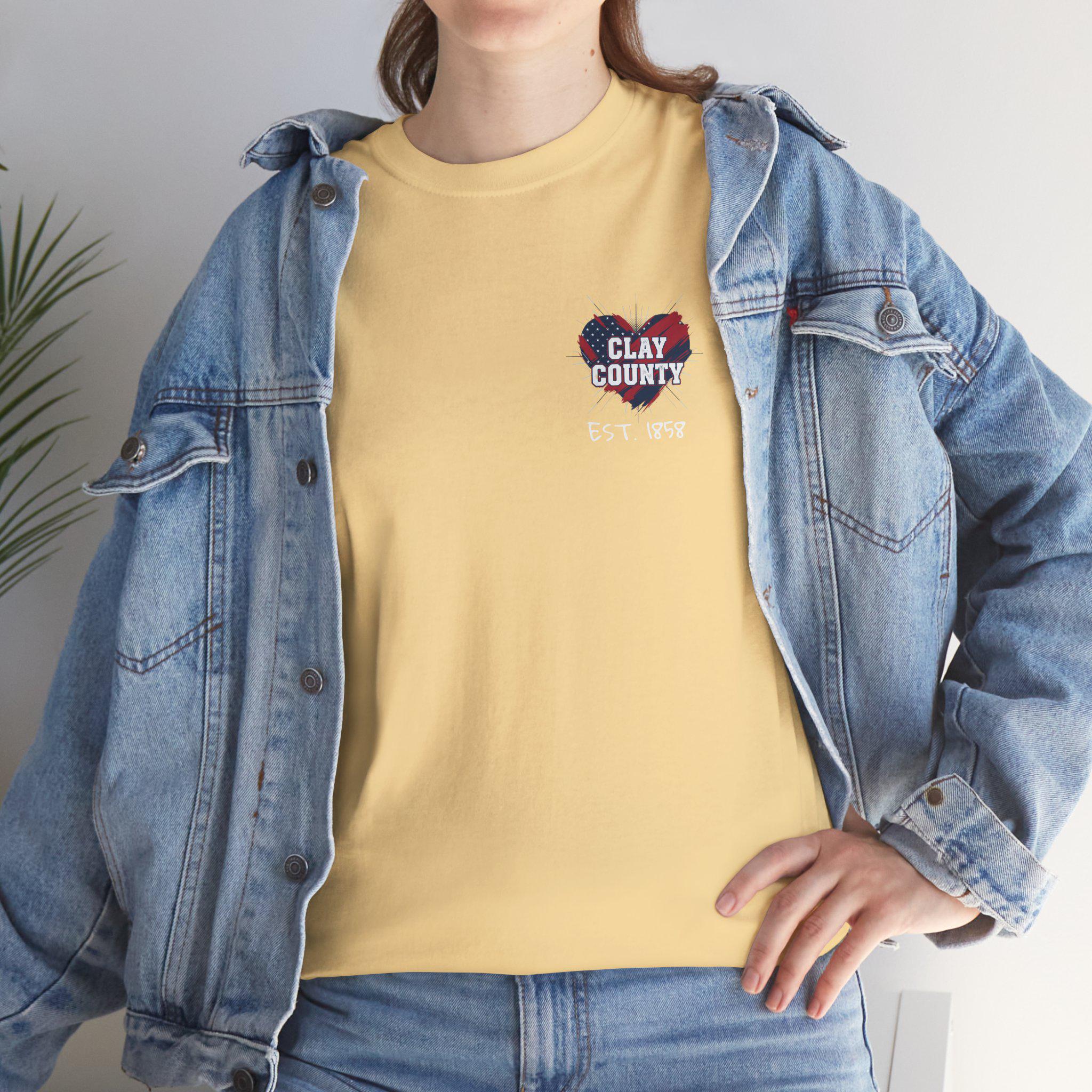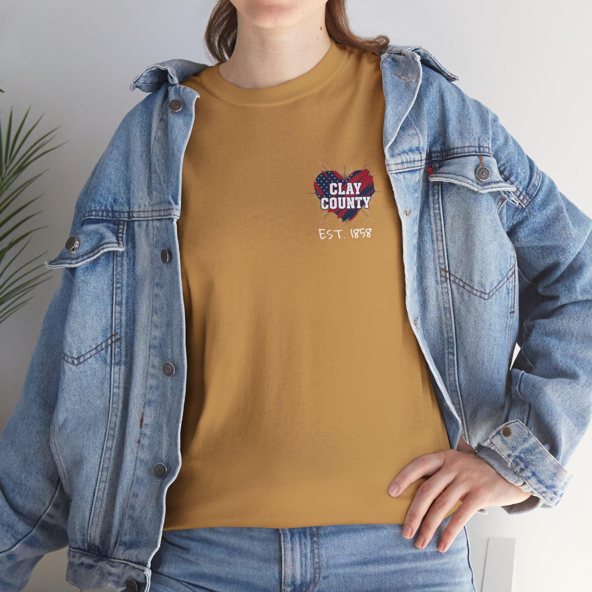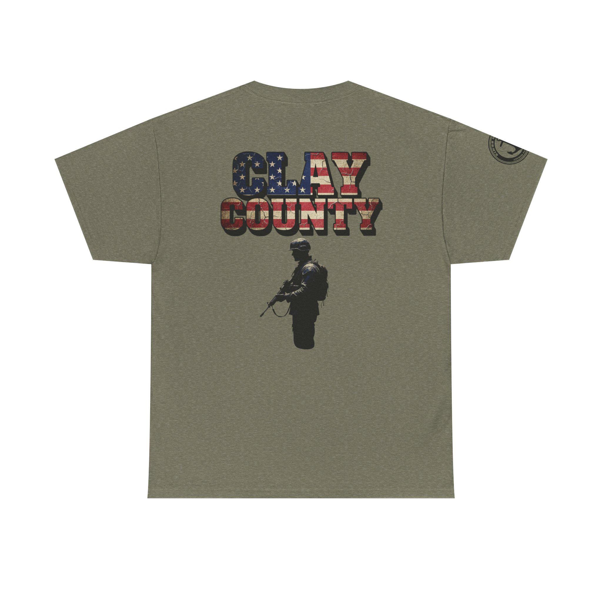 This tee carries quiet, steady pride. The words “Clay County” form an American flag, its stripes and stars shaped by the lettering, while a soldier’s silhouette stands within — a simple, respectful emblem of service rooted in local soil. Wear it to rallies, parades, or low-key neighborhood gatherings and feel anchored to the people and stories that matter. The fabric breathes easily; the fit drapes relaxed but neat over the shoulders. It’s the kind of shirt you reach for when you want to show allegiance without shouting. It pairs naturally with jeans, a field jacket, or a workshirt after a long day at the post. For veterans, active duty, family members, and neighbors, this shirt reads like recognition — familiar, steady, and made to be lived in.