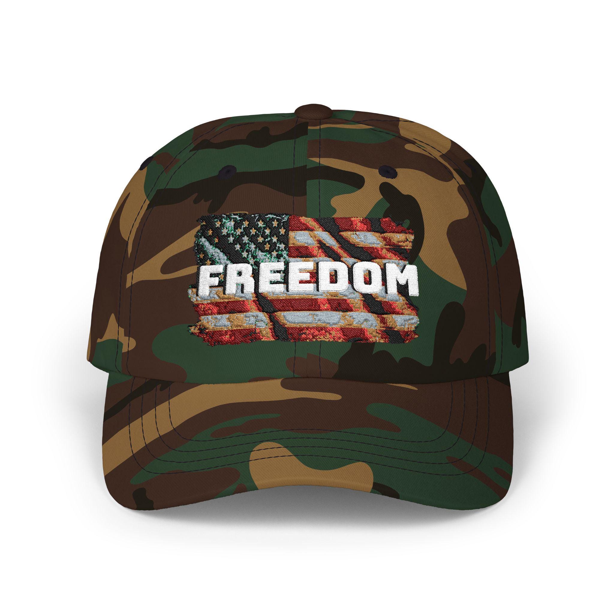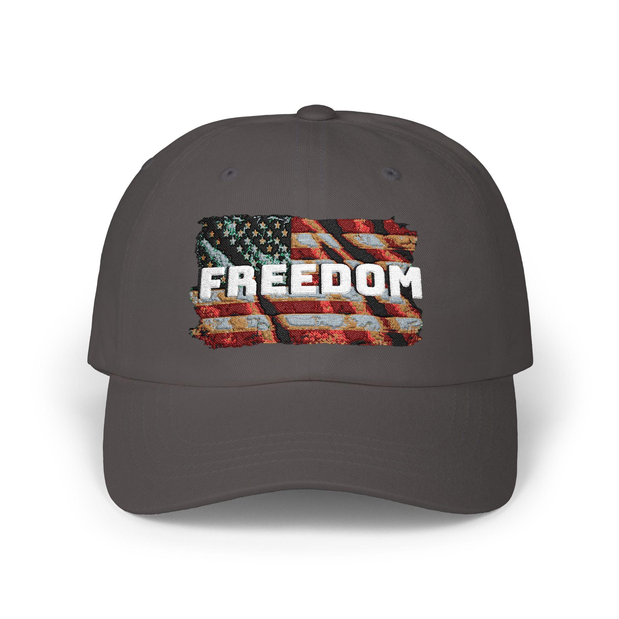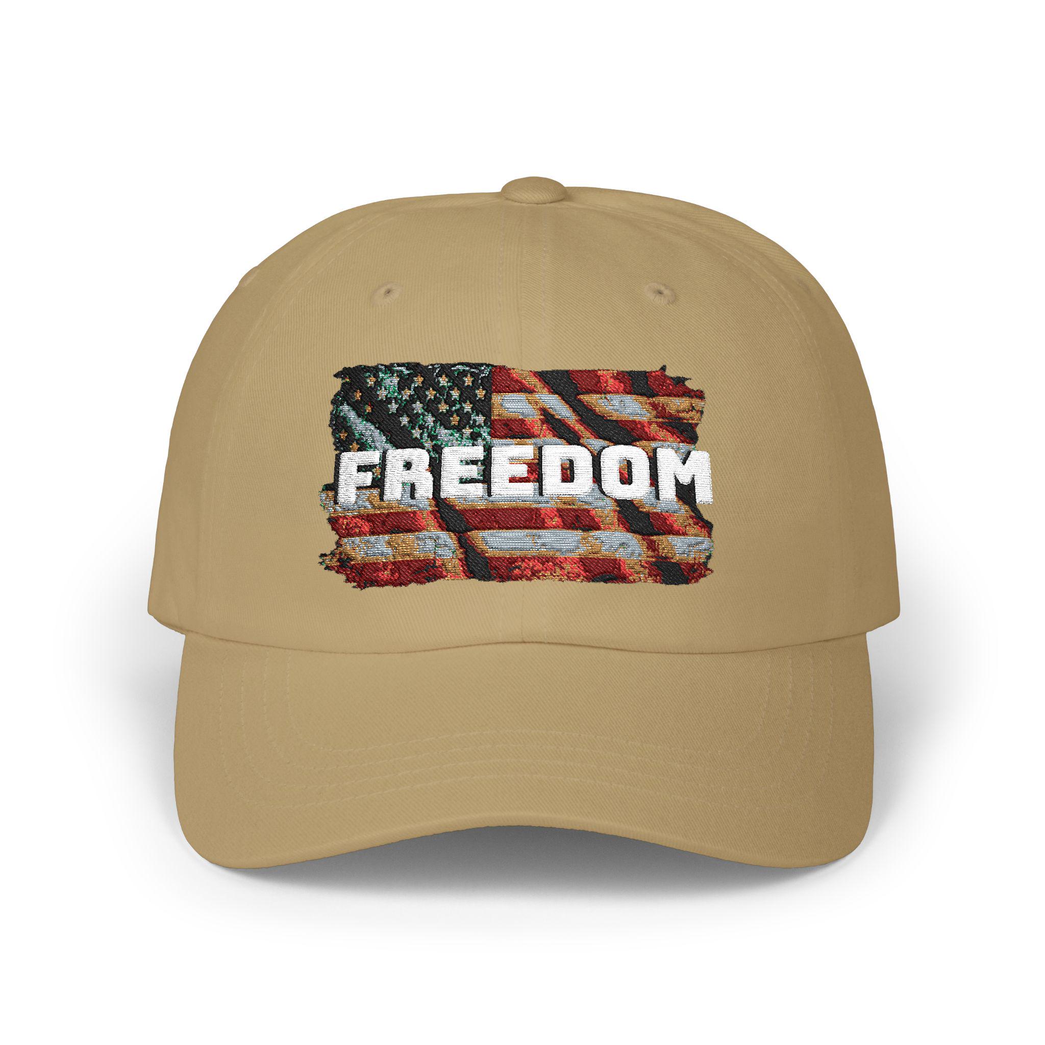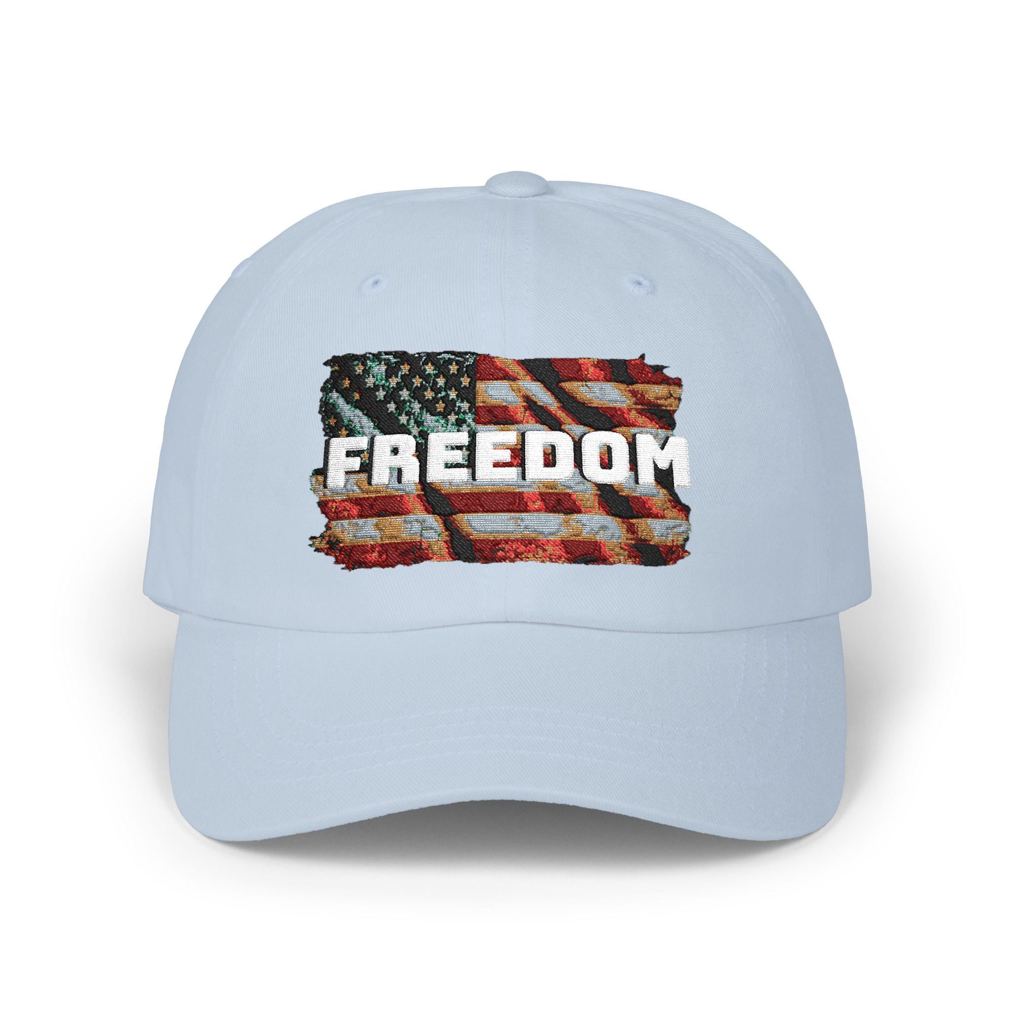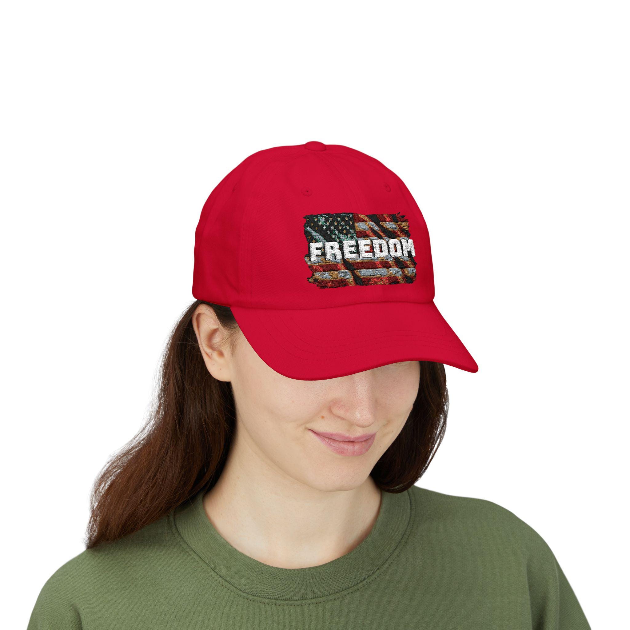 A relaxed, classic dad cap embroidered with a bold American flag and the word “Freedom,” made to sit low and easy on your head. The soft, unstructured crown and precurved Permacurv® visor give it a lived-in look that feels like an old favorite from the first wear. Small stitched details — eyelets on each of the six panels, a matched underbill, and a brand sticker on the visor — keep the design clean and honest. The hideaway strap with antique brass buckle and grommet lets you fine-tune the fit, while the 100% cotton build (with certain color blends) breathes and wears in naturally. It’s the sort of cap you reach for at backyard barbecues, summer parades, and long weekend drives when you want to signal quiet pride without shouting. Lightweight, durable, and uncomplicated — this cap lives with you through sun, travel, and slow afternoons on the porch.