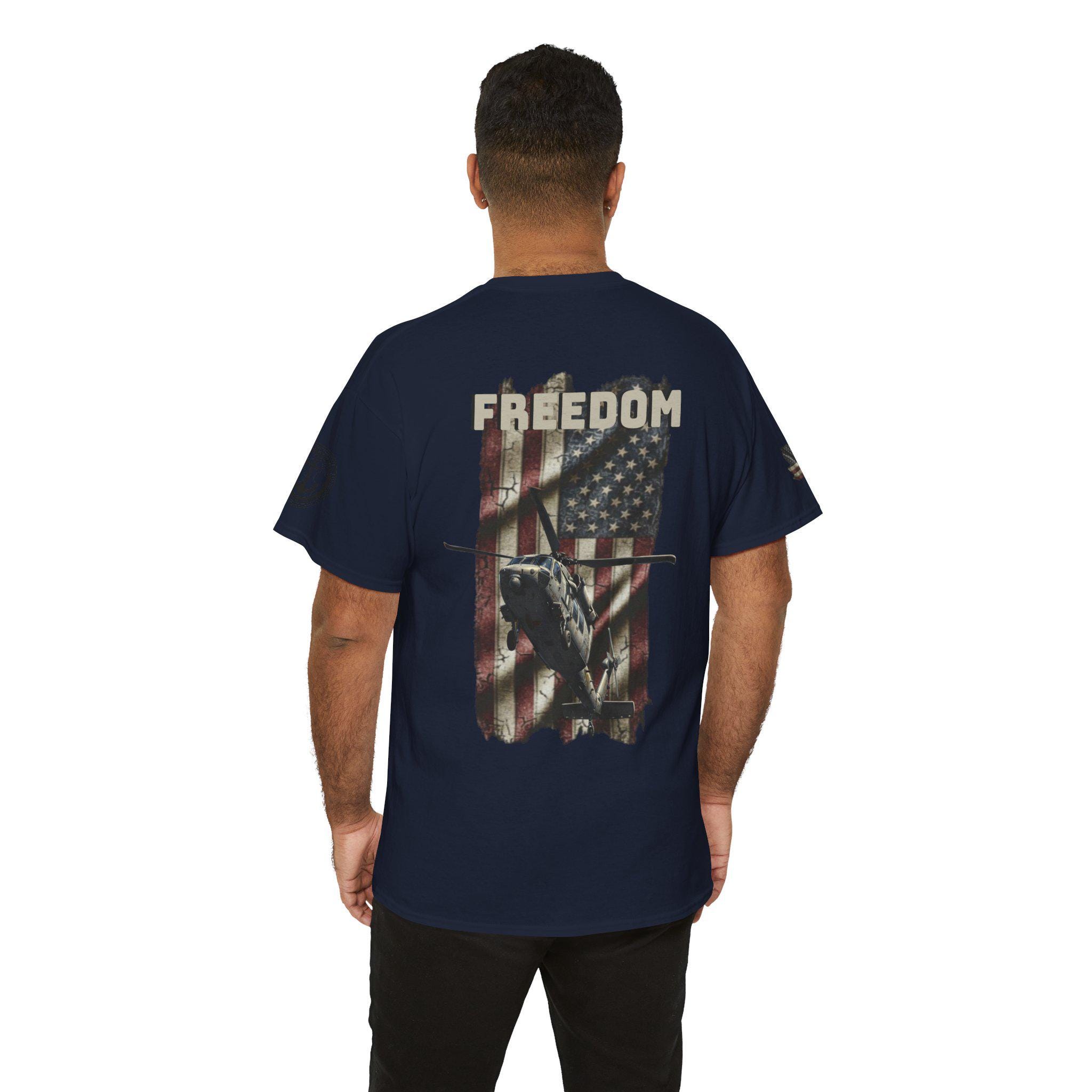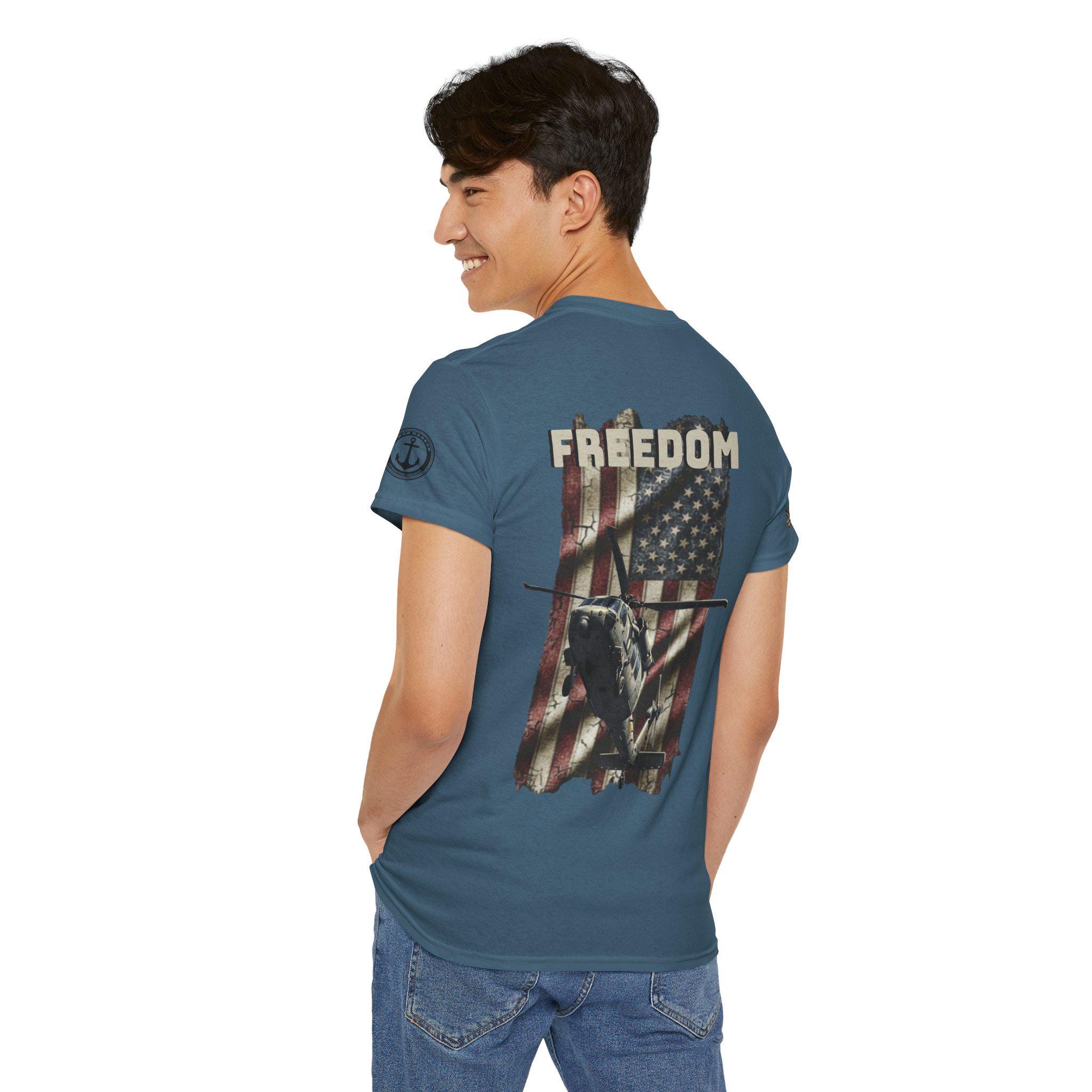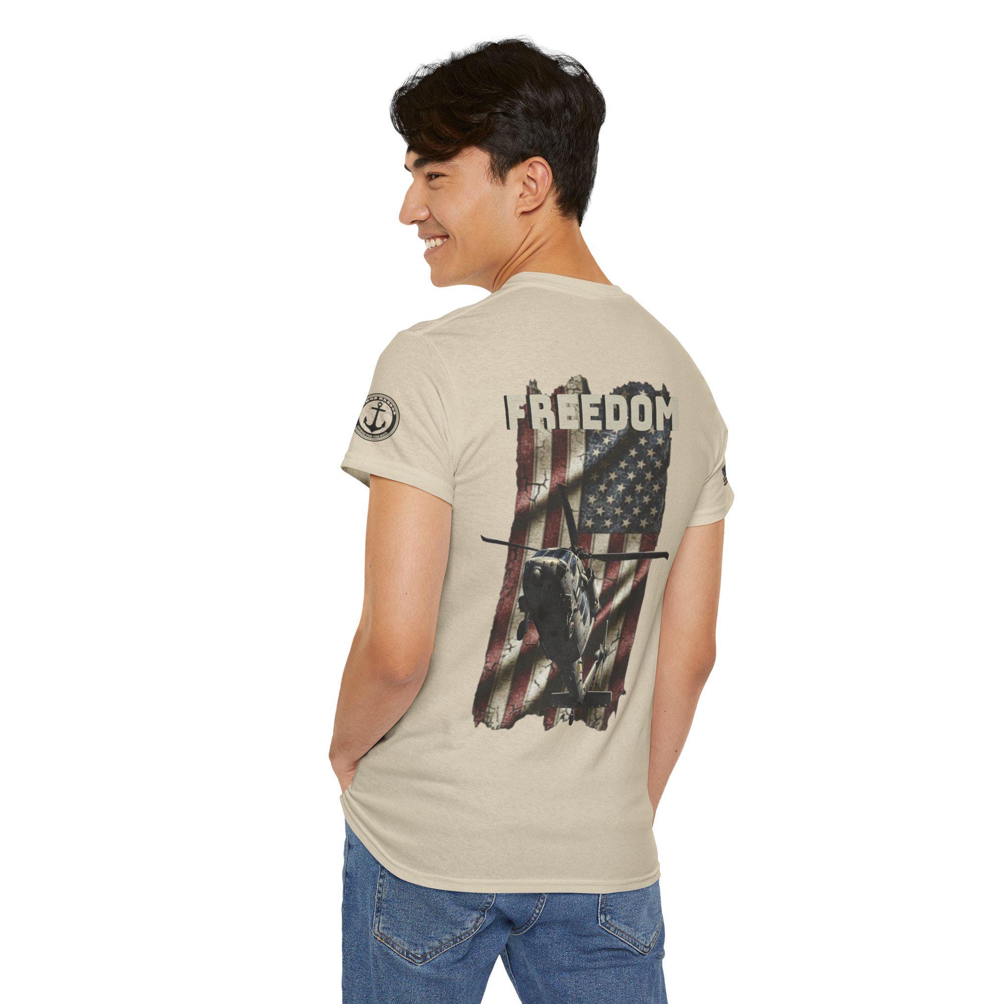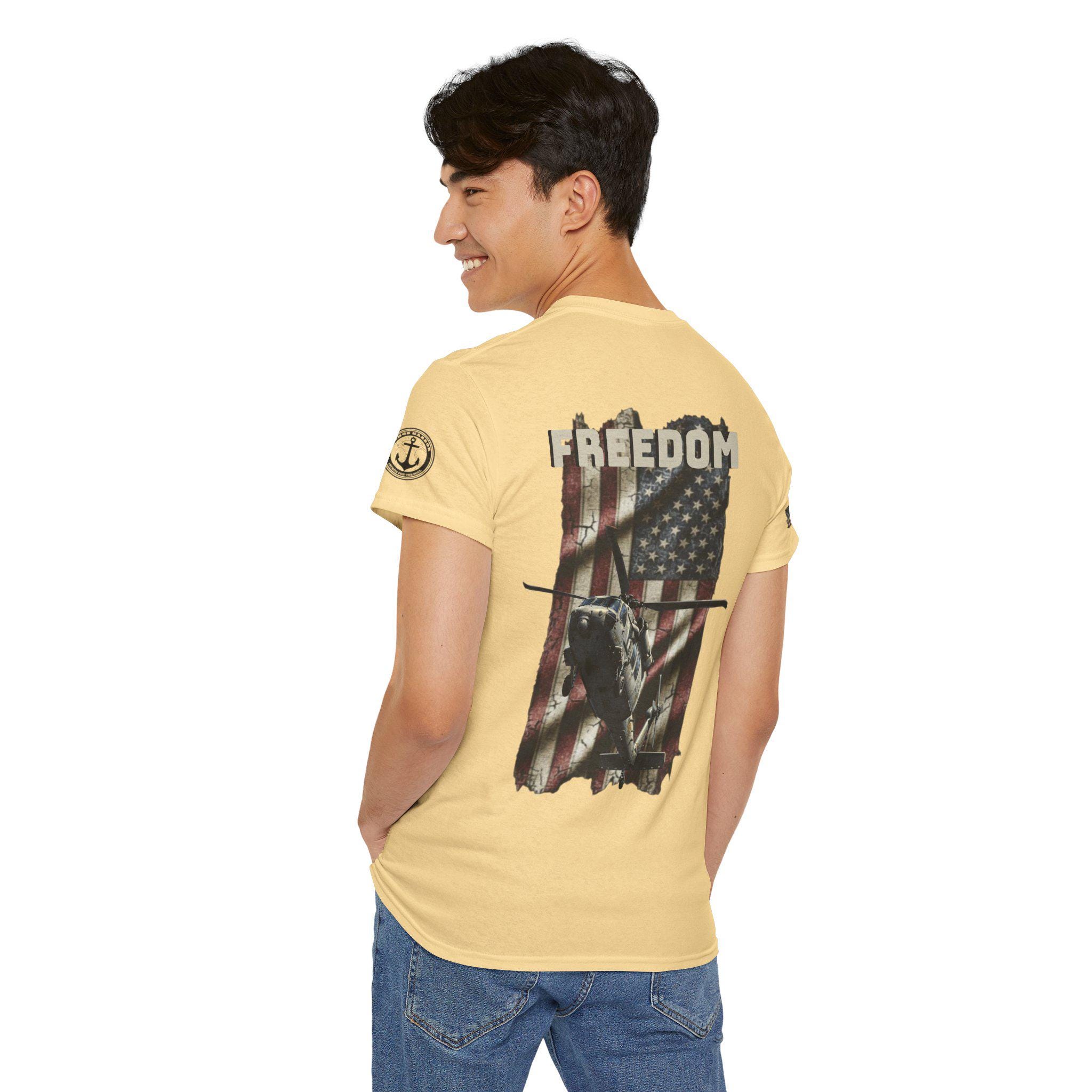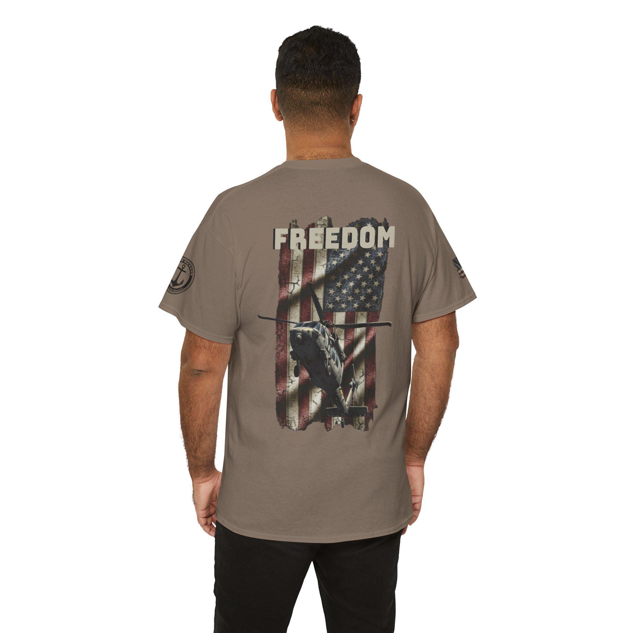 Worn like a salute. This tee carries a weathered American flag, a silhouette of a Navy SH-60 Seahawk, and the single-word declaration: FREEDOM. It feels like stepping into a chilly morning on the flight deck — the hum of rotors, the salt air, and the steady rhythm of a crew who count on one another. Sized and cut for everyday wear, the shirt settles into the routine of people who live near bases, love naval aviation, or keep service and country close to heart. It layers under a field jacket for pre-dawn watch, pairs with jeans for a hometown parade, and hangs in the closet ready for reunions or memorial gatherings where quiet pride speaks louder than any banner.