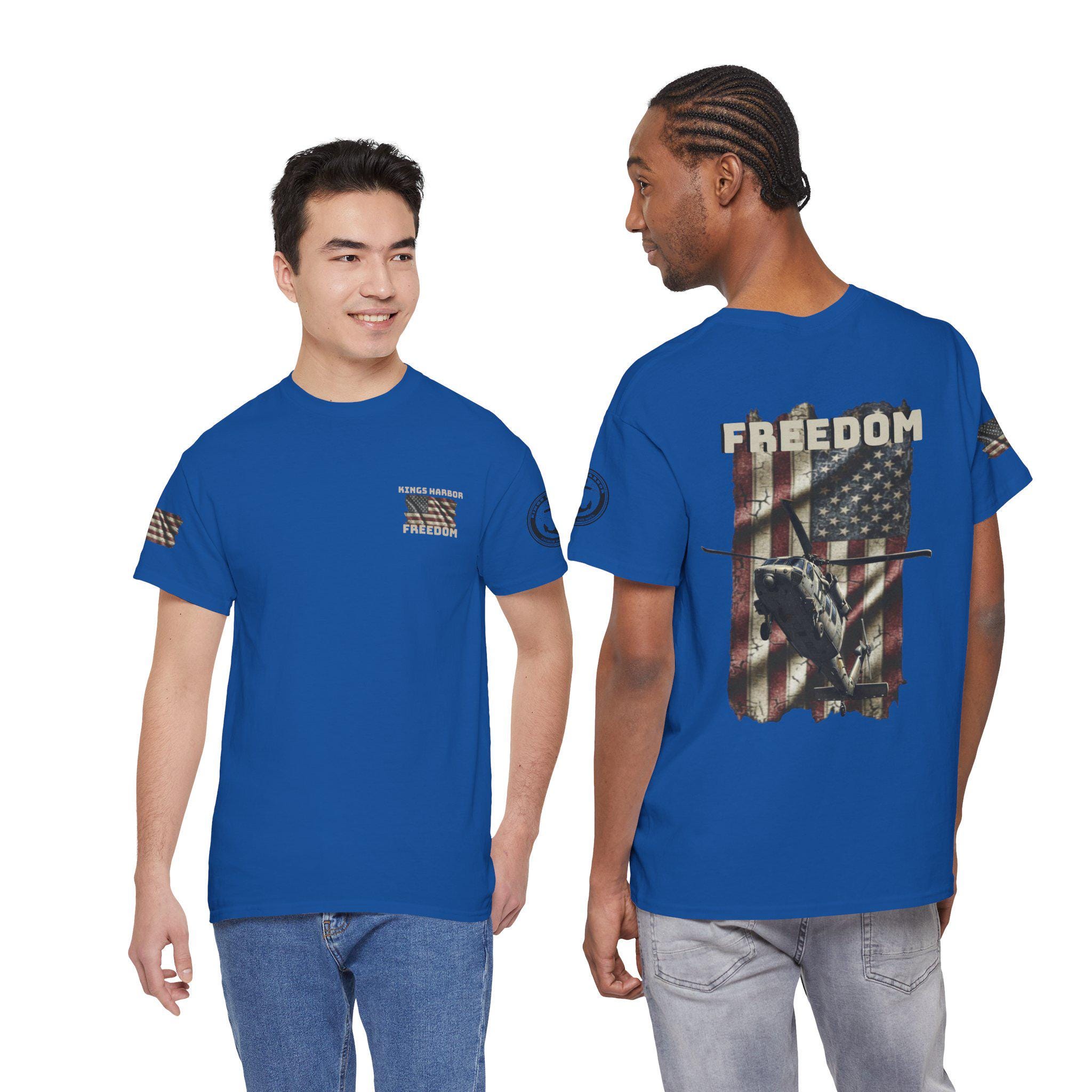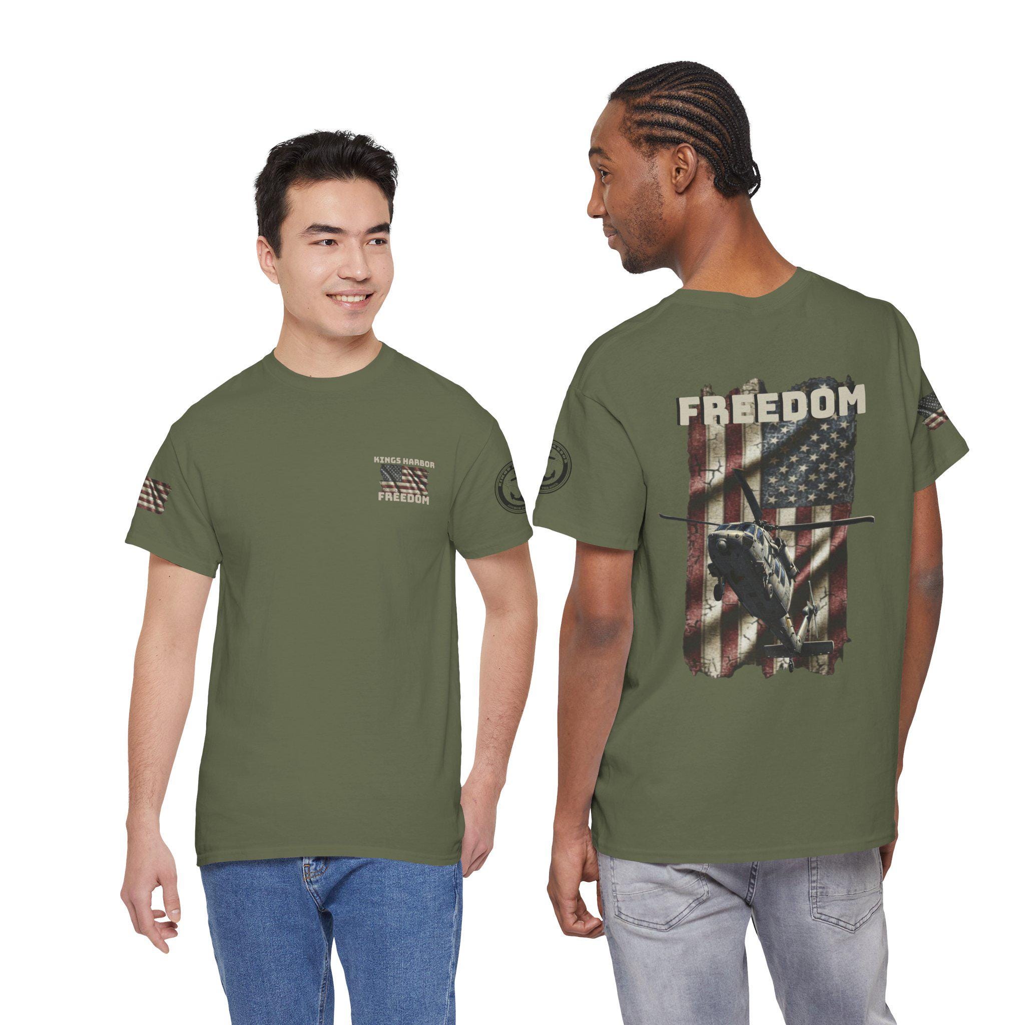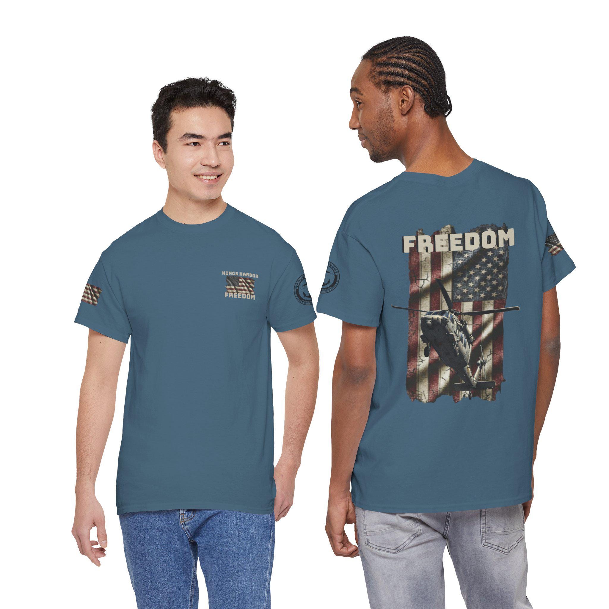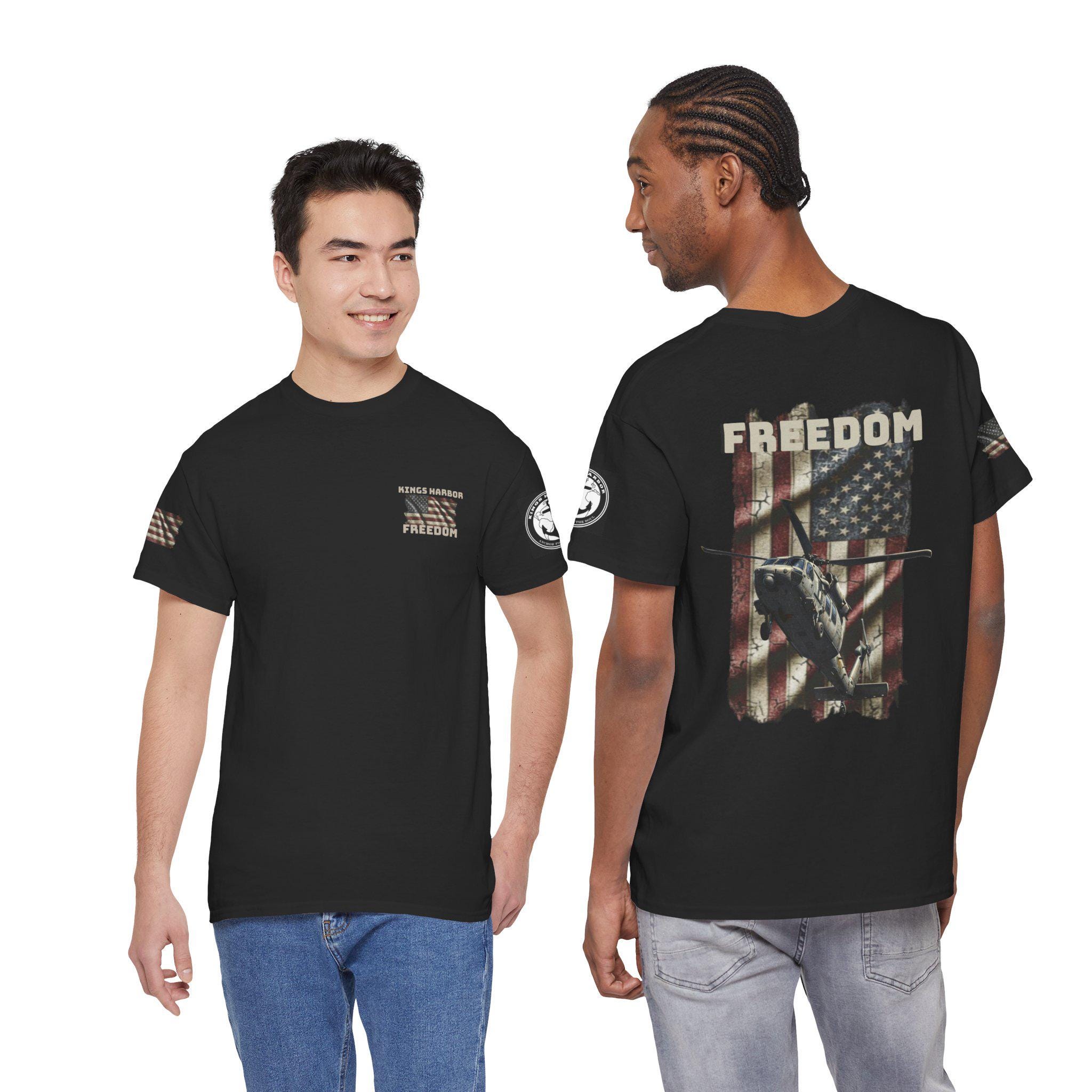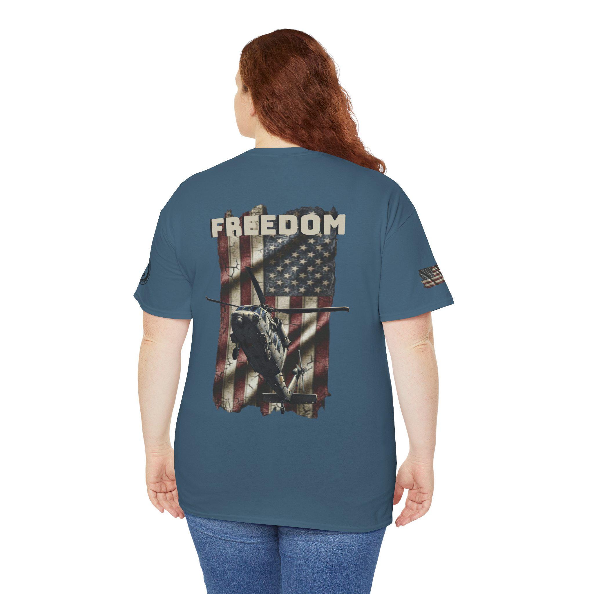 Worn like a salute. This tee carries a weathered American flag, a silhouette of a Navy SH-60 Seahawk, and the single-word declaration: FREEDOM. It feels like stepping into a chilly morning on the flight deck — the hum of rotors, the salt air, and the steady rhythm of a crew who count on one another. Sized and cut for everyday wear, the shirt settles into the routine of people who live near bases, love naval aviation, or keep service and country close to heart. It layers under a field jacket for pre-dawn watch, pairs with jeans for a hometown parade, and hangs in the closet ready for reunions or memorial gatherings where quiet pride speaks louder than any banner.