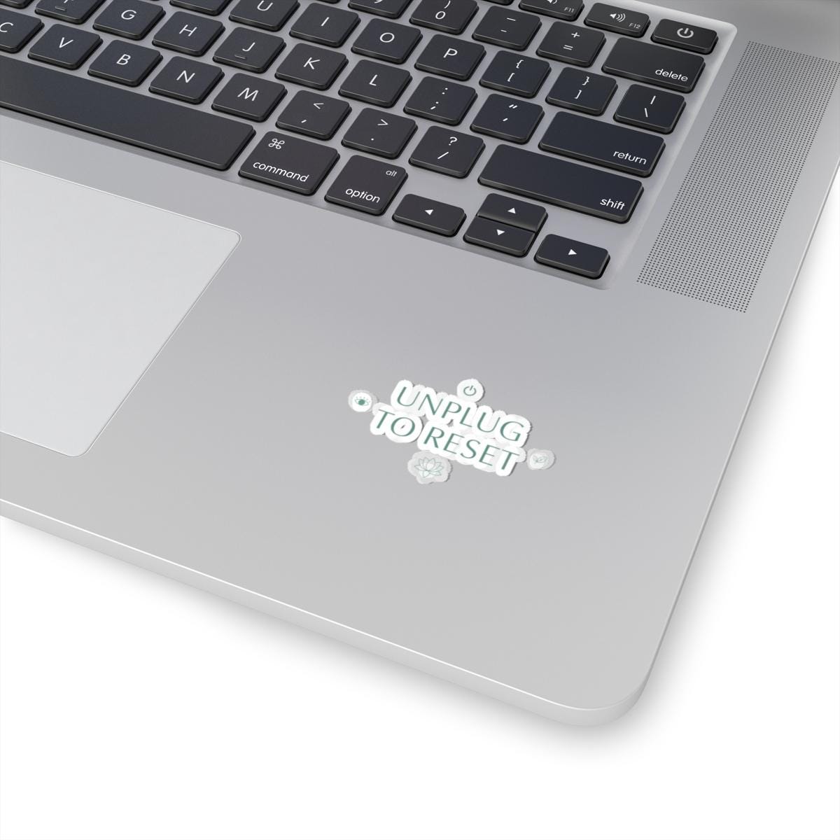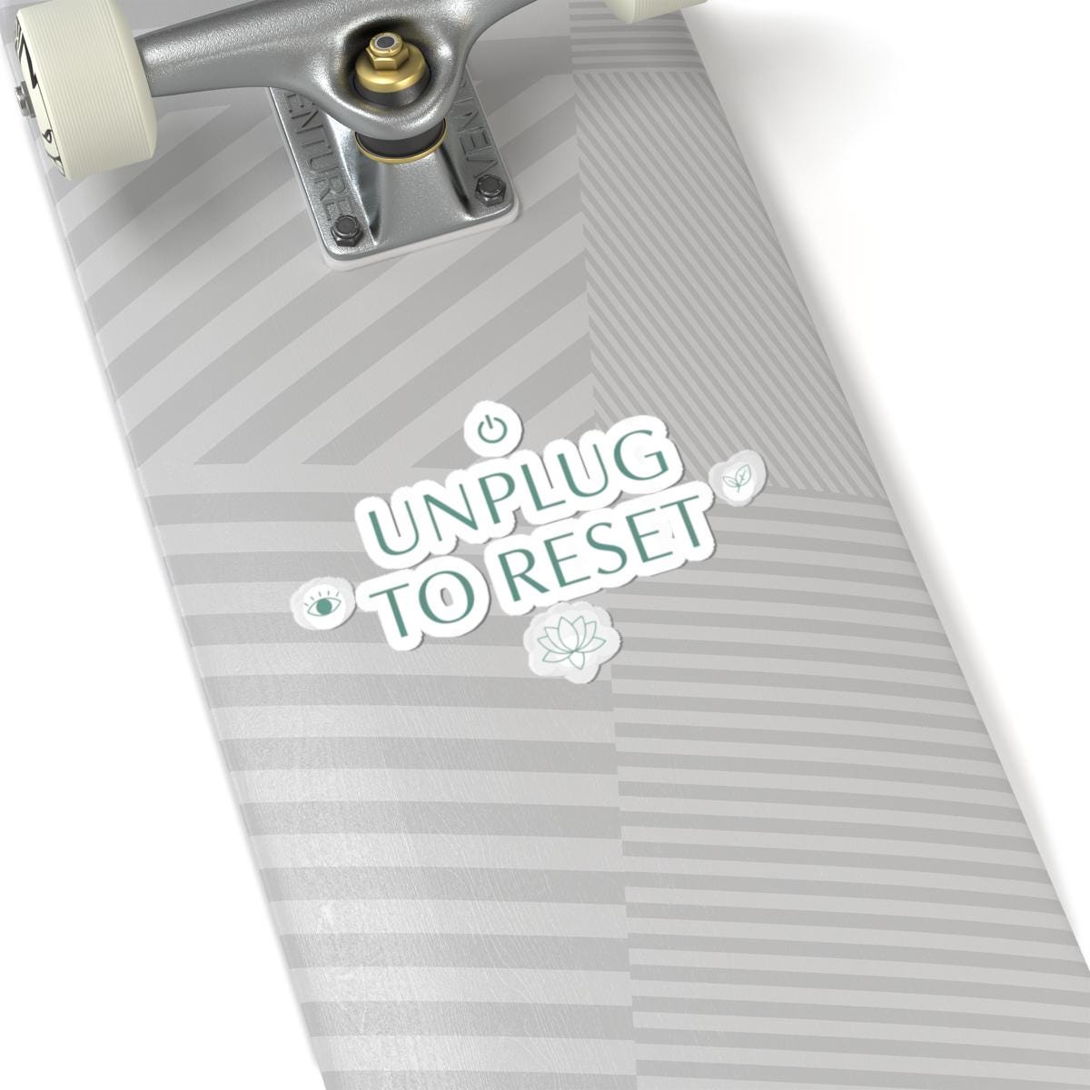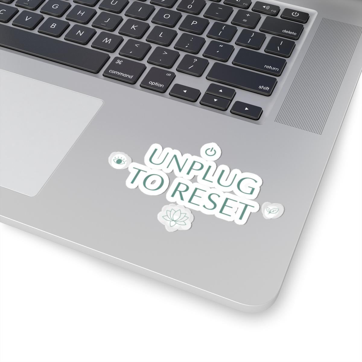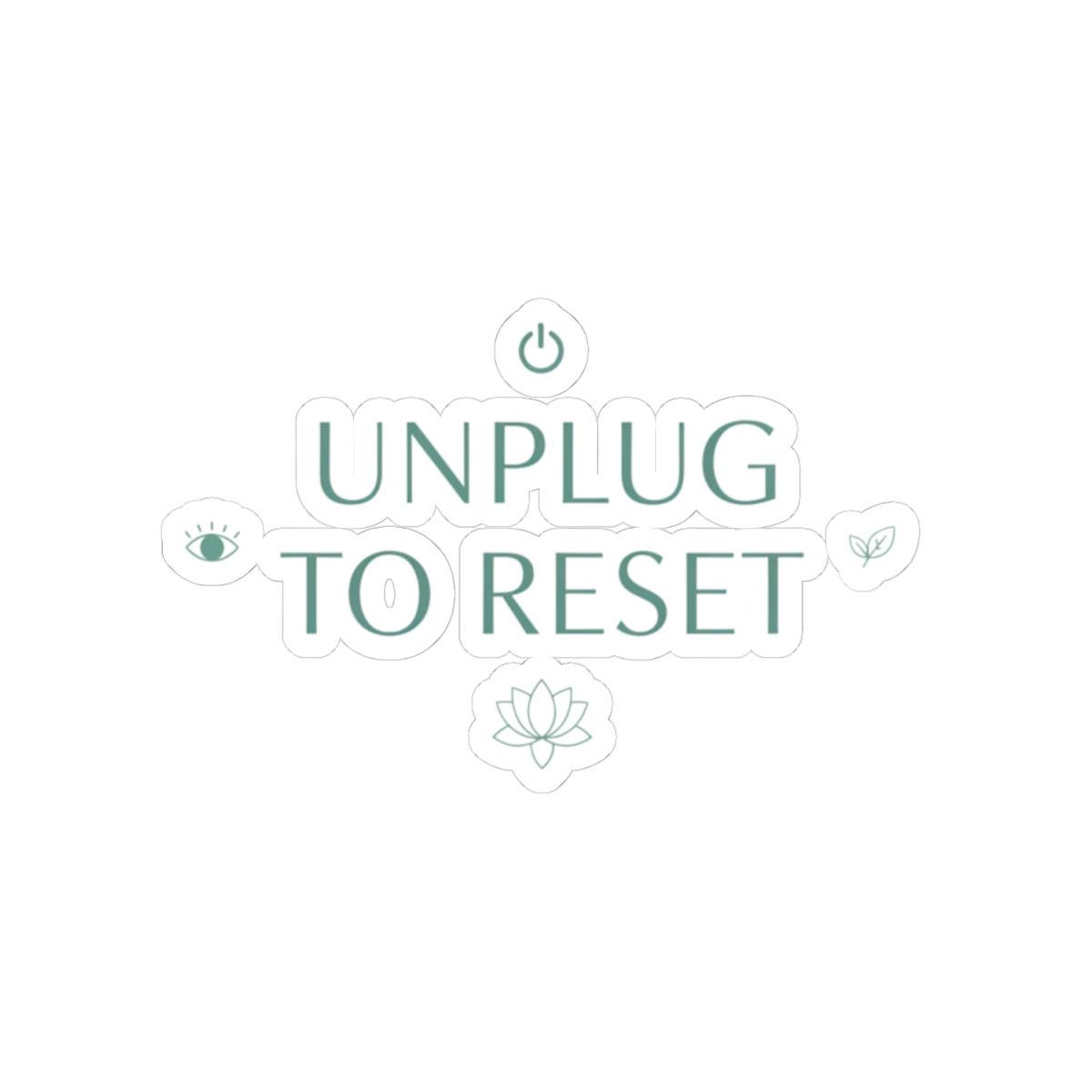 A small, serene kiss-cut sticker that reads “UNPLUG TO RESET” in muted green-blue type surrounded by minimalist icons. The clean layout and calm palette echo digital detox and news fatigue motifs, offering a gentle, visible reminder to step away from screens. Designed to sit unobtrusively on laptops, journals, or water bottles, it fits into wellness routines as a subtle mindfulness cue for busy, screen-weary days.