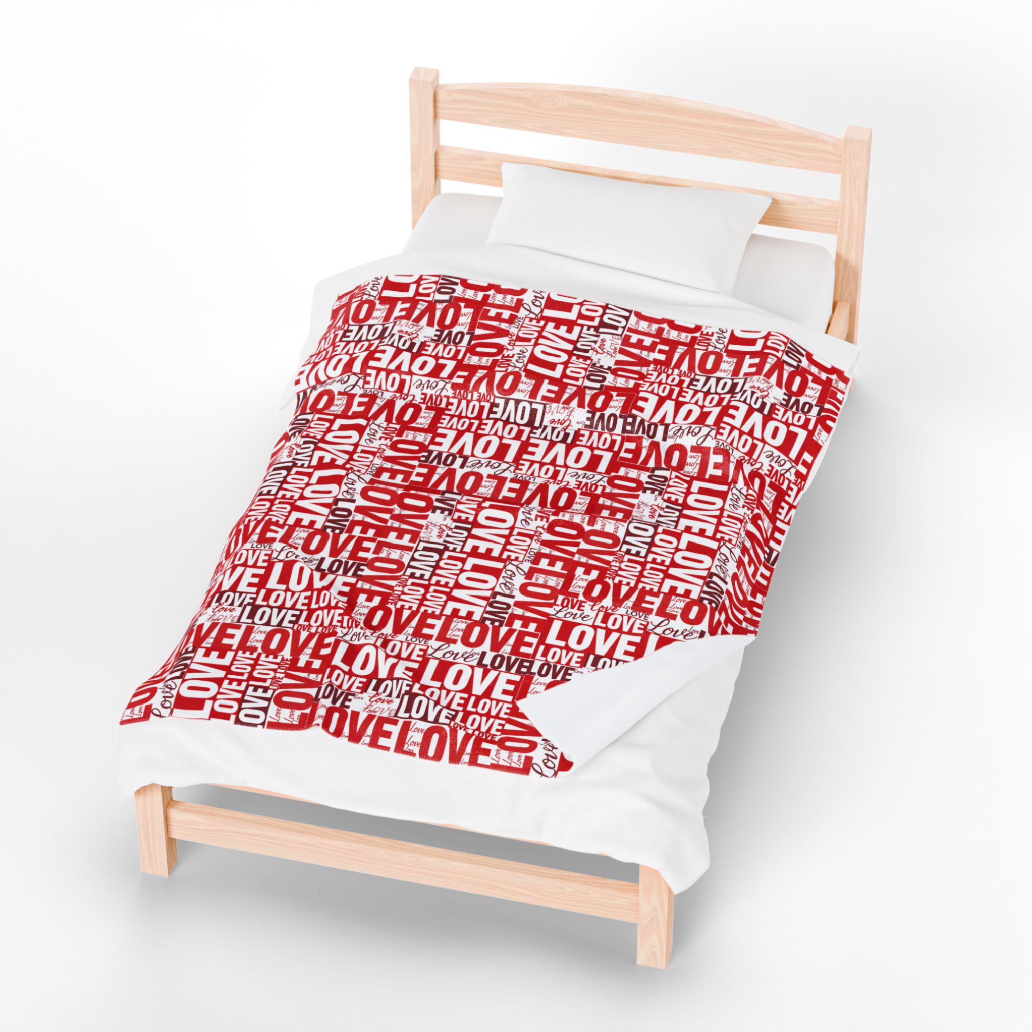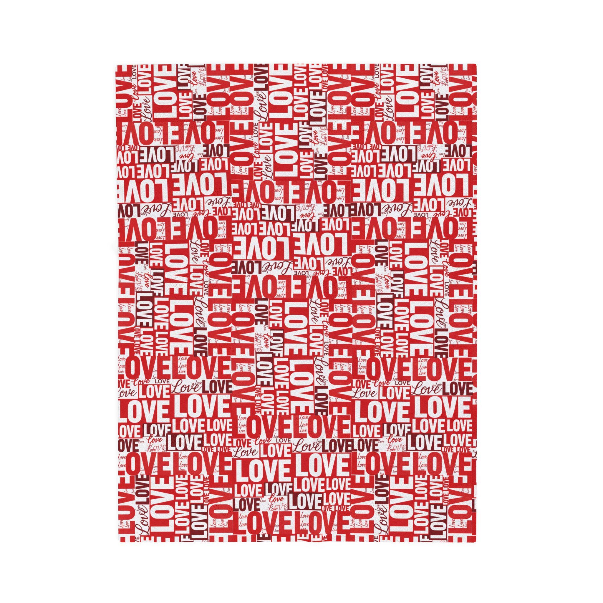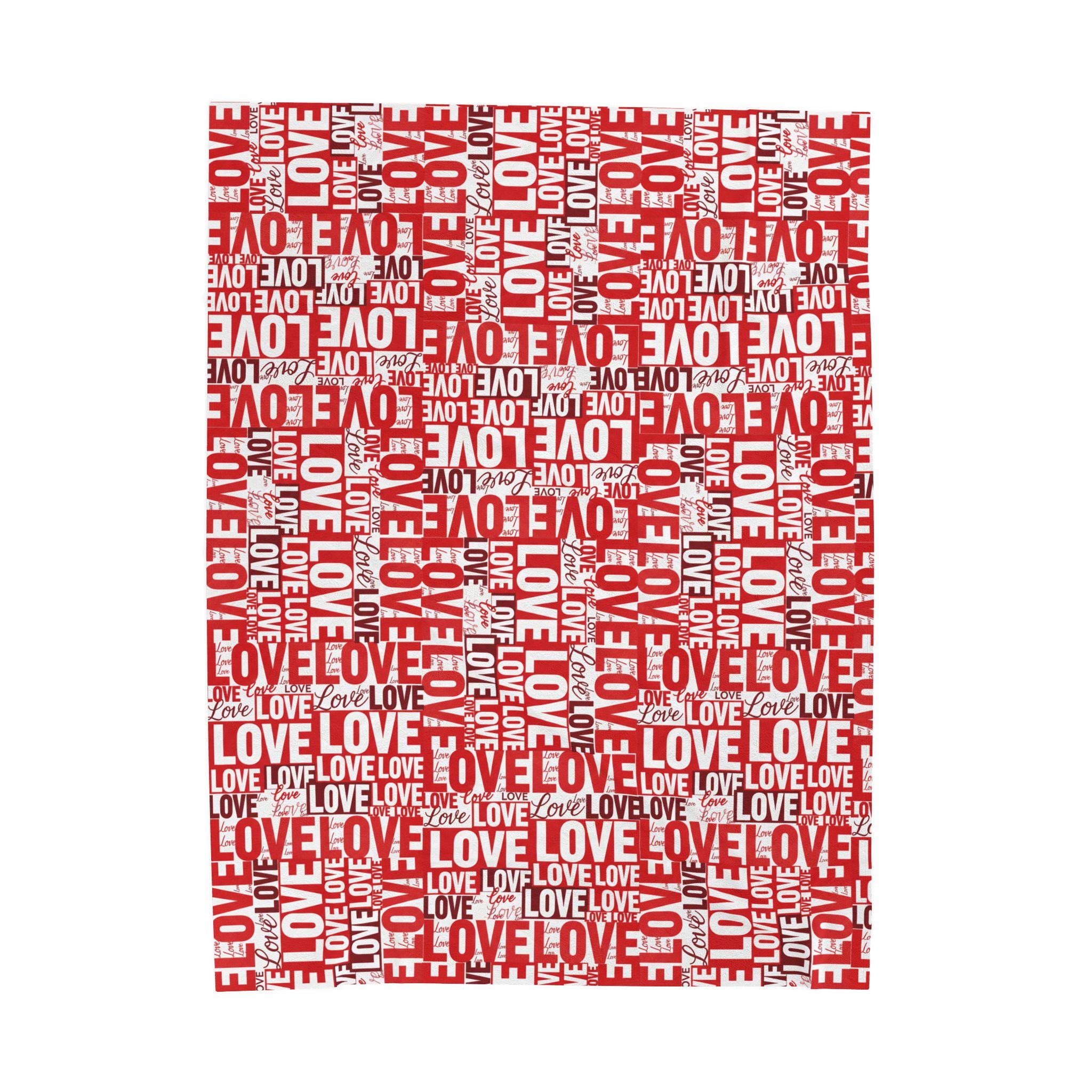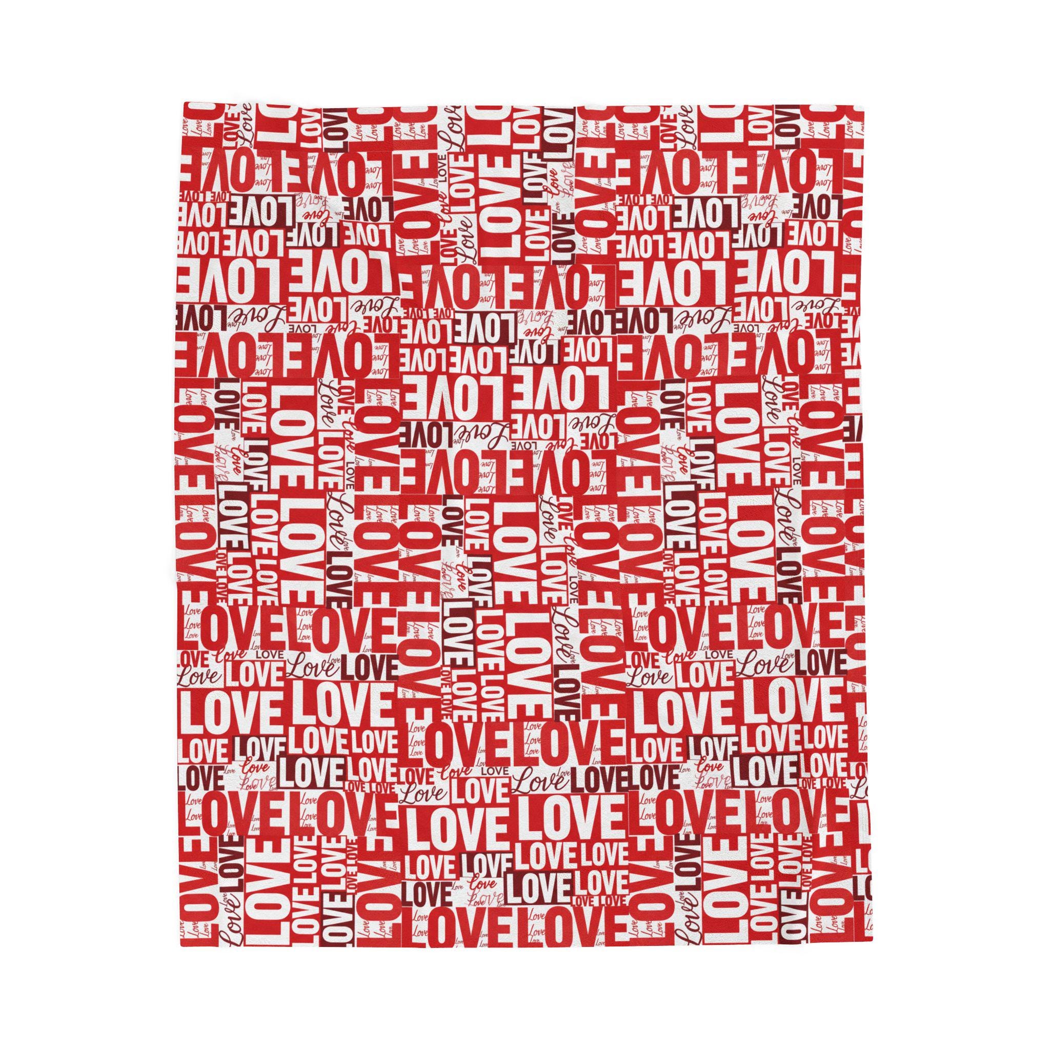 Wrap someone (or yourself) in a warm, cozy collage of love. This velveteen plush blanket features layered red and white lettering — playful script, bold block, and handwritten hearts — that feel like a handwritten valentine come alive. The fabric drapes softly across a couch or bed, holding body heat without feeling heavy. Use it on quiet February evenings, at slow movie nights, or tucked around shoulders during cinnamon-scented walks at dusk. The look leans romantic but casual — a little nostalgic, a little modern — and slips easily into date-night moments, apartment décor refreshes, or slow-morning routines.