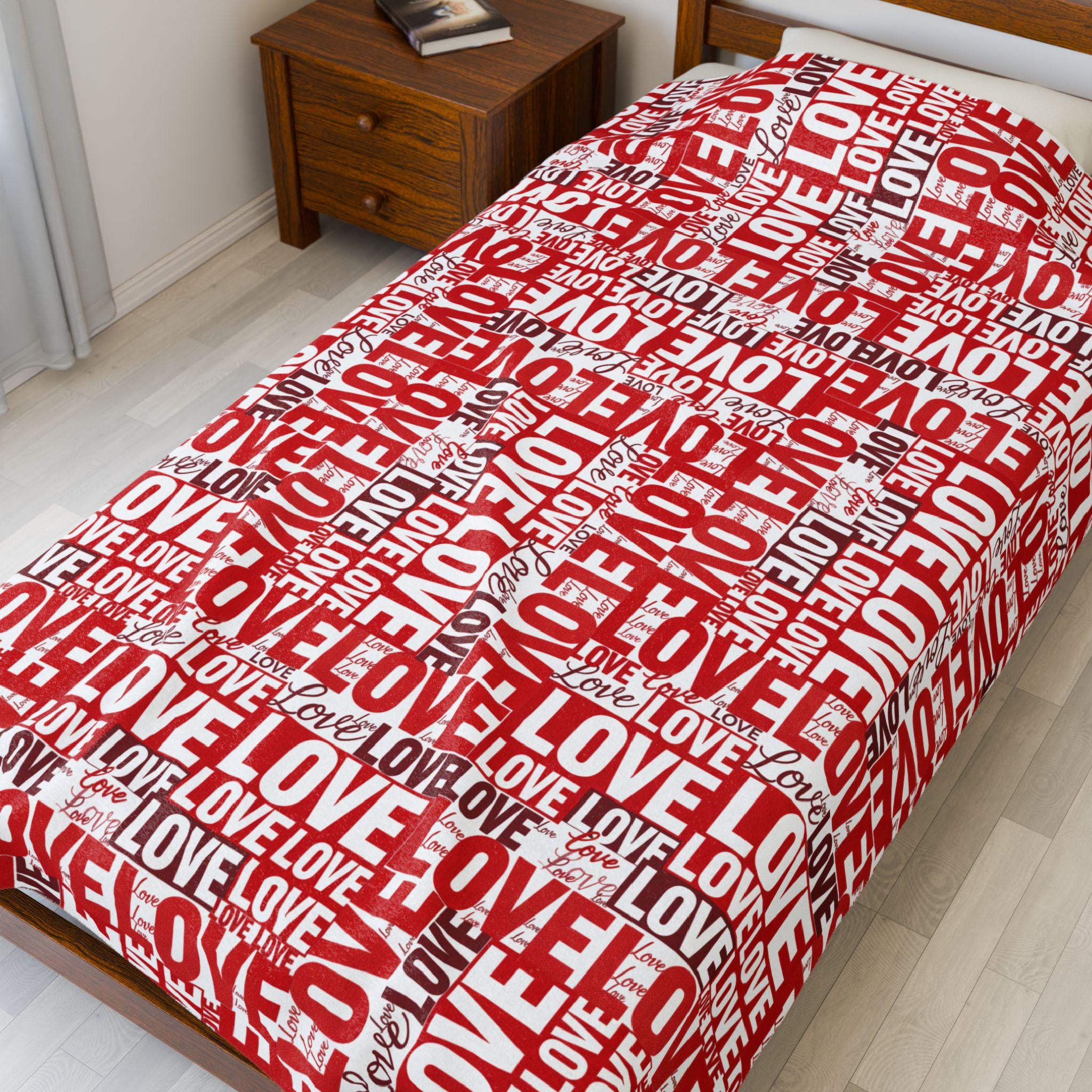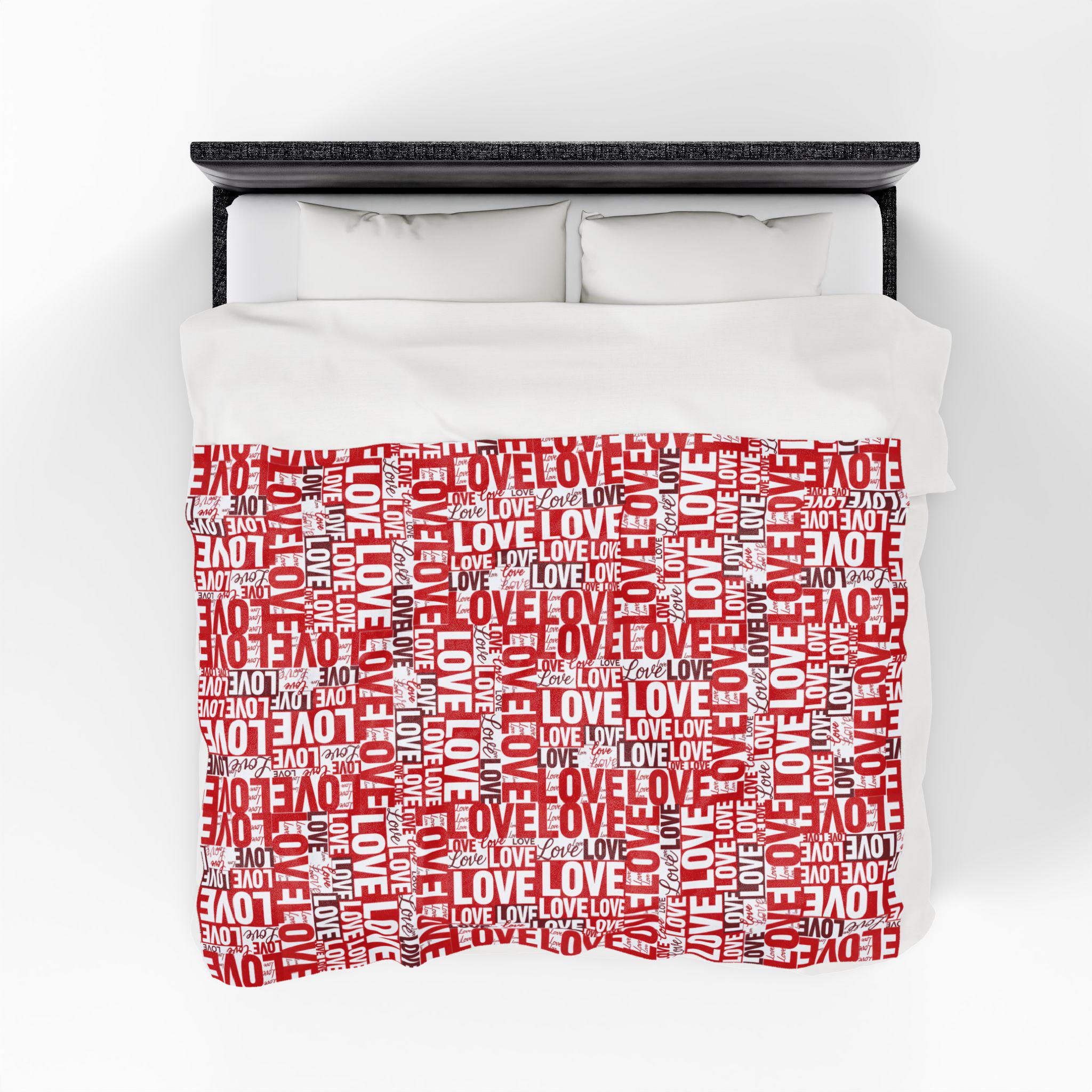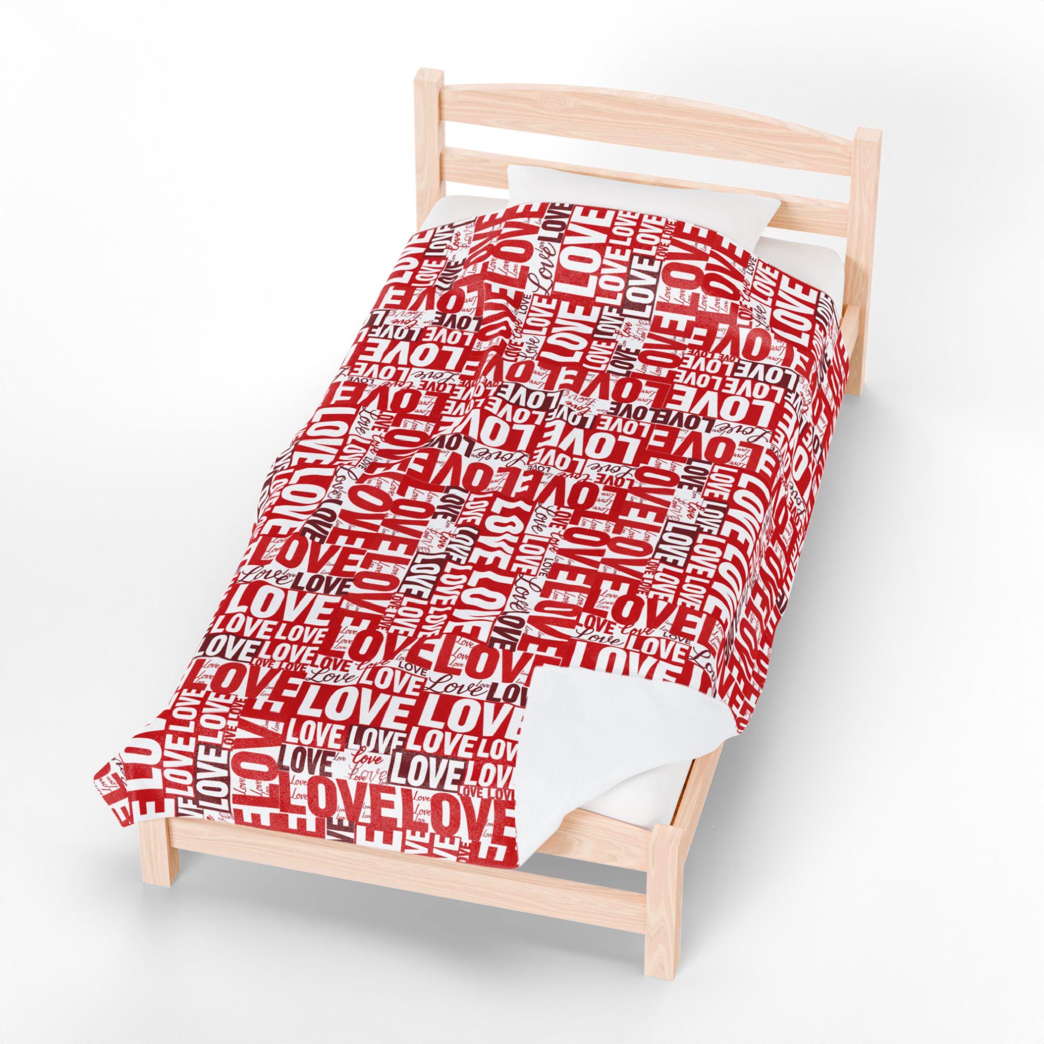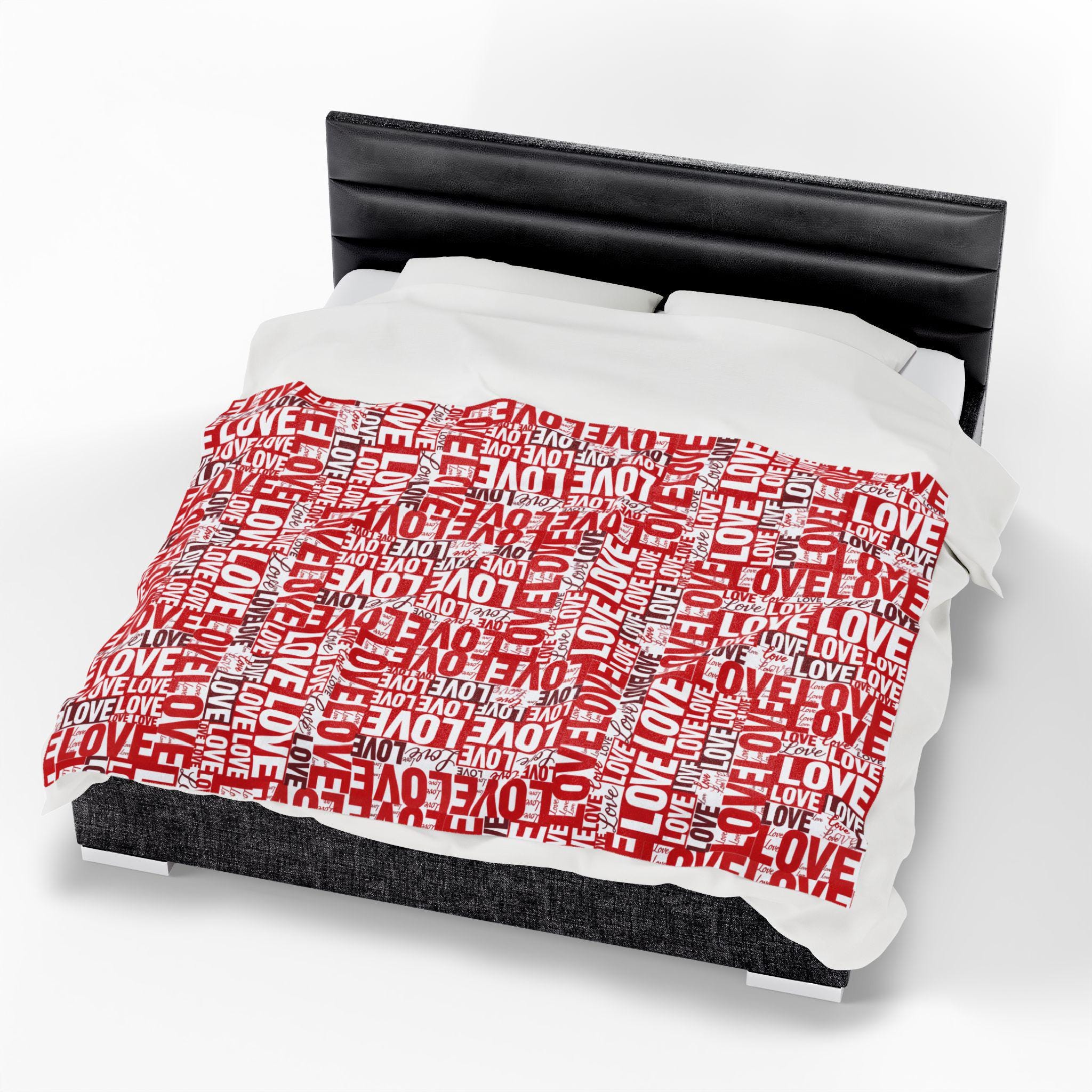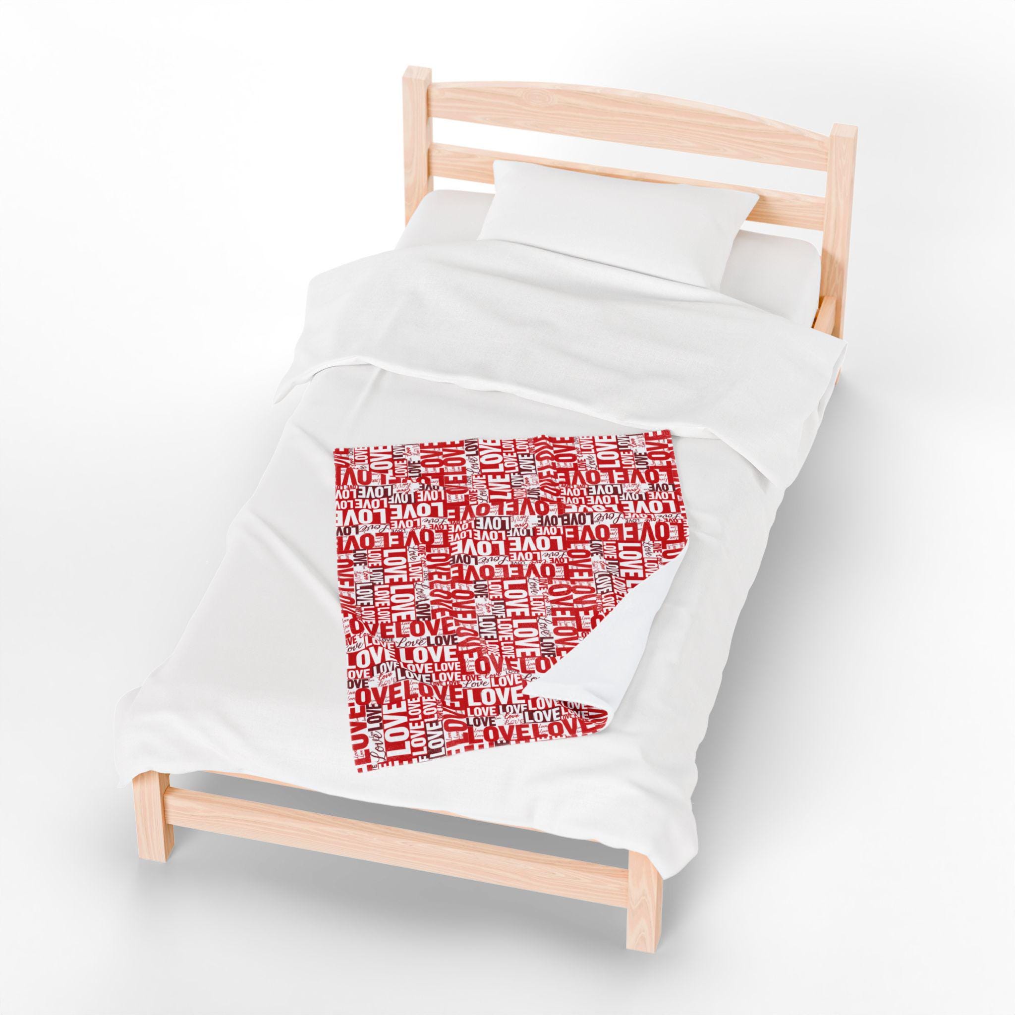 Wrap someone (or yourself) in a warm, cozy collage of love. This velveteen plush blanket features layered red and white lettering — playful script, bold block, and handwritten hearts — that feel like a handwritten valentine come alive. The fabric drapes softly across a couch or bed, holding body heat without feeling heavy. Use it on quiet February evenings, at slow movie nights, or tucked around shoulders during cinnamon-scented walks at dusk. The look leans romantic but casual — a little nostalgic, a little modern — and slips easily into date-night moments, apartment décor refreshes, or slow-morning routines.