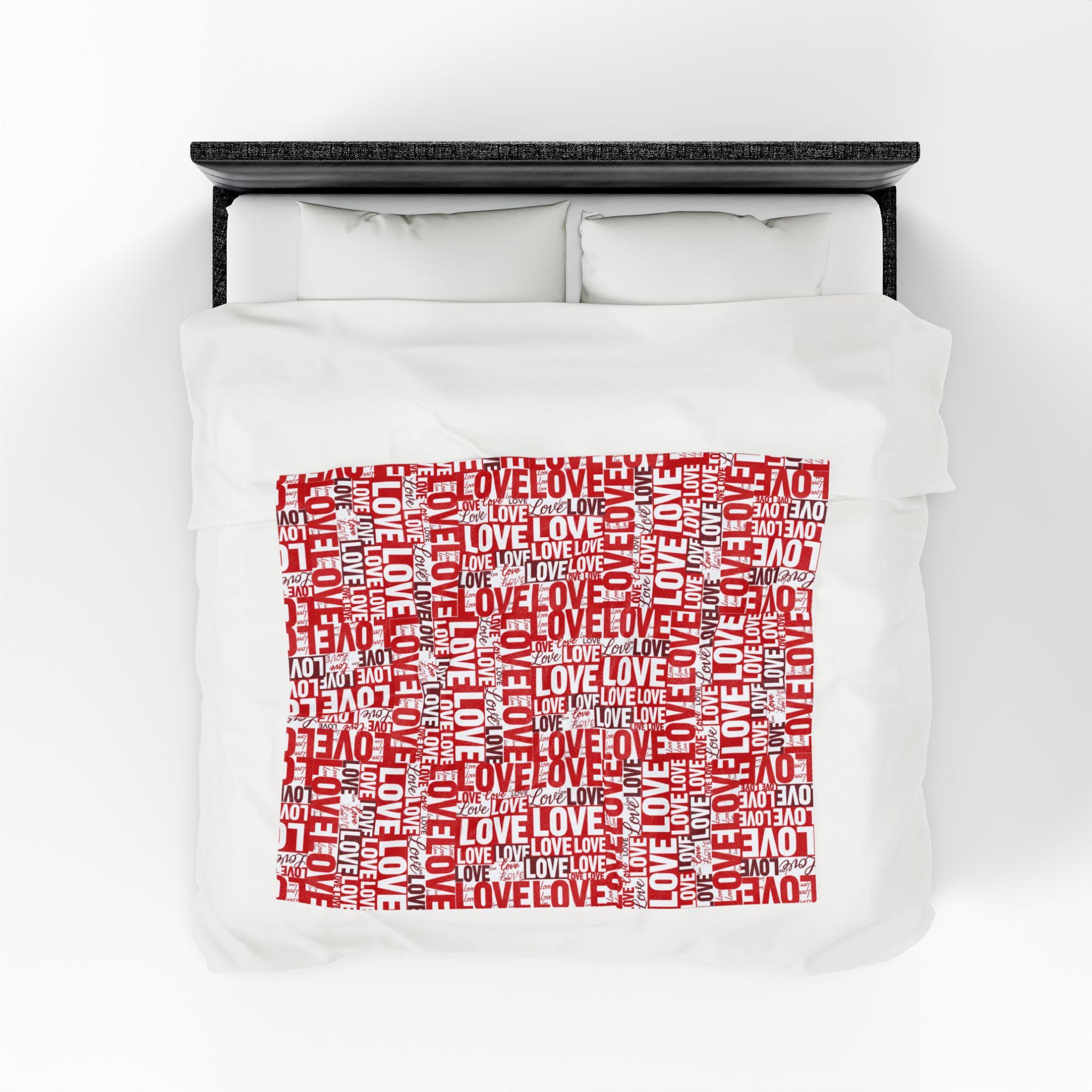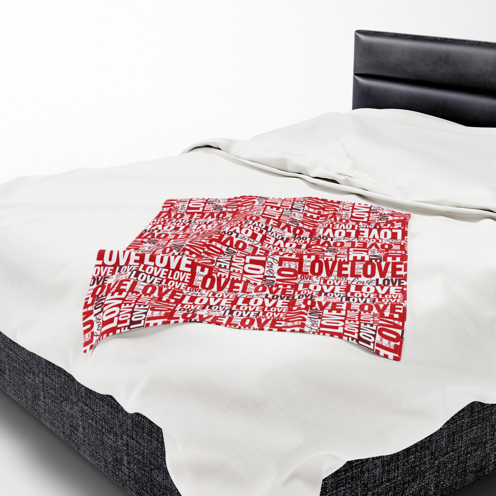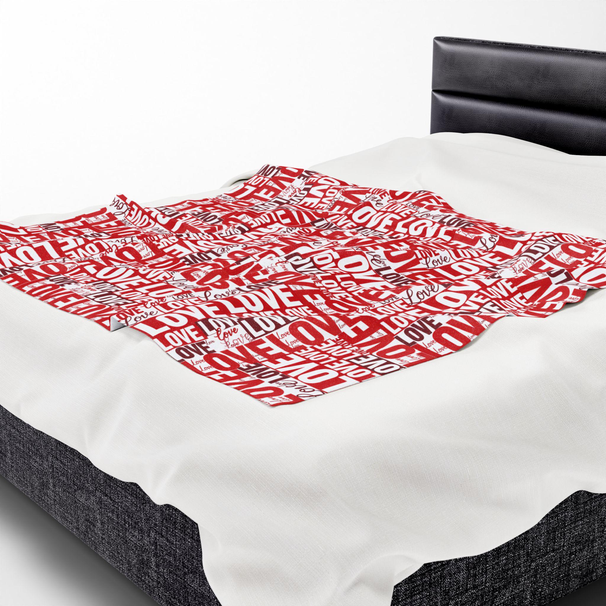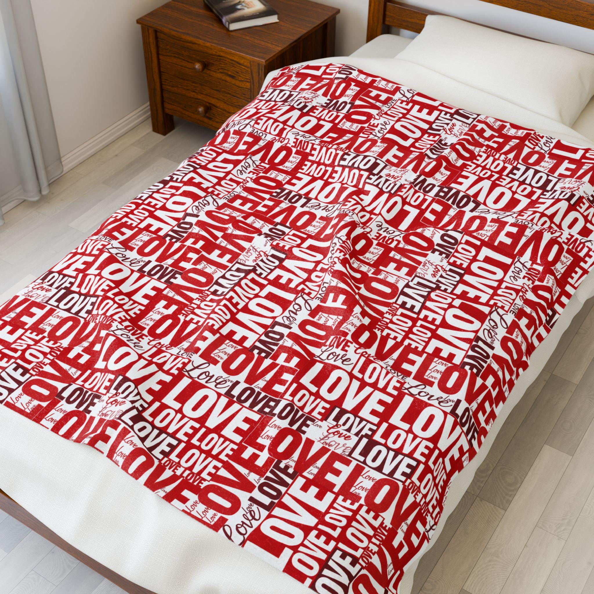 Wrap someone (or yourself) in a warm, cozy collage of love. This velveteen plush blanket features layered red and white lettering — playful script, bold block, and handwritten hearts — that feel like a handwritten valentine come alive. The fabric drapes softly across a couch or bed, holding body heat without feeling heavy. Use it on quiet February evenings, at slow movie nights, or tucked around shoulders during cinnamon-scented walks at dusk. The look leans romantic but casual — a little nostalgic, a little modern — and slips easily into date-night moments, apartment décor refreshes, or slow-morning routines.